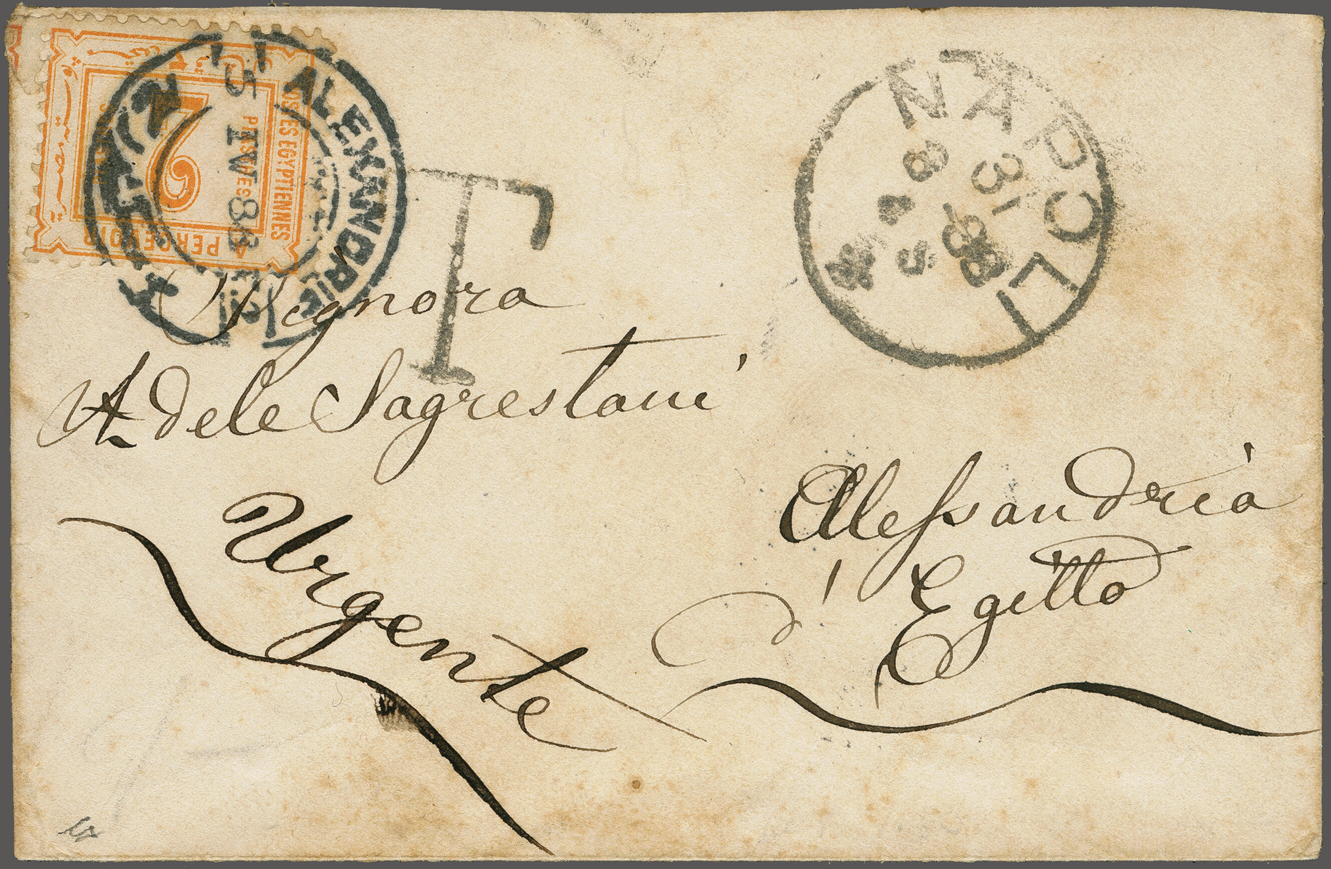 1888: Stampless 1888 envelope from Naples (March 31) to Alexandria with Napoli despatch cds and 'T' marking, taxed on arrival with 1888 2 pi. orange tied by 'Alexandrie' datestamp (April 5) in black. Minor aging but a scarce