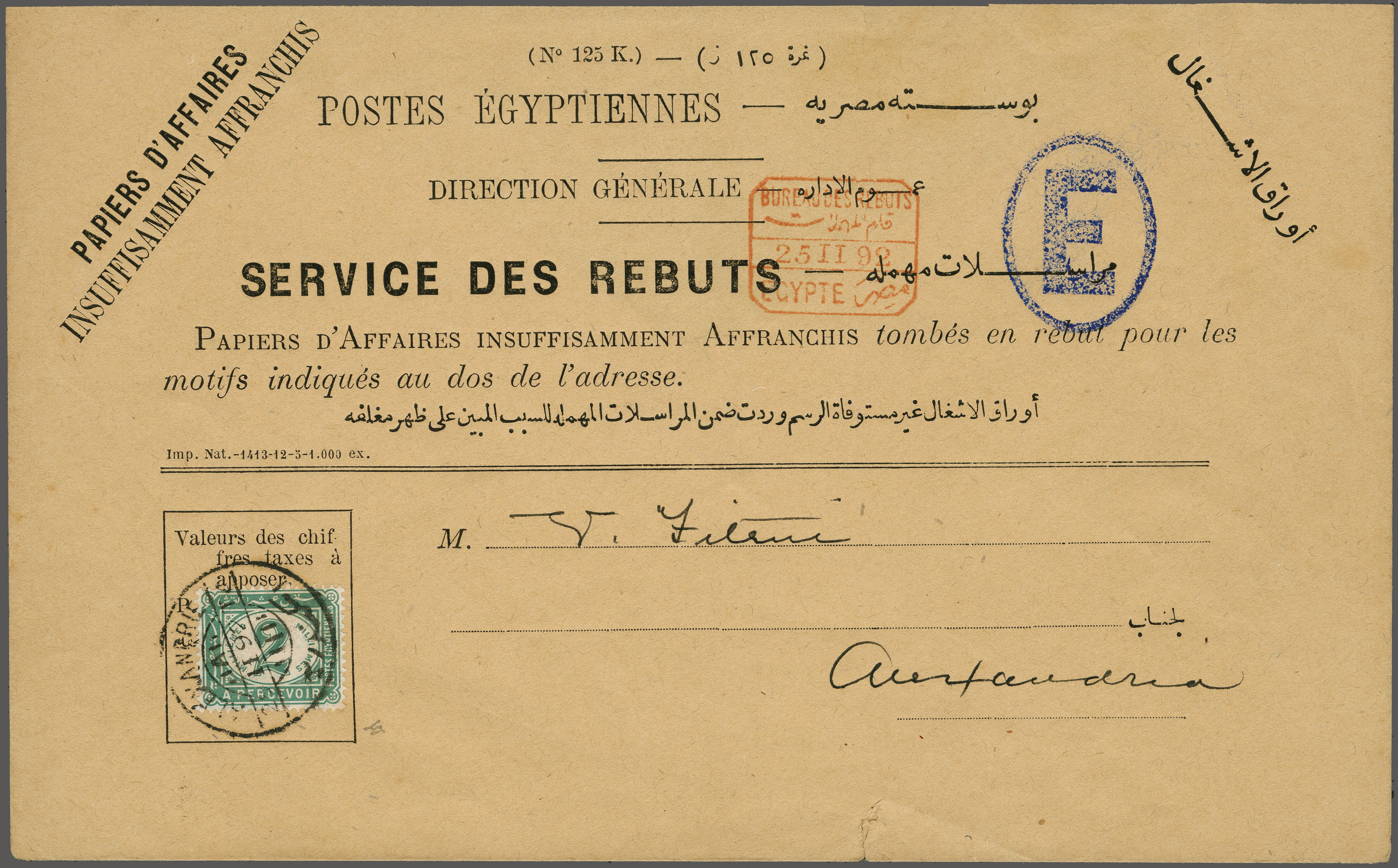 1892: Post Office envelope returning an unpaid letter (envelope No. 125 K), handstamped 'E' in oval in blue, sent to Alexandria with 1889 Postage Due 2 m. green (handling fee) tied by Alexandria cds (Feb 25) with 'Bureau Des