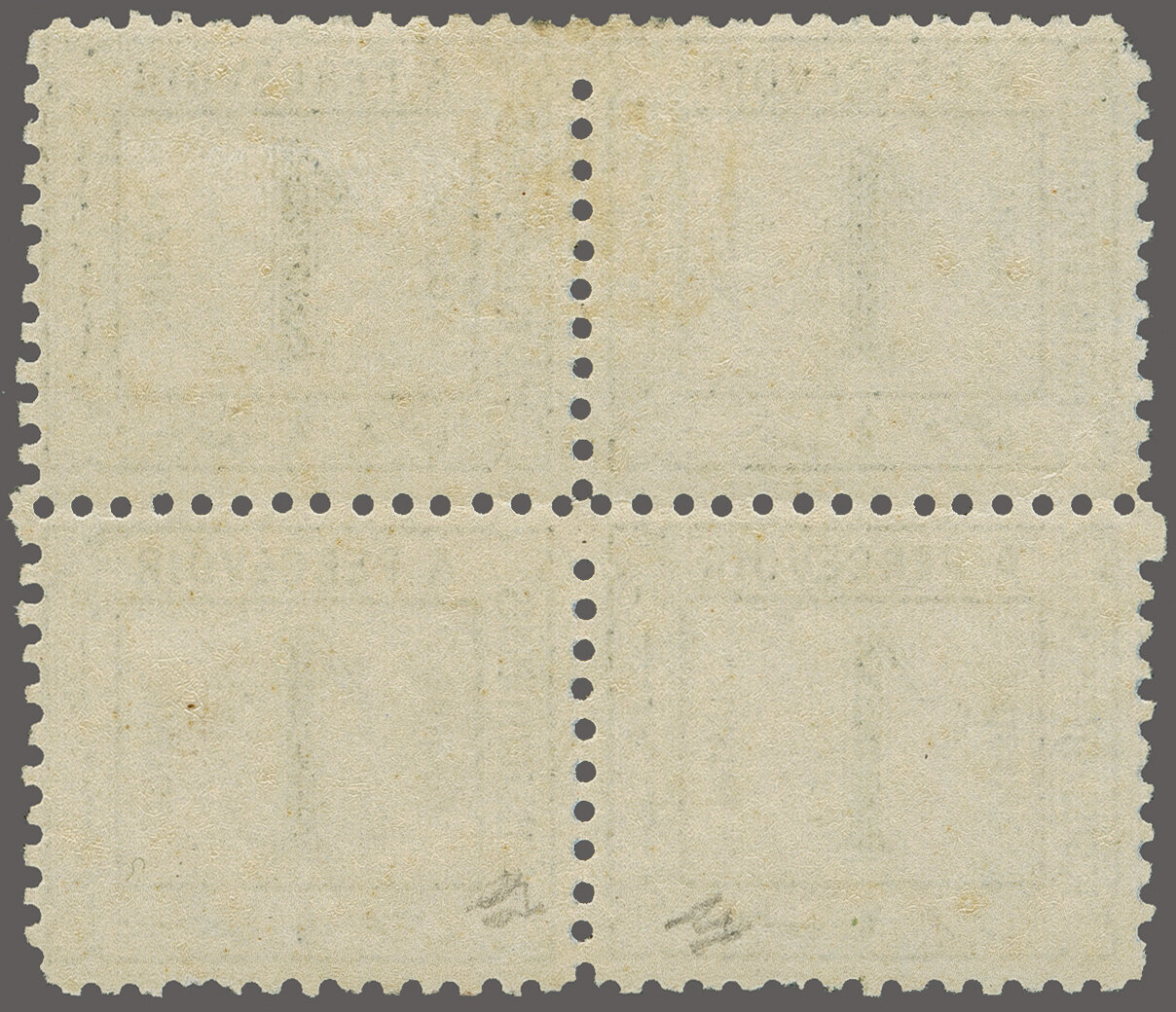1888 (Jan 1): 2 m green, the mint block of four, types IV-III/II-I, showing the unique variety; 'Imperforate between vertically and horizontally' and perforated 11½ on outer sides, fresh and fine block with large part og. The