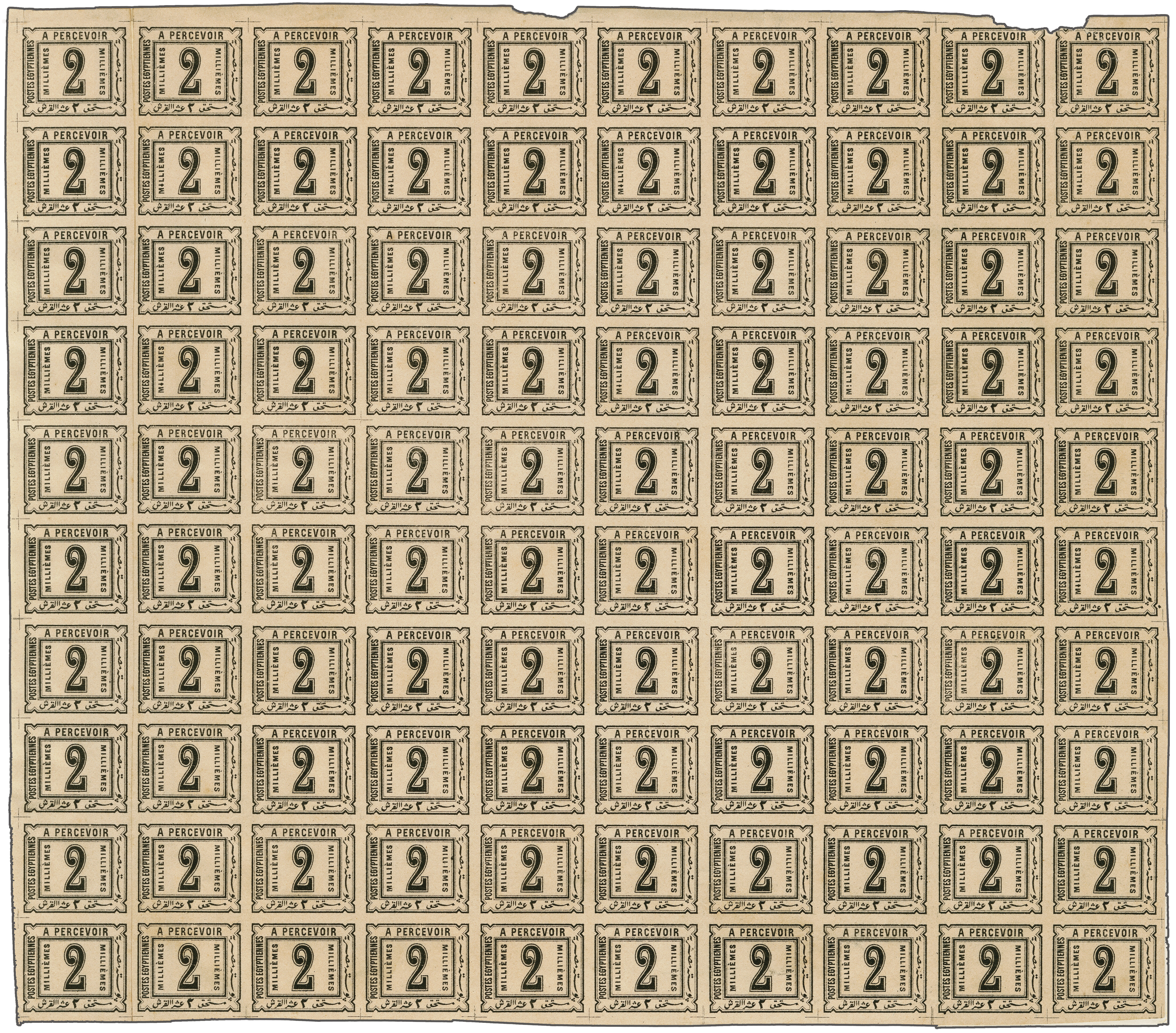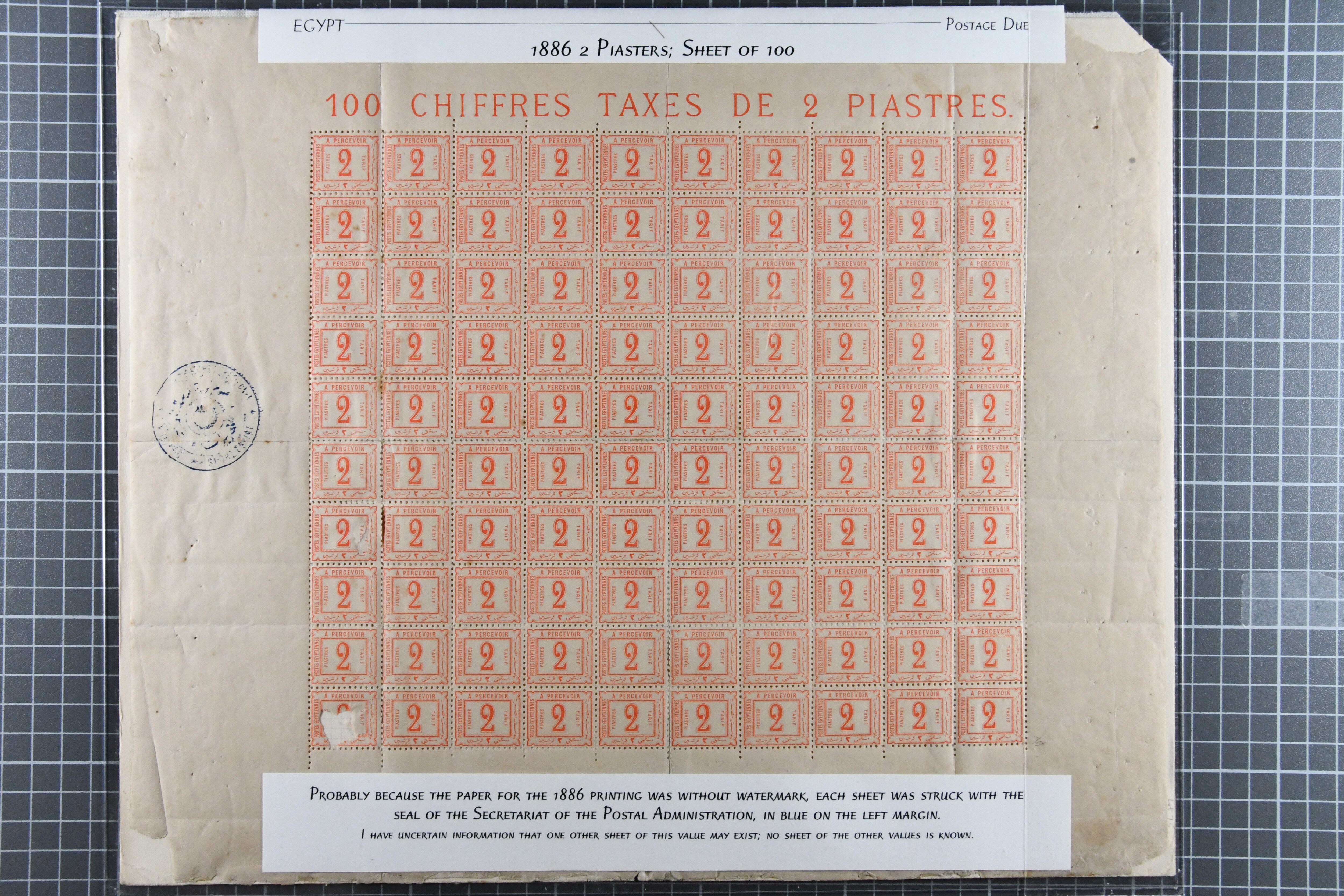 1886: 2 pi.rose-red, the complete sheet of 100 subjects with circular Control handstamp in blue in left margin and imprint 100 CHIFFRES TAXES DE 2 PIASTRES in red at top, position 91 damaged and some minor