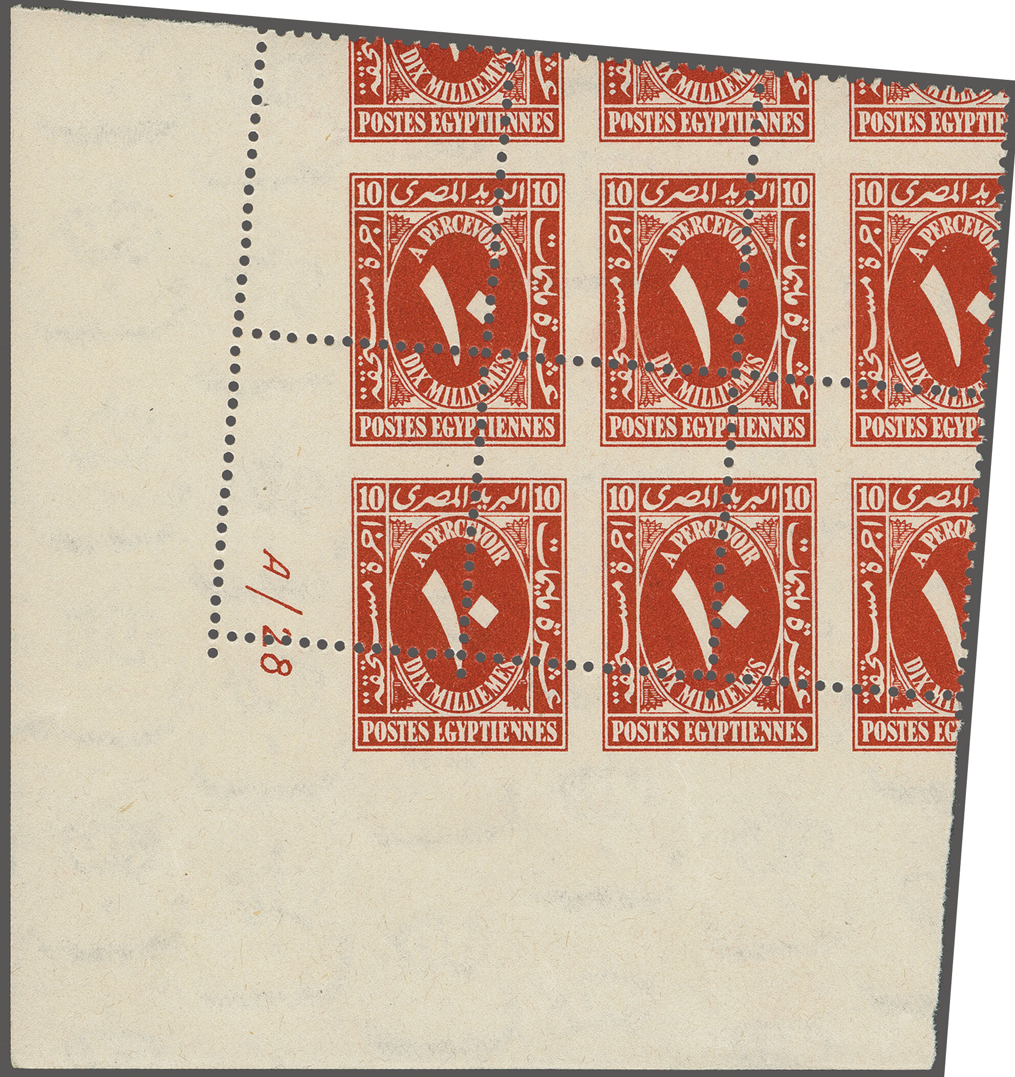 1928: Postage Due 10 m. rose-lake, an unused corner marginal block of six, Control A/28, with Farouk Oblique perforations, fresh and very fine, unmounted og. Scarce Nile Post PD35b = $ 200+. (Image 1)