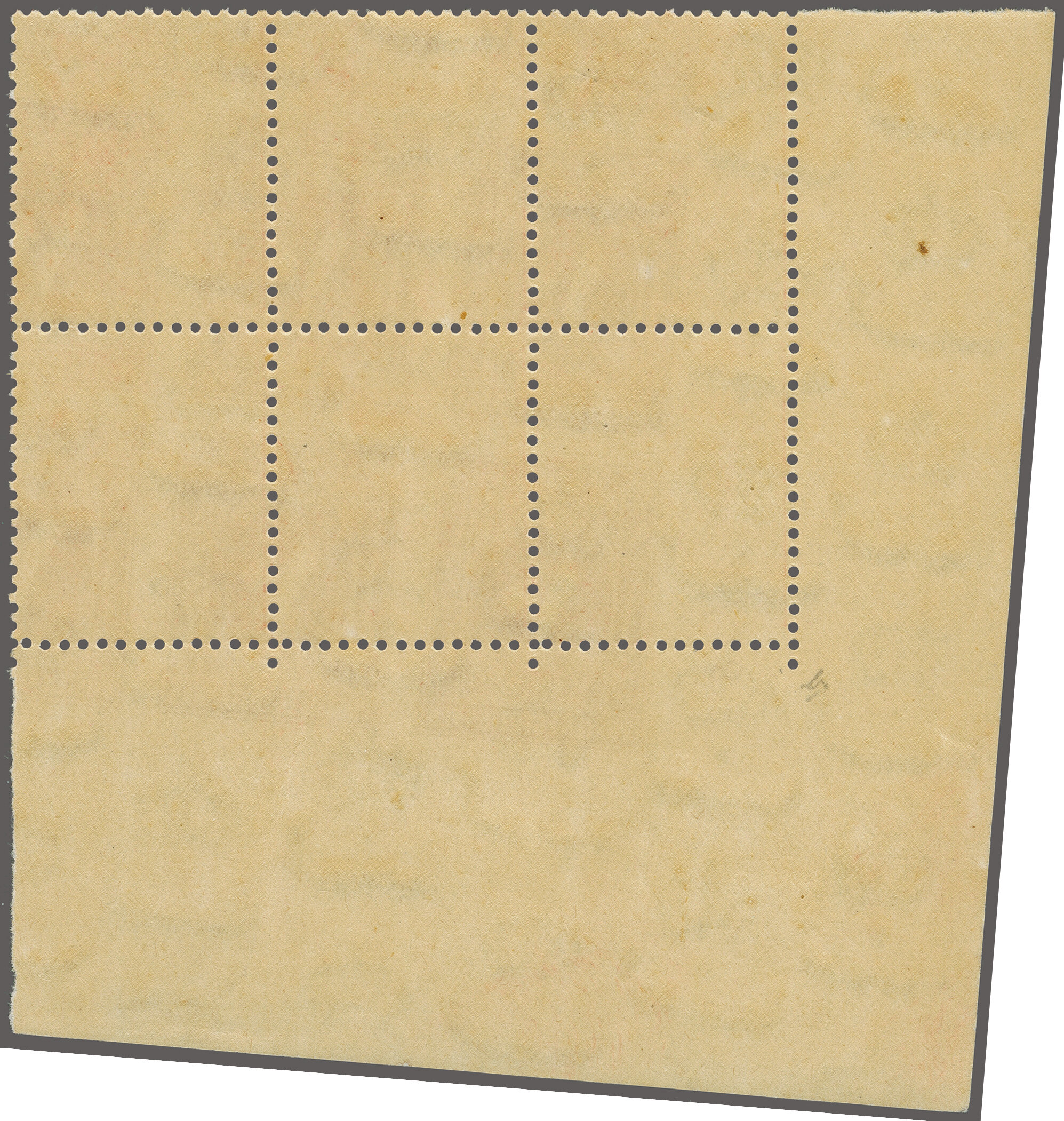 B23 Control block; 10 m. lake in a used block of 50 (5 x 10) on part document - the largest known; 2 pi. orange in a pane of 60 unused with upright opt. and a block of four unused with part of the overprint in the sheet margin, three further 2 pi.