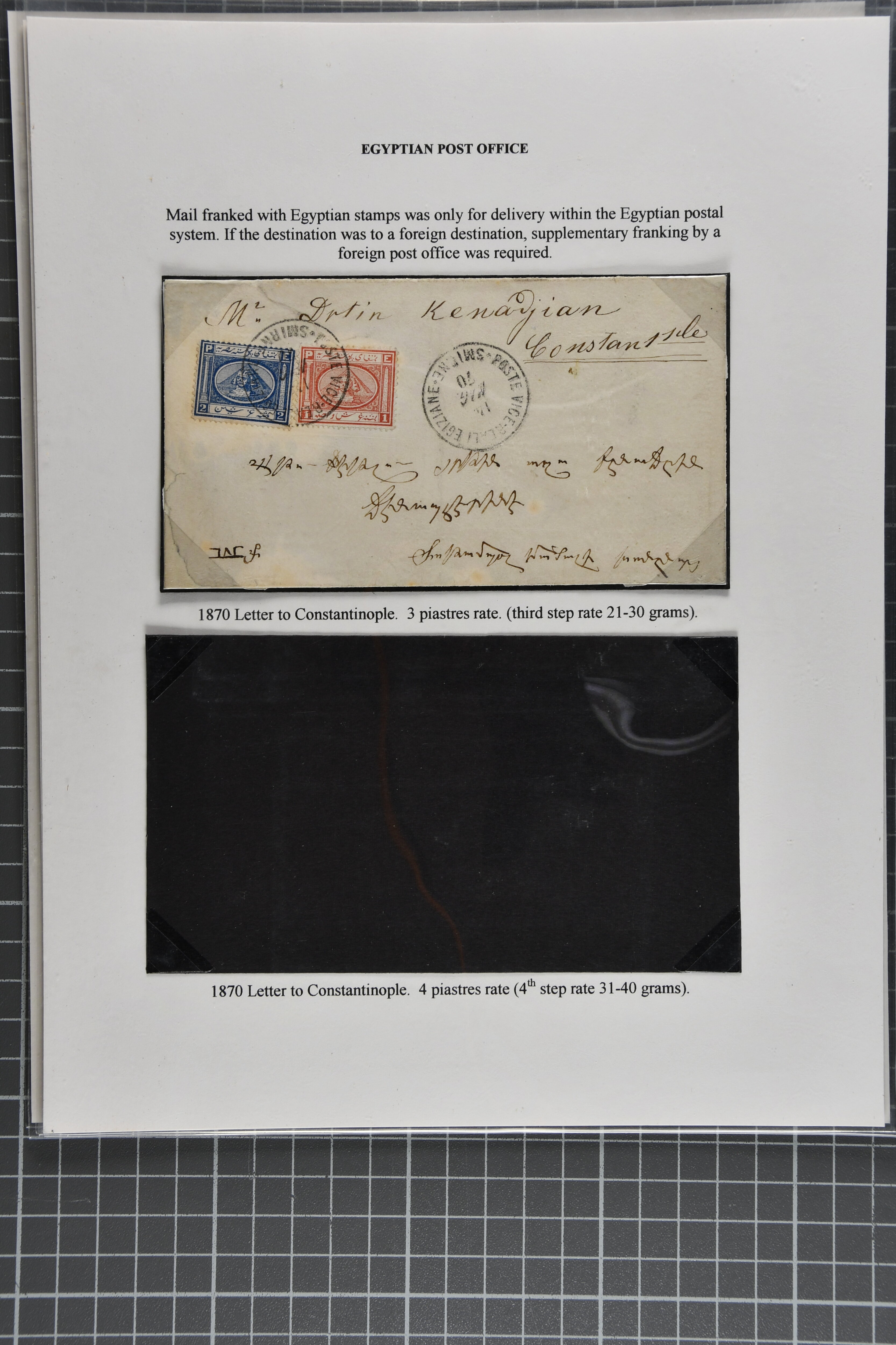 Post Office in Smirne 1867: Covers (3) with double rate "Port to Port" cover to Constantinople bearing Egypt 1867 2 pi. blue tied by "Poste Vice-Reali Egiziane / Smirne" cds; second cover mailed in 1870 at triple