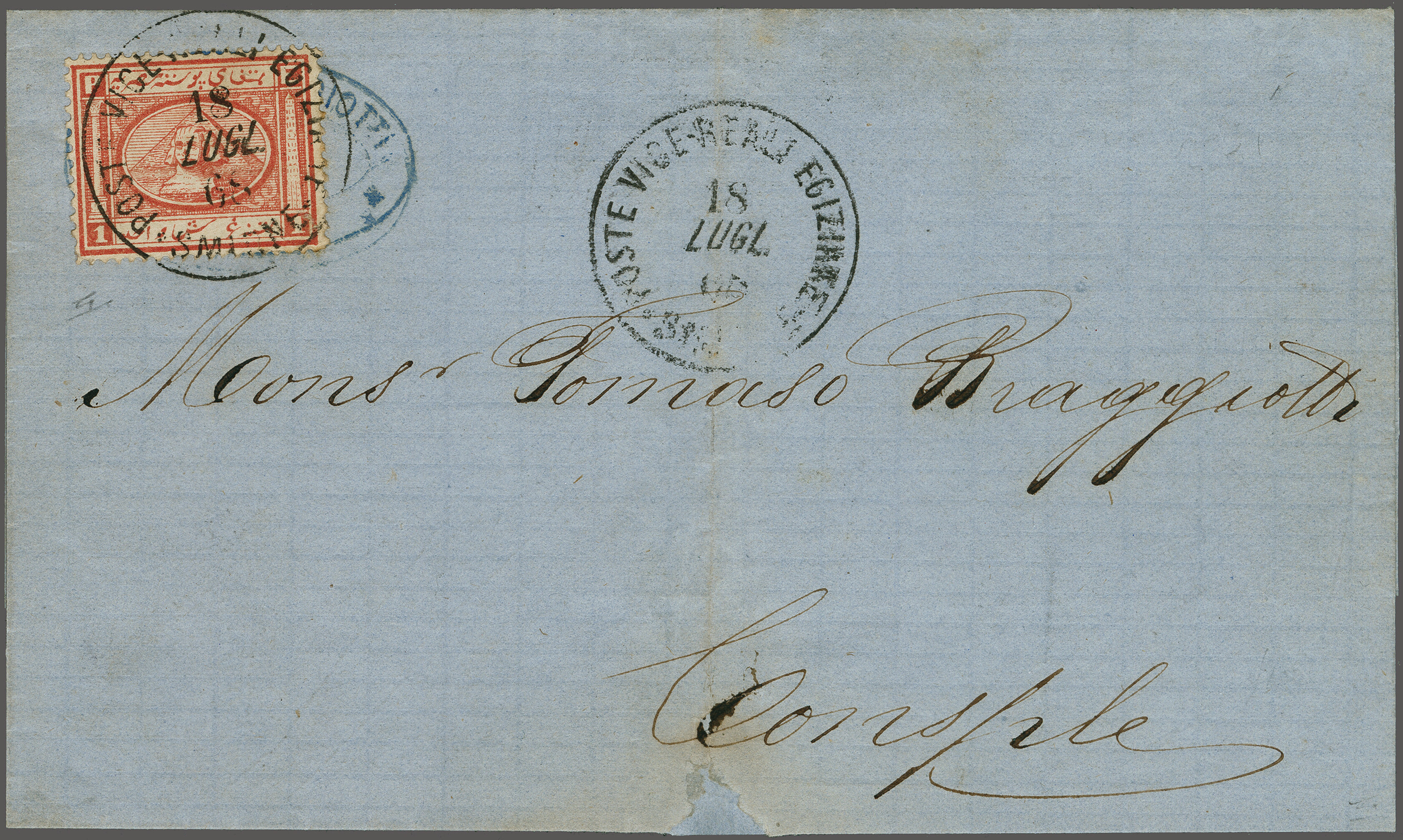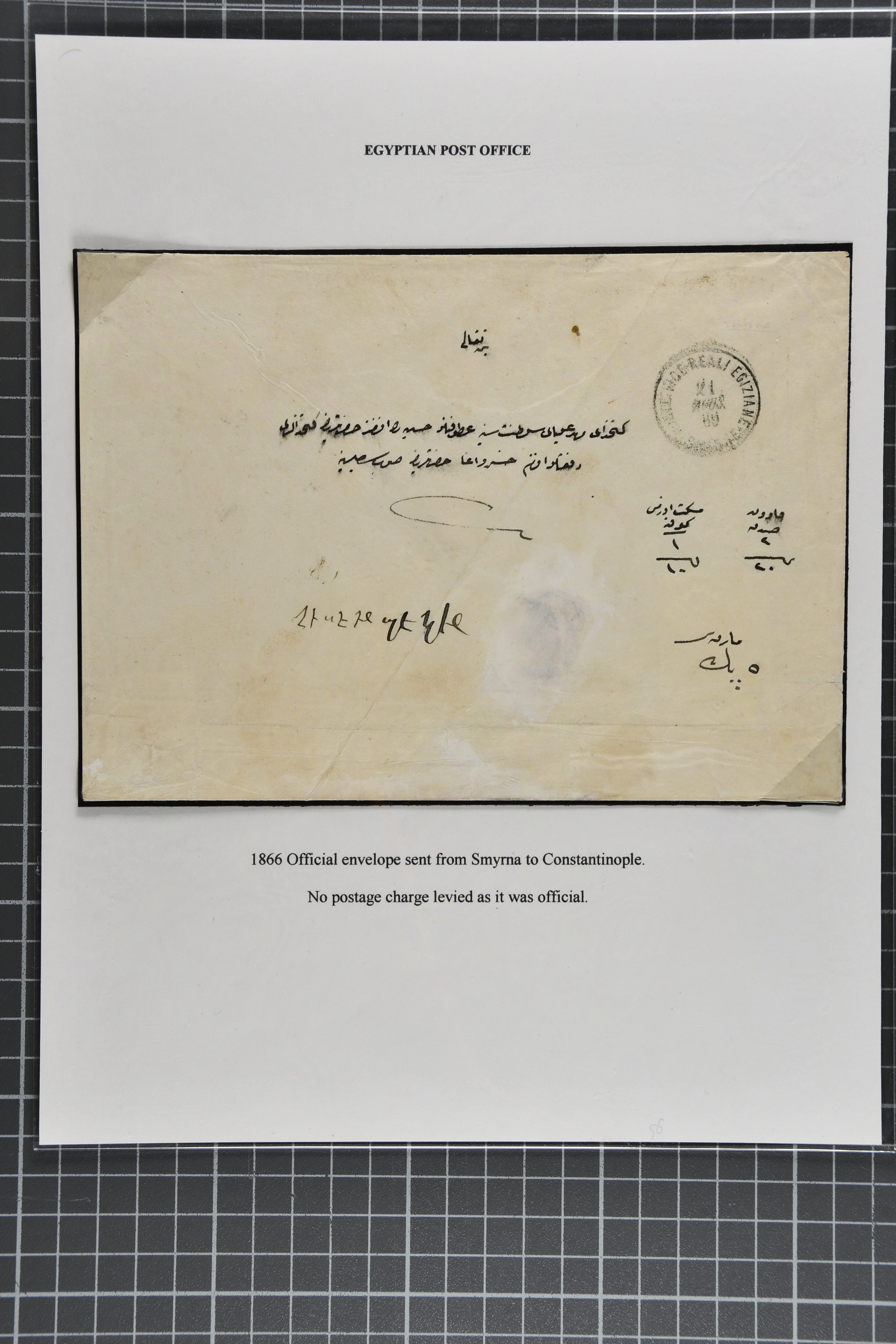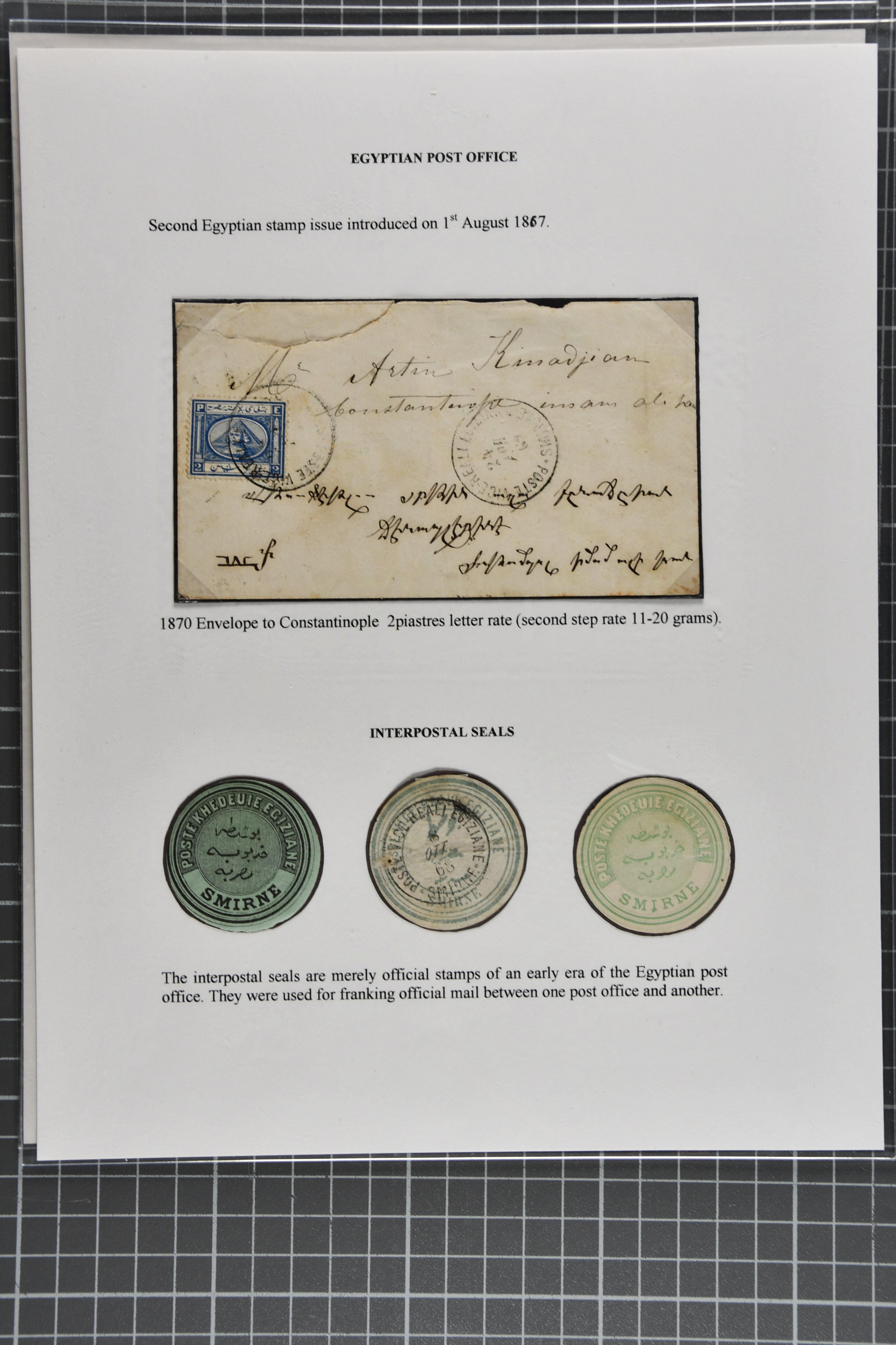 rate with 1867 1 pi. red and 2 pi. blue similarly tied; together with 1869 Offical stampless cover struck with "Poste Vice-Reali Egiziane / Smirne" cds (21 Aug 1869) in black; sold together with three Interpostal seals, one superbly used in 1868; the