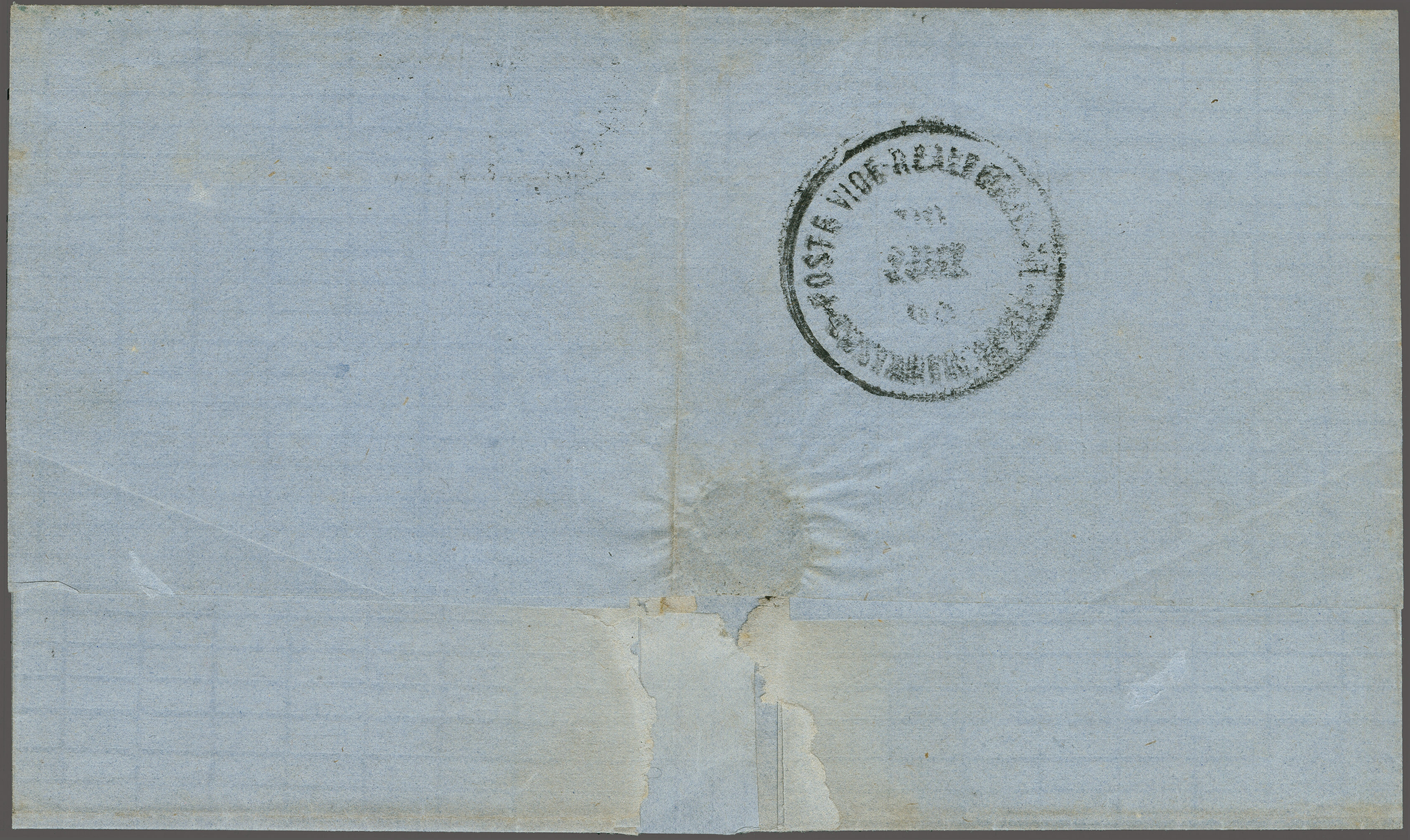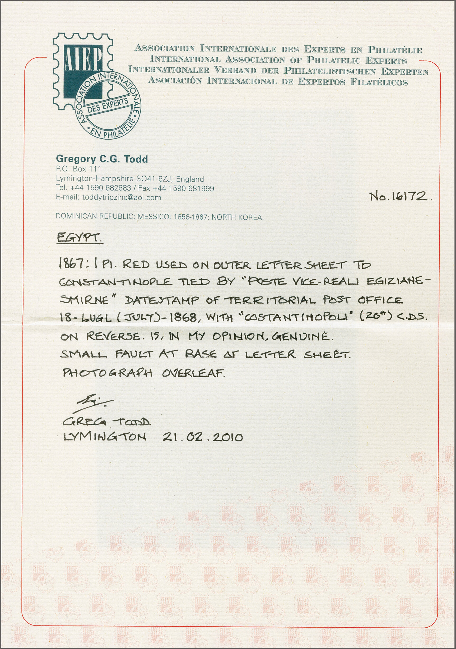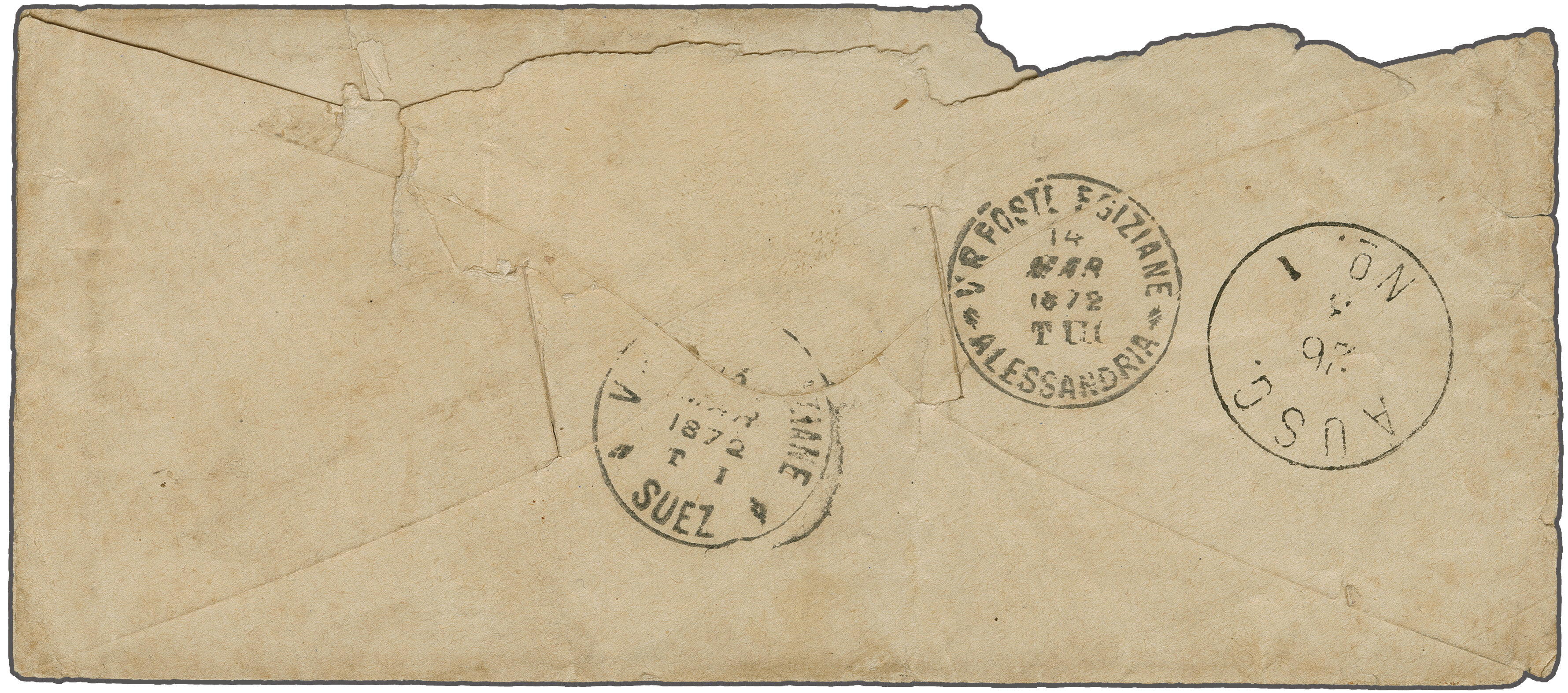 rate with 1867 1 pi. red and 2 pi. blue similarly tied; together with 1869 Offical stampless cover struck with "Poste Vice-Reali Egiziane / Smirne" cds (21 Aug 1869) in black; sold together with three Interpostal seals, one superbly used in 1868; the