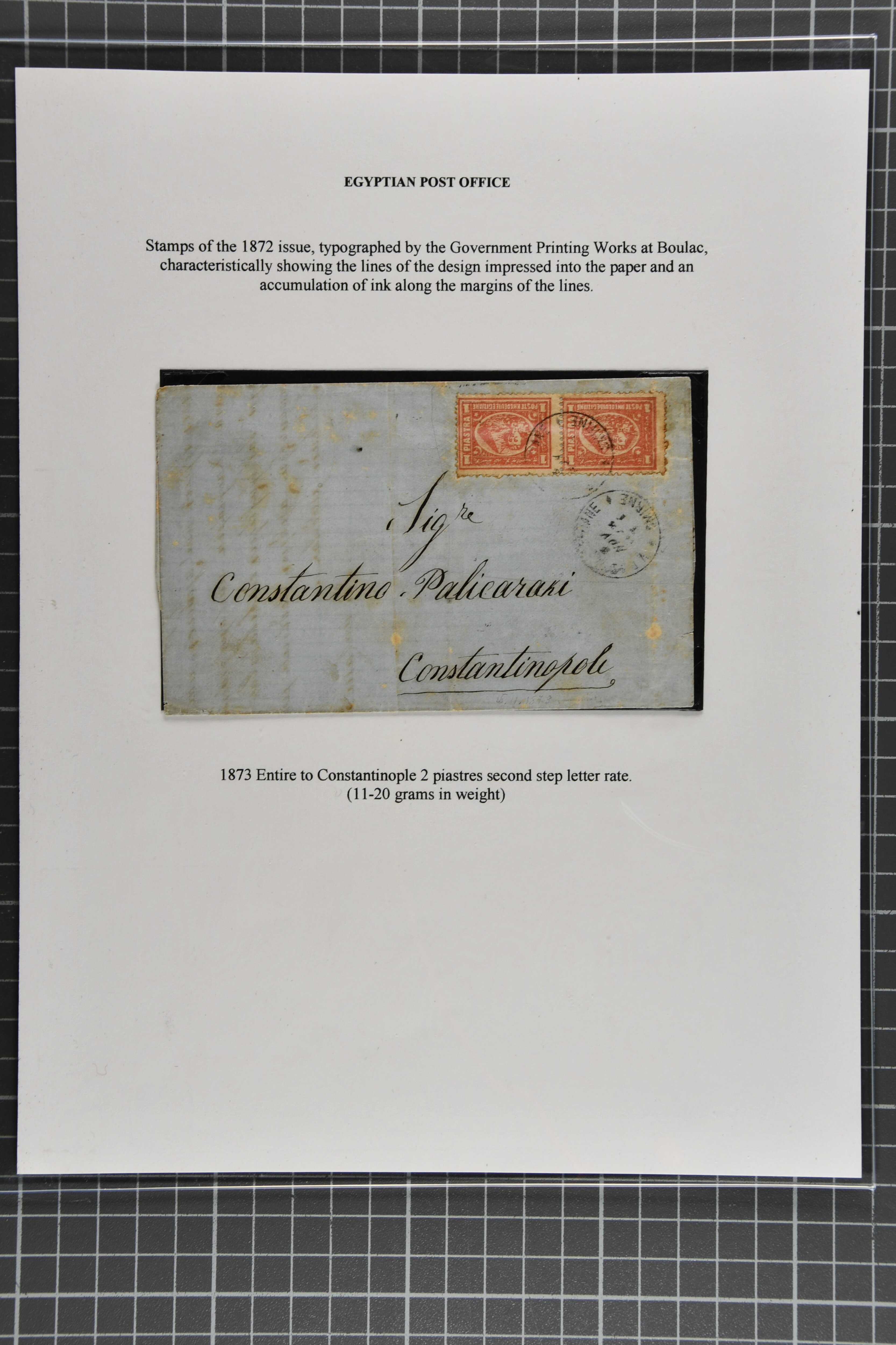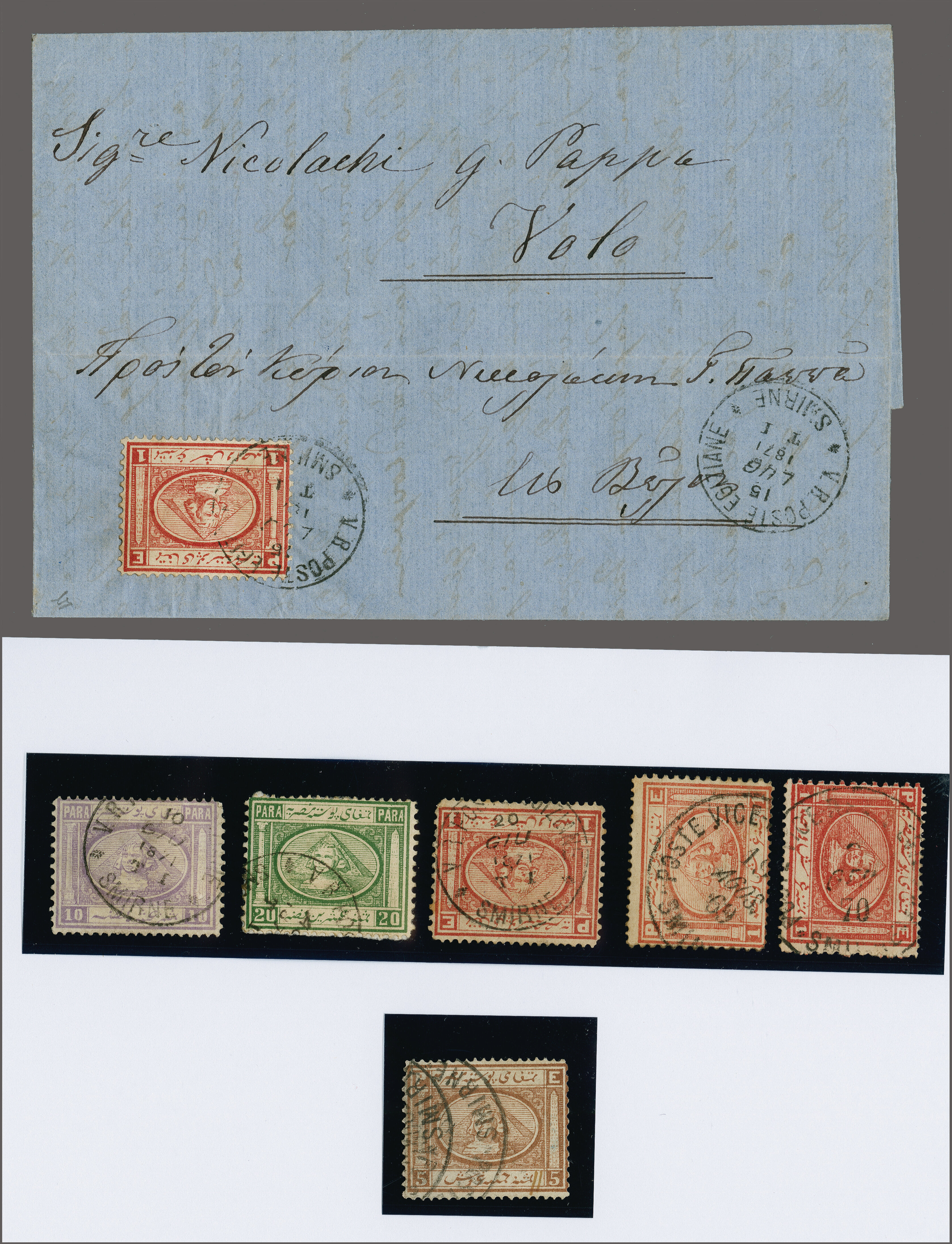 Post Office in Smirne 1872/84: Small collection with 1872 1 pi. red pair used on cover to Constantinople at double rate tied by "V.R. Poste Egiziane / Smirne" cds in black; array of 1872/75 issue off cover with