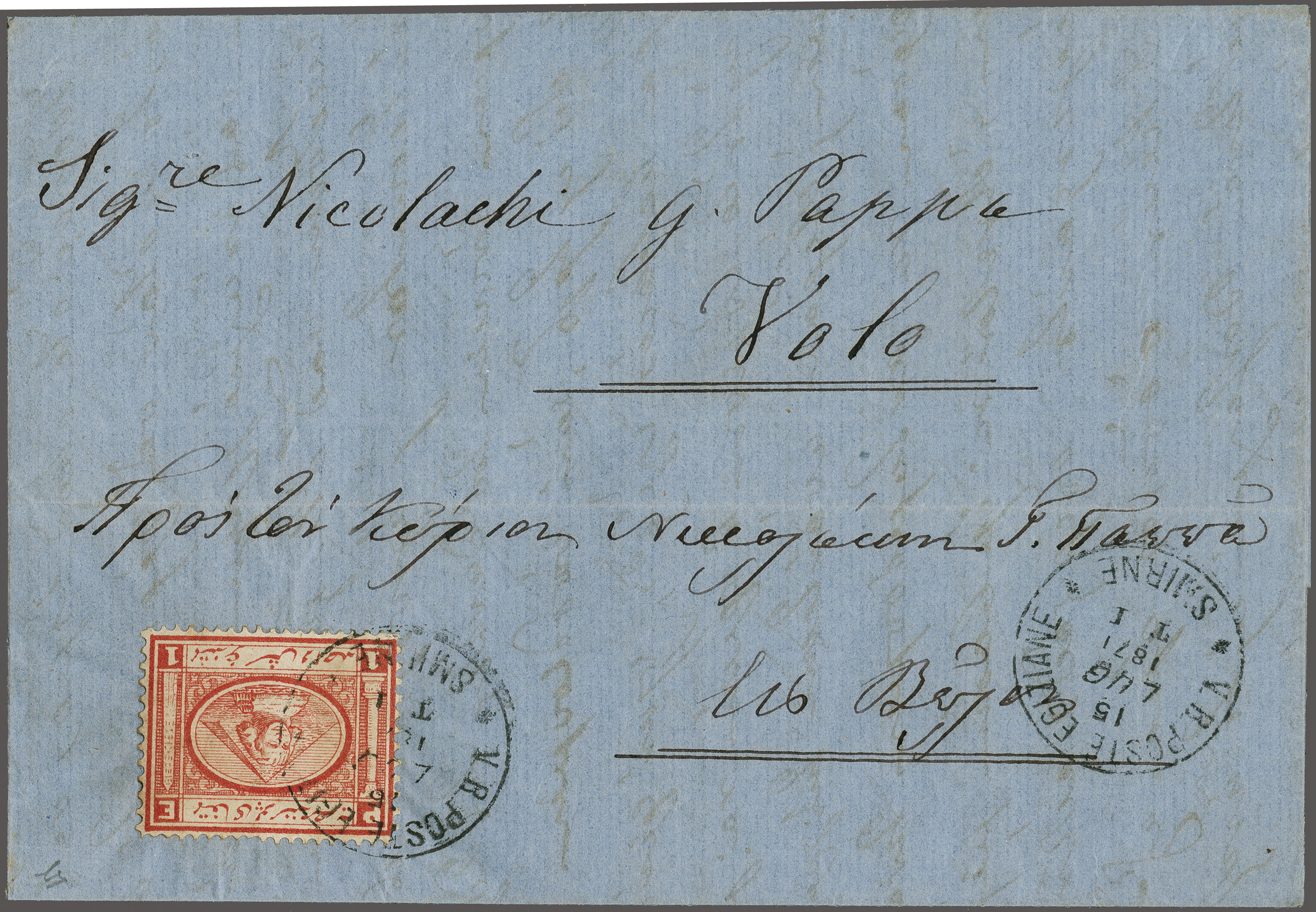 pi. brown being very rare used in a Consular Office, together with a fine entire letter to Volo with single 1 pi. cancelled by "V.R. POSTE EGIZIANE / SMIRNE" cds with information strike alongside. (Image 1)