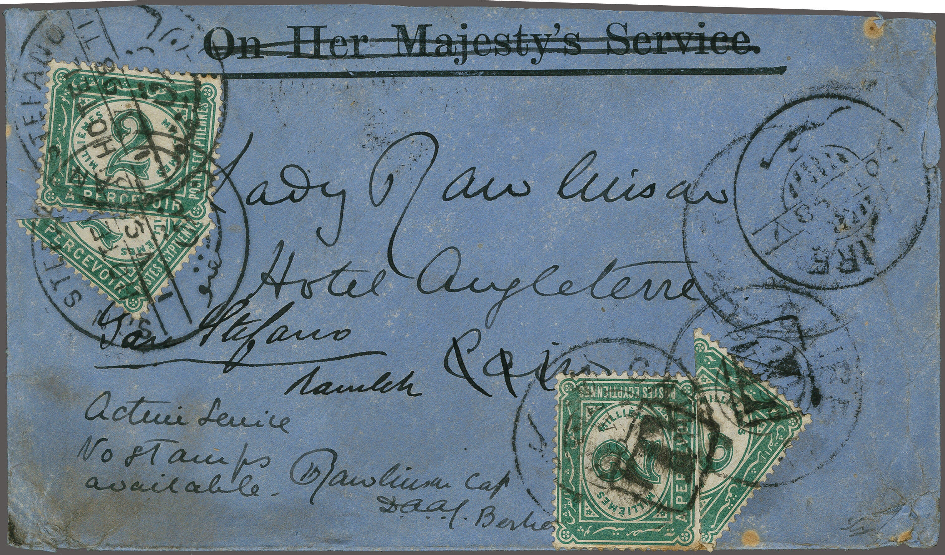 1889: OHMS deleted envelope endorsed 'On Active Service, No Stamps Available', mailed from a Captain Rawlinson in Halfa, Sudan (he was on Kitchener's staff) to Lady Rawlinson at the Hotel Angleterre in Cairo, taxed on arrival
