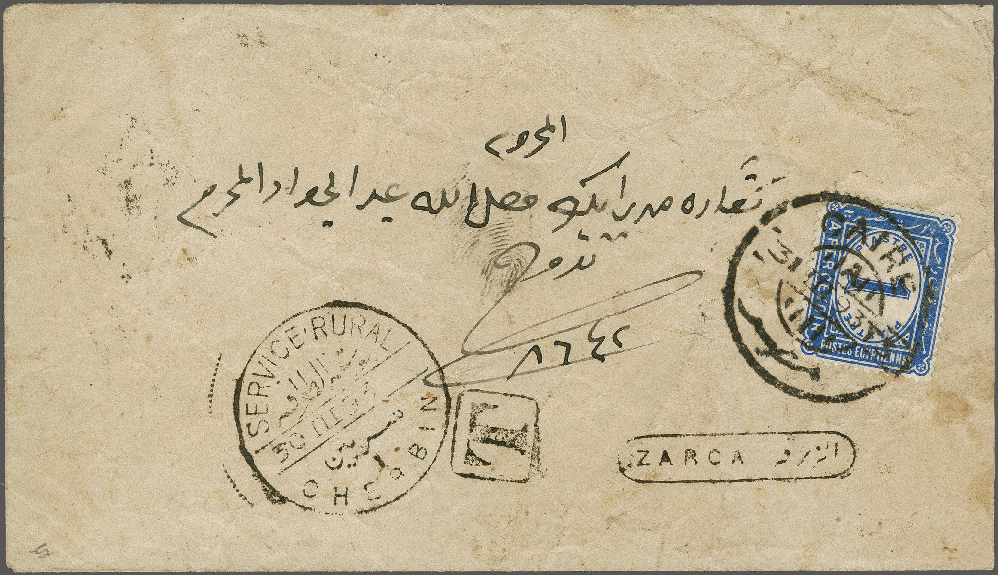 1889: 1 pi. ultramarine tied on arrival to unpaid stampless 1893 cover to Cairo from Zarqa (framed handstamp in black) with fine circular SERVICE-RURAL / CHERBIN datestamp at right. Some creasing due to method of transport (by