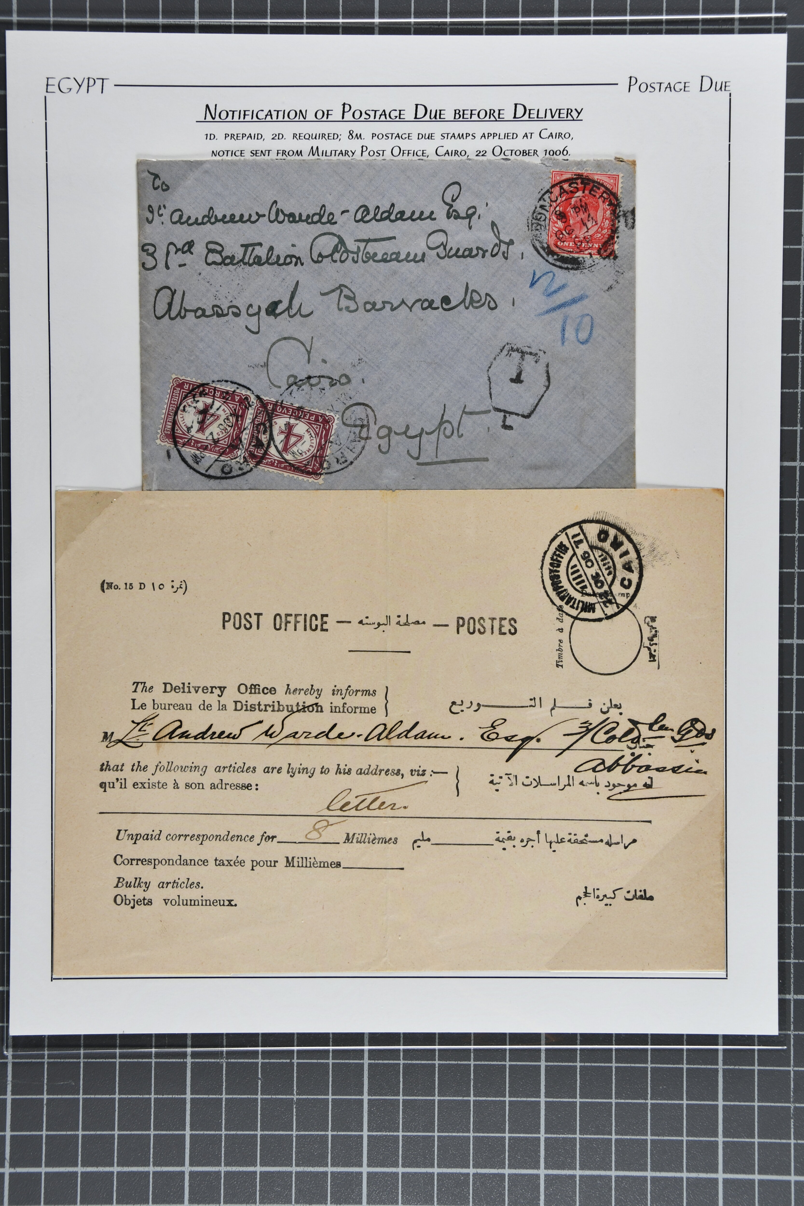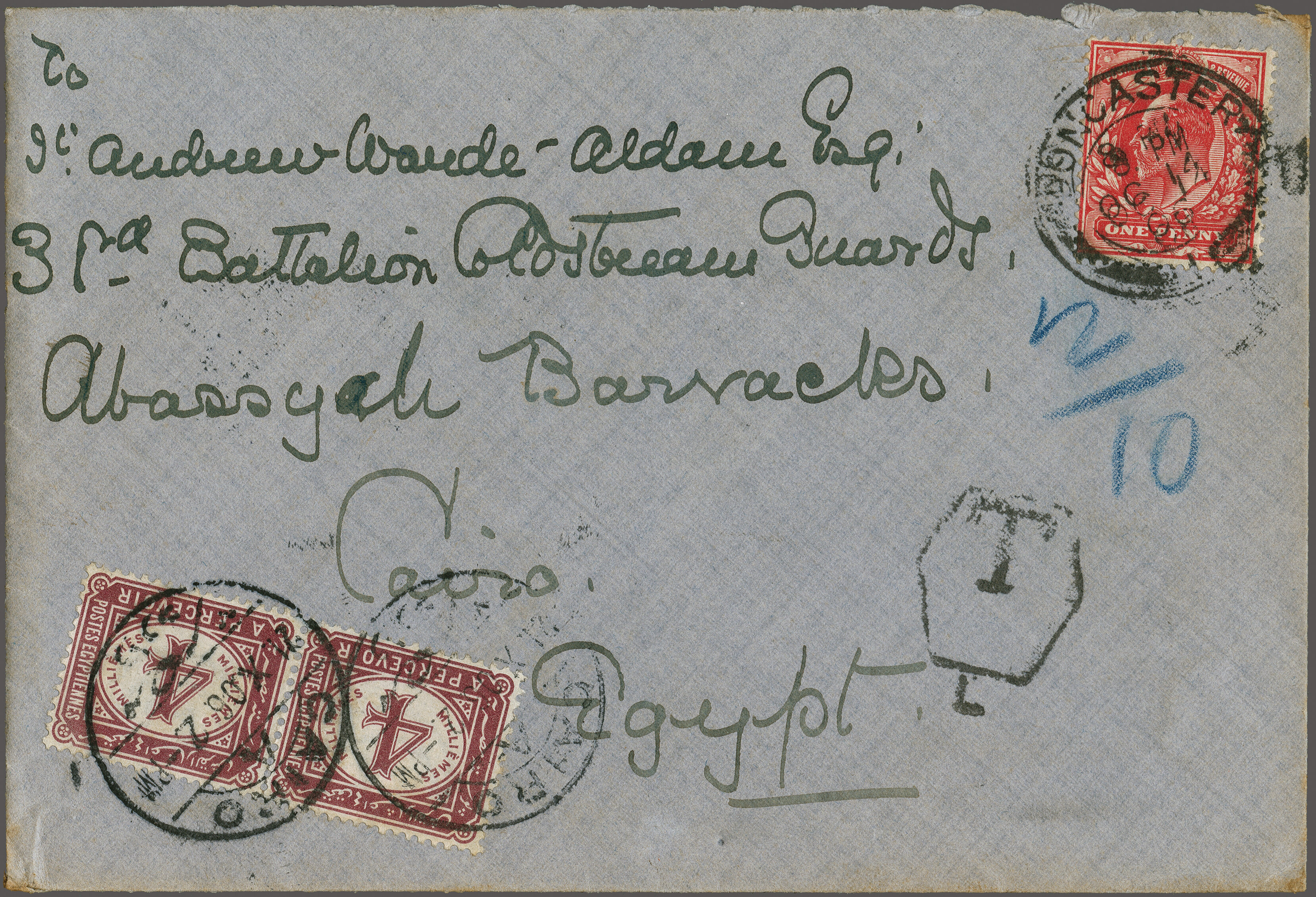 1906: Cover from UK to Cairo franked by 1902 1 d. scarlet tied by Doncaster cds (Oct 14). Underpaid and taxed on arrival with 1889 4 m. maroon pair tied by Cairo cds, with the original Post Office distribution form for