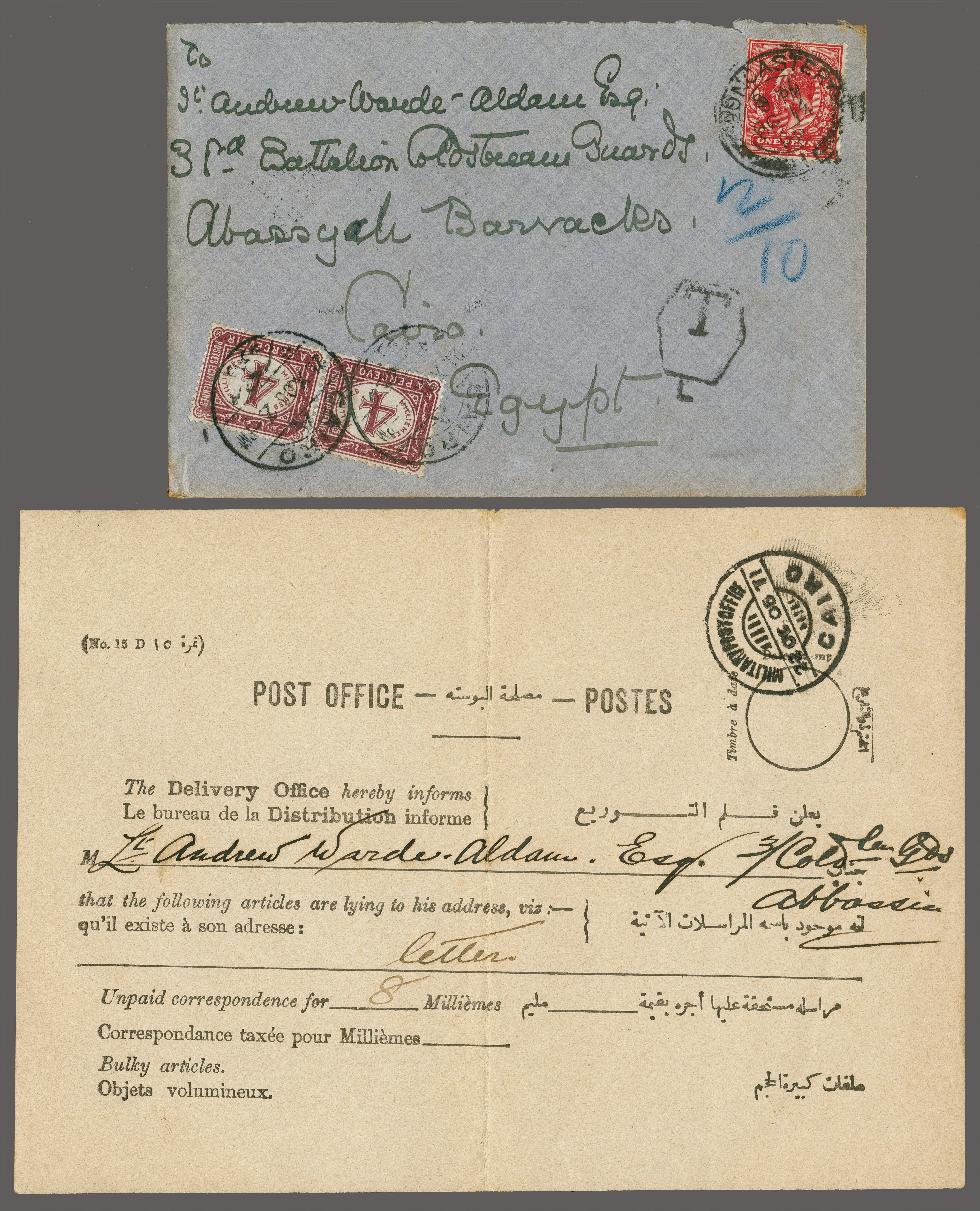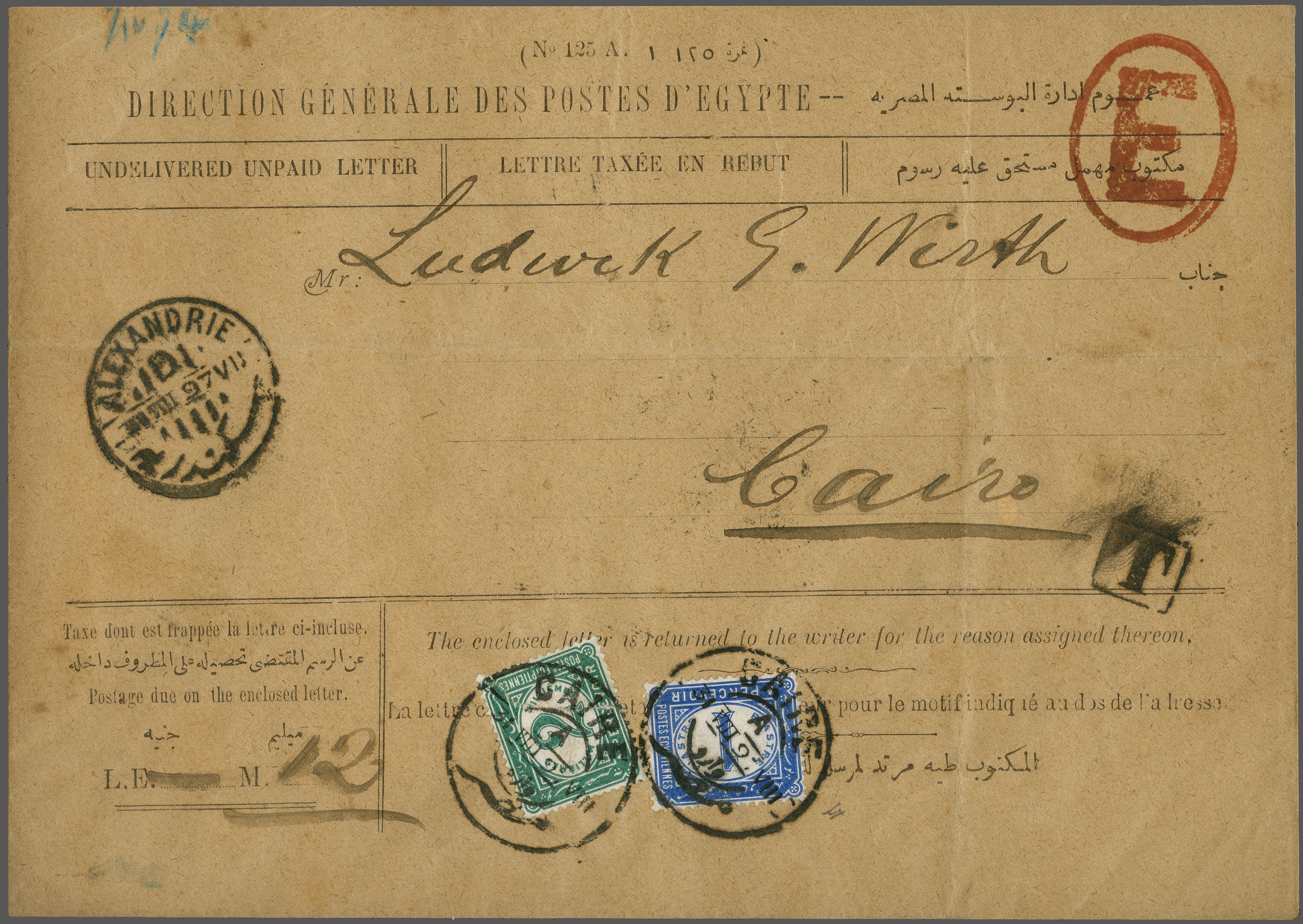1897: Post Office envelope returning an unpaid letter (envelope No. 125 A), handstamped 'E' in oval in red, sent to Cairo with 1889 Postage Due 2 m. green (handling fee) and 1 pi. ultramarine (charge due) tied by Cairo cds's