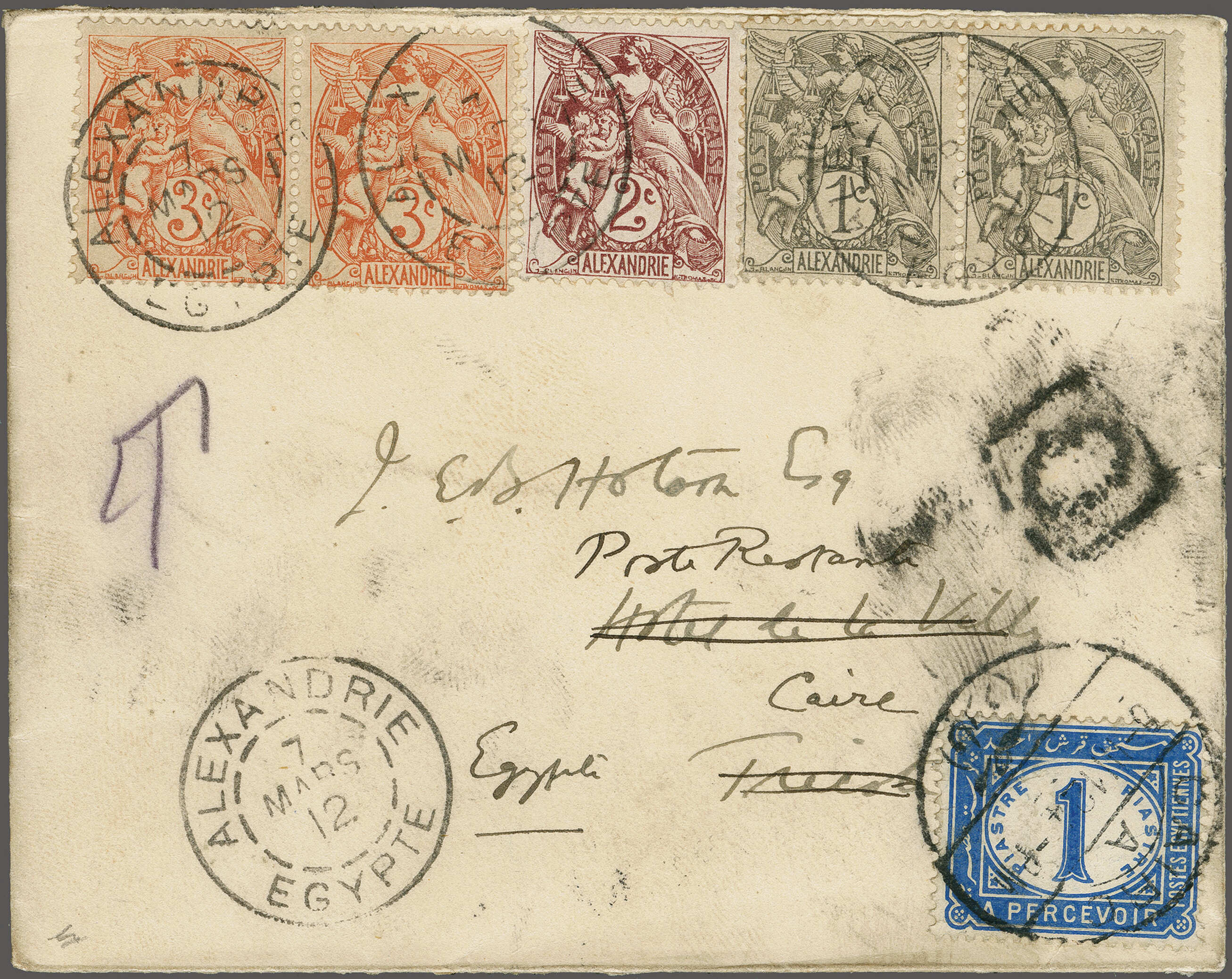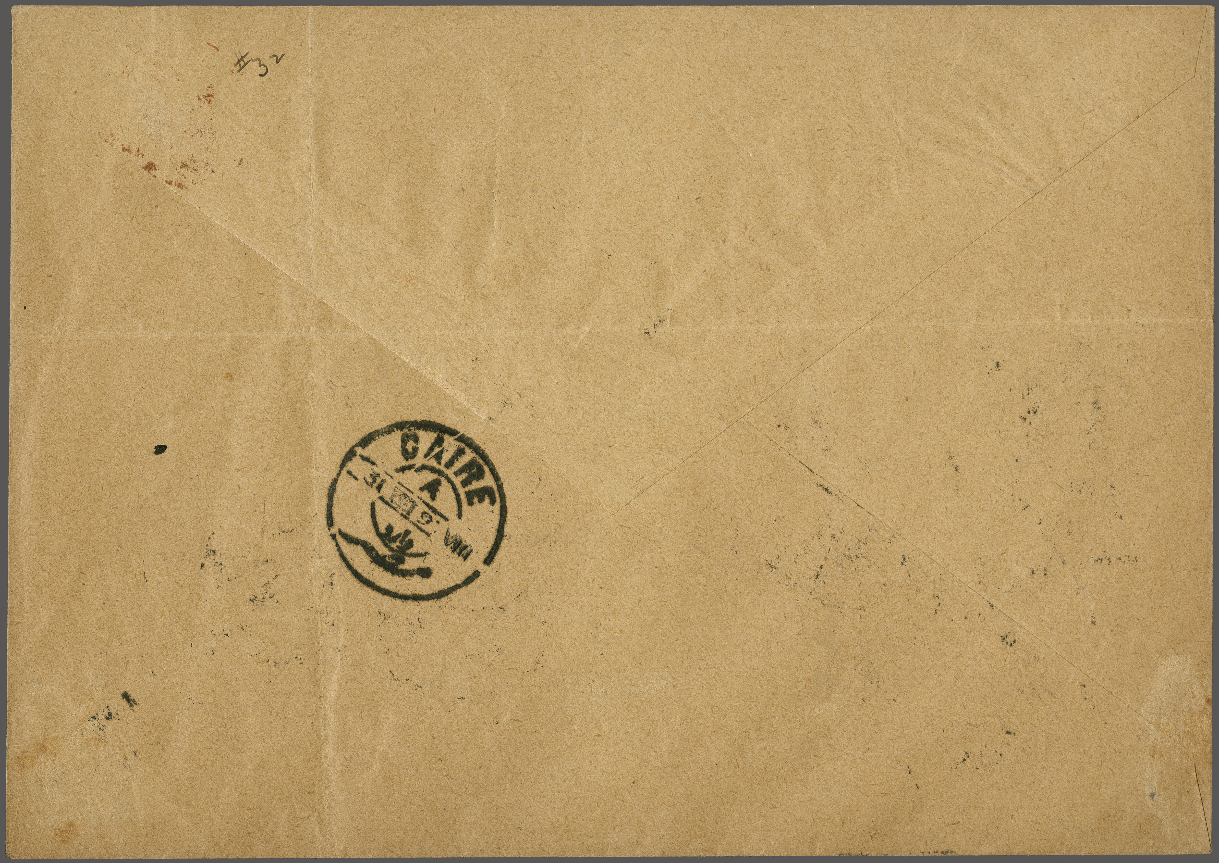 sender where taxed with 1889/1907 1 pi. ultramarine tied by Cairo cds. The French P.O. adhesives were not valid for mail within Egypt and the cover was marked with framed 'O' prior to being taxed by a Postal Clerk with dirty hands. (Image 1)