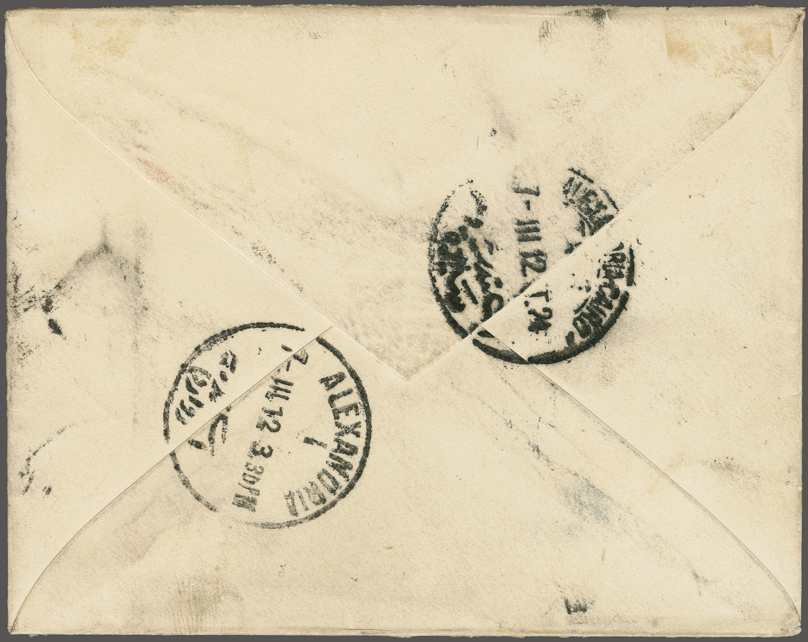 1912: Cover from French P.O. in Alexandria with 1902 Blanc 1 c. grey pair, 2 c. maroon and 3 c. orange pair mailed to Trieste tied by 'Alexandrie' cds's (March 7), correctly prepaid for journey but re-addressed to Cairo by