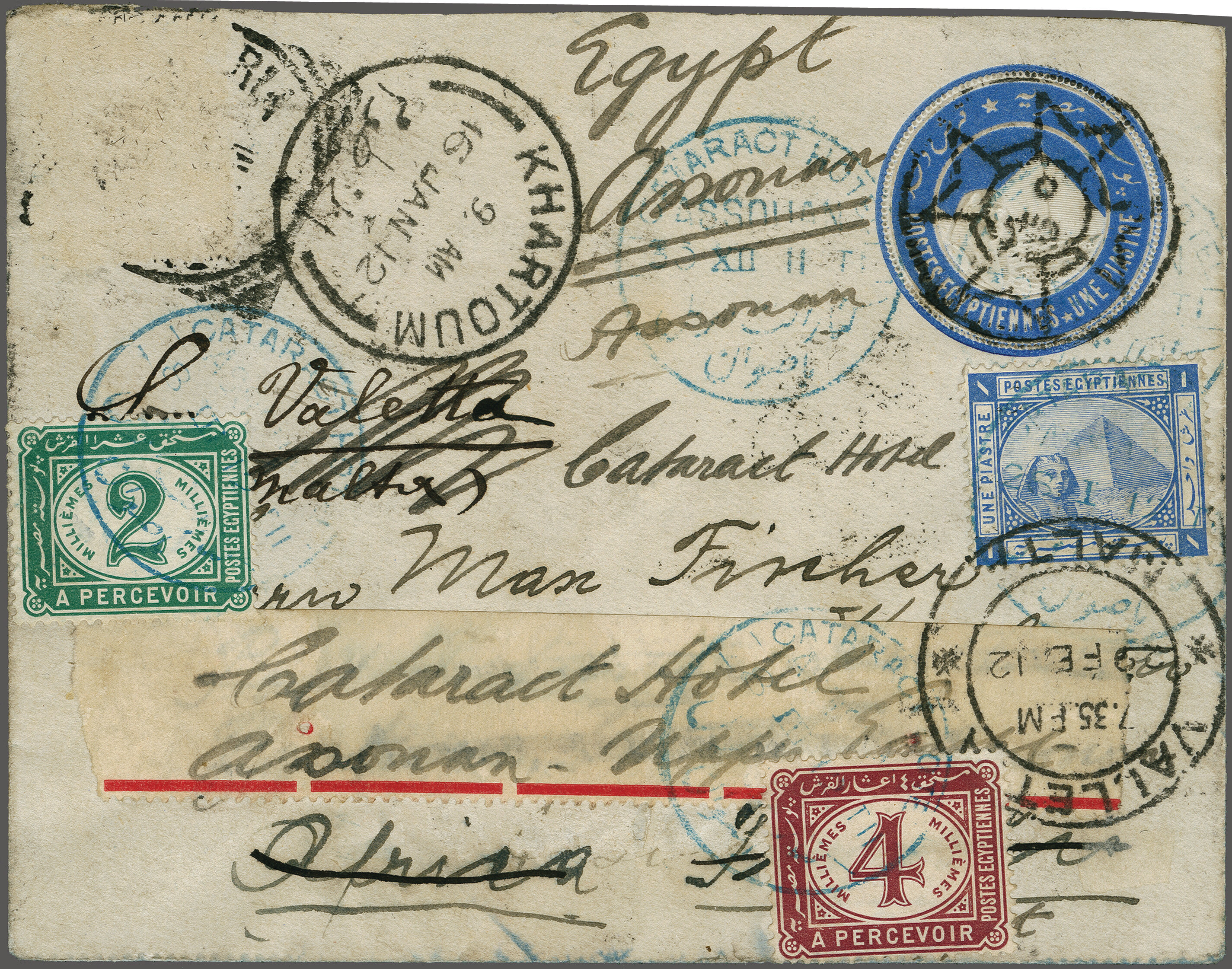 by 'Cataract Hotel / Assouan' cds in blue (28.I). Taxed on arrival in Libya but stamp removed when payment was not forthcoming, forwarded on to Malta (Cross cancel at upper right) with cds verso (Feb 27), thence back to the Cataract Hotel where