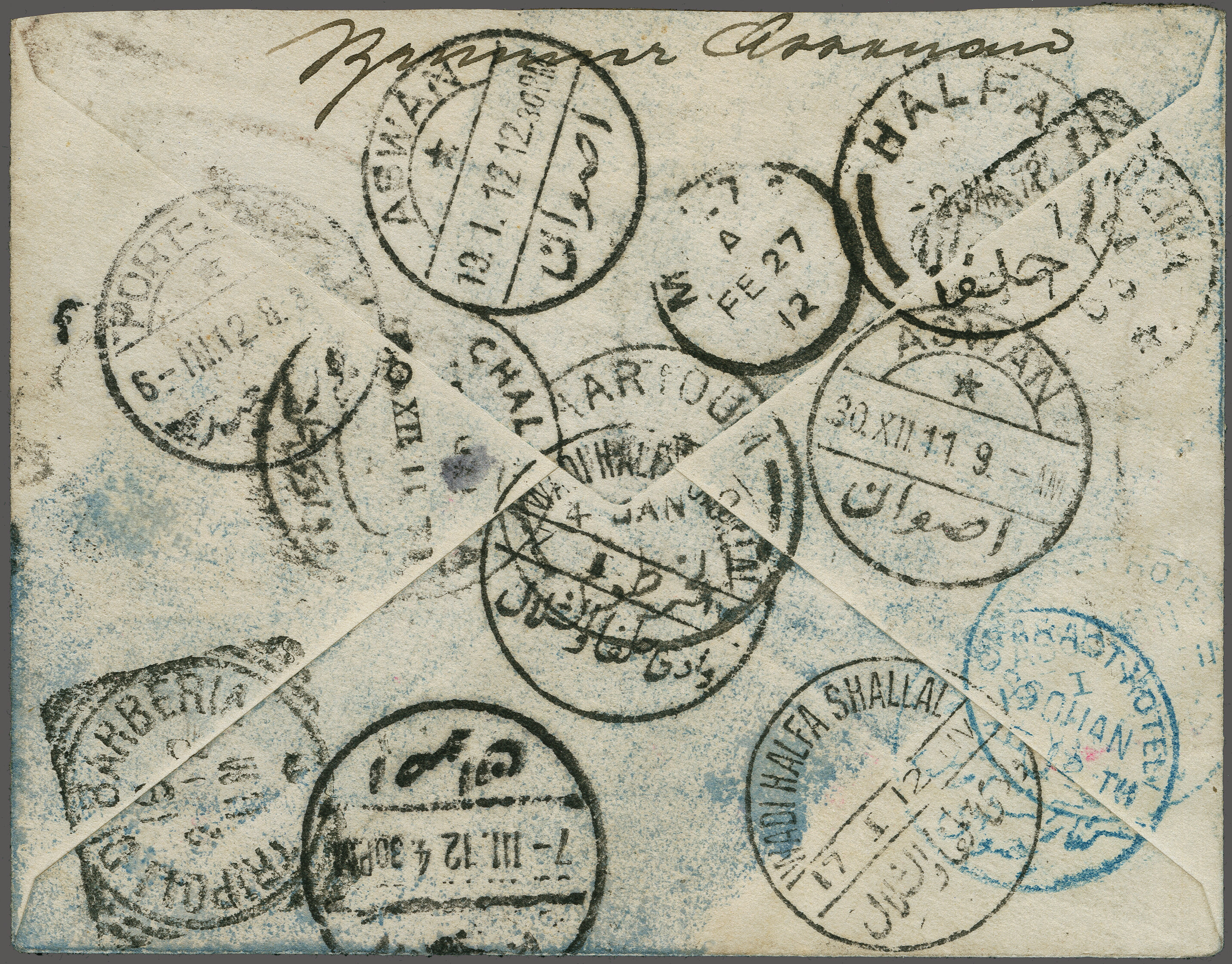 1911: 1 pi. stationery envelope mailed to Khartoum cancelled by CATARACT HOTEL / ASSOUAN cds's in blue (30.XII). Returned to sender from Khartoum (Jan 16) and mailed on to Tripoli, Libya with additional 1 pi. ultramarine tied
