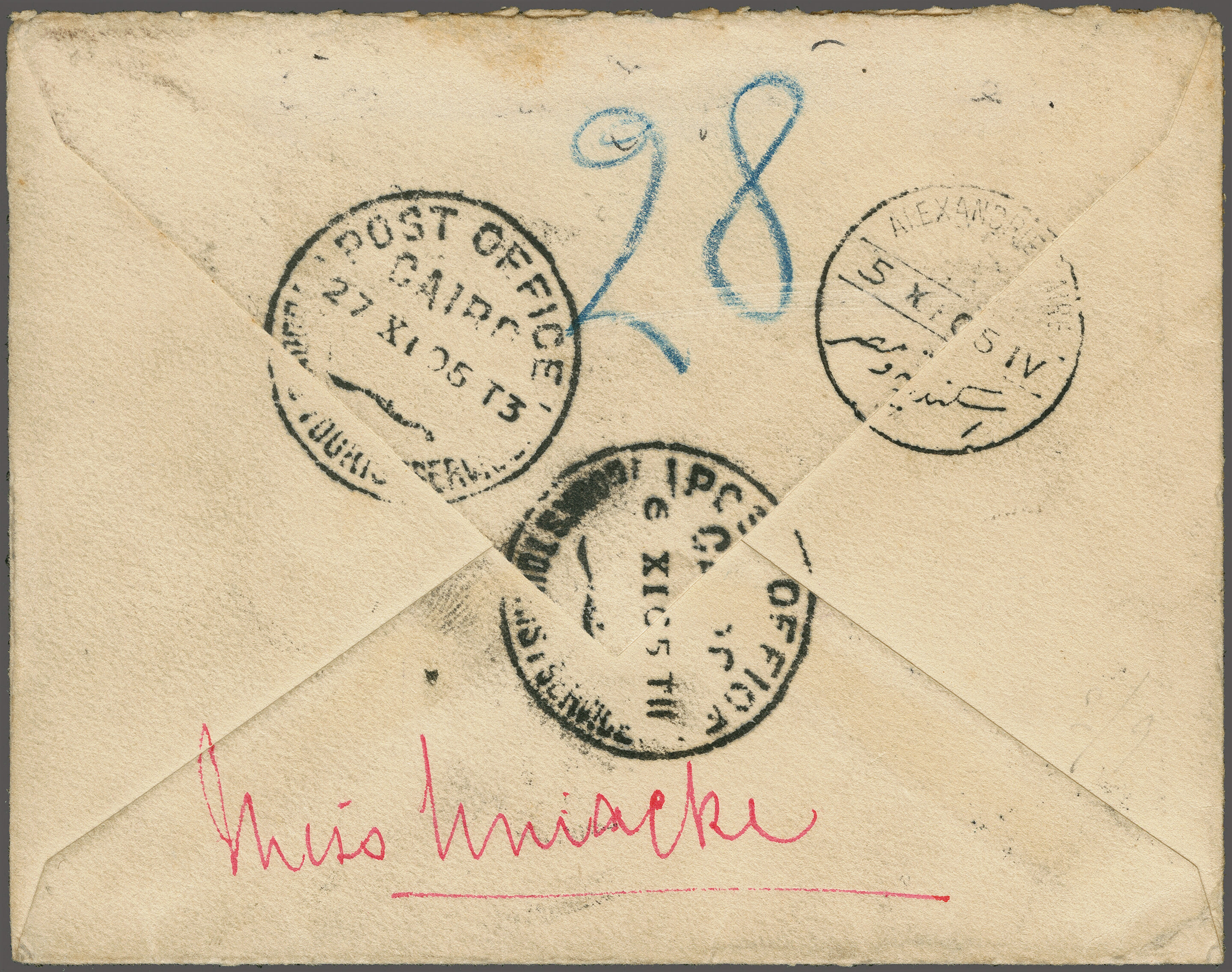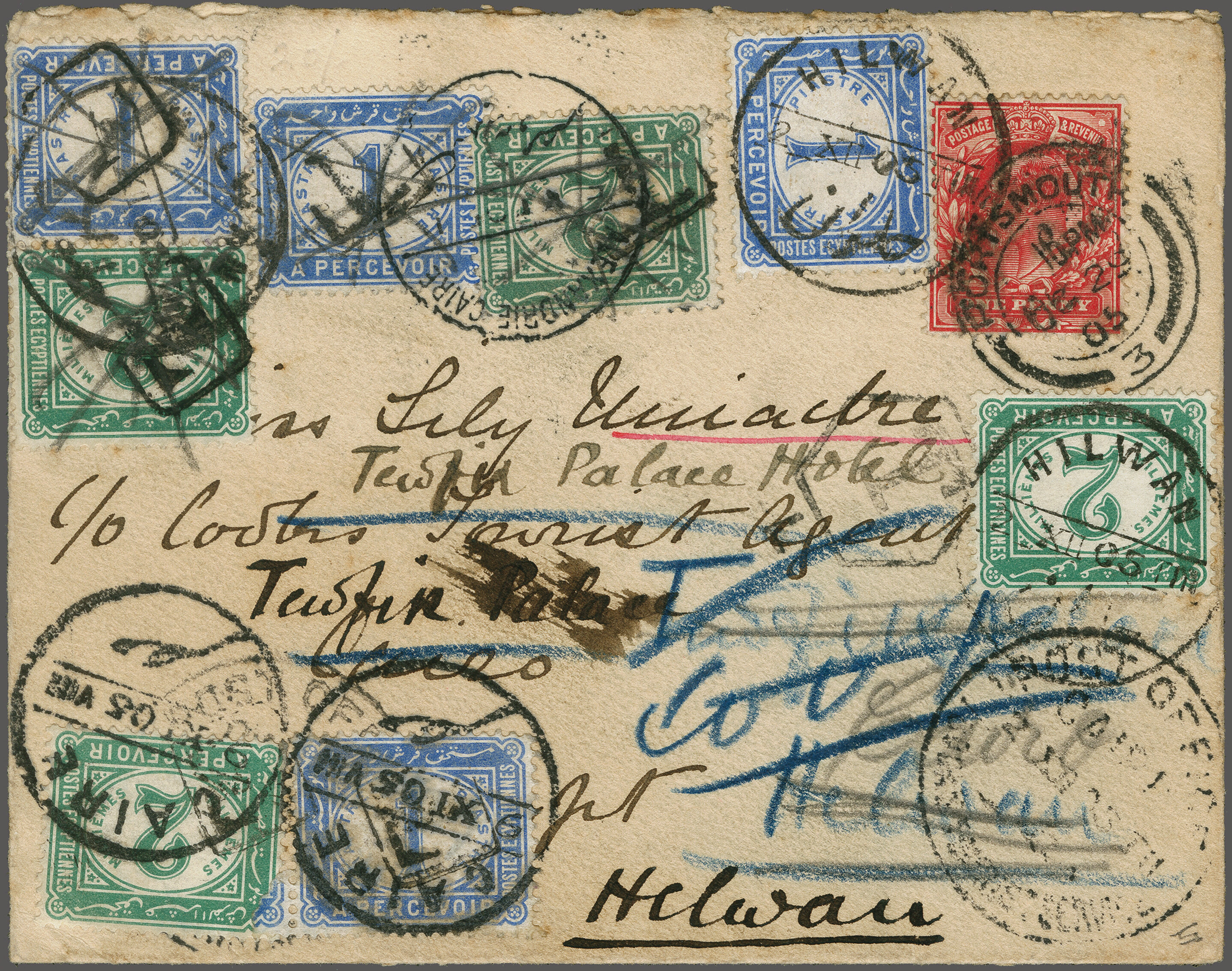 1905: Cover from London with GB 1902 1 d. scarlet tied by Portsmouth cds (Oct 29), underpaid 1½ d. and readdressed three times and taxed each time by 1889 2 m. green and 1 pi. ultramarine, initially on the 'Alexandria-Cairo'