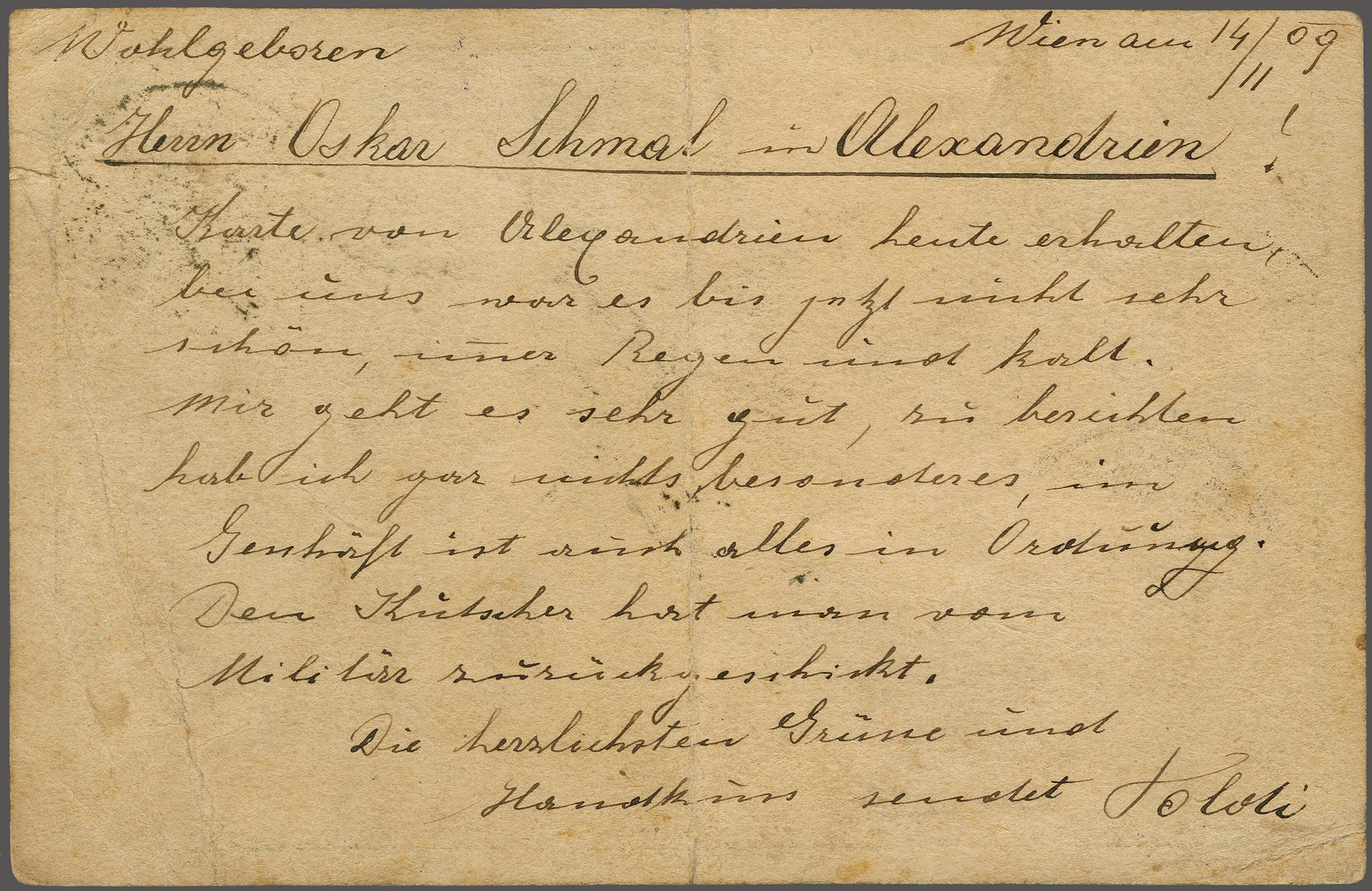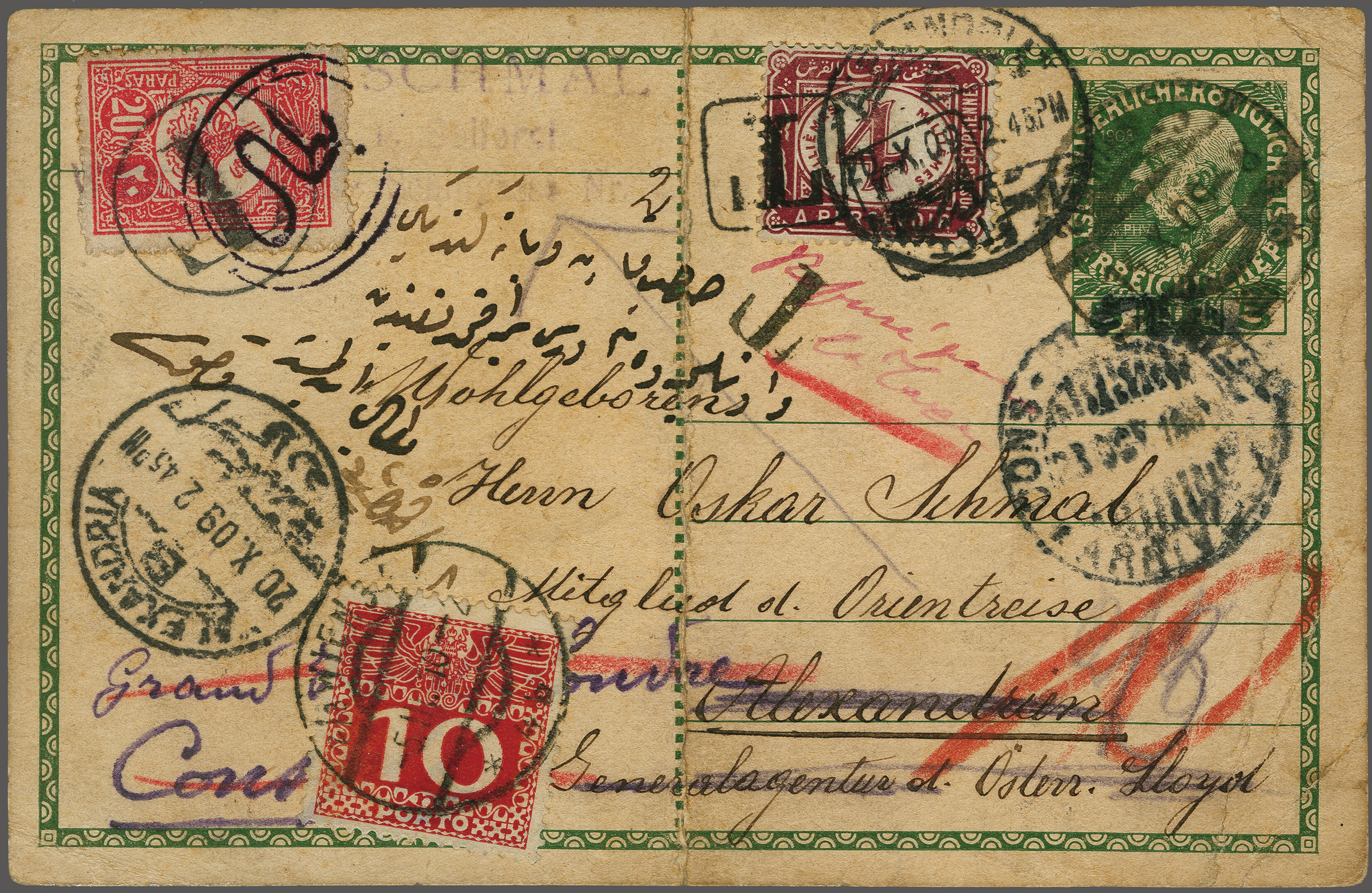 1909: Austria 5 h. green stationery card used to Alexandria, underpaid on despatch in Vienna and taxed on arrival with annulled 4 m. maroon, the card forwarded on to Constantinople where taxed by 20 pa. red also annulled as