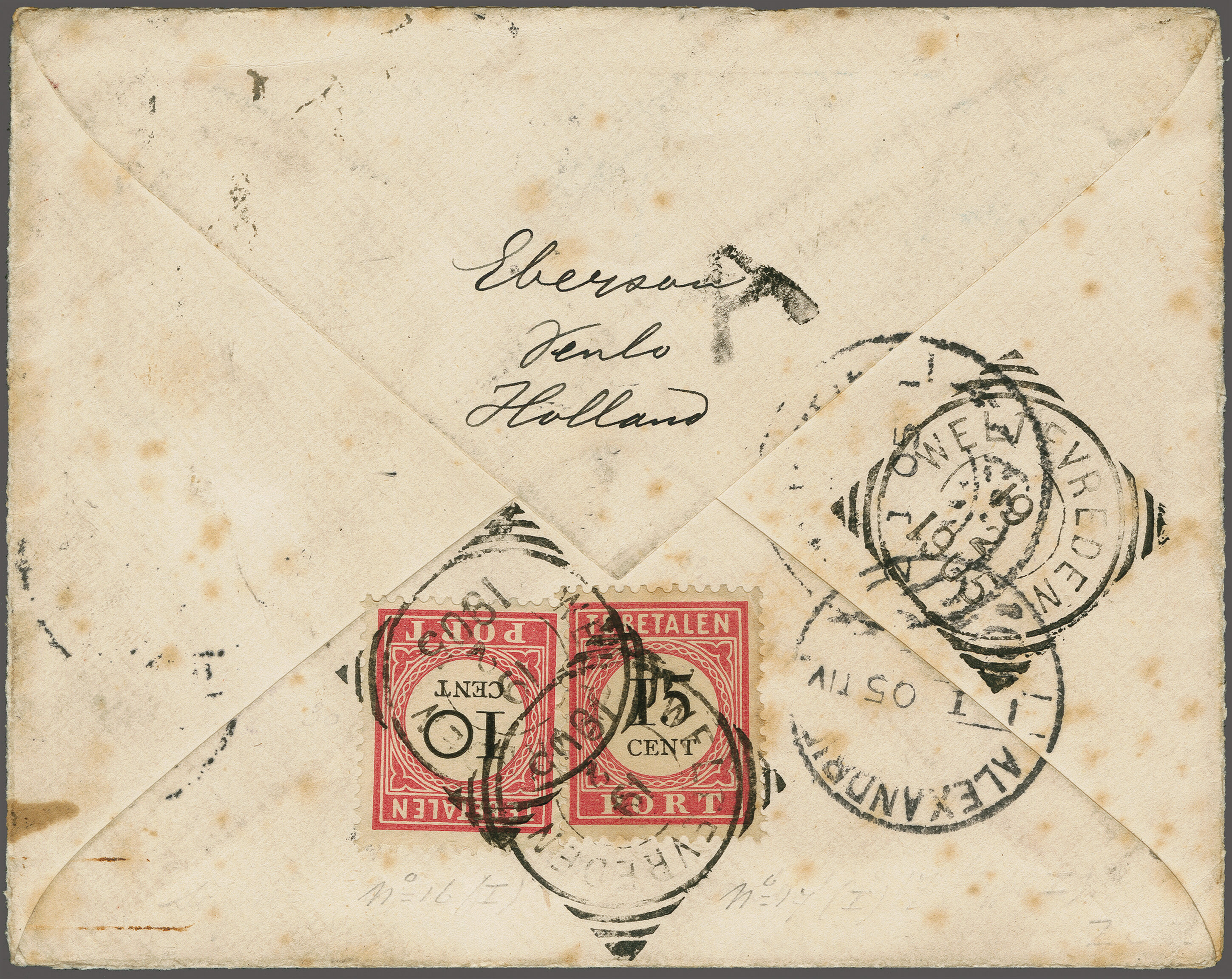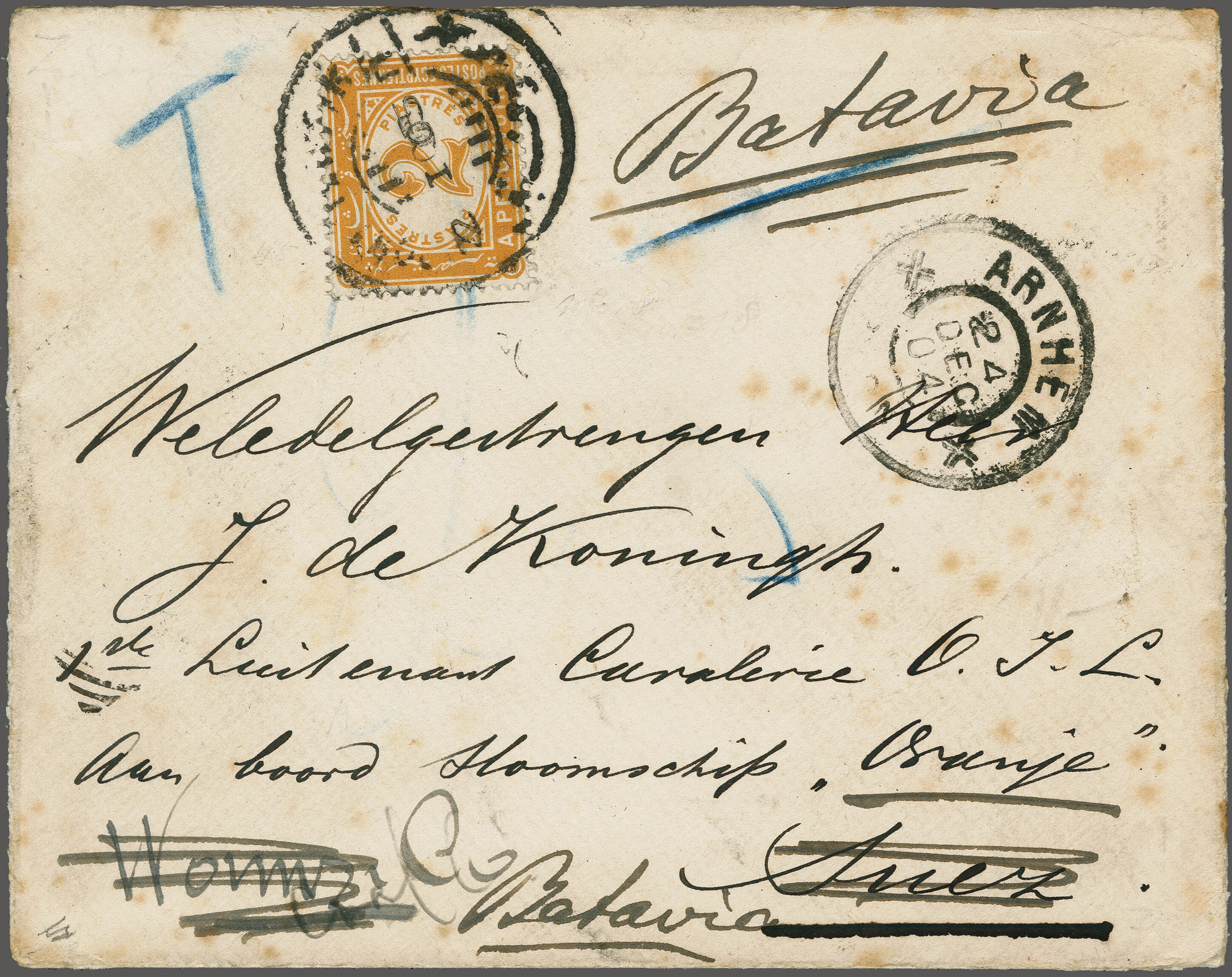 1904: Cover sent unpaid from Arnhem, Netherlands (Dec 24) to a passenger on Steamship 'Oranje' at Suez. Taxed on arrival at Port Tewfik with 1889 2 pi. orange (Jan 2, 1905), and forwarded on again to Batavia. Reverse with