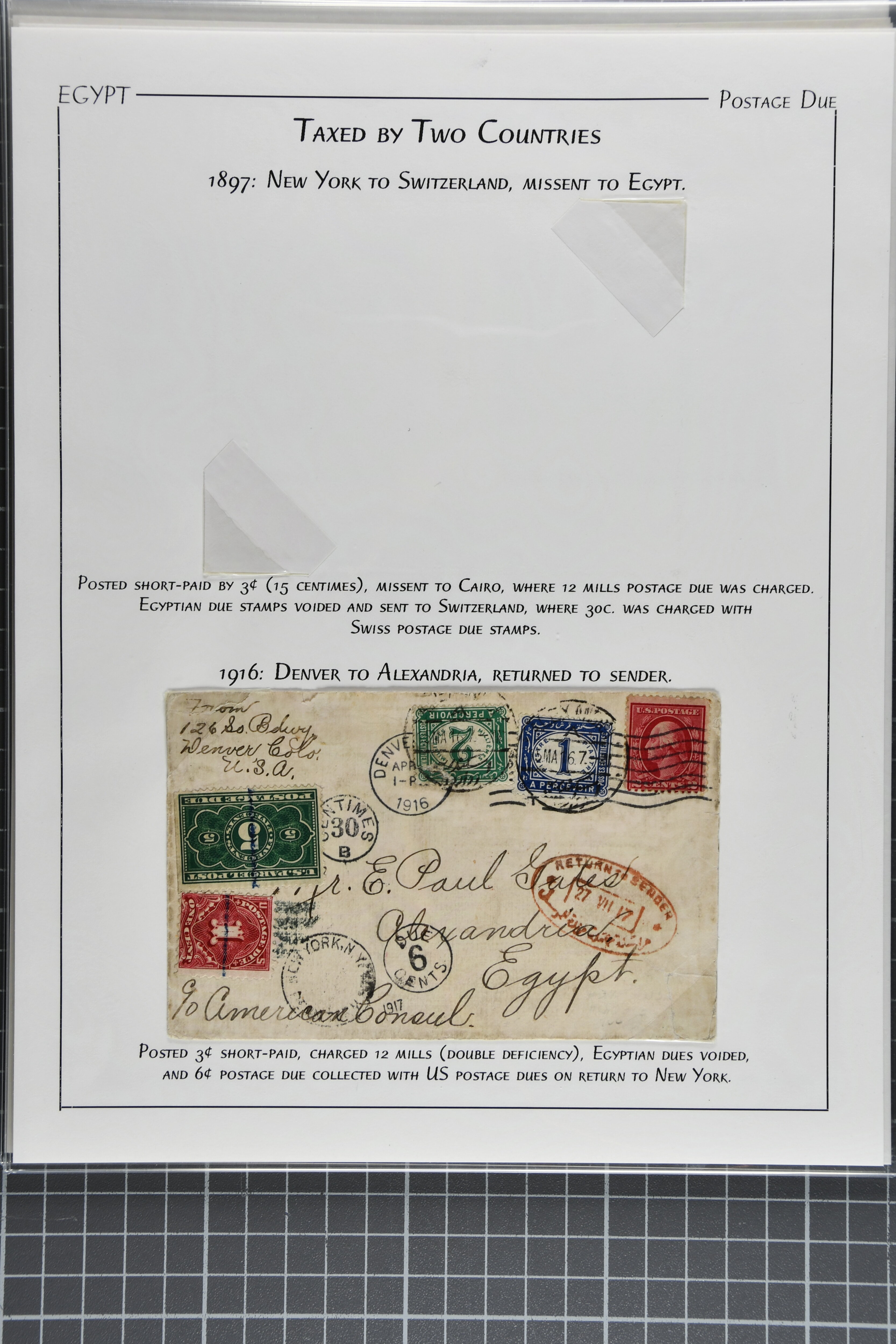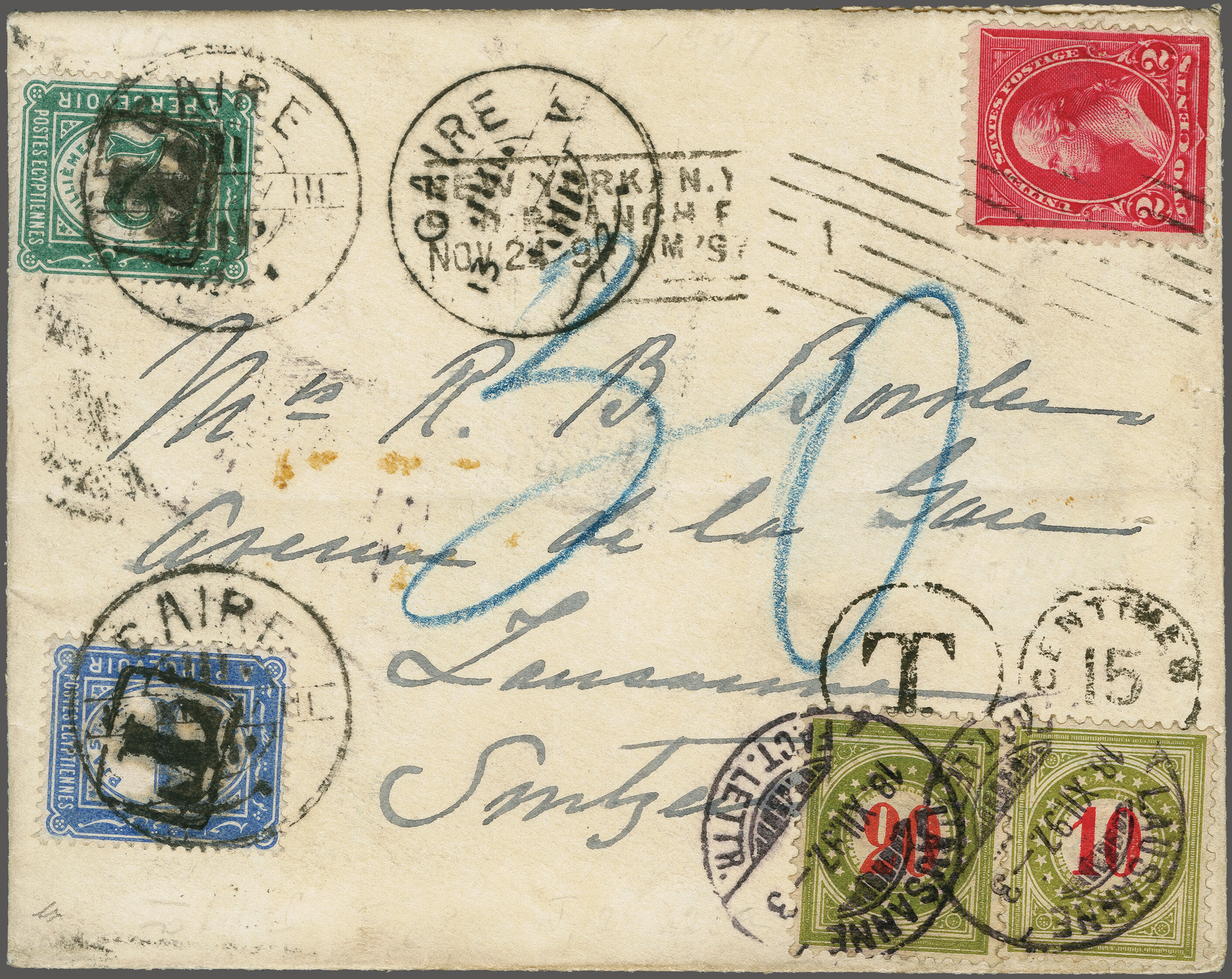 1897: Cover from New York (Nov 24) franked with 2 c. red (short paid 3 c.) to Switzerland, apparently missent to Egypt and there taxed with 1889 2 m. green and 1 pi. ultramarine tied by Cairo datestamps (Dec 13), annulled by