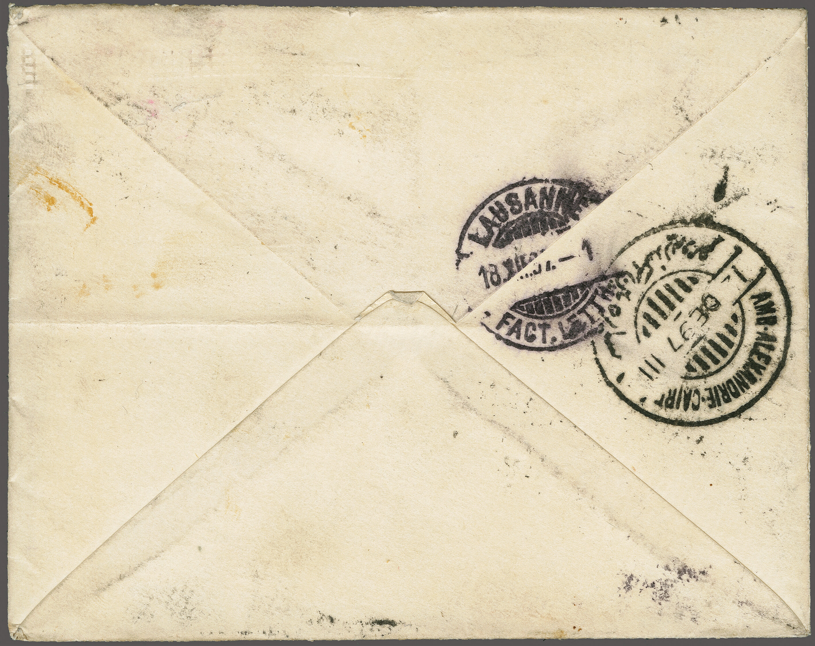 'T' markings and forwarded on to Lausanne, Switzerland where again taxed with Swiss Postage Due 10 c. and 20 c. on arrival (Dec 18). Reverse with 'Amb. Alexandrie-Caire' T.P.O. cds and Lausanne arrival. (Image 1)