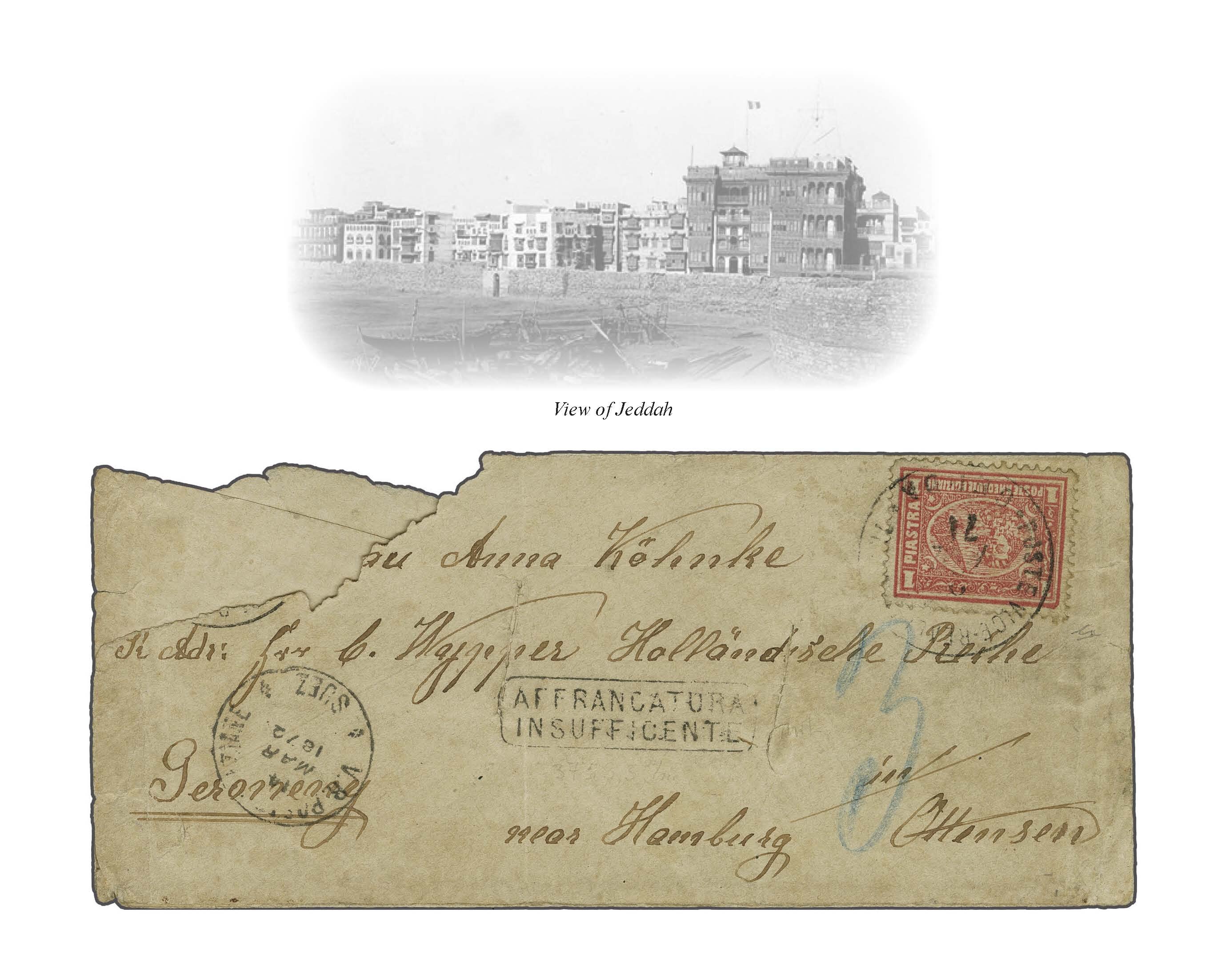 INSUFFICIENTE" marking is believed unique struck in Jeddah and certainly the sole example of a Jeddah cover adressed to Germany. (Image 1)