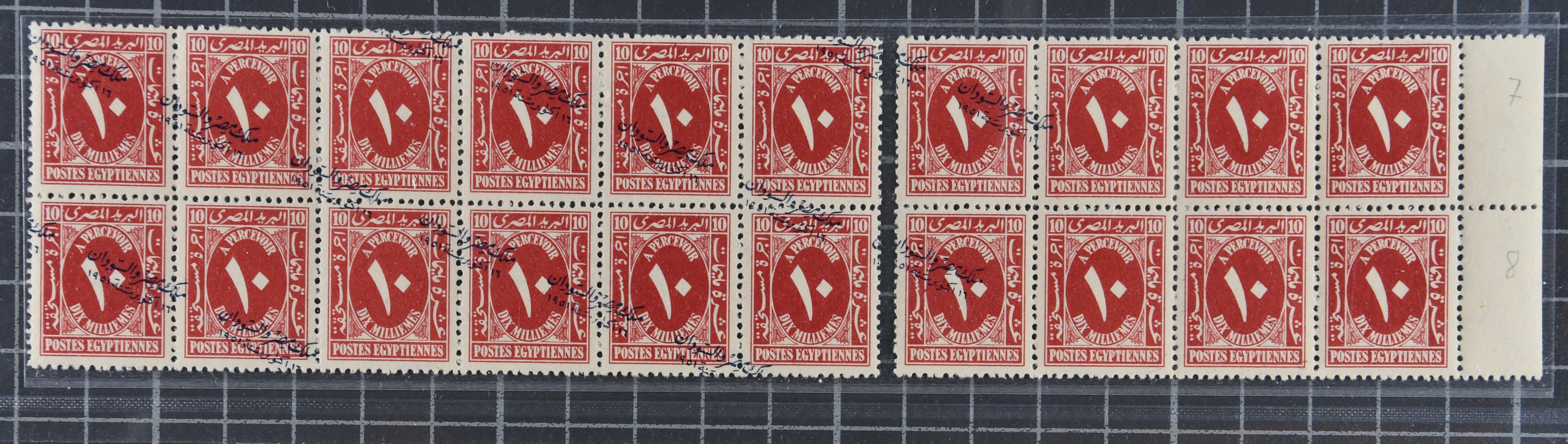 1952 (Jan 17): Postage Due 10 m. rose-lake, overprinted 'Egypt & Sudan', the two unused blocks of twelve and of eight, marginal from right of sheet showing variety "Surcharge à cheval" leaving the five stamps