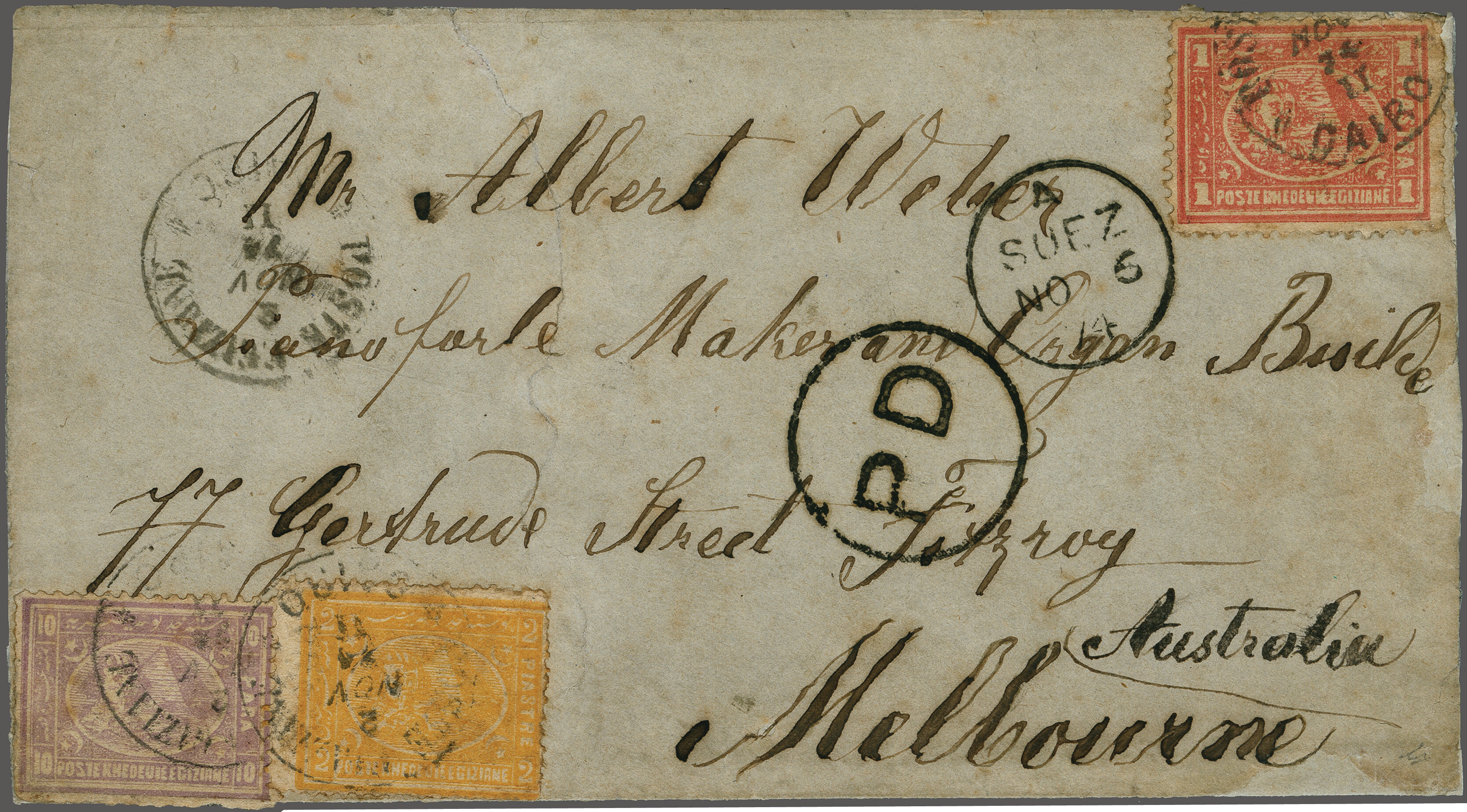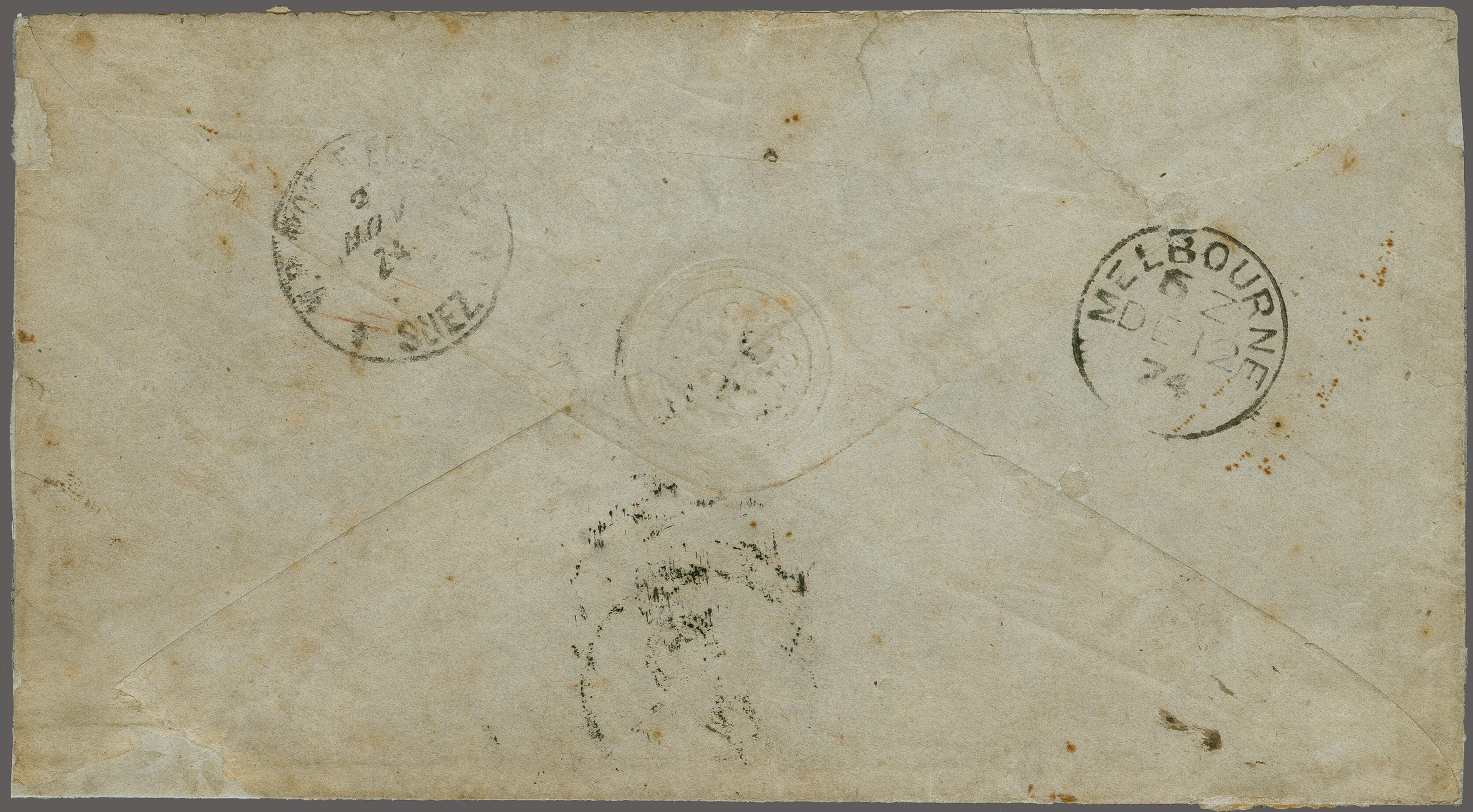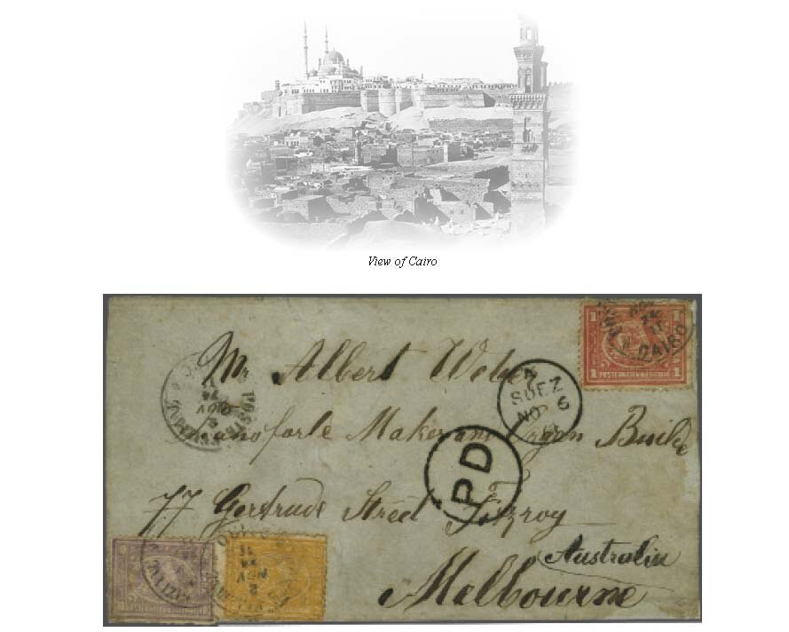 3250 cover imageIncoming Mail Overland via Brindisi & Suez 1874 (Nov 5): Cover from Cairo, Egypt to Melbourne, Victoria bearing 1872 Egypt 10 pa. mauve, 1 pi. red and 2 pi. yellow, each cancelled by the Cairo datestamps (Nov 2) and prepaying 3 pi. 10 pa. for a 1⁄2 ounce ship letter to Victoria. Bold circular ‘P.D.” handstamp in black and with Suez British PO transit and Melbourne arrival datestamps. Cover faults, including a closed tear, however, an extremely rare destination for mail from from Egypt. Signed Todd AIEP. Route - P&O Line: Departed Alexandria 5 Nov 1874 per “Peshawur” via Suez (6 Nov) to Galle (20 Nov); “Ceylon” (21 Nov) via King Georges Sound (5 Dec) and Adelaide (11 Dec) to Melbourne, arriving 12 Dec 1874 (41 days). Note: The earliest recorded cover from Egypt to the Australian Colonies franked with Egyptian postage stamps. (Image 1) (Image 2) (Image 3)