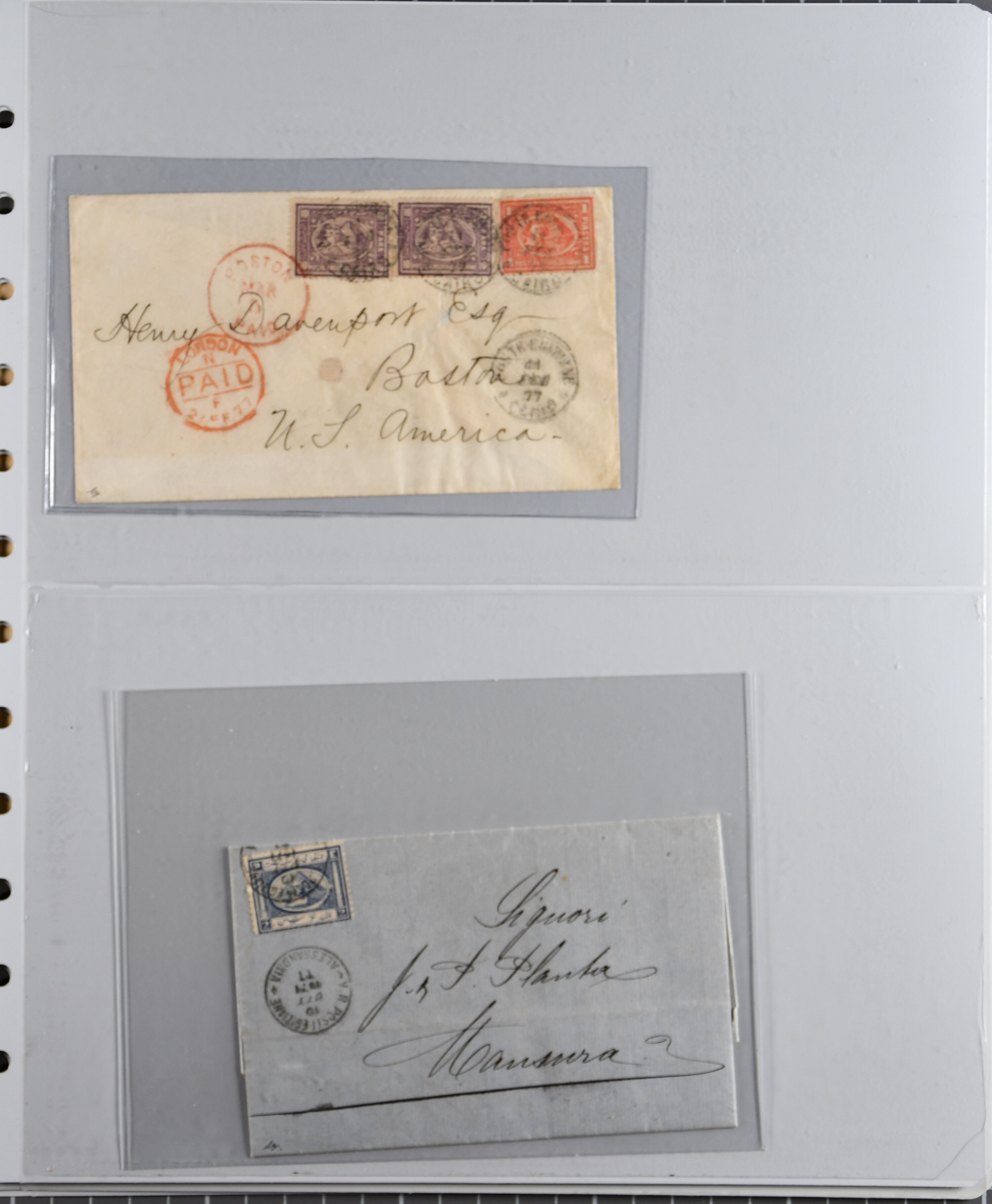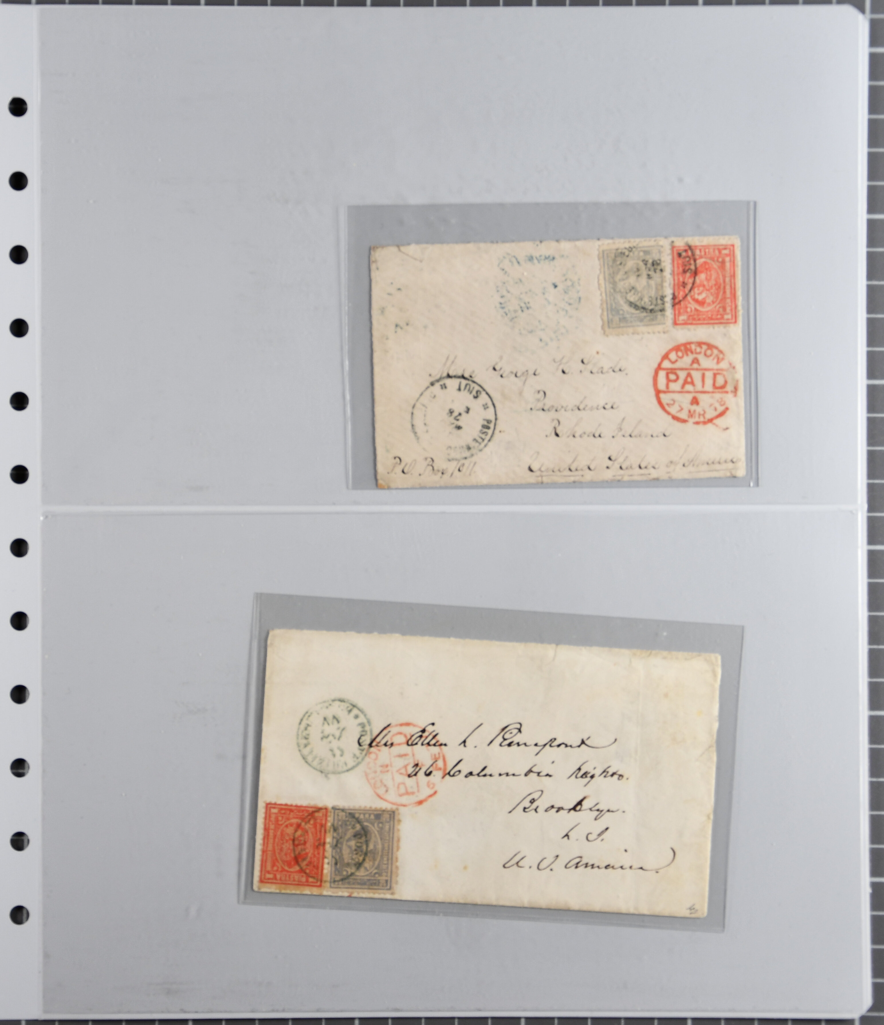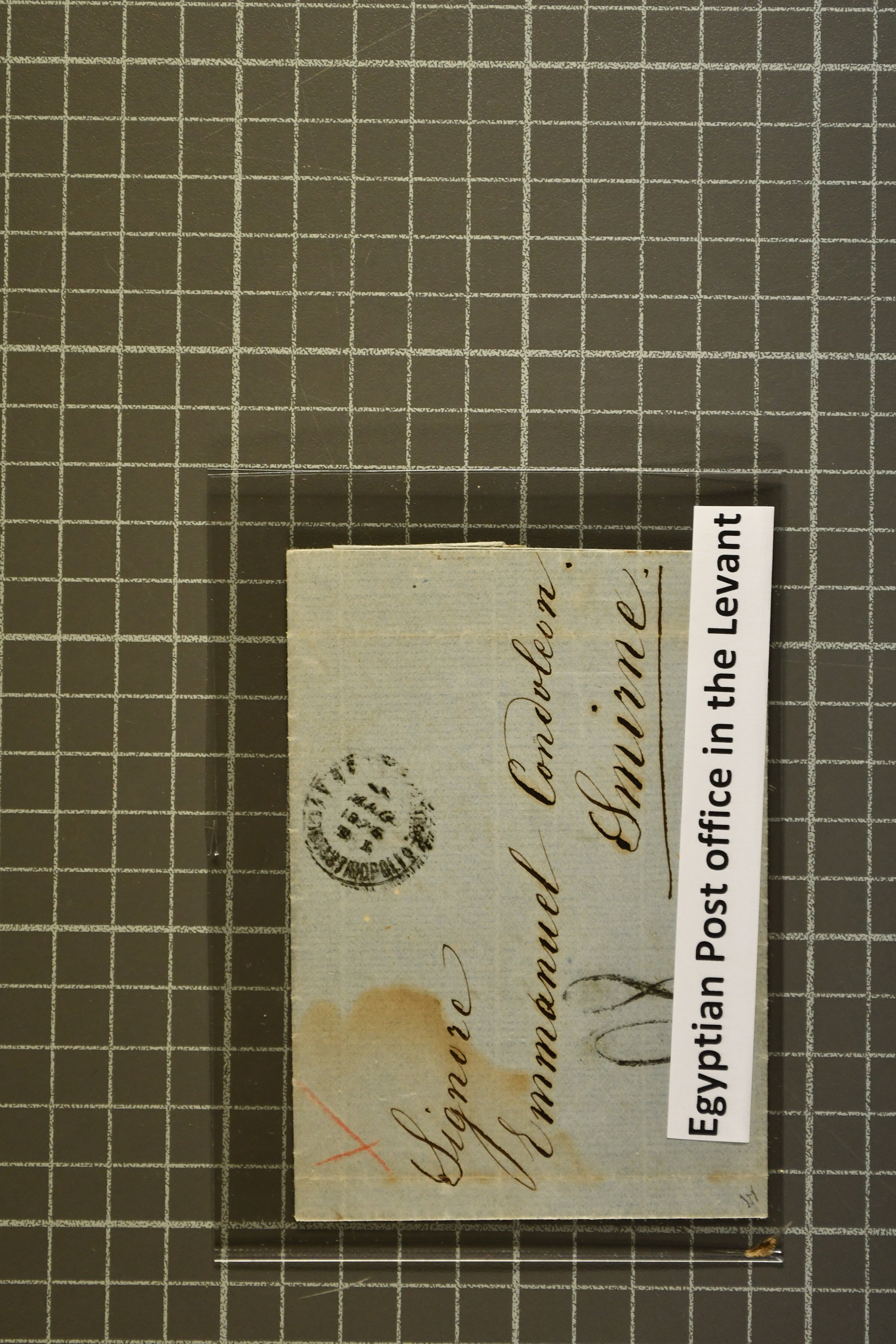 3250 cover imageIncoming Mail Overland via Brindisi & Suez 1874 (Nov 5): Cover from Cairo, Egypt to Melbourne, Victoria bearing 1872 Egypt 10 pa. mauve, 1 pi. red and 2 pi. yellow, each cancelled by the Cairo datestamps (Nov 2) and prepaying 3 pi. 10 pa. for a 1⁄2 ounce ship letter to Victoria. Bold circular ‘P.D.” handstamp in black and with Suez British PO transit and Melbourne arrival datestamps. Cover faults, including a closed tear, however, an extremely rare destination for mail from from Egypt. Signed Todd AIEP. Route - P&O Line: Departed Alexandria 5 Nov 1874 per “Peshawur” via Suez (6 Nov) to Galle (20 Nov); “Ceylon” (21 Nov) via King Georges Sound (5 Dec) and Adelaide (11 Dec) to Melbourne, arriving 12 Dec 1874 (41 days). Note: The earliest recorded cover from Egypt to the Australian Colonies franked with Egyptian postage stamps. (Image 1) (Image 2) (Image 3)