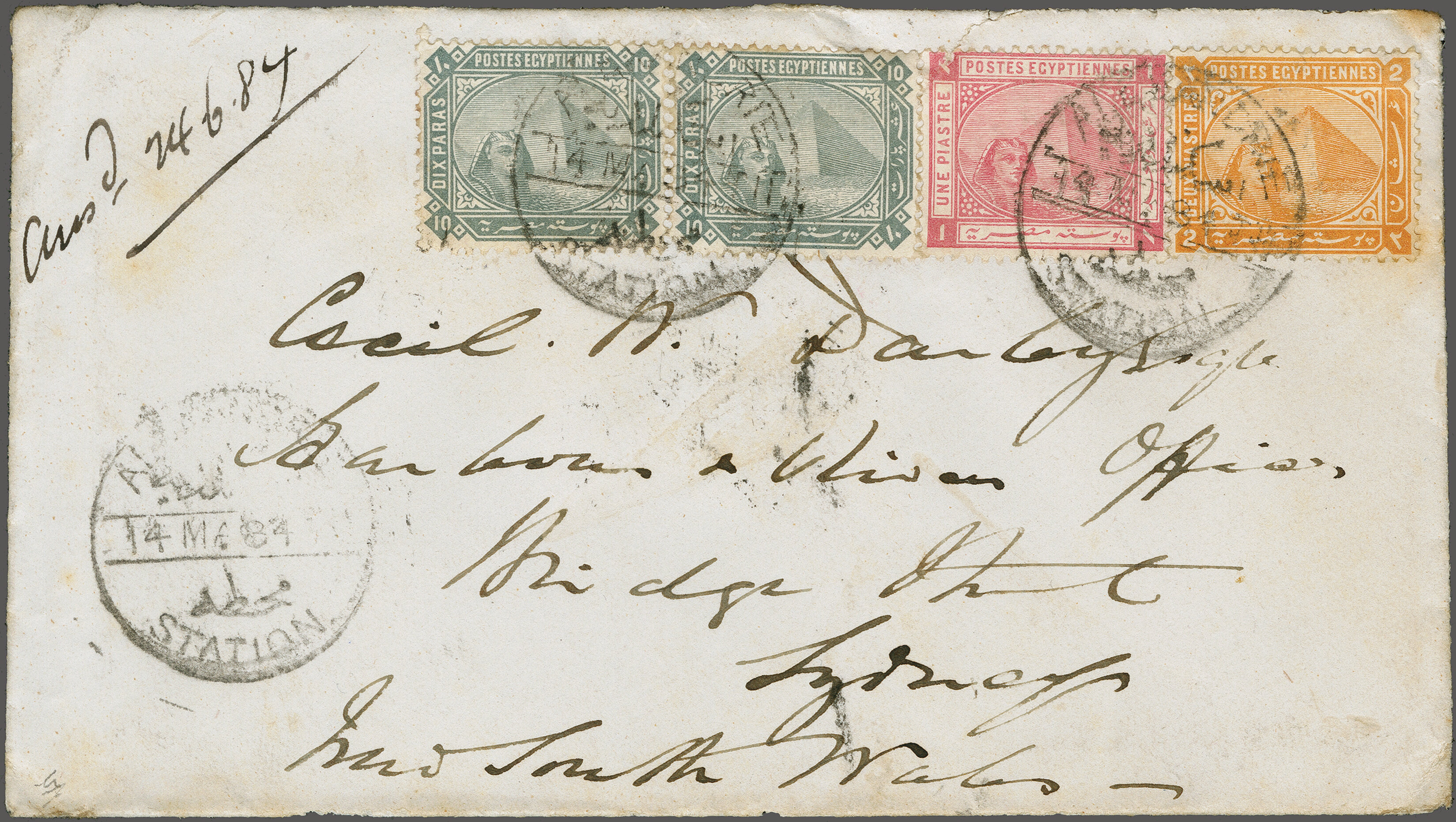 3263 cover imageIncoming Mail Overland via Brindisi & Suez 1884 (May 22): Cover from Alexandria, Egypt to Sydney, New South Wales bearing 1881 Egypt 10 pa. bluish grey, two examples and 1879 1 pi. rose, damaged on opening and 2 pi. orange, all cancelled by "Alexandrie / Station" datestamps and prepaying 3 pi. 20 pa. for a 1⁄2 ounce ship letter to New South Wales with Sydney arrival on reverse. A fine and attractive three colour franking to a rare destination from Egypt. Route - P&O Line: Departed Alexandria 22 May 1884 per “Deacon” via Aden (27 May) to Colombo (4 June); “Assam” (4 June) via King Georges Sound (16 June) and Adelaide (20 June) to Melbourne (22 June); by rail to Sydney, arriving 26 June 1884 (43 days). Note: Whilst 1884 may appear to be a late cover from Egypt to Australia, this cover is still one of the earlier covers recorded to the Colonies, and believed to be the third earliest. By way of comparison, only one pre-UPU cover is recorded from Australia to Egypt. (Image 1) (Image 2)