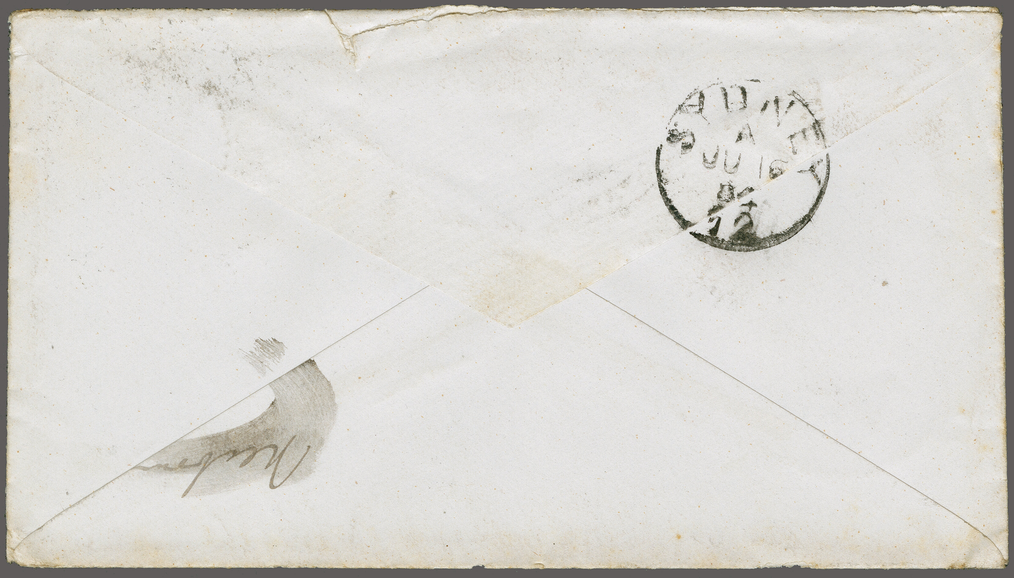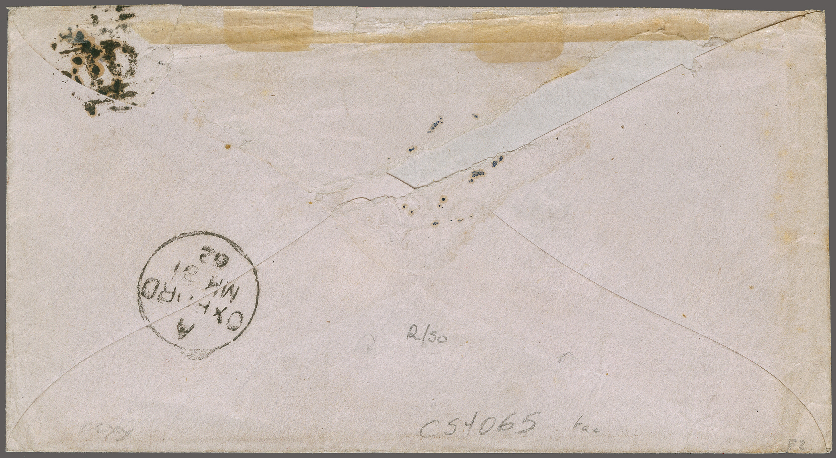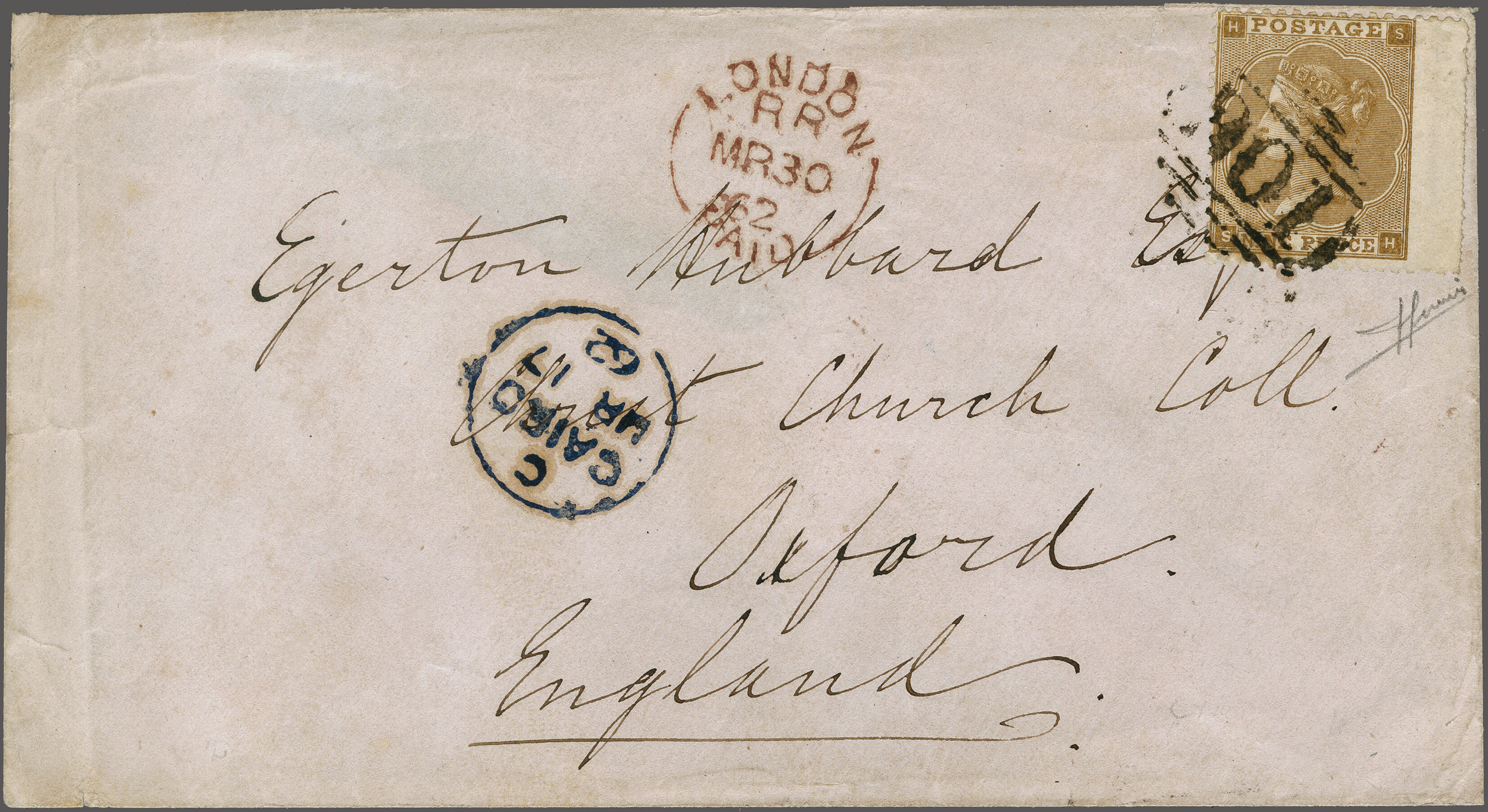 6080 cover imageBritish Post Offices in Egypt 1862 (March 17): Envelope from Cairo to Oxford correctly franked with Great Britain 1862 9 d. bistre with wing margin at right, tied by 'B01' obliterator used in Cairo with very fine thimble CAIRO despatch and London transit (March 30) cds alongside. OXFORD arrival (March 31) backstamp. The adhesive with odd short perf, exceptional colour and minor opening blemishes on reverse. Fine and rare usage, the 9 d. issued just two month prior. Signed Sorani. Provenance: Collection E. Grant Glassco, RL, London, Nov 1969, lot 1303. (Image 1) (Image 2)