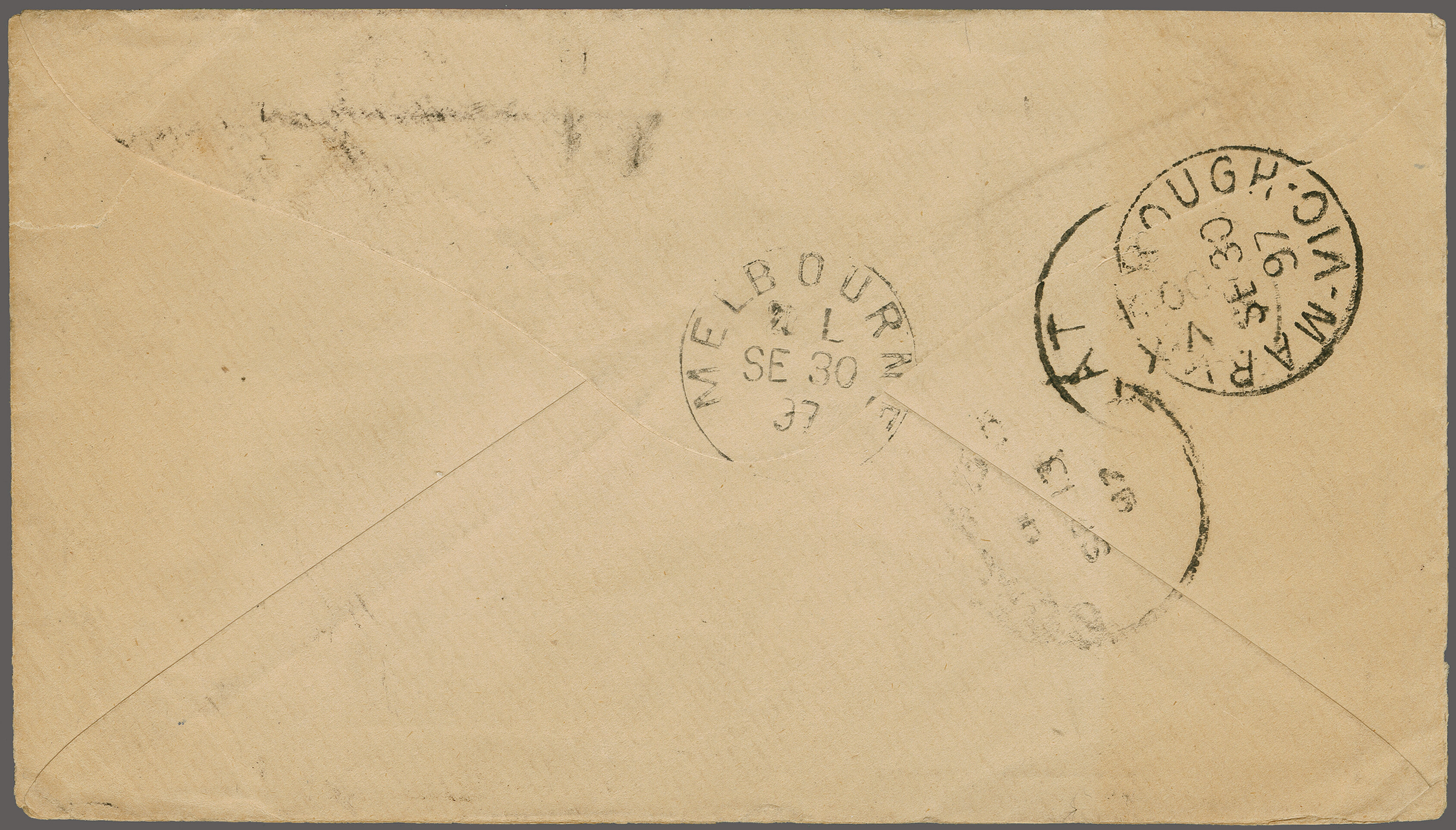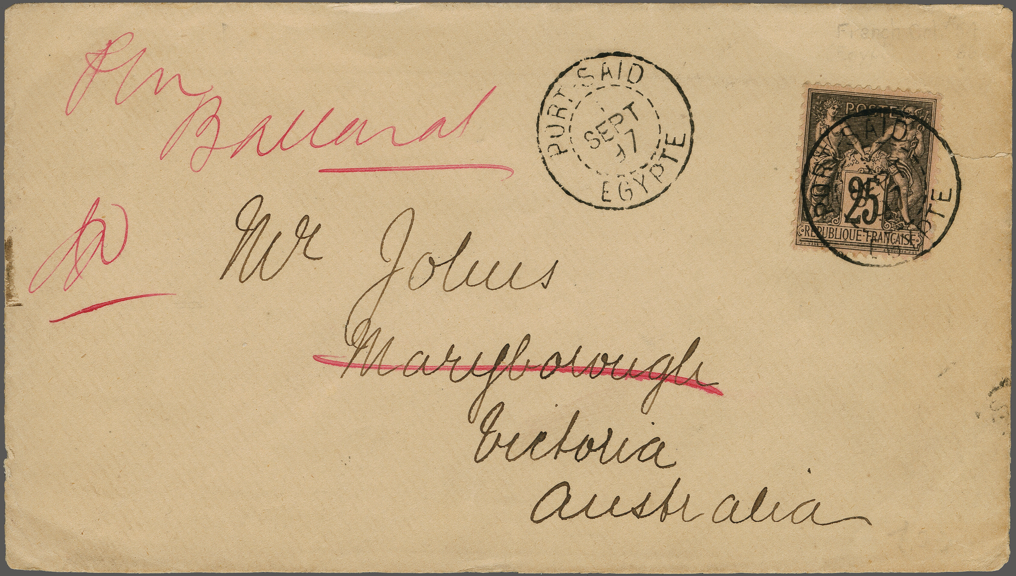 3304 cover imageIncoming Mail Overland via Naples 1897 (Sept 3): Cover from Port Said, French Post Offices in Egypt to Maryborough, Victoria bearing 1879 France Type Sage 25 c. black on rose cancelled by Port Said datestamp and prepaying 25 c. for a 1⁄2 ounce ship letter to Victoria and with multiple transit datestamps on the reverse. Small closed cover tear at right, a fine and charming cover. The only cover recorded from the French Post Offices in Egypt to the Australian Colonies. Route - Orient Line: Departed Port Said 3 Sept 1897 per “Cuzco” via Suez Canal, Albany (25 Sept) to Adelaide (29 Sept); by rail via Melbourne (30 Sept) to Maryborough, arriving 30 Sept 1897 (63 days). (Image 1) (Image 2)