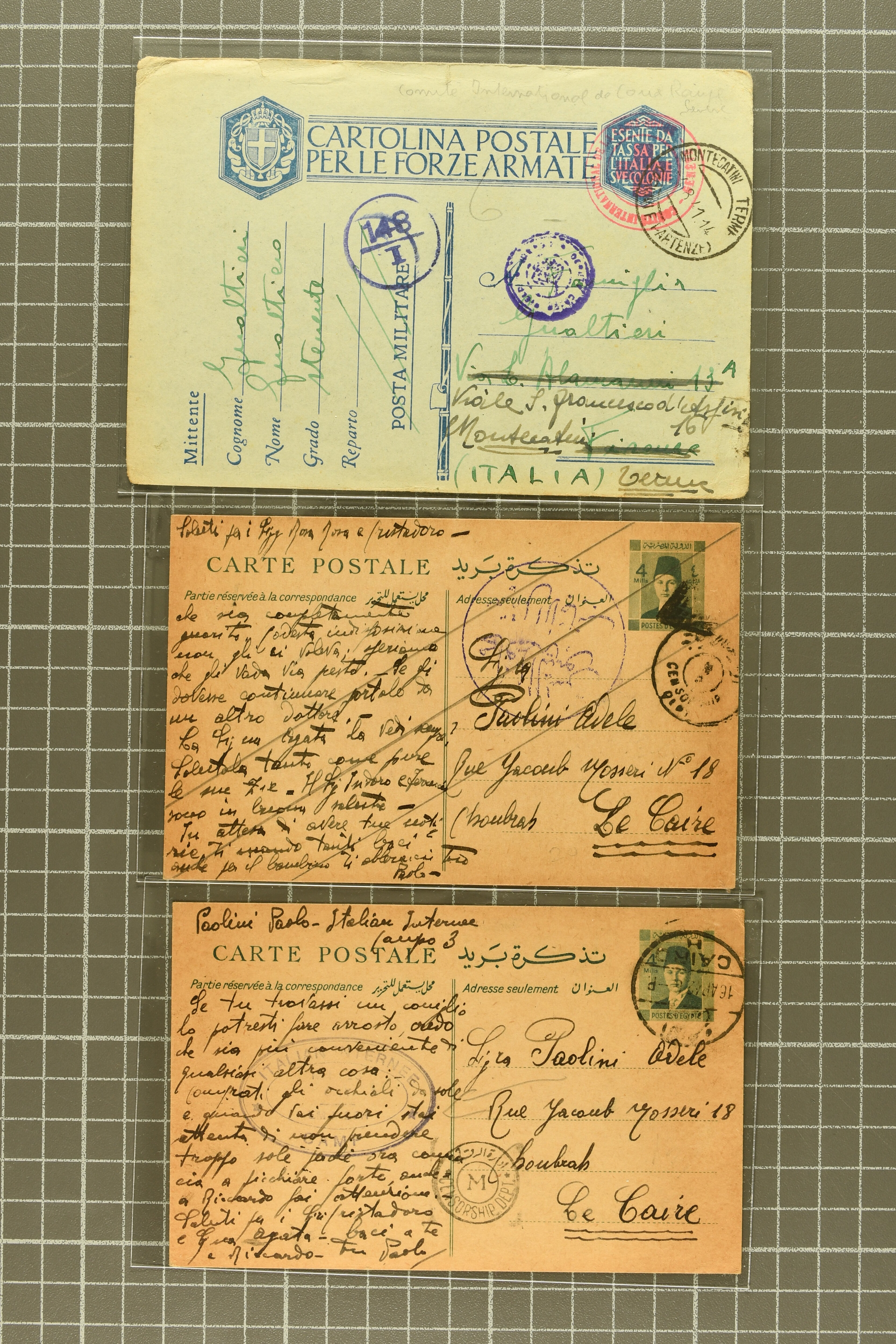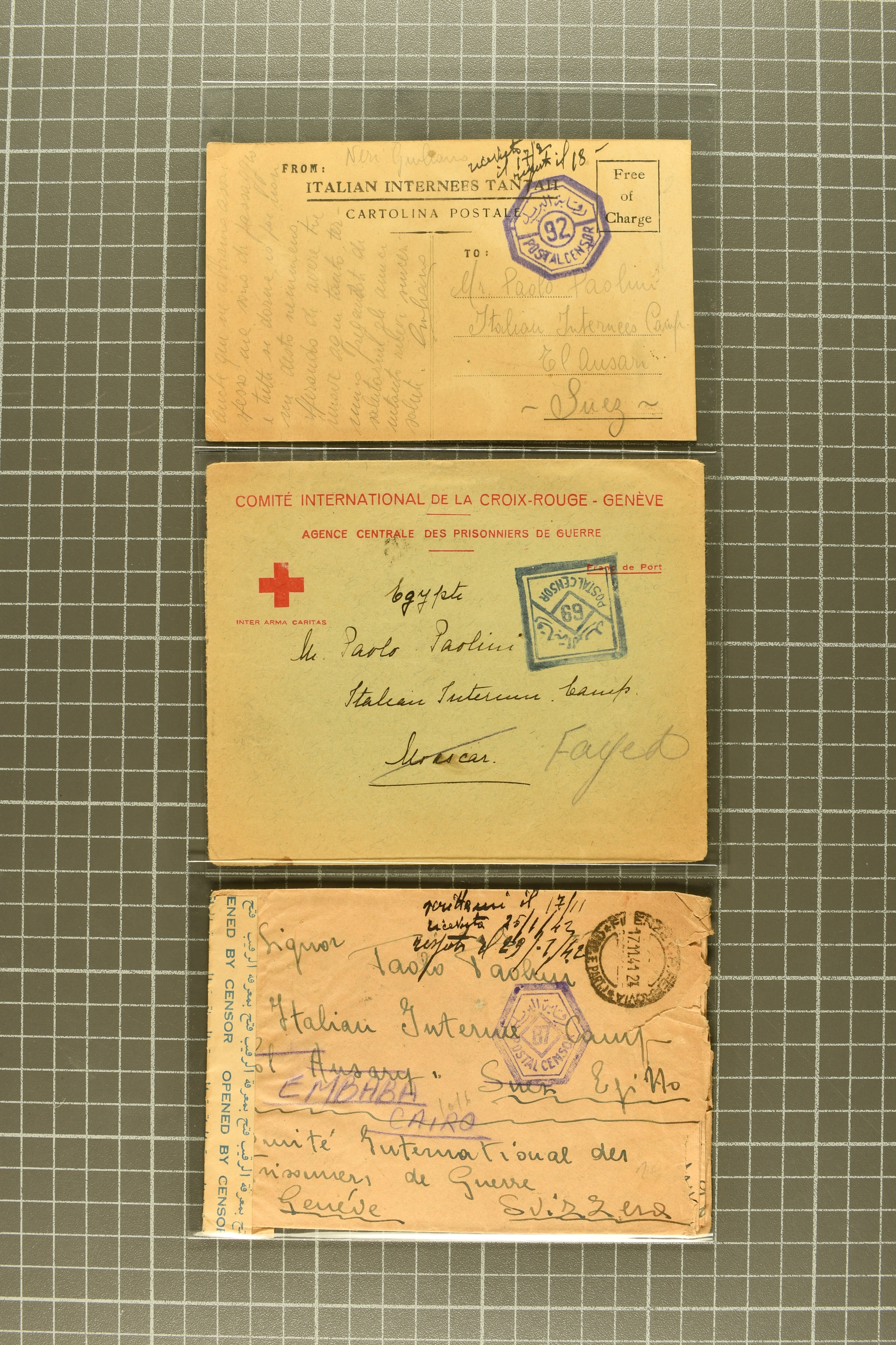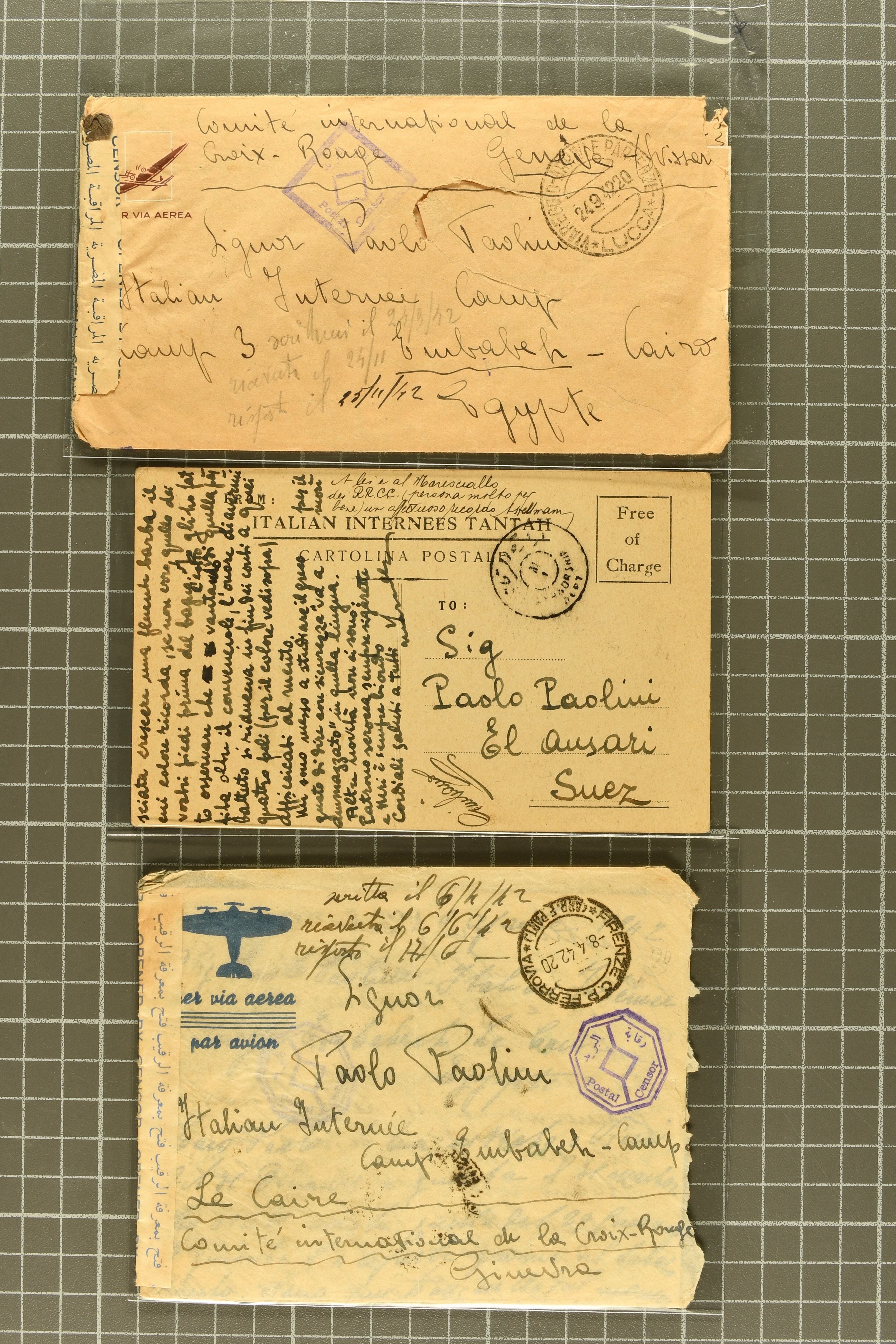 1108 cover image1940/1943: group of 25 covers related to the Italian war prisoners, noted a correspondence on postcards from Suez with handstamps "ITALIAN INTERNEE CAMP" (both oval and two-line types), postcard with violet framed "ITALIAN INTERNEE CAMP TANTAH", some Red Cross mail and bilingual censors, etc., some occasional faults as to be expected, overall in good condition. An interesting lot. (Image 1) (Image 2) (Image 3) (Image 4) (Image 5) (Image 6) (Image 7) (Image 8)