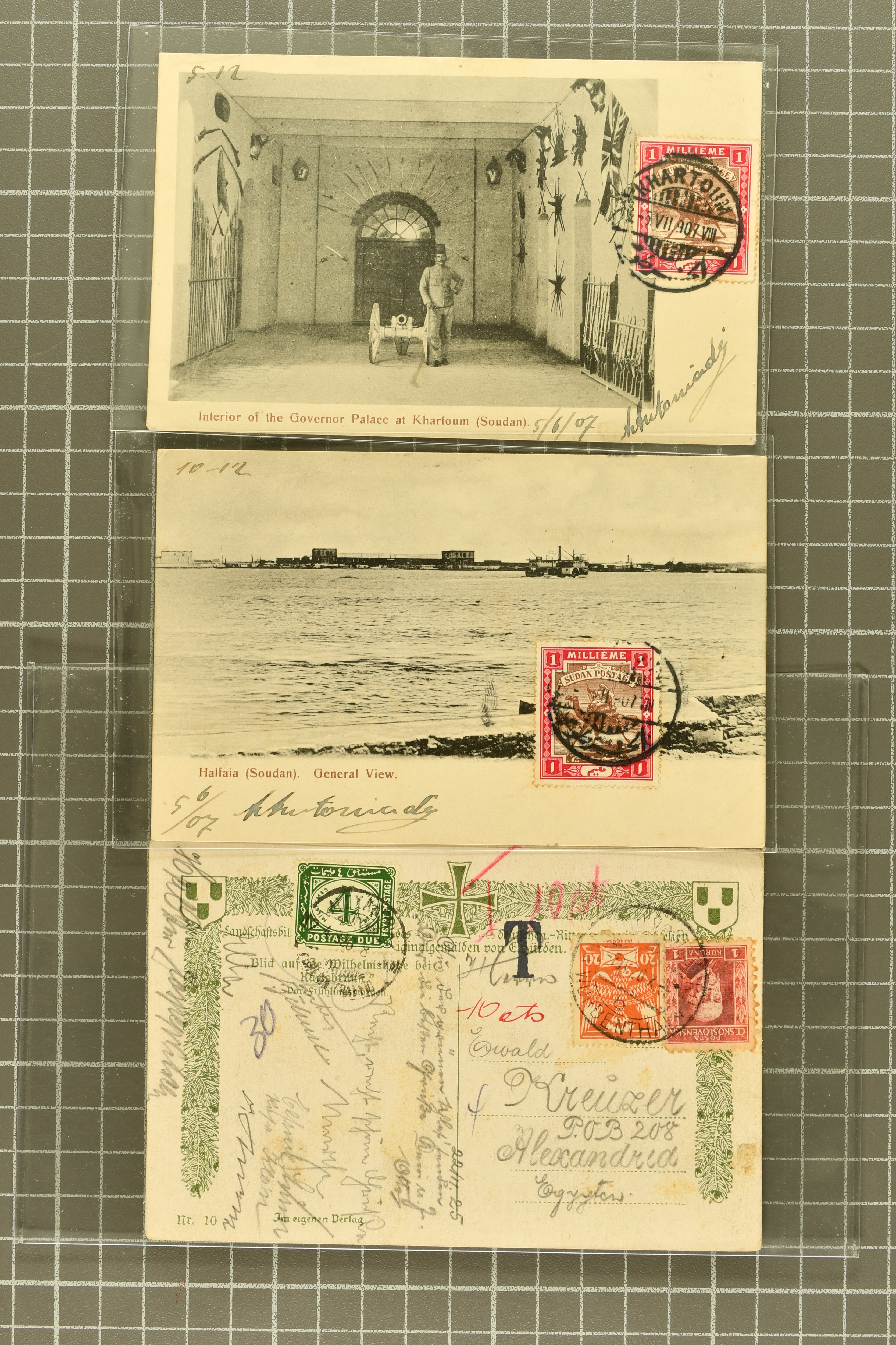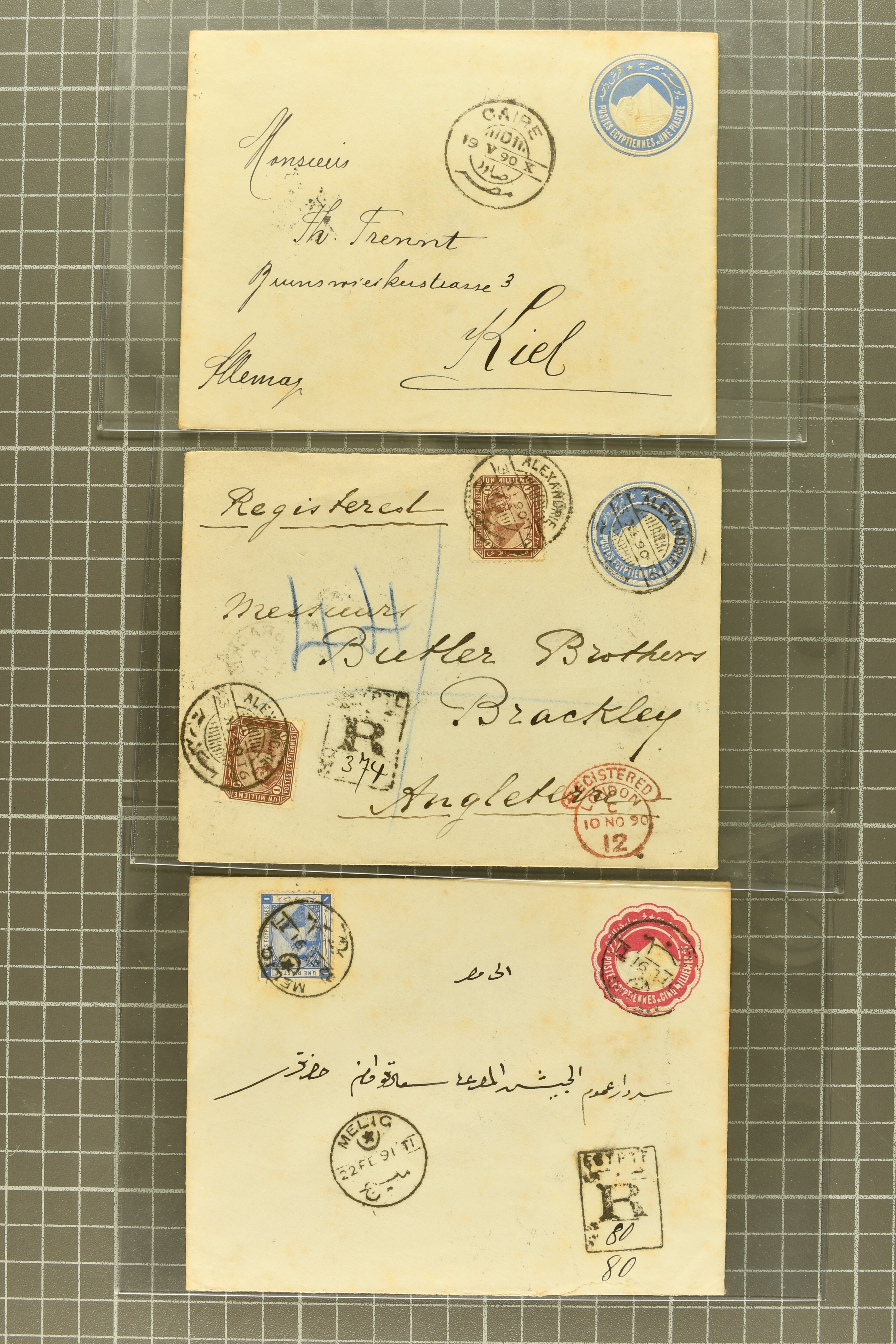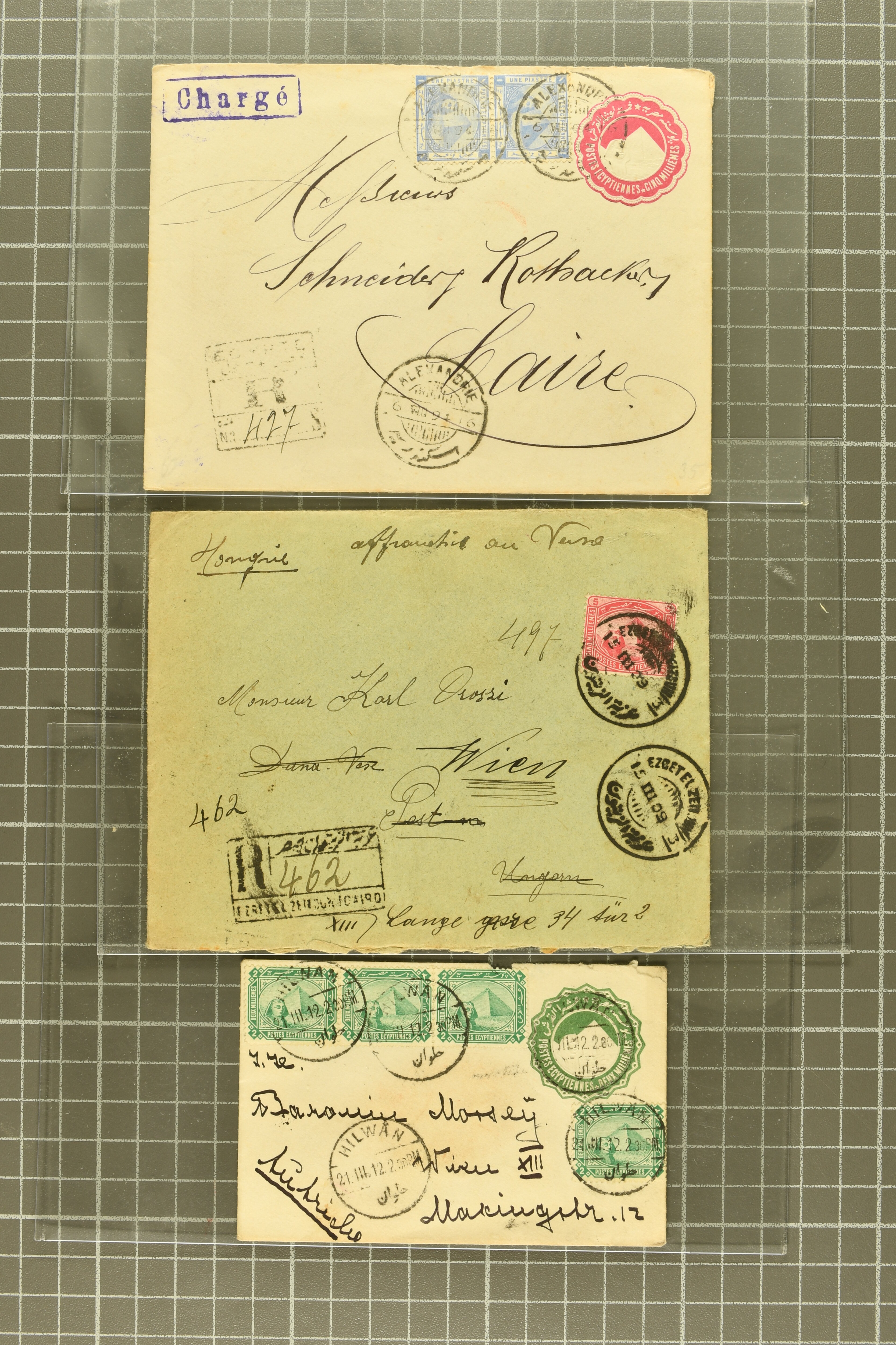 1106 cover image1890/1936c.: Group of covers/cards (19) with 1891 5 m. carmine stationery envelope up-rated with 1 pi. bluer tied by bold MELIG star & crescent cds, 1903 5 m. carmine letter-card used with 5 m. carmine tied "Ghezireh / Cairo" cds's; 1909 registered cover to Hungary franked 5 m. carmrine and fifteen 1 m. brown all tied "Ezebet el Zeitoun" cds's and readdressed to Vienna, 1925 card from Czechoslovakia to Alexandria, underpaid and taxed with 4 m. green Postage Due, and six postcards from Sudan with adhesives on viewside etc. (Image 1) (Image 2) (Image 3) (Image 4) (Image 5)