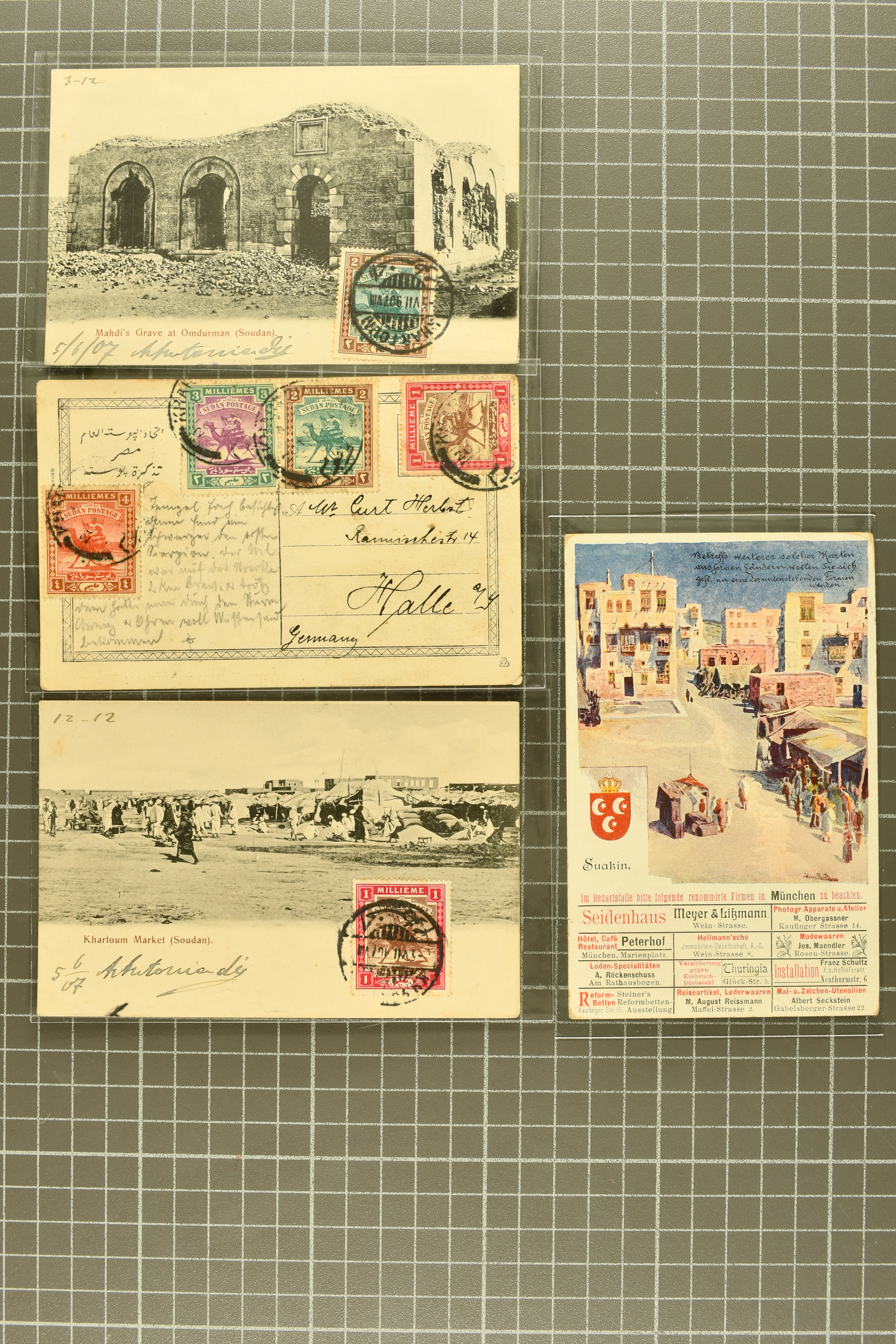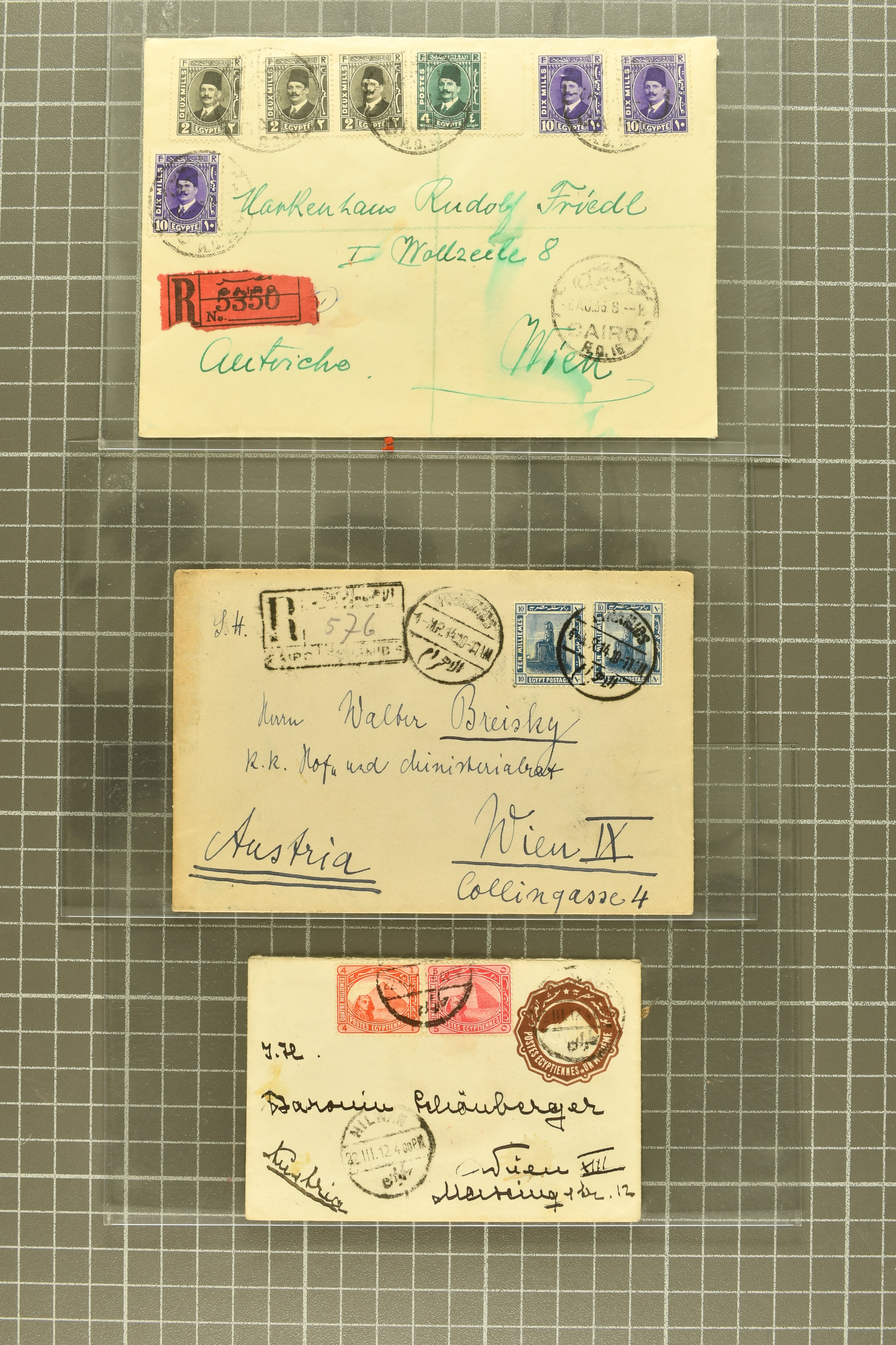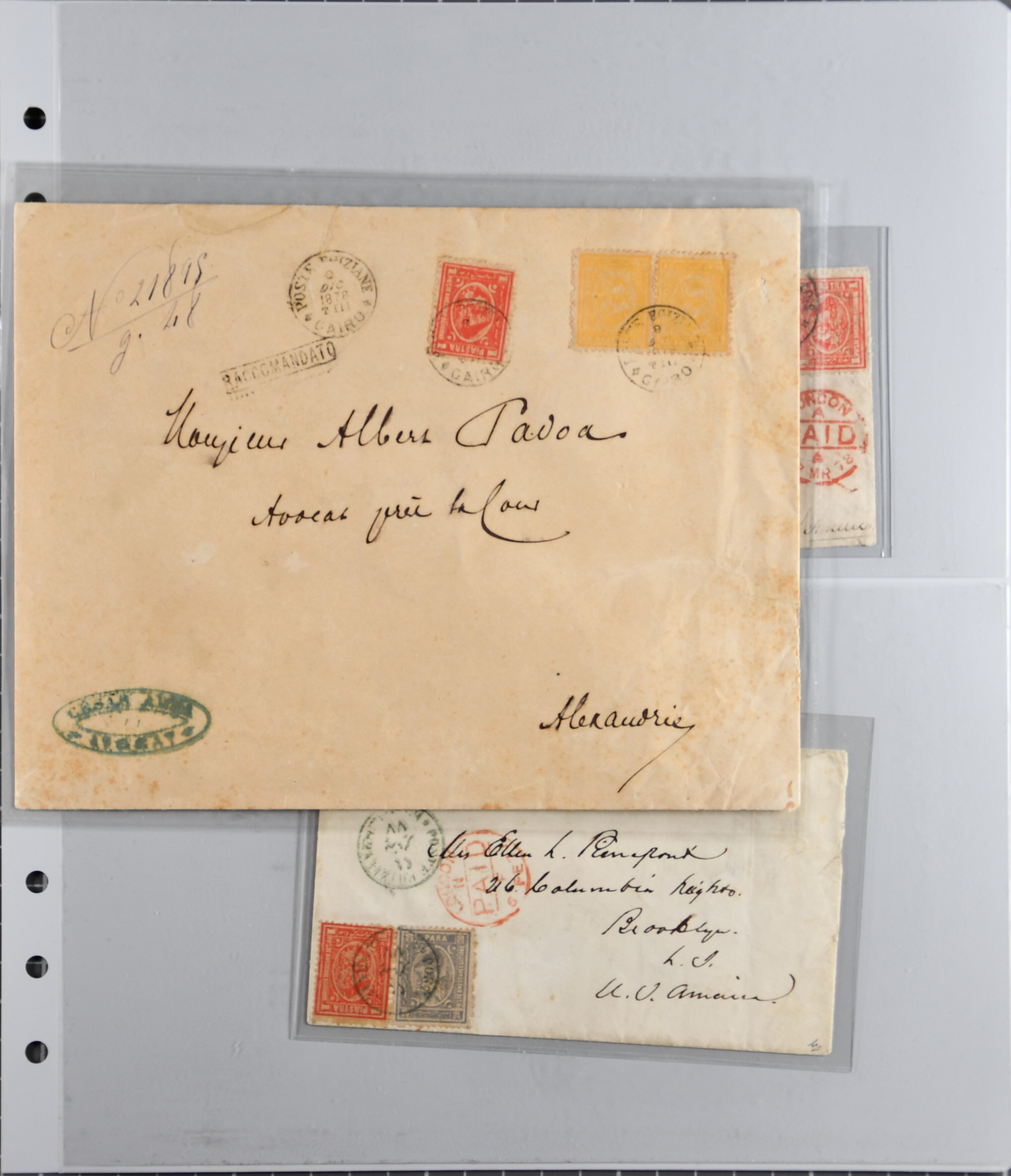 1106 cover image1890/1936c.: Group of covers/cards (19) with 1891 5 m. carmine stationery envelope up-rated with 1 pi. bluer tied by bold MELIG star & crescent cds, 1903 5 m. carmine letter-card used with 5 m. carmine tied "Ghezireh / Cairo" cds's; 1909 registered cover to Hungary franked 5 m. carmrine and fifteen 1 m. brown all tied "Ezebet el Zeitoun" cds's and readdressed to Vienna, 1925 card from Czechoslovakia to Alexandria, underpaid and taxed with 4 m. green Postage Due, and six postcards from Sudan with adhesives on viewside etc. (Image 1) (Image 2) (Image 3) (Image 4) (Image 5)