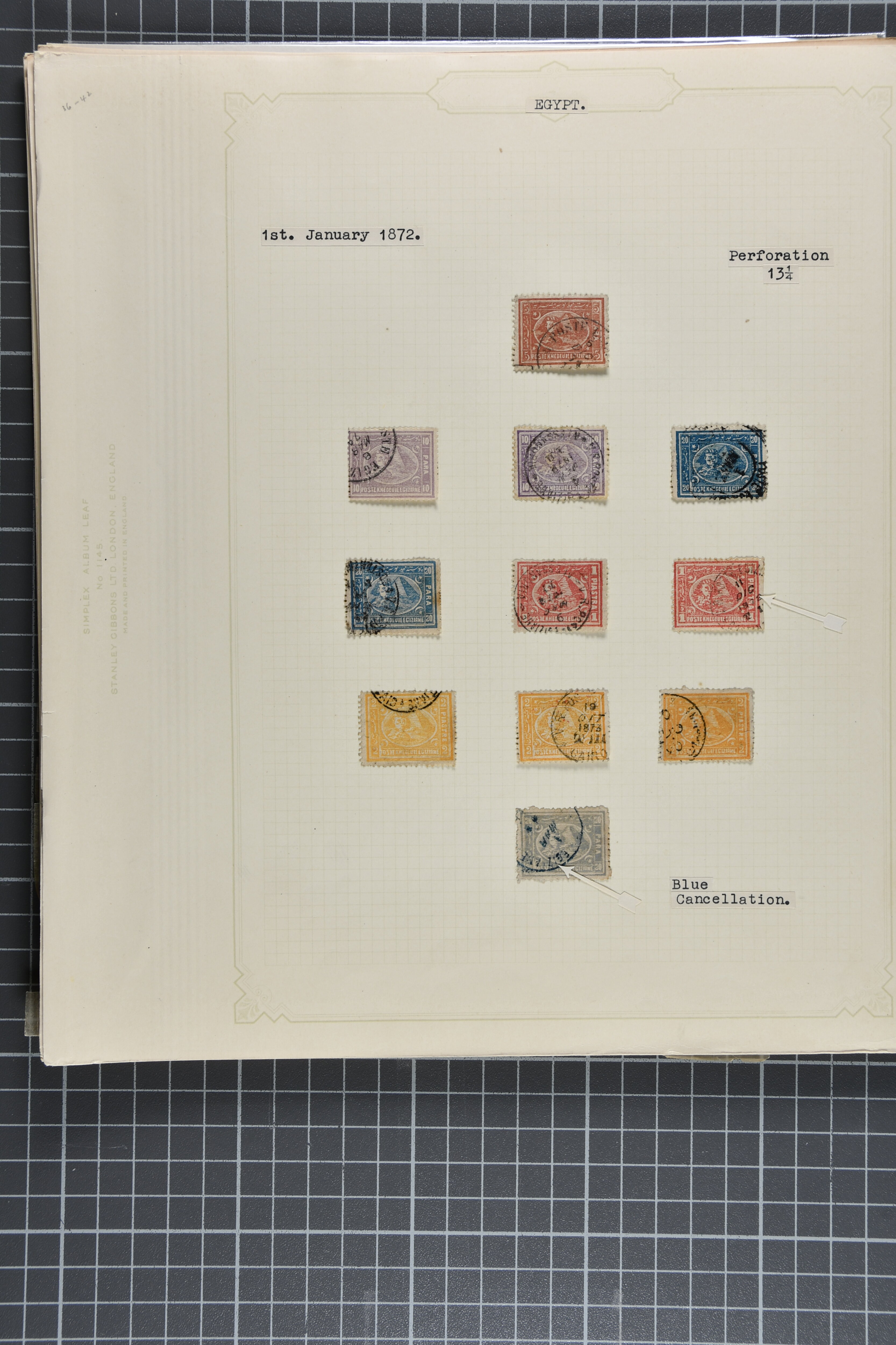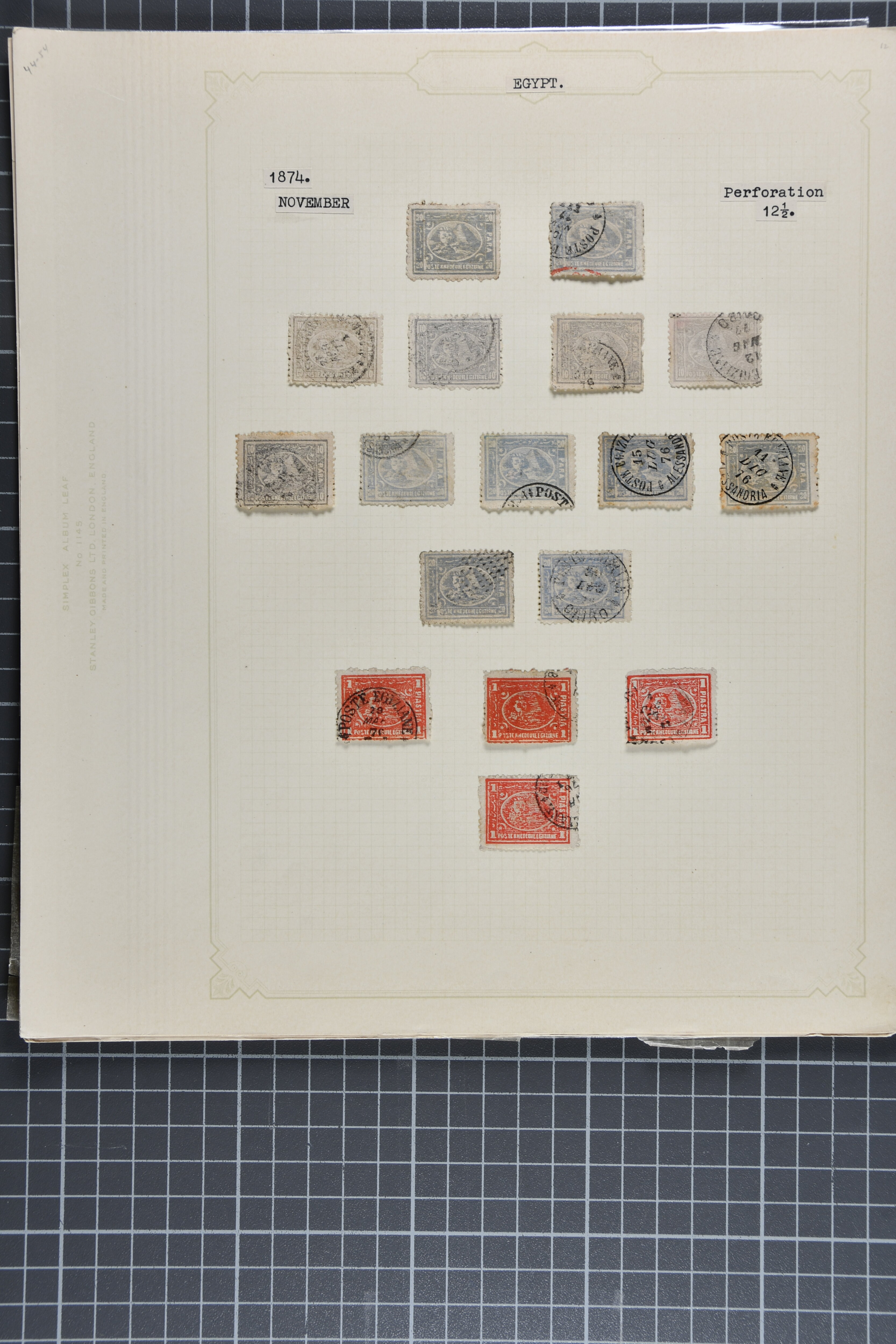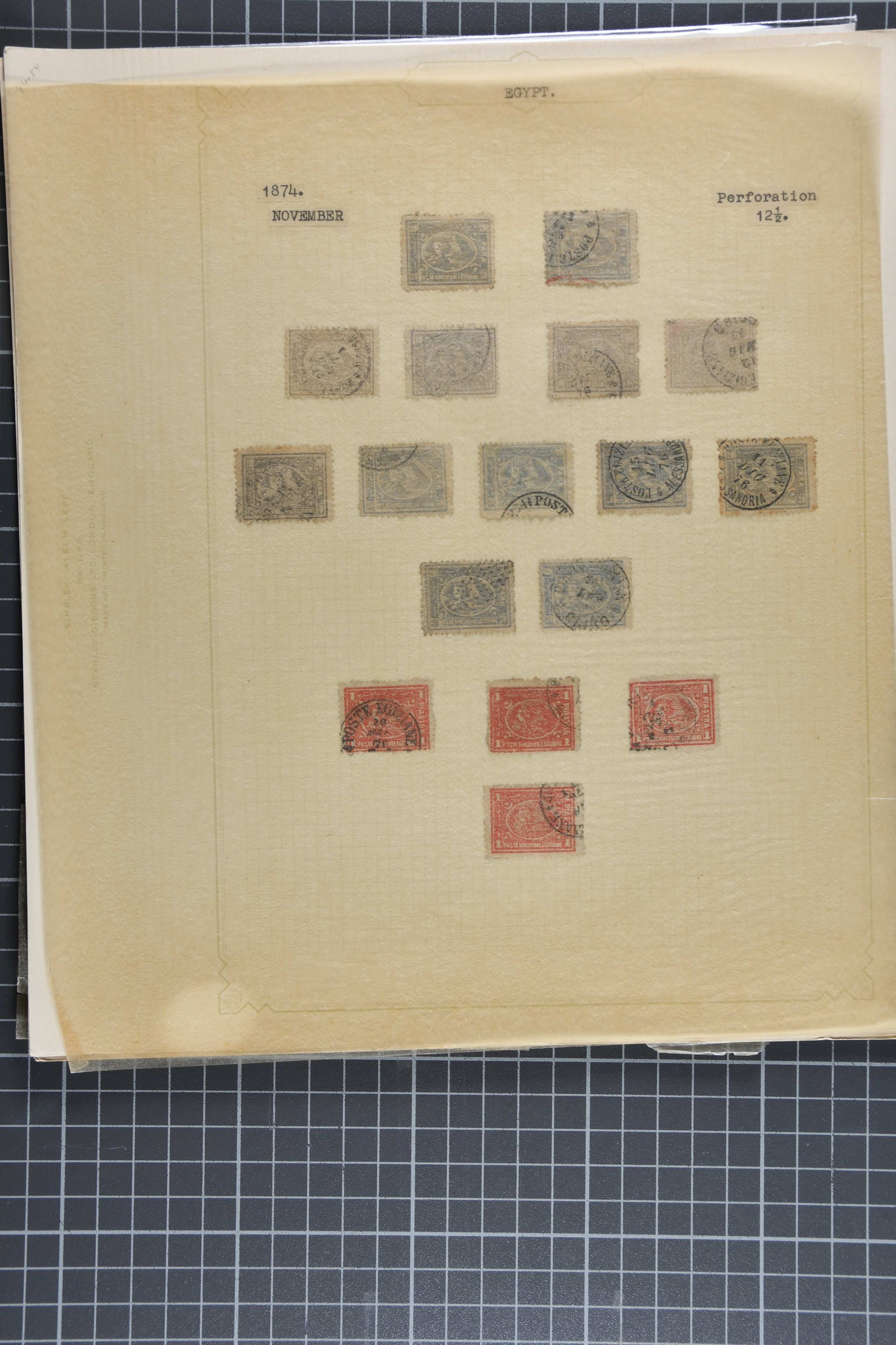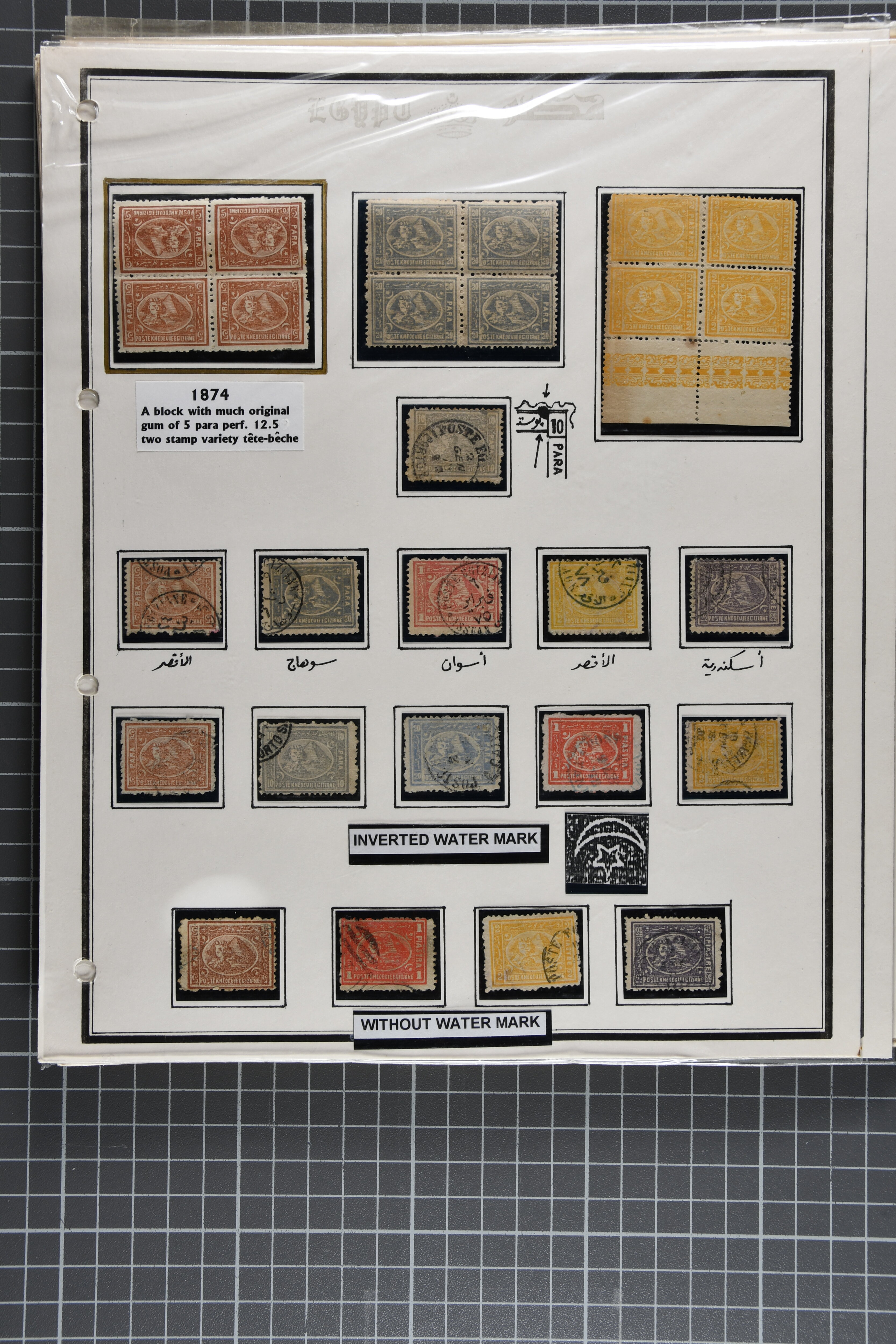 1098 bof image1866/1879: Collection on leaves with set of seven imperf. Pellas Proofs for the first issue, 10 pi. slate background only Proof on wmk'd paper, 1866 First issue 5 pa. unused (2), 10 pa. brown unused and used, 20 pa. blue used (2), 1 pi with very fine usage on cover from Alexandria, 2 pi. used (2), 5 pi. rose unused (cert. BPA), 10 pi. slate unused (cert. RPSL), 1867 range showing the types incl. 1 pi. unused block, 5 pi. brown used, 1872/75 issue used, and unused Bulaq 5 pa. brown block showing two tête-bêche's, 20 pa. grey block, 2 pi. yellow block of four, theerafter large range with cancellation interest etc. (324 items). (Image 1) (Image 2) (Image 3) (Image 4) (Image 5) (Image 6) (Image 7) (Image 8) (Image 9) (Image 10) (Image 11) (Image 12) (Image 13) (Image 14) (Image 15) (Image 16) (Image 17) (Image 18) (Image 19) (Image 20) (Image 21) (Image 22) (Image 23) (Image 24) (Image 25) (Image 26) (Image 27) (Image 28) (Image 29) (Image 30) (Image 31) (Image 32) (Image 33) (Image 34) (Image 35) (Image 36)