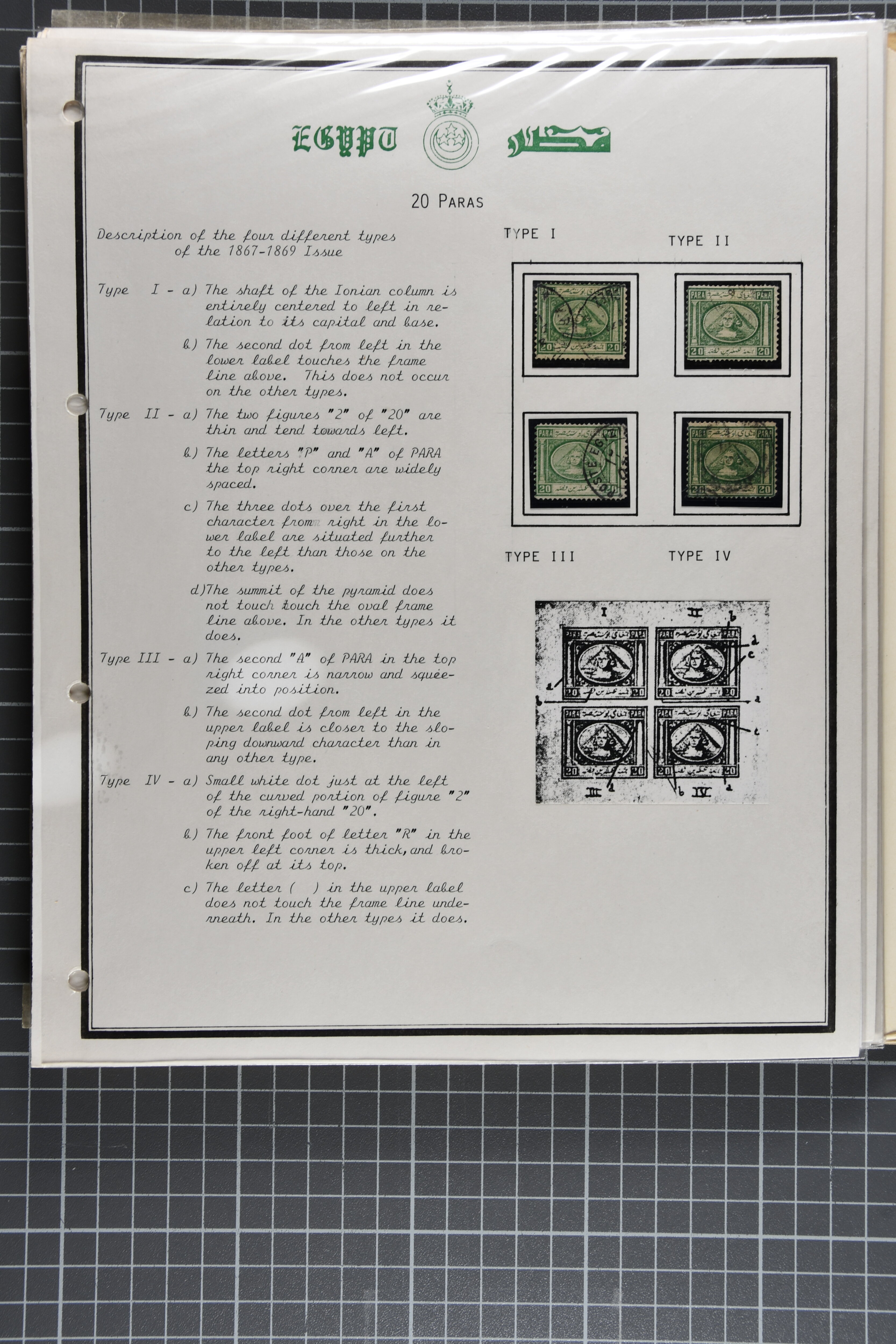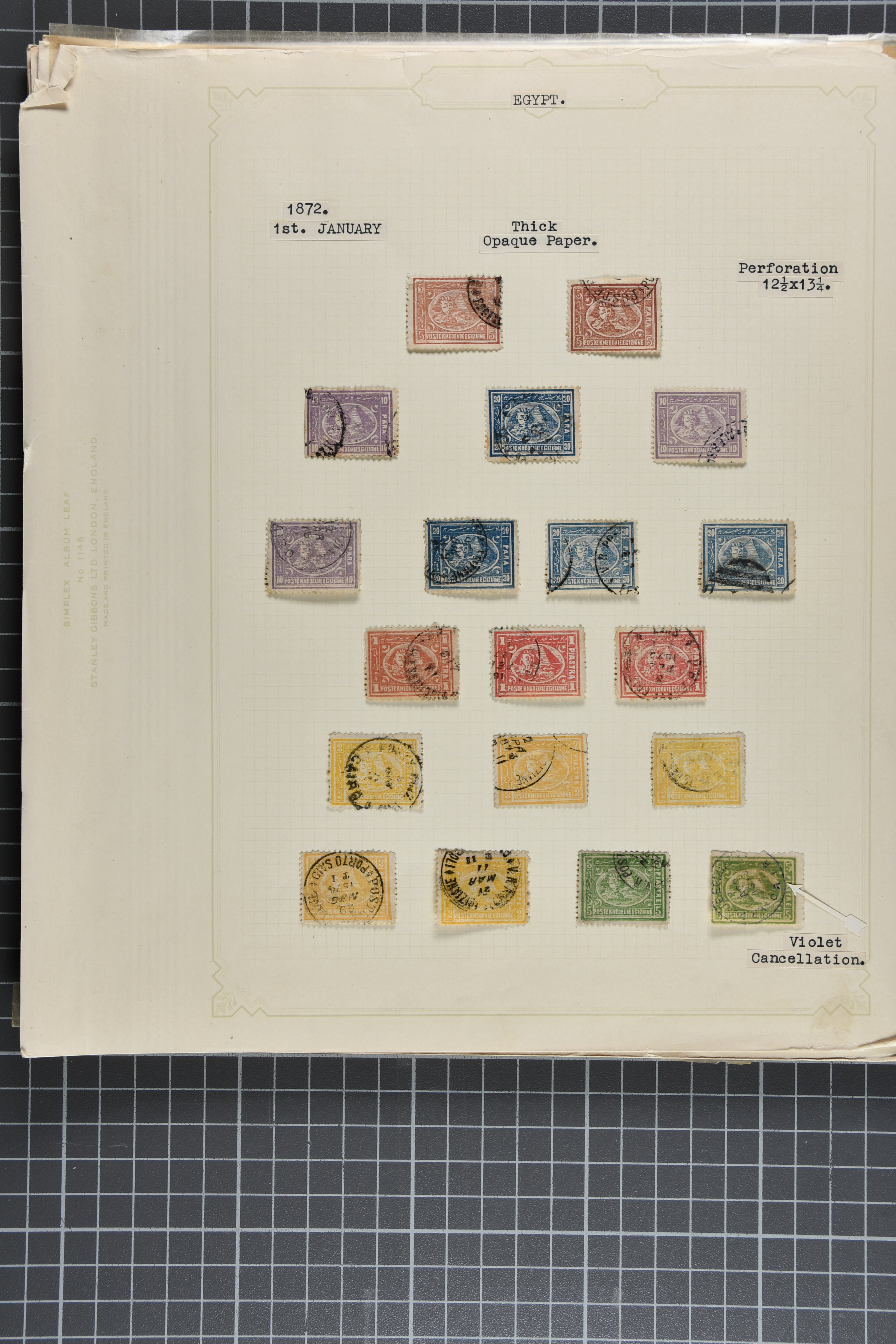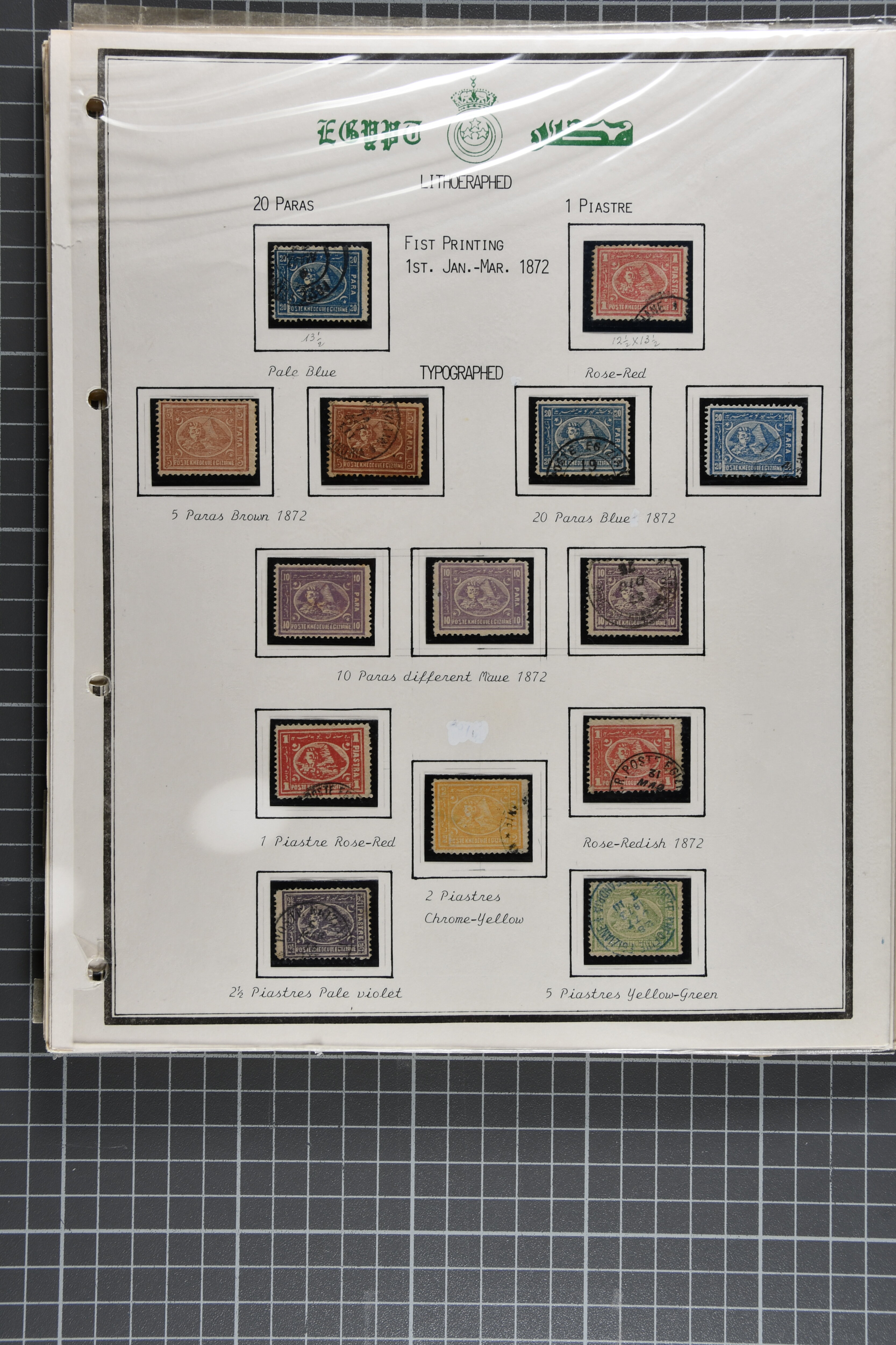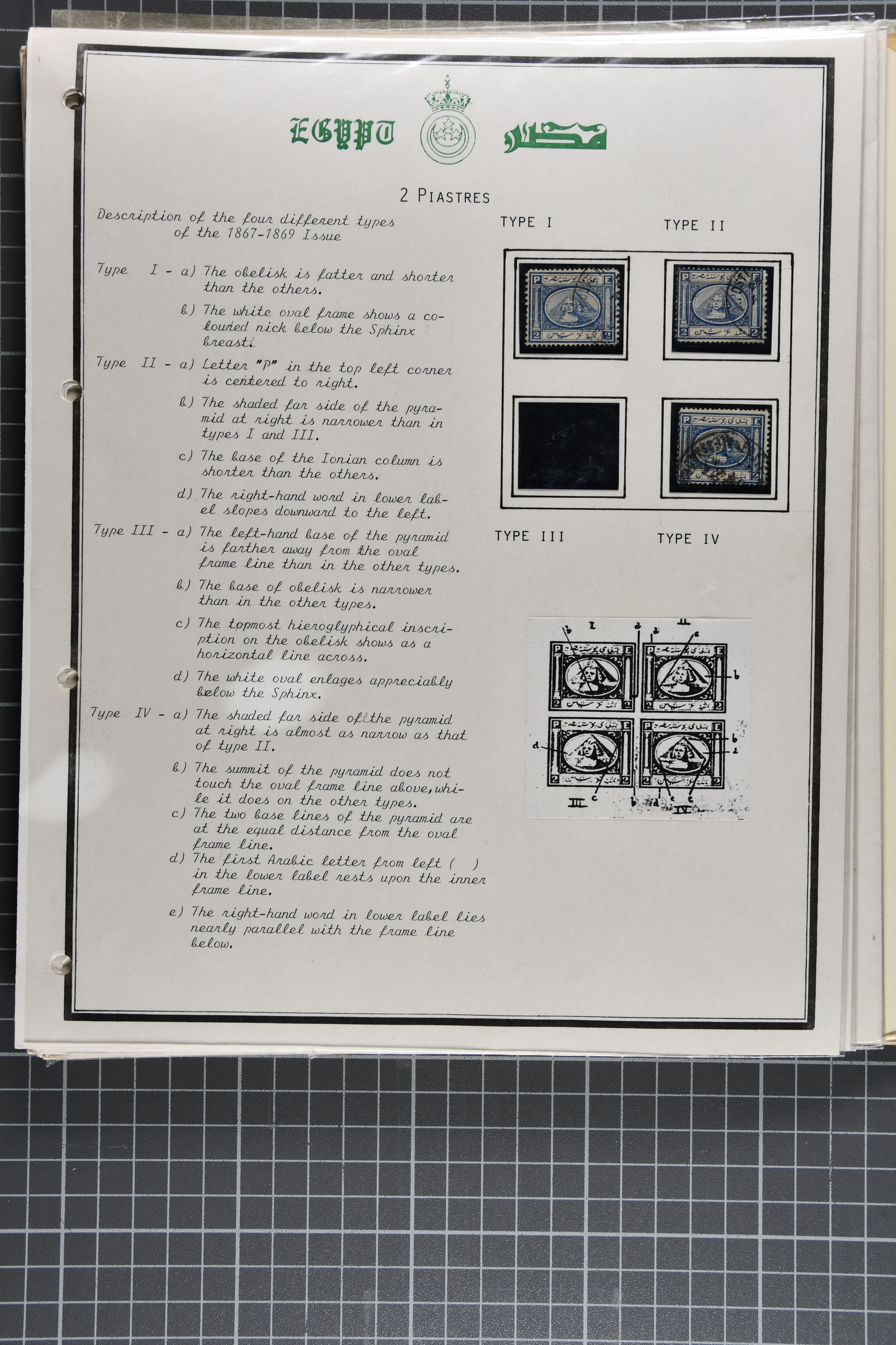 1098 bof image1866/1879: Collection on leaves with set of seven imperf. Pellas Proofs for the first issue, 10 pi. slate background only Proof on wmk'd paper, 1866 First issue 5 pa. unused (2), 10 pa. brown unused and used, 20 pa. blue used (2), 1 pi with very fine usage on cover from Alexandria, 2 pi. used (2), 5 pi. rose unused (cert. BPA), 10 pi. slate unused (cert. RPSL), 1867 range showing the types incl. 1 pi. unused block, 5 pi. brown used, 1872/75 issue used, and unused Bulaq 5 pa. brown block showing two tête-bêche's, 20 pa. grey block, 2 pi. yellow block of four, theerafter large range with cancellation interest etc. (324 items). (Image 1) (Image 2) (Image 3) (Image 4) (Image 5) (Image 6) (Image 7) (Image 8) (Image 9) (Image 10) (Image 11) (Image 12) (Image 13) (Image 14) (Image 15) (Image 16) (Image 17) (Image 18) (Image 19) (Image 20) (Image 21) (Image 22) (Image 23) (Image 24) (Image 25) (Image 26) (Image 27) (Image 28) (Image 29) (Image 30) (Image 31) (Image 32) (Image 33) (Image 34) (Image 35) (Image 36)