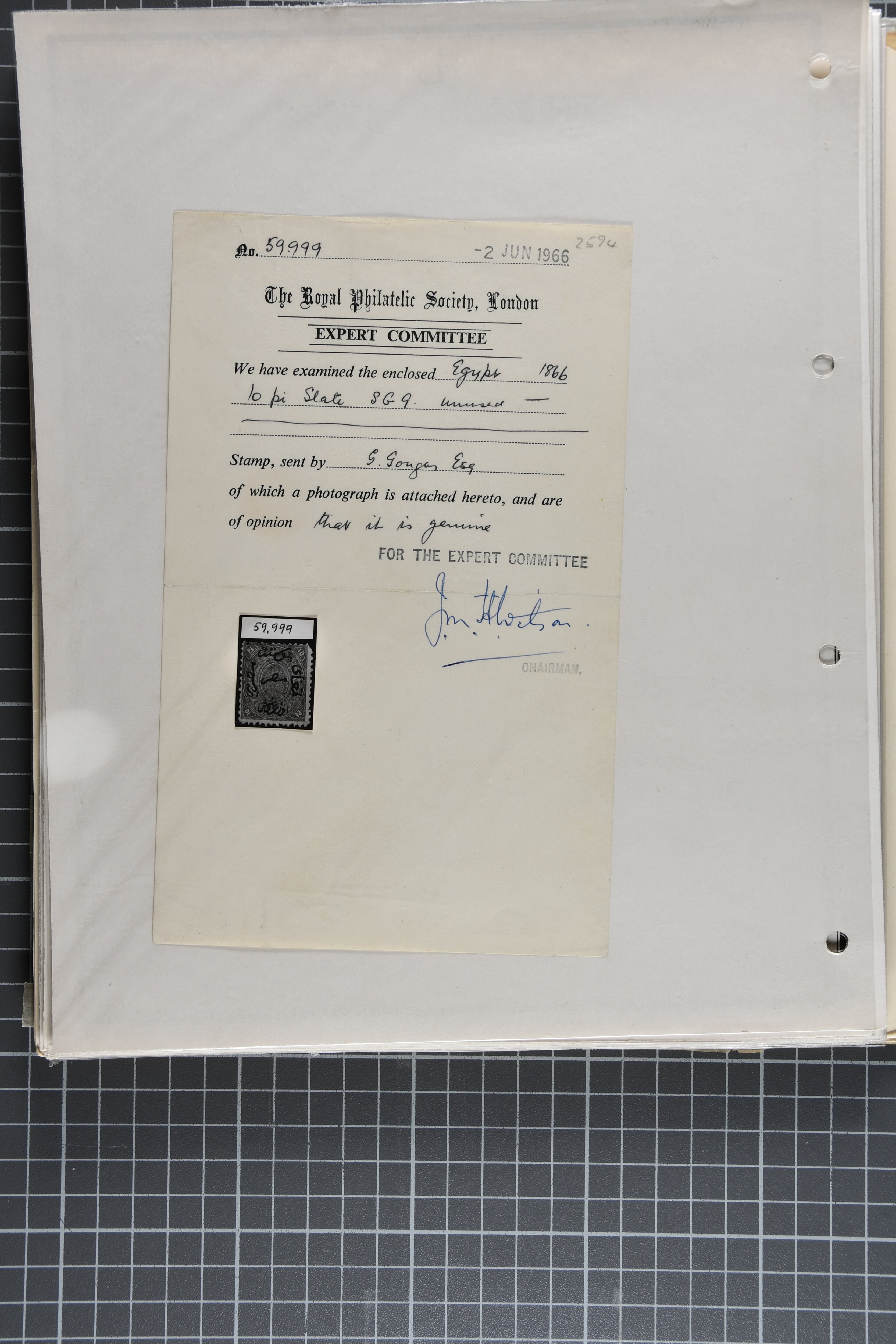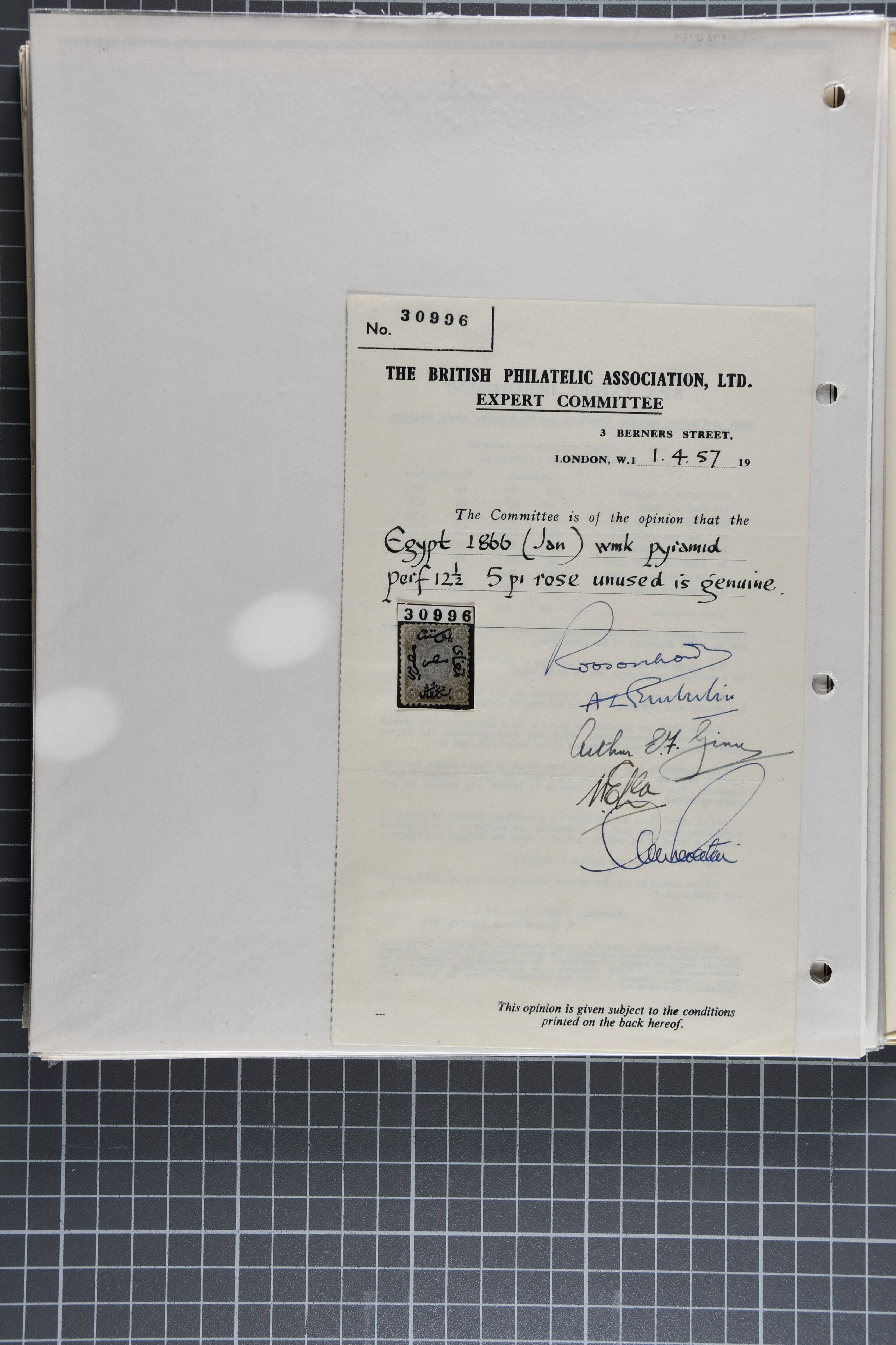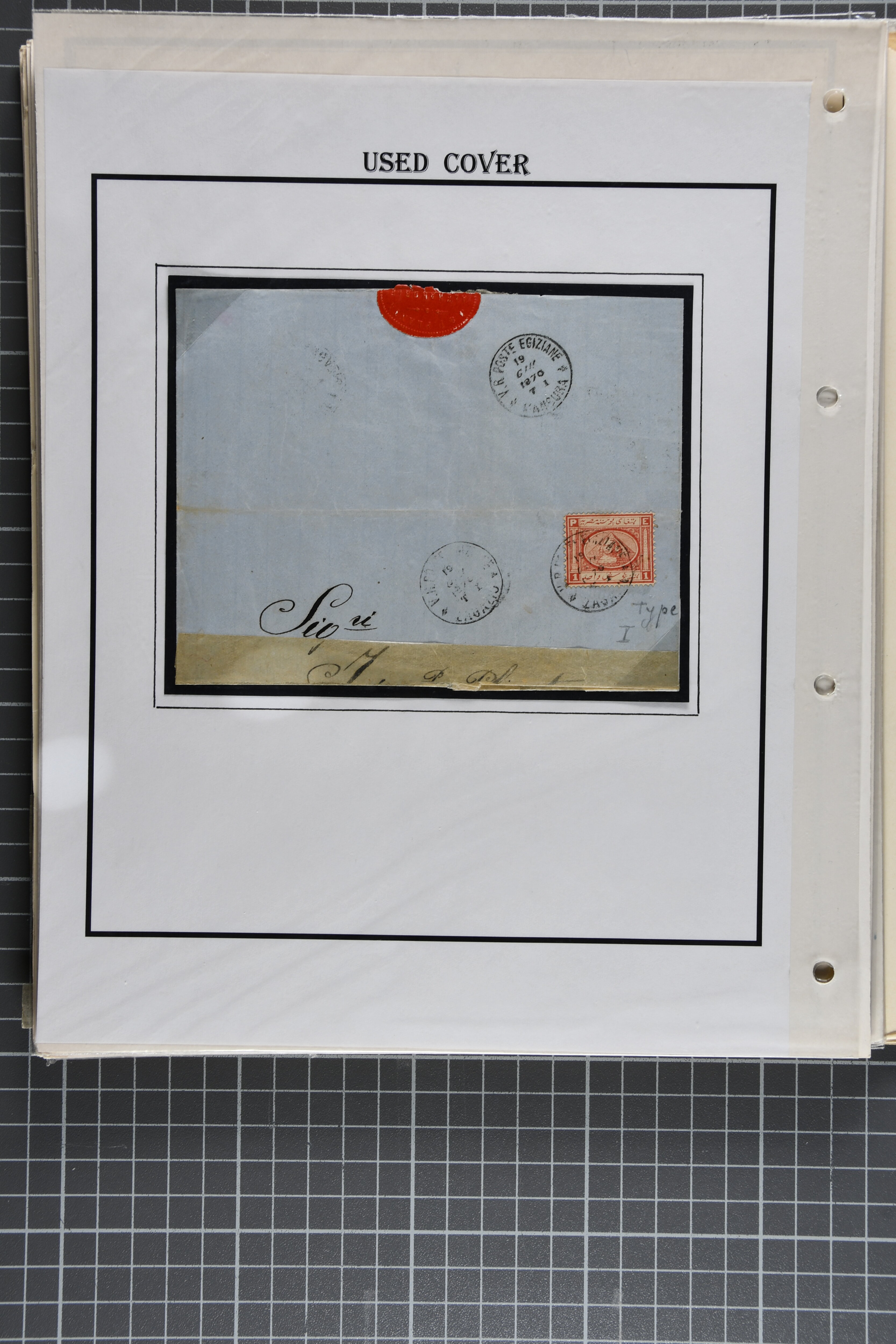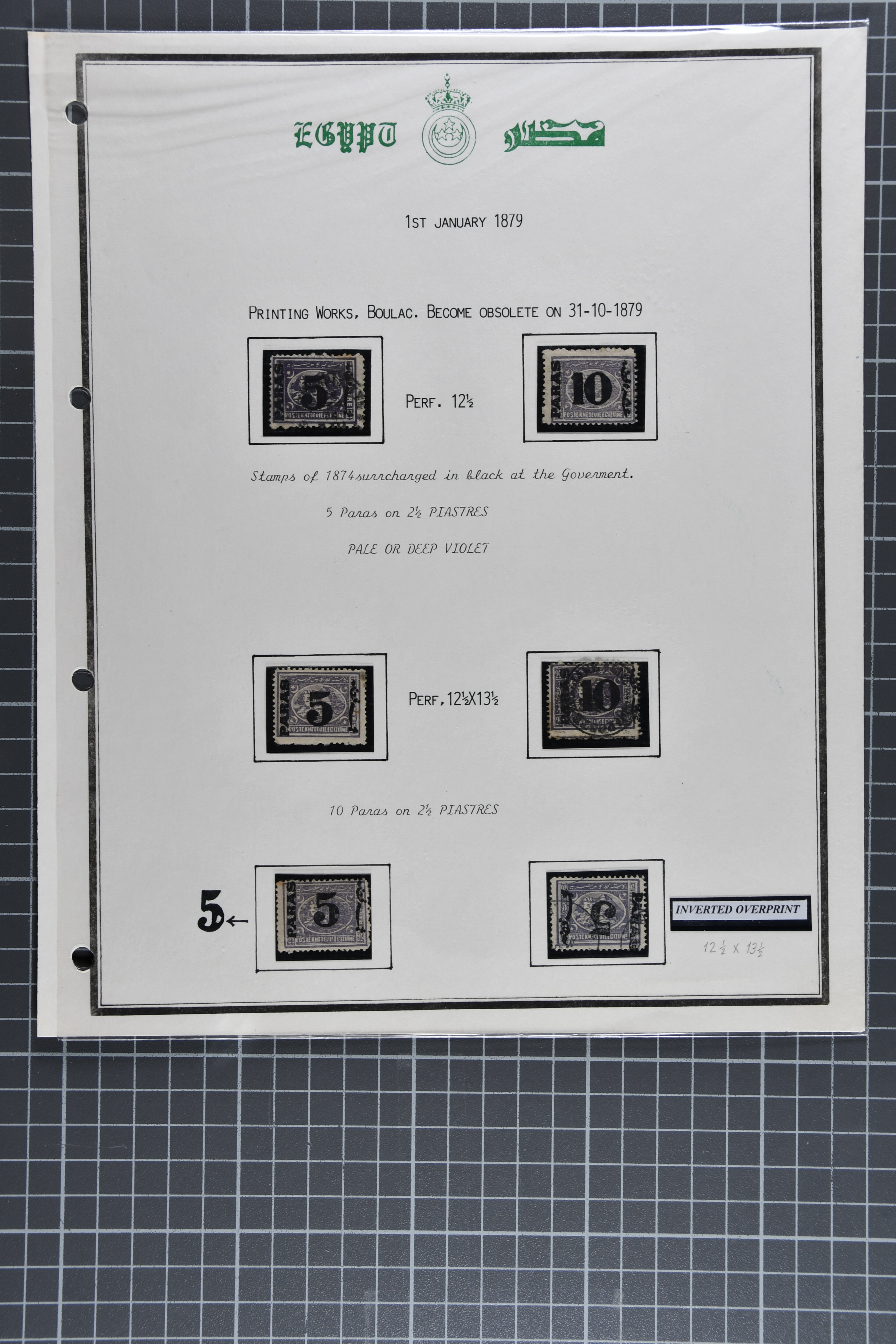 1098 bof image1866/1879: Collection on leaves with set of seven imperf. Pellas Proofs for the first issue, 10 pi. slate background only Proof on wmk'd paper, 1866 First issue 5 pa. unused (2), 10 pa. brown unused and used, 20 pa. blue used (2), 1 pi with very fine usage on cover from Alexandria, 2 pi. used (2), 5 pi. rose unused (cert. BPA), 10 pi. slate unused (cert. RPSL), 1867 range showing the types incl. 1 pi. unused block, 5 pi. brown used, 1872/75 issue used, and unused Bulaq 5 pa. brown block showing two tête-bêche's, 20 pa. grey block, 2 pi. yellow block of four, theerafter large range with cancellation interest etc. (324 items). (Image 1) (Image 2) (Image 3) (Image 4) (Image 5) (Image 6) (Image 7) (Image 8) (Image 9) (Image 10) (Image 11) (Image 12) (Image 13) (Image 14) (Image 15) (Image 16) (Image 17) (Image 18) (Image 19) (Image 20) (Image 21) (Image 22) (Image 23) (Image 24) (Image 25) (Image 26) (Image 27) (Image 28) (Image 29) (Image 30) (Image 31) (Image 32) (Image 33) (Image 34) (Image 35) (Image 36)