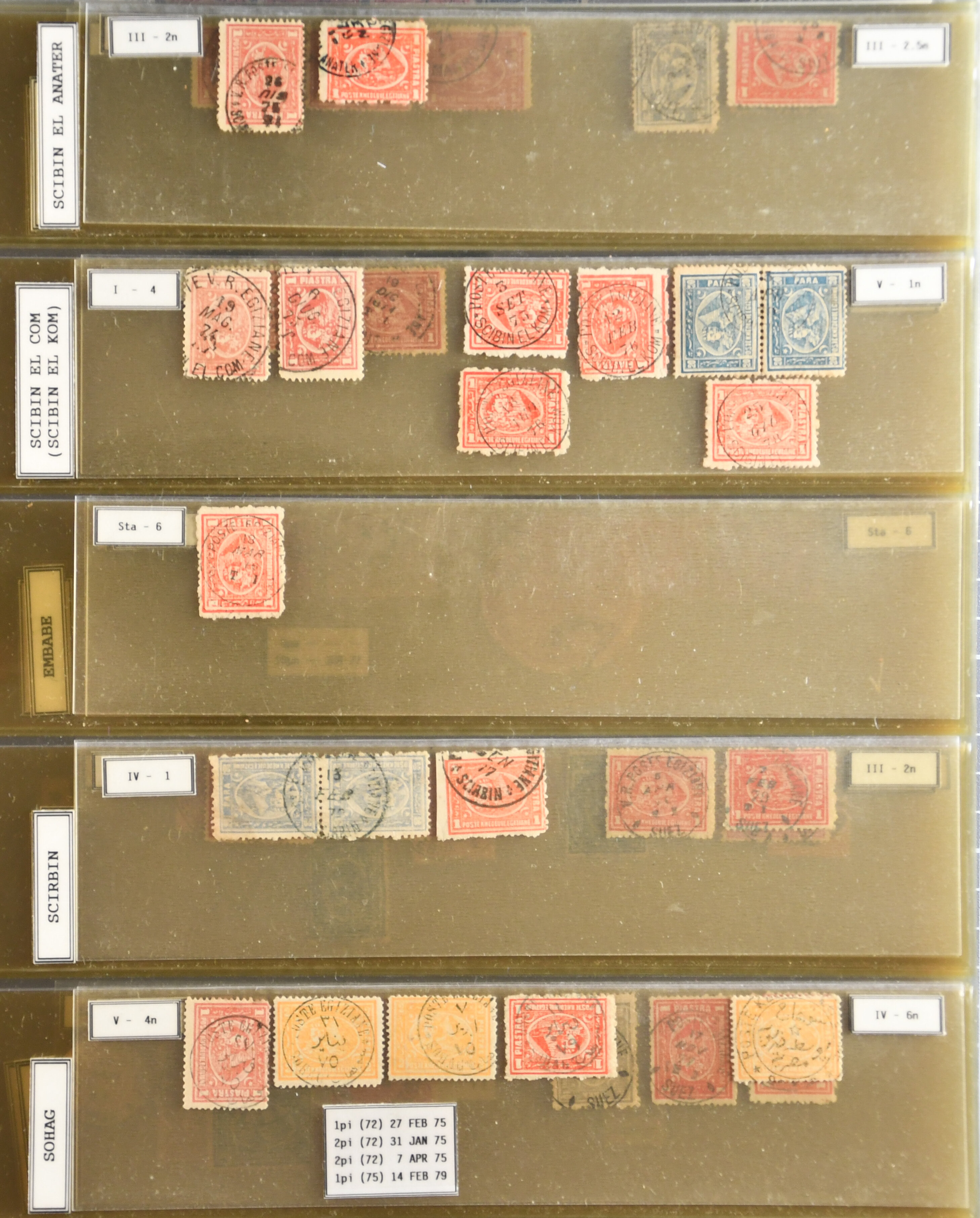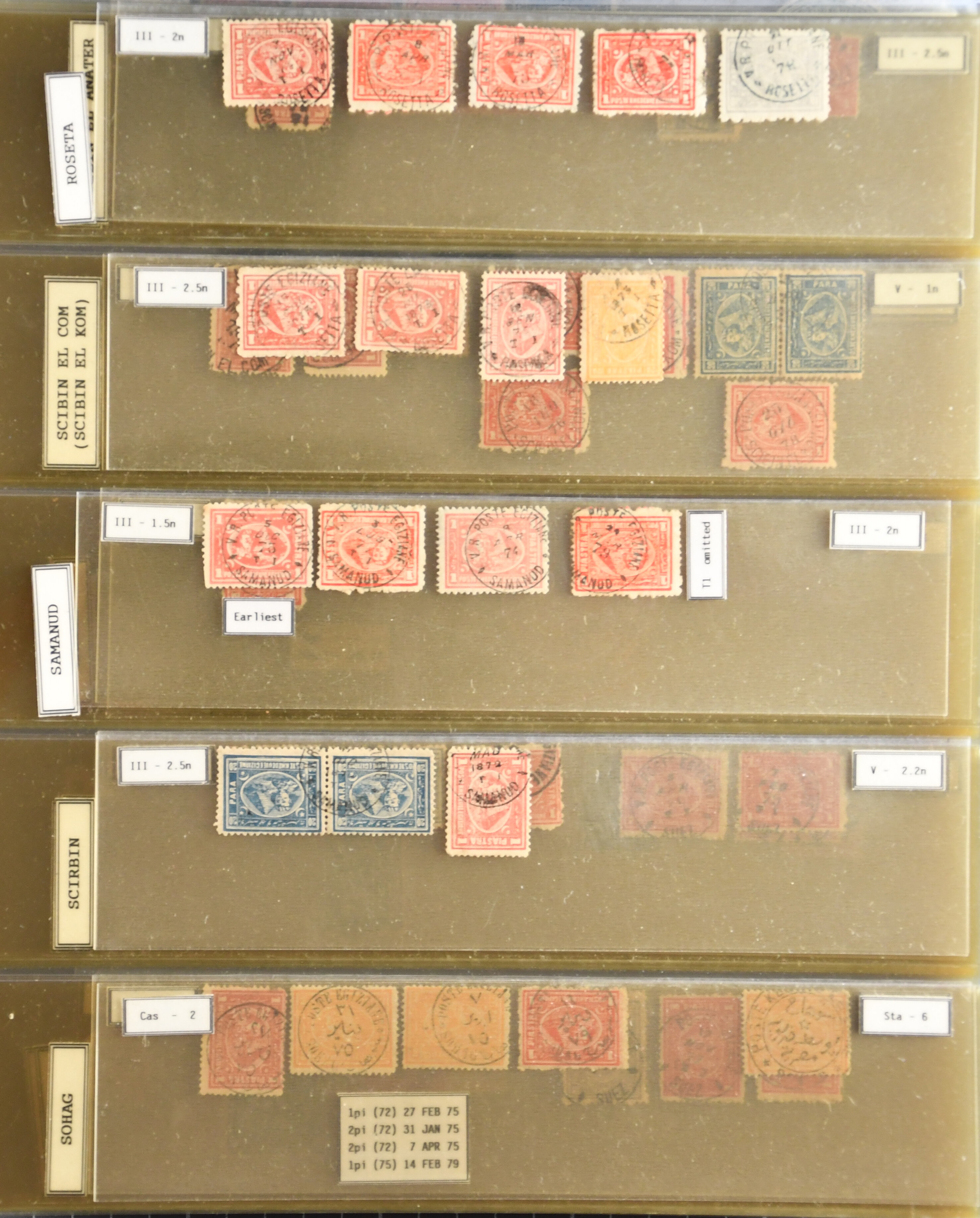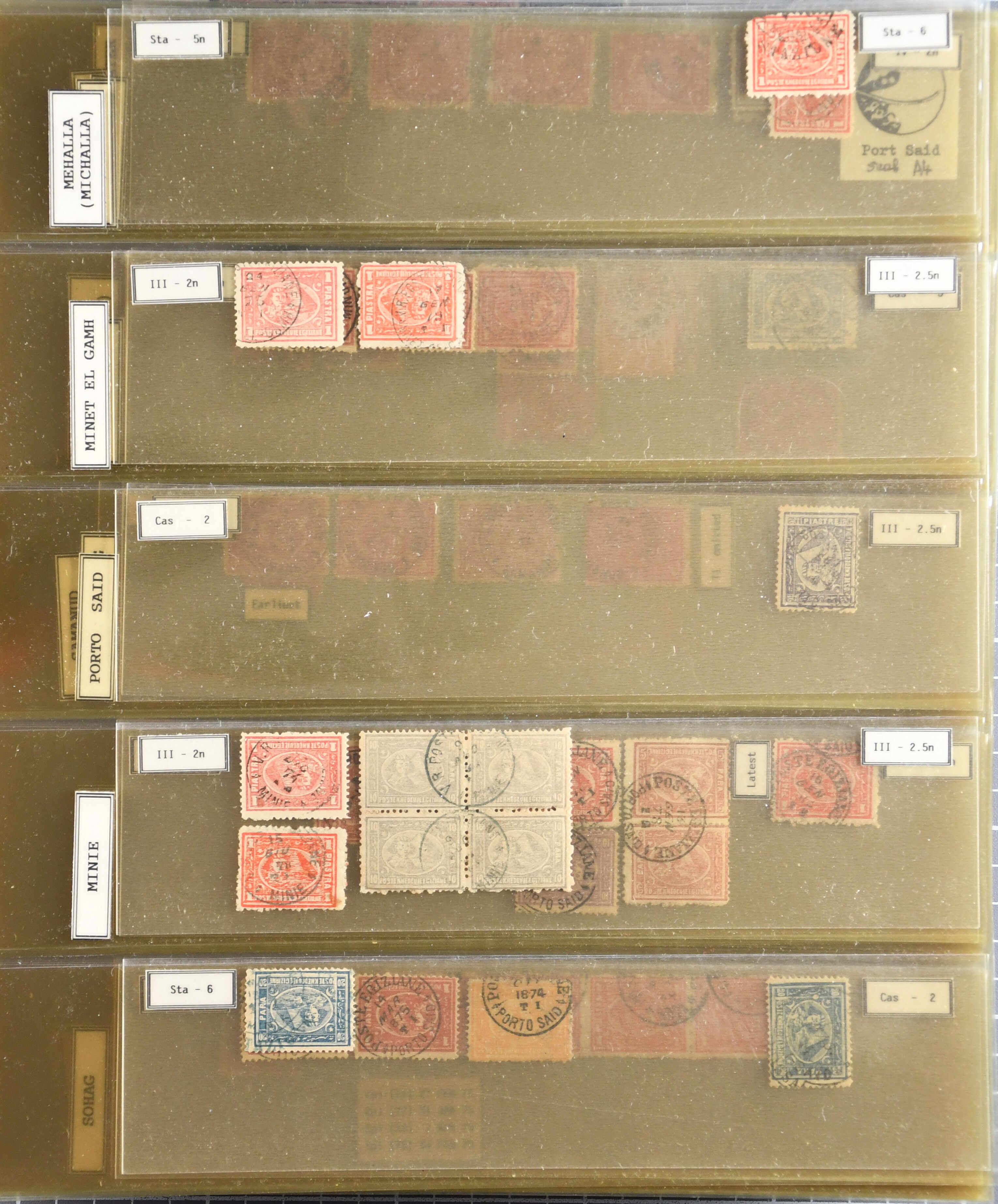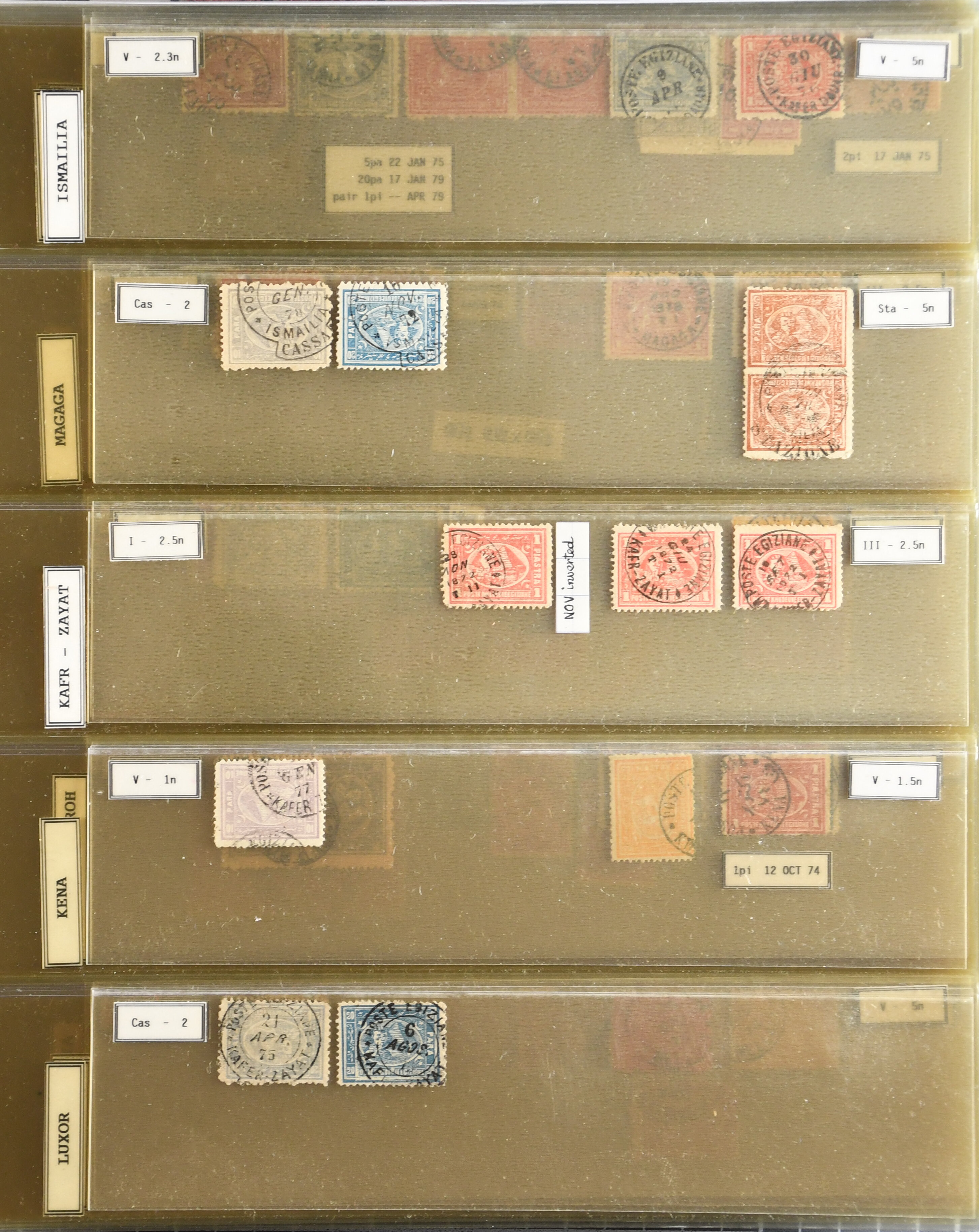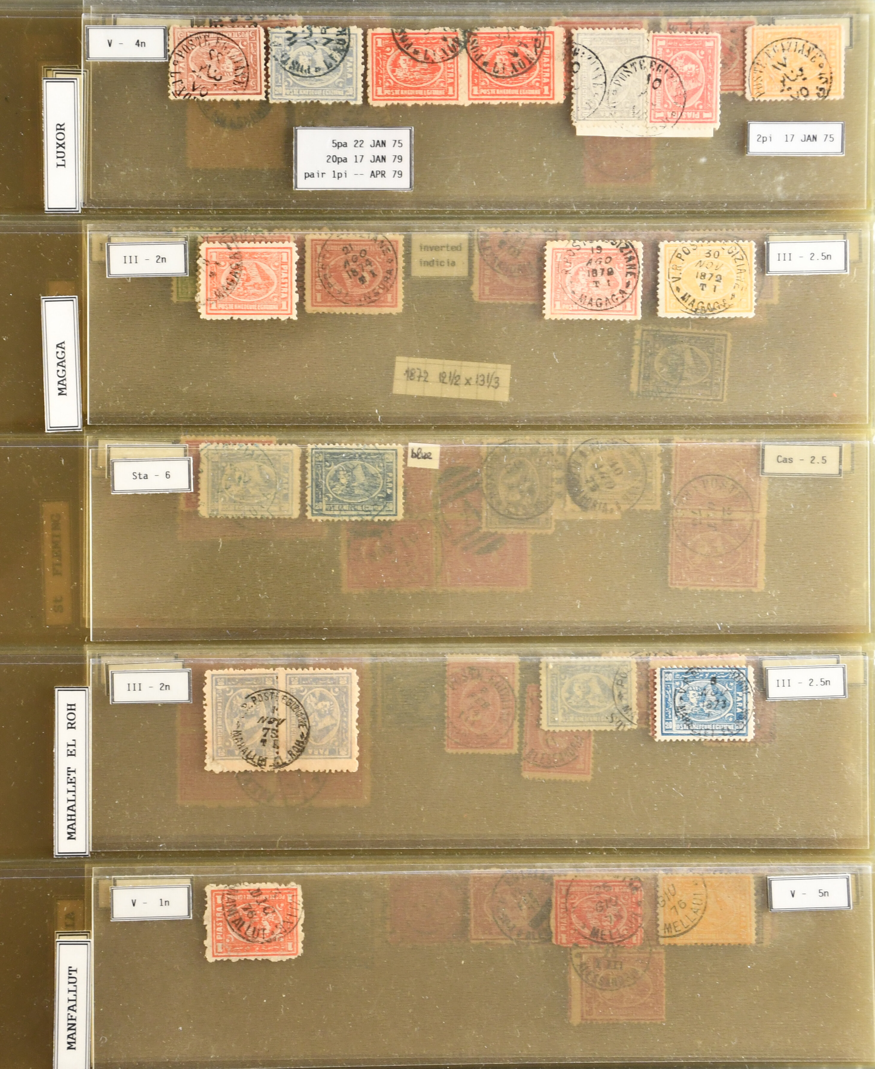 1100 image1867/75: Penasson & Bulâq, the extraordinary cancellation study on the issues with all values represented, from Alexandria incl. 1874 5 pa. tête-bêche pairs (3), 1 pi. red in blocks of four; rare Mailboat "ALES / UFIZIO NATANTE" cds's on 20 pa. and 1 pi. (2); rare "ST. BULKELEY", ST. BACOS and ST. SCHUTZ mostly on 1 pi., Cairo with "Ambulante / Cairo - Ales" cds's on 5 pa. and 1 pi., "Cairo / Stazione" on 5 pa. brown tête-bêche pair; rare ABE star and crescent (3), range of cancels from ABU HOMUS, ASSOUAN incl. a cover, ATFE, BENHA, BENI SUEF, rare BILBES usage, BIRKET EL SAB, rare BULAH DACRUR (2), DAMANHOUR, DAMIATA, DESUK, fine arabic dated ESNA range, FESCNE, rare GAALIUB on 1 pi., GHERGA, rare GHISA on 5 pa. tête-bêche block of four, HELOUAN, ISMAILIA, KAFR DAUAR, KAFR ZAYAT, KENA incl. a cover, LUXOR arabic dated range, MAGAGA, MAHALLET ROH, MANFALOUT, MANSURA, MELLAUI, MEDINET EL FAIUM, MEHALLA, MINET EL GAMH, MINIE on 10 pa.grey block of four, MINUF, PORT SAID, RAMSES, RODA, ROSETTA, SAMANUD, SCIBIN EL ANATEUR, SCIBIN EL KOM, SOHAG arabic dated range, SIUT incl. a cover, SUEZ, TEH EL BAROUD, TANTA, rare TOOH with four examples, TEH EL KIBIR, ZAGASIK, ZEFTA; and Station postmnarks, rettas, registration cancels etc., used abroad with 1 pi. used in BARBAR, KARTUM usages, 1 pi. block of four used in KASSALA, fine groups from GEDDA (incl. rare 1867 5 pi. usage) and MASSAWA, SUAKIM in black and in blue, BAIROUT with superb 1872 5 pa. and others, superb CAVALLA (3, one with Hass cert.), large range of CONSTANTINOPLE, GALLIPOLI incl. magnificent strike on 1872 1 pi., LATAKIA on 1867 1 pi. (cert. Hass), 2 pi. yellow used in TRIPOLI, superb group (10) from METELINO incl. 1867 1 pi. used with "Medilli" seal in black; 20 pa. grey-blue in a strip of three, rare RODI cds's (4), SCIO incl. a cover used with 1875/75 20 pa. and 1 pi., DARDANELLI, SMIRNE incl. a cover used with 1875/75 20 pa. and 1 pi., VOLO with 1867 1 pi. red with central datestamp etc. A delightful study (438 items and 17 covers). (Image 1) (Image 2) (Image 3) (Image 4) (Image 5) (Image 6) (Image 7) (Image 8) (Image 9) (Image 10) (Image 11) (Image 12) (Image 13) (Image 14) (Image 15) (Image 16) (Image 17) (Image 18) (Image 19) (Image 20) (Image 21) (Image 22) (Image 23) (Image 24) (Image 25) (Image 26) (Image 27) (Image 28) (Image 29) (Image 30) (Image 31) (Image 32) (Image 33) (Image 34) (Image 35) (Image 36) (Image 37) (Image 38) (Image 39) (Image 40) (Image 41) (Image 42) (Image 43) (Image 44) (Image 45) (Image 46) (Image 47) (Image 48) (Image 49) (Image 50)
