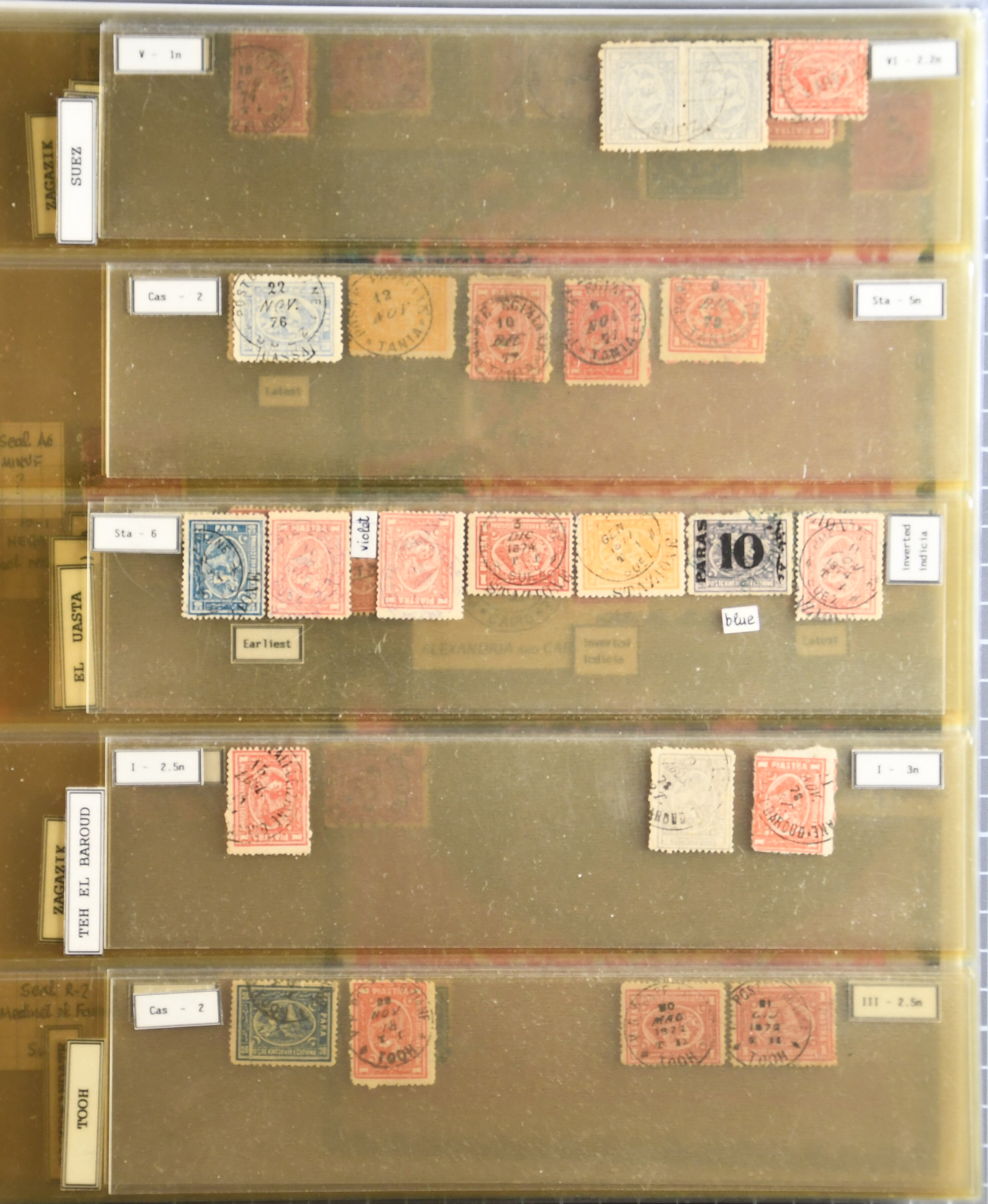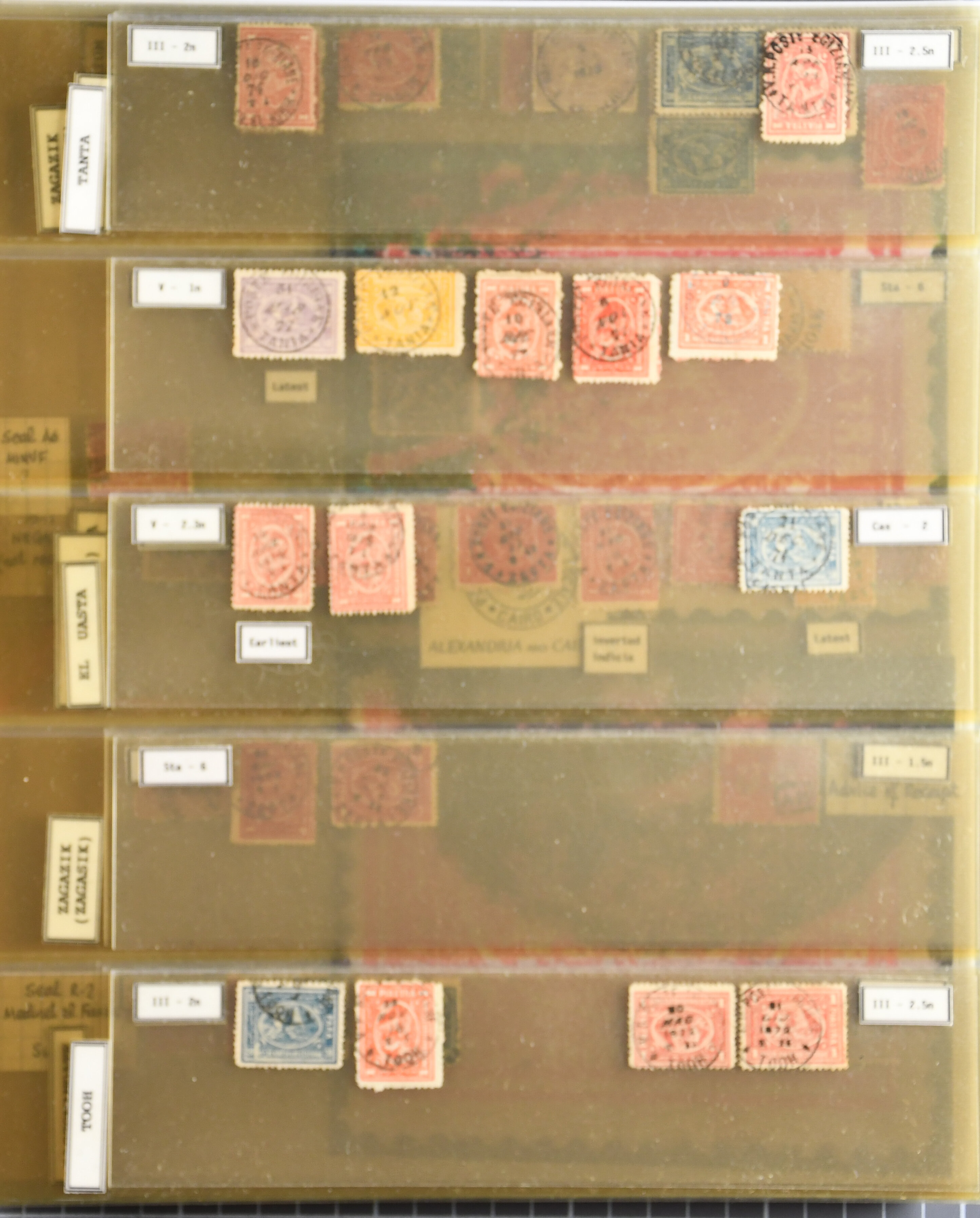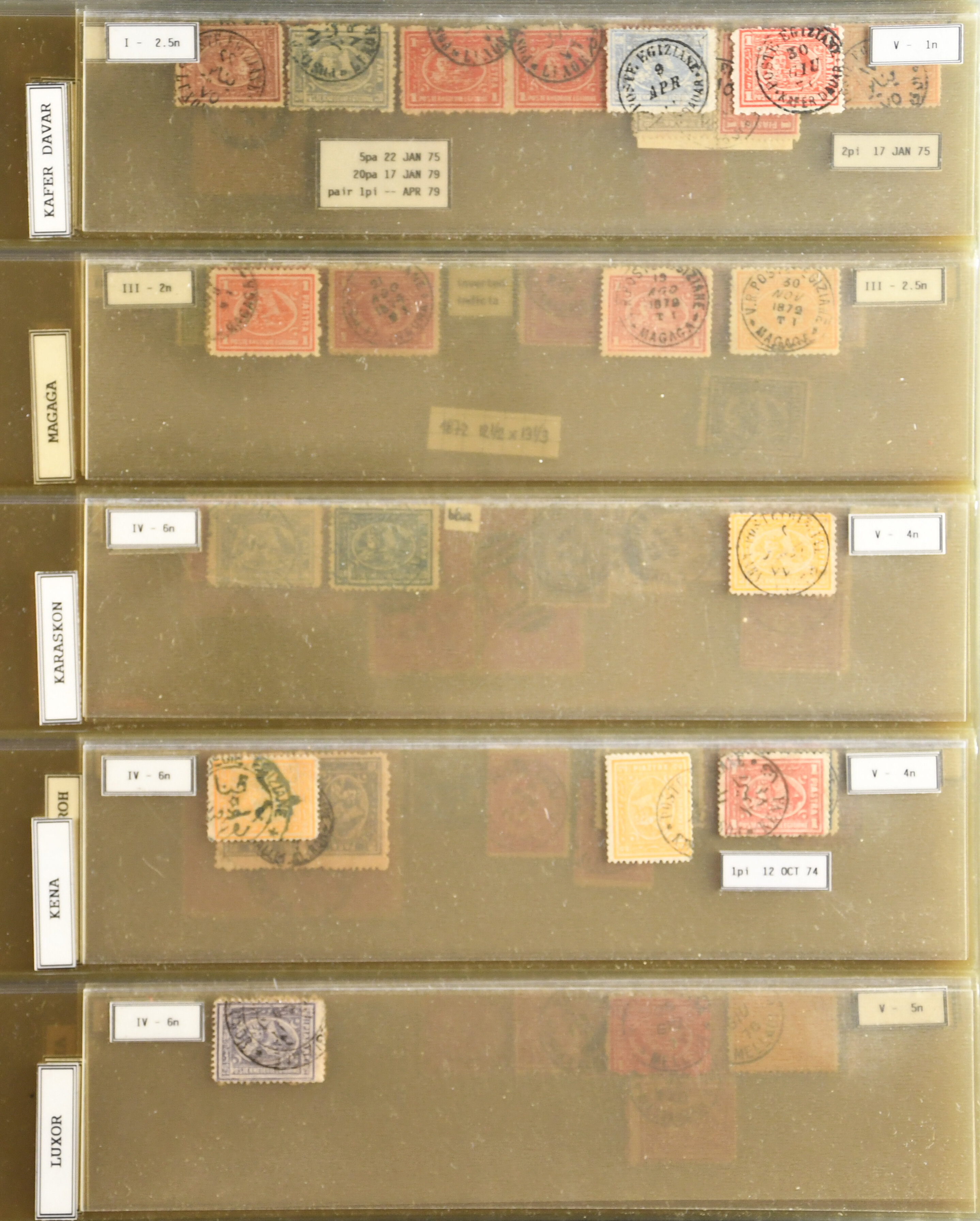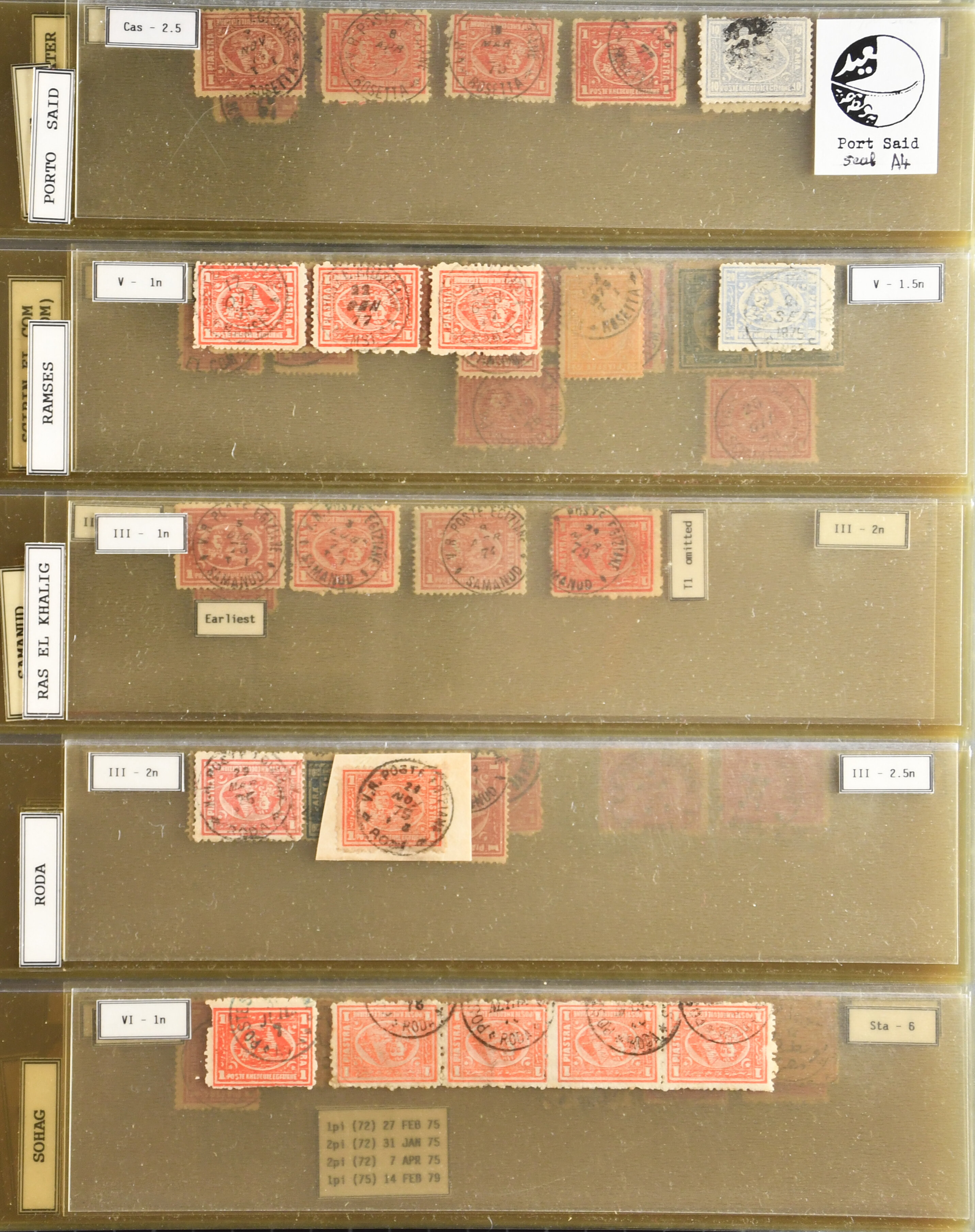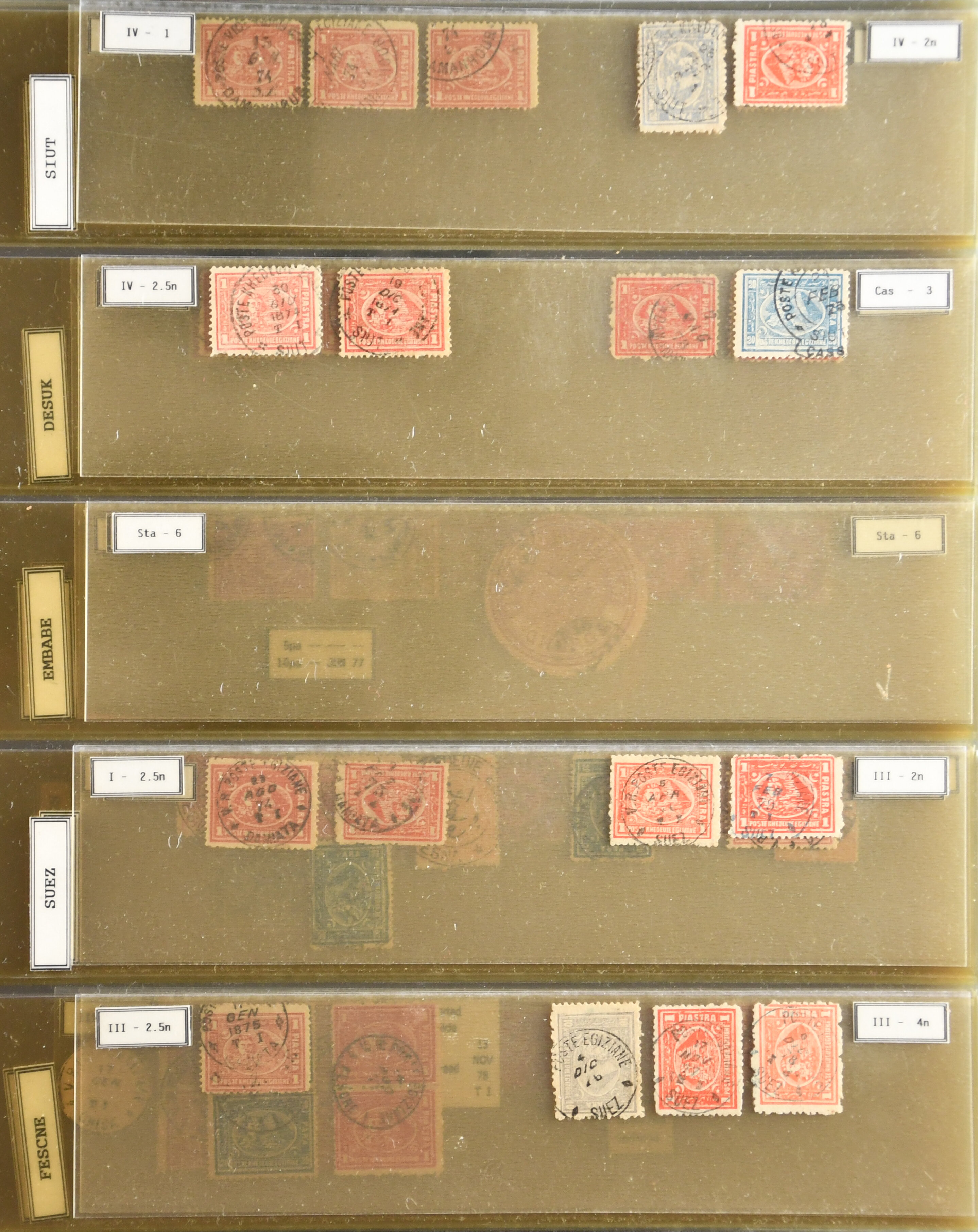 1100 image1867/75: Penasson & Bulâq, the extraordinary cancellation study on the issues with all values represented, from Alexandria incl. 1874 5 pa. tête-bêche pairs (3), 1 pi. red in blocks of four; rare Mailboat "ALES / UFIZIO NATANTE" cds's on 20 pa. and 1 pi. (2); rare "ST. BULKELEY", ST. BACOS and ST. SCHUTZ mostly on 1 pi., Cairo with "Ambulante / Cairo - Ales" cds's on 5 pa. and 1 pi., "Cairo / Stazione" on 5 pa. brown tête-bêche pair; rare ABE star and crescent (3), range of cancels from ABU HOMUS, ASSOUAN incl. a cover, ATFE, BENHA, BENI SUEF, rare BILBES usage, BIRKET EL SAB, rare BULAH DACRUR (2), DAMANHOUR, DAMIATA, DESUK, fine arabic dated ESNA range, FESCNE, rare GAALIUB on 1 pi., GHERGA, rare GHISA on 5 pa. tête-bêche block of four, HELOUAN, ISMAILIA, KAFR DAUAR, KAFR ZAYAT, KENA incl. a cover, LUXOR arabic dated range, MAGAGA, MAHALLET ROH, MANFALOUT, MANSURA, MELLAUI, MEDINET EL FAIUM, MEHALLA, MINET EL GAMH, MINIE on 10 pa.grey block of four, MINUF, PORT SAID, RAMSES, RODA, ROSETTA, SAMANUD, SCIBIN EL ANATEUR, SCIBIN EL KOM, SOHAG arabic dated range, SIUT incl. a cover, SUEZ, TEH EL BAROUD, TANTA, rare TOOH with four examples, TEH EL KIBIR, ZAGASIK, ZEFTA; and Station postmnarks, rettas, registration cancels etc., used abroad with 1 pi. used in BARBAR, KARTUM usages, 1 pi. block of four used in KASSALA, fine groups from GEDDA (incl. rare 1867 5 pi. usage) and MASSAWA, SUAKIM in black and in blue, BAIROUT with superb 1872 5 pa. and others, superb CAVALLA (3, one with Hass cert.), large range of CONSTANTINOPLE, GALLIPOLI incl. magnificent strike on 1872 1 pi., LATAKIA on 1867 1 pi. (cert. Hass), 2 pi. yellow used in TRIPOLI, superb group (10) from METELINO incl. 1867 1 pi. used with "Medilli" seal in black; 20 pa. grey-blue in a strip of three, rare RODI cds's (4), SCIO incl. a cover used with 1875/75 20 pa. and 1 pi., DARDANELLI, SMIRNE incl. a cover used with 1875/75 20 pa. and 1 pi., VOLO with 1867 1 pi. red with central datestamp etc. A delightful study (438 items and 17 covers). (Image 1) (Image 2) (Image 3) (Image 4) (Image 5) (Image 6) (Image 7) (Image 8) (Image 9) (Image 10) (Image 11) (Image 12) (Image 13) (Image 14) (Image 15) (Image 16) (Image 17) (Image 18) (Image 19) (Image 20) (Image 21) (Image 22) (Image 23) (Image 24) (Image 25) (Image 26) (Image 27) (Image 28) (Image 29) (Image 30) (Image 31) (Image 32) (Image 33) (Image 34) (Image 35) (Image 36) (Image 37) (Image 38) (Image 39) (Image 40) (Image 41) (Image 42) (Image 43) (Image 44) (Image 45) (Image 46) (Image 47) (Image 48) (Image 49) (Image 50)