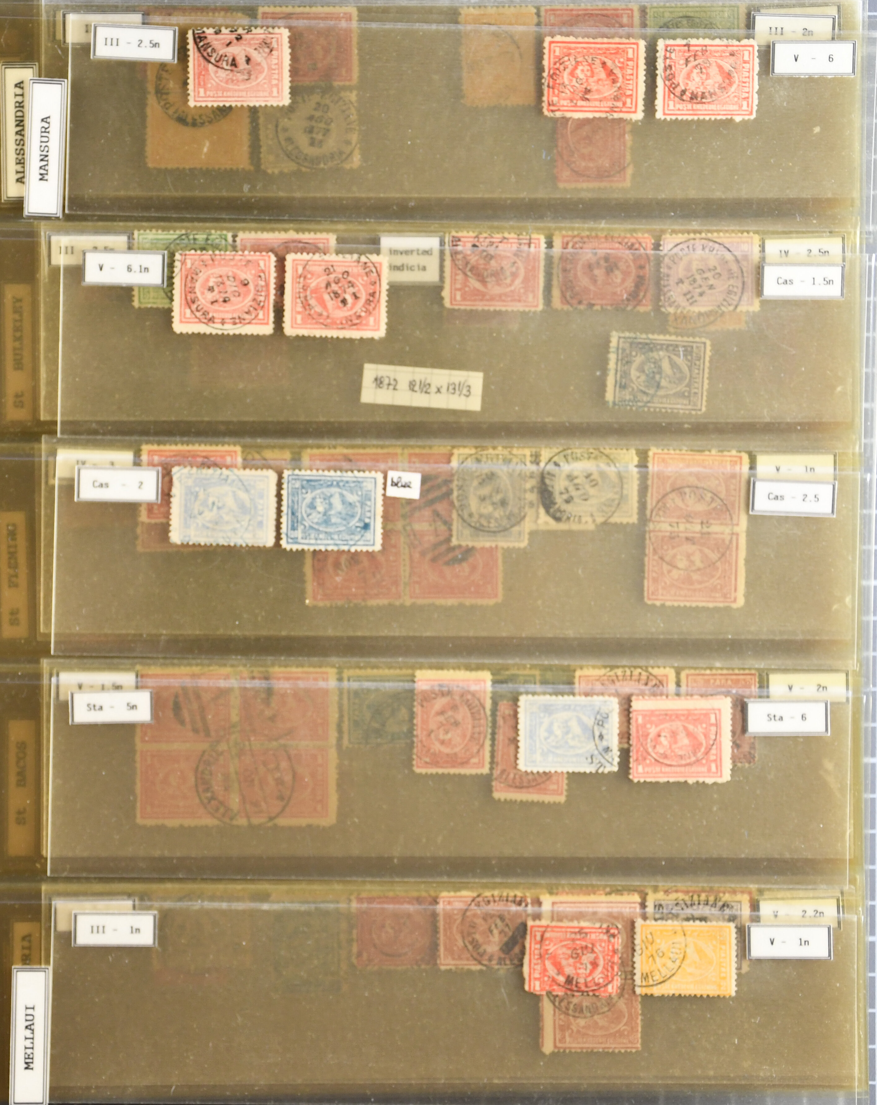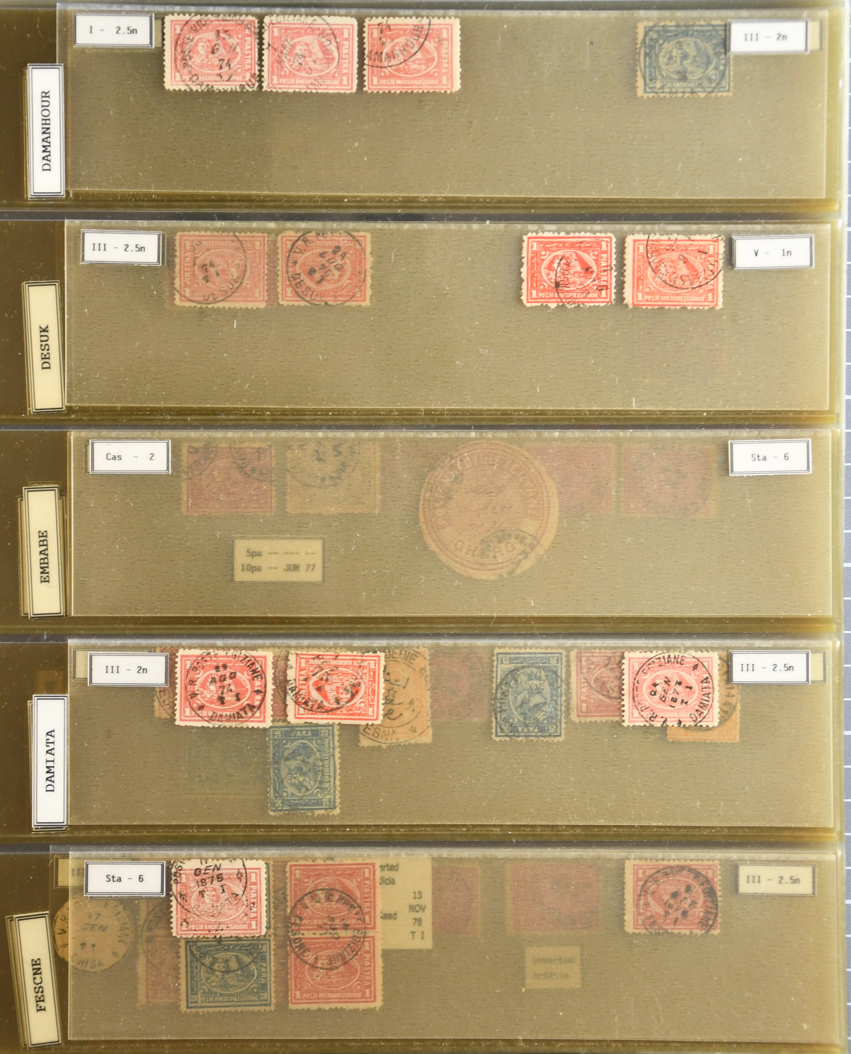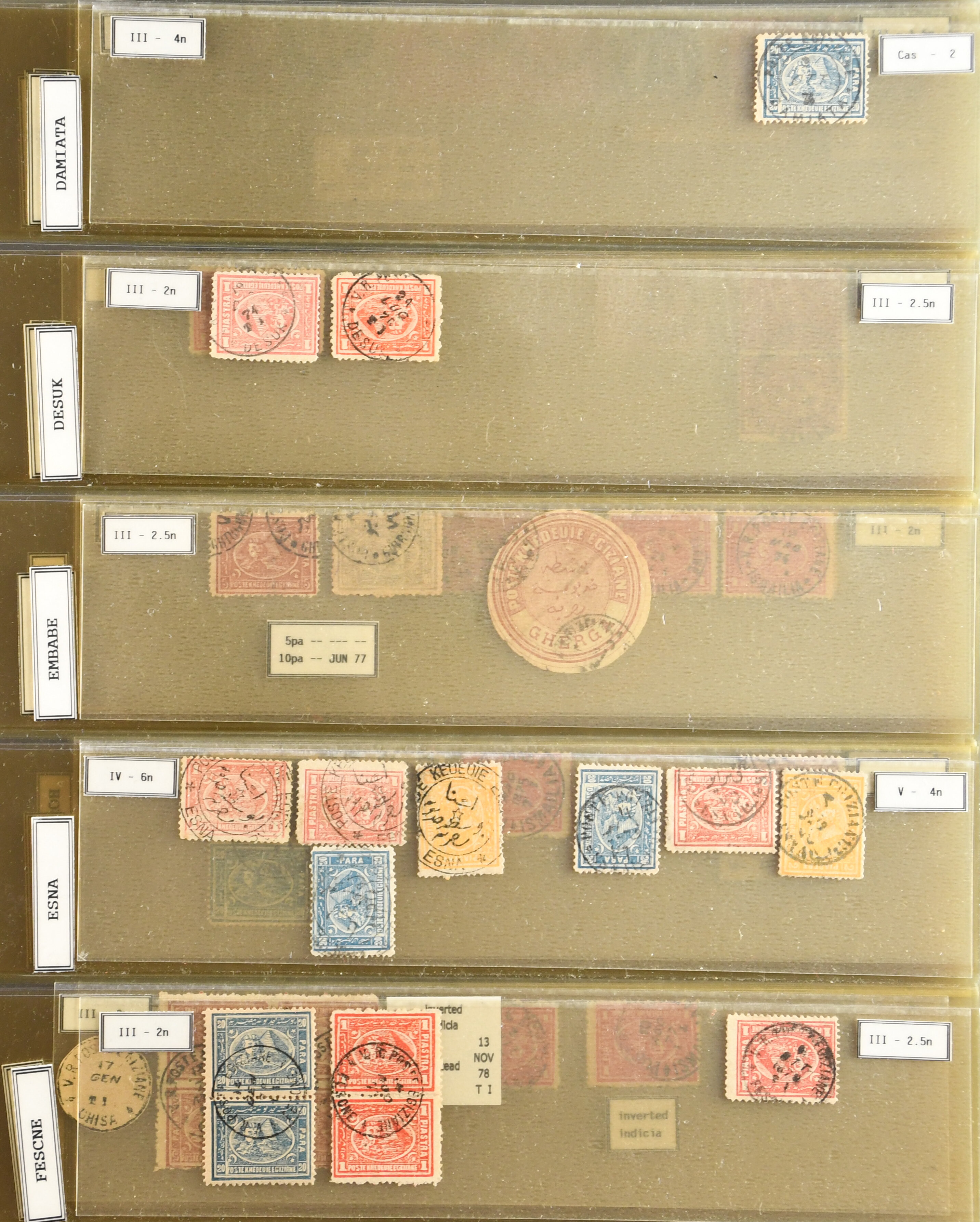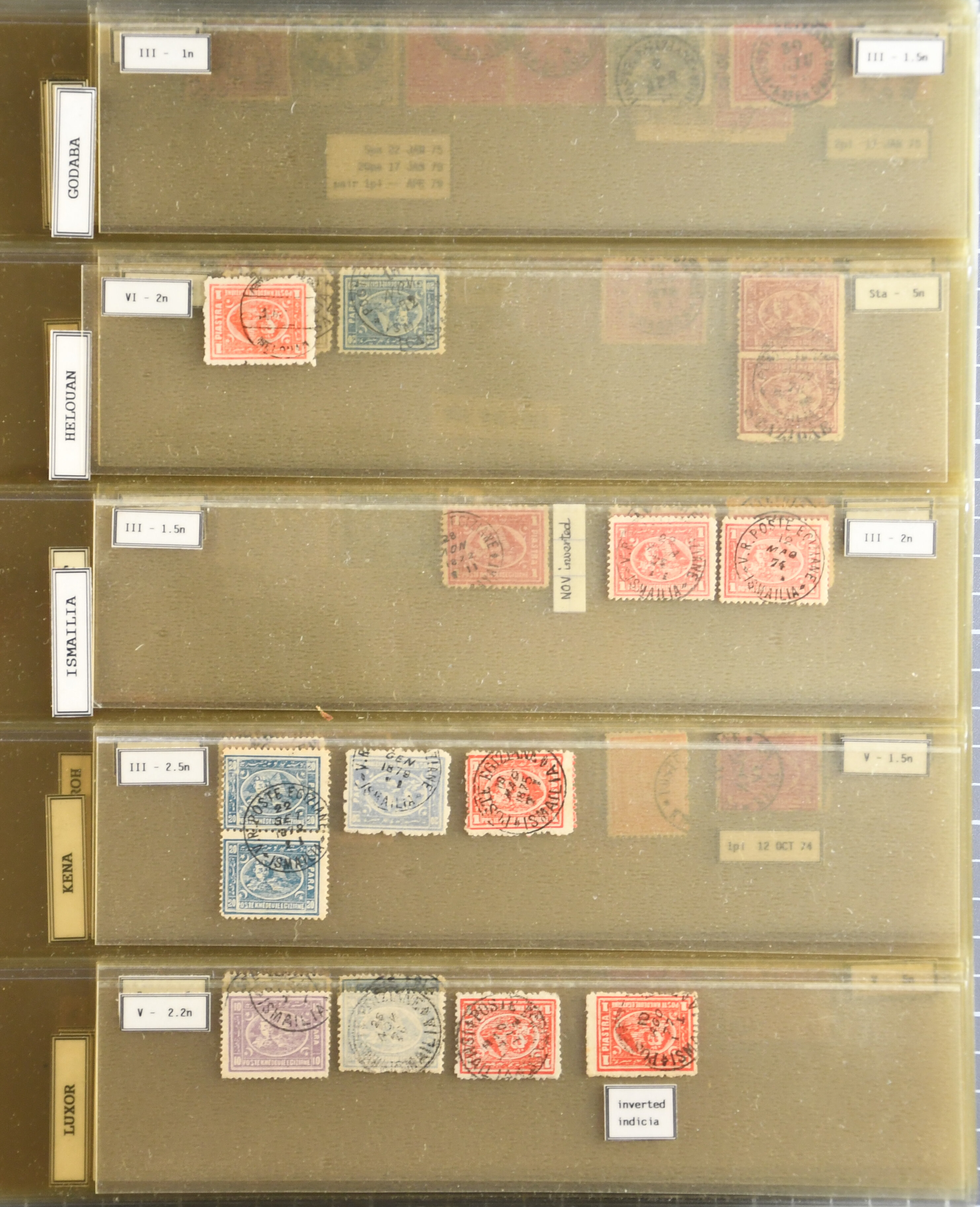 1100 image1867/75: Penasson & Bulâq, the extraordinary cancellation study on the issues with all values represented, from Alexandria incl. 1874 5 pa. tête-bêche pairs (3), 1 pi. red in blocks of four; rare Mailboat "ALES / UFIZIO NATANTE" cds's on 20 pa. and 1 pi. (2); rare "ST. BULKELEY", ST. BACOS and ST. SCHUTZ mostly on 1 pi., Cairo with "Ambulante / Cairo - Ales" cds's on 5 pa. and 1 pi., "Cairo / Stazione" on 5 pa. brown tête-bêche pair; rare ABE star and crescent (3), range of cancels from ABU HOMUS, ASSOUAN incl. a cover, ATFE, BENHA, BENI SUEF, rare BILBES usage, BIRKET EL SAB, rare BULAH DACRUR (2), DAMANHOUR, DAMIATA, DESUK, fine arabic dated ESNA range, FESCNE, rare GAALIUB on 1 pi., GHERGA, rare GHISA on 5 pa. tête-bêche block of four, HELOUAN, ISMAILIA, KAFR DAUAR, KAFR ZAYAT, KENA incl. a cover, LUXOR arabic dated range, MAGAGA, MAHALLET ROH, MANFALOUT, MANSURA, MELLAUI, MEDINET EL FAIUM, MEHALLA, MINET EL GAMH, MINIE on 10 pa.grey block of four, MINUF, PORT SAID, RAMSES, RODA, ROSETTA, SAMANUD, SCIBIN EL ANATEUR, SCIBIN EL KOM, SOHAG arabic dated range, SIUT incl. a cover, SUEZ, TEH EL BAROUD, TANTA, rare TOOH with four examples, TEH EL KIBIR, ZAGASIK, ZEFTA; and Station postmnarks, rettas, registration cancels etc., used abroad with 1 pi. used in BARBAR, KARTUM usages, 1 pi. block of four used in KASSALA, fine groups from GEDDA (incl. rare 1867 5 pi. usage) and MASSAWA, SUAKIM in black and in blue, BAIROUT with superb 1872 5 pa. and others, superb CAVALLA (3, one with Hass cert.), large range of CONSTANTINOPLE, GALLIPOLI incl. magnificent strike on 1872 1 pi., LATAKIA on 1867 1 pi. (cert. Hass), 2 pi. yellow used in TRIPOLI, superb group (10) from METELINO incl. 1867 1 pi. used with "Medilli" seal in black; 20 pa. grey-blue in a strip of three, rare RODI cds's (4), SCIO incl. a cover used with 1875/75 20 pa. and 1 pi., DARDANELLI, SMIRNE incl. a cover used with 1875/75 20 pa. and 1 pi., VOLO with 1867 1 pi. red with central datestamp etc. A delightful study (438 items and 17 covers). (Image 1) (Image 2) (Image 3) (Image 4) (Image 5) (Image 6) (Image 7) (Image 8) (Image 9) (Image 10) (Image 11) (Image 12) (Image 13) (Image 14) (Image 15) (Image 16) (Image 17) (Image 18) (Image 19) (Image 20) (Image 21) (Image 22) (Image 23) (Image 24) (Image 25) (Image 26) (Image 27) (Image 28) (Image 29) (Image 30) (Image 31) (Image 32) (Image 33) (Image 34) (Image 35) (Image 36) (Image 37) (Image 38) (Image 39) (Image 40) (Image 41) (Image 42) (Image 43) (Image 44) (Image 45) (Image 46) (Image 47) (Image 48) (Image 49) (Image 50)