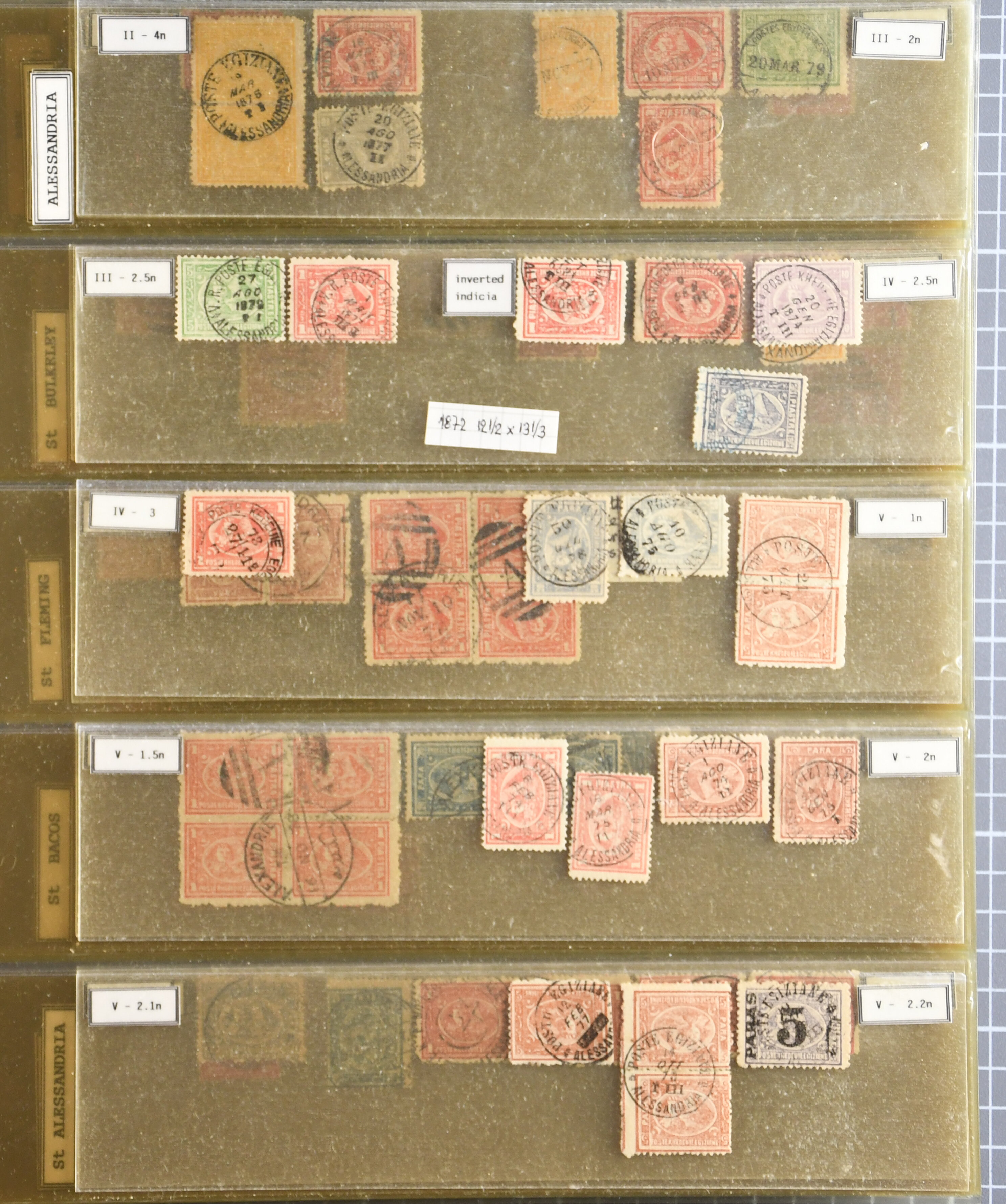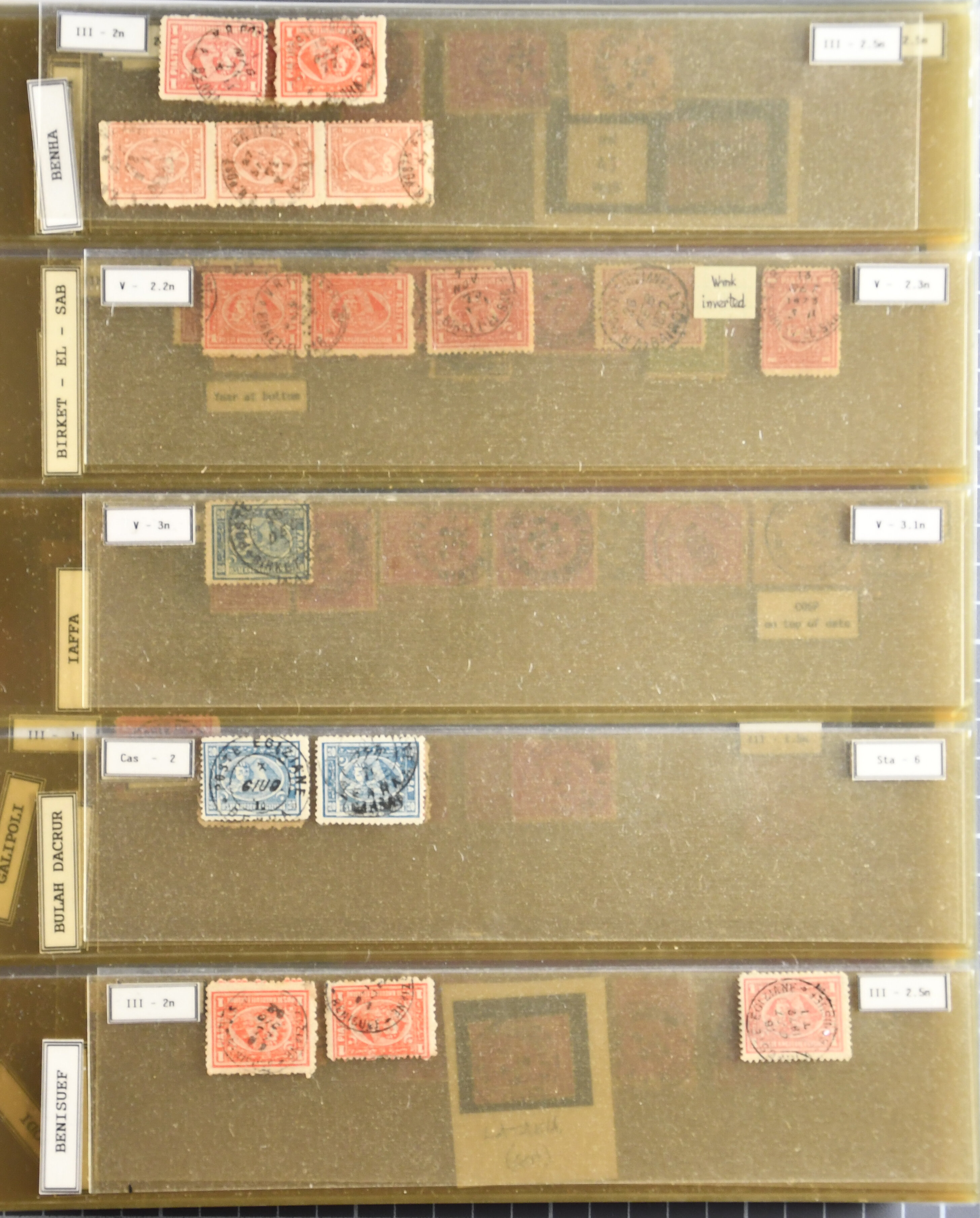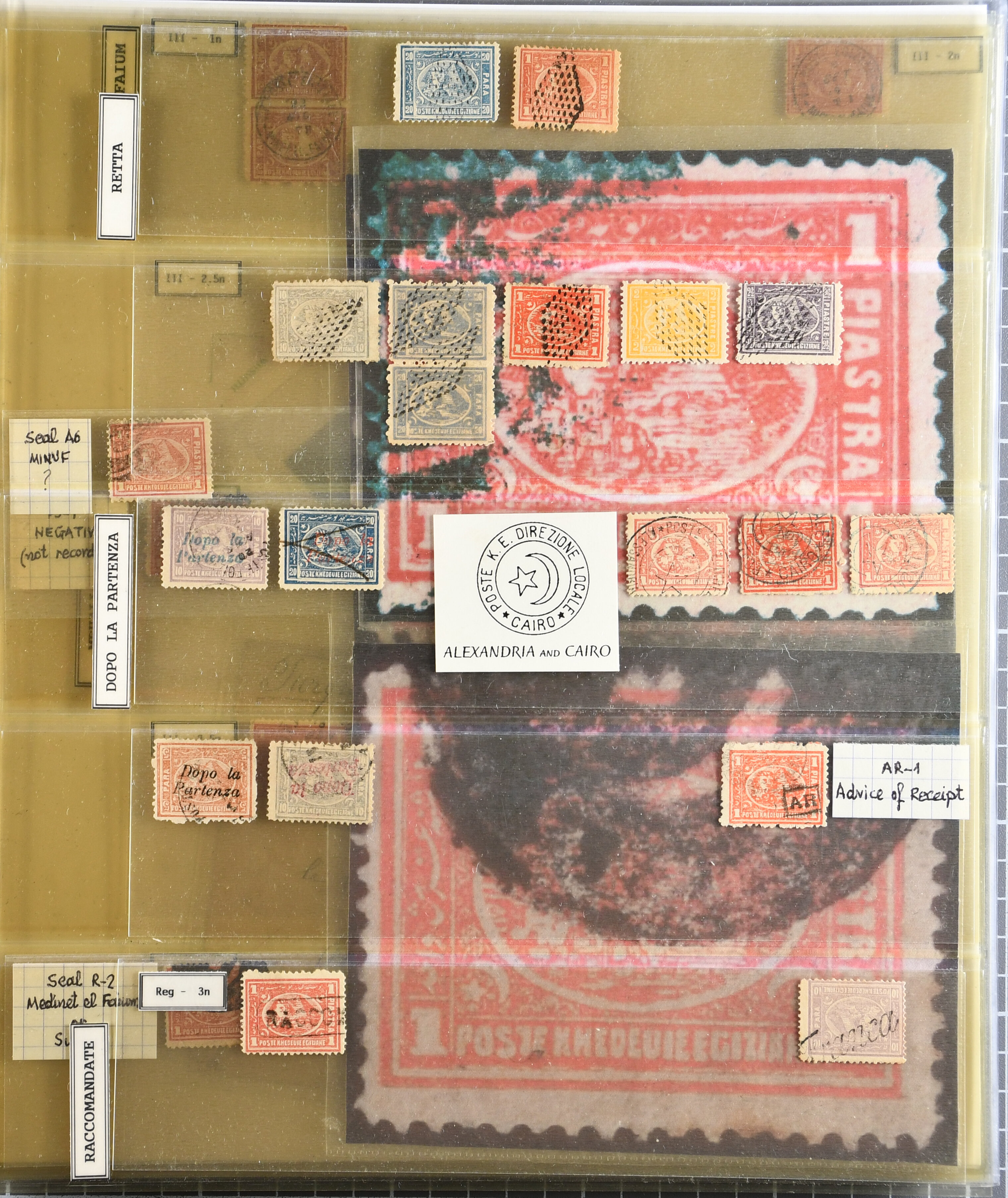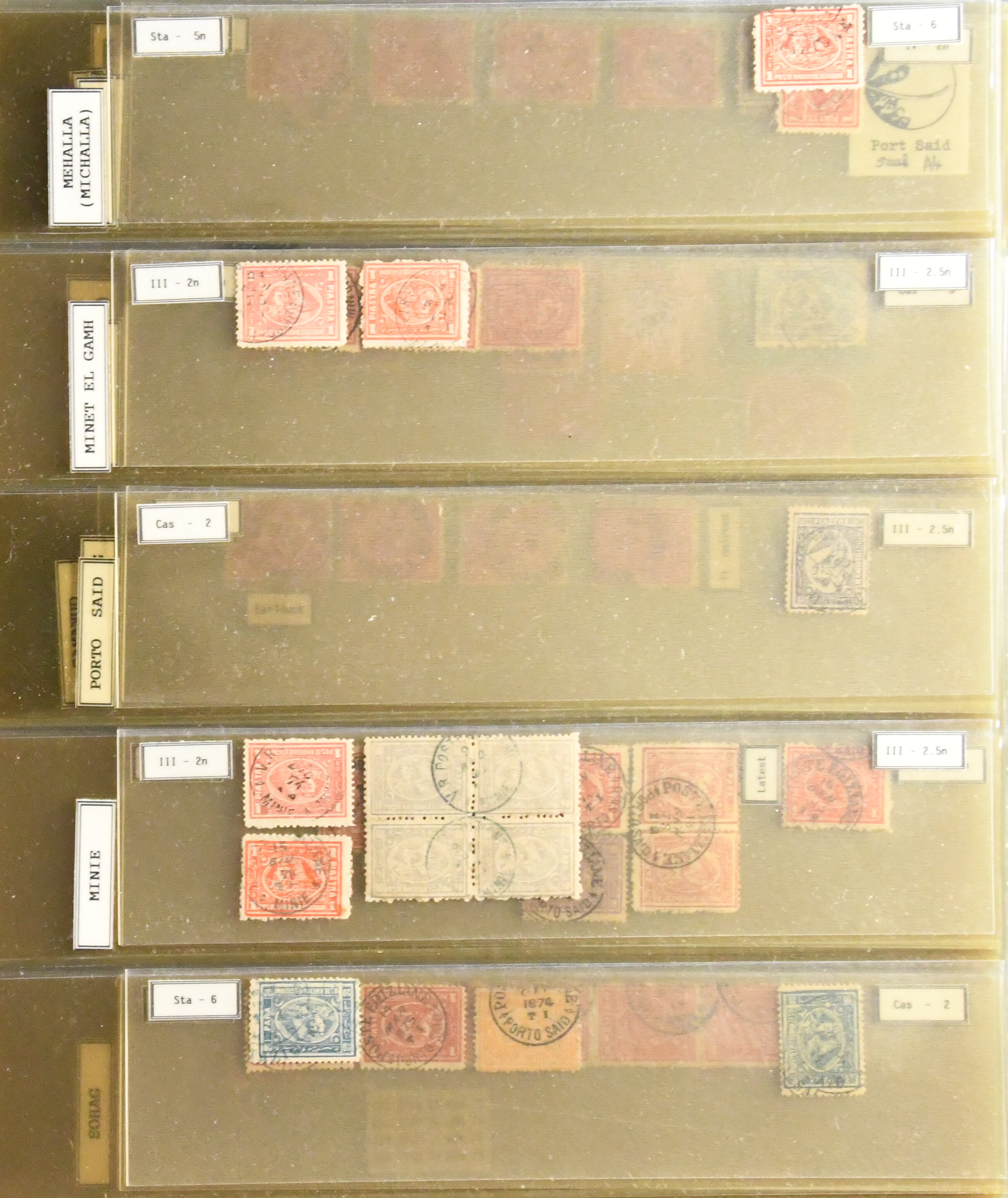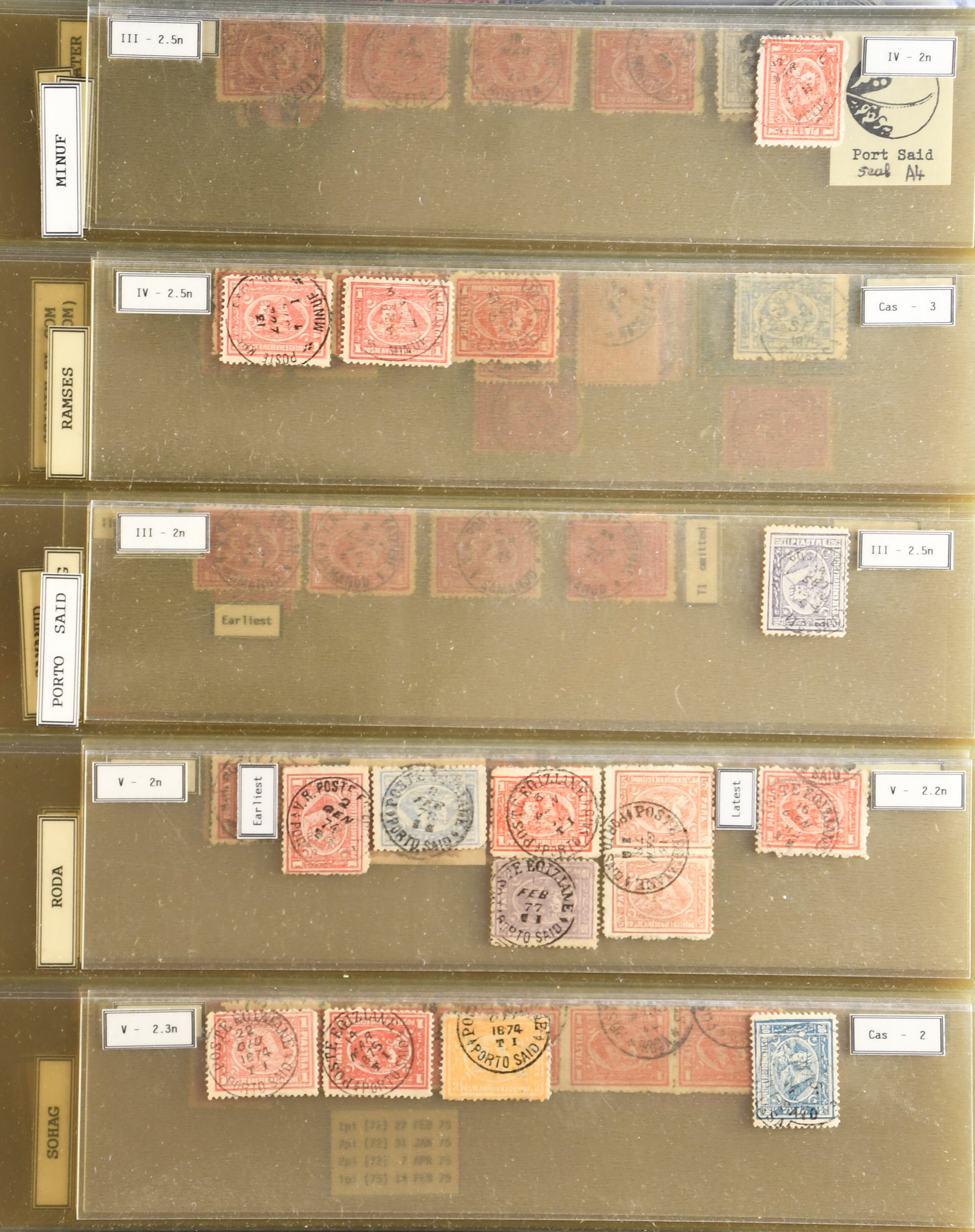 1100 image1867/75: Penasson & Bulâq, the extraordinary cancellation study on the issues with all values represented, from Alexandria incl. 1874 5 pa. tête-bêche pairs (3), 1 pi. red in blocks of four; rare Mailboat "ALES / UFIZIO NATANTE" cds's on 20 pa. and 1 pi. (2); rare "ST. BULKELEY", ST. BACOS and ST. SCHUTZ mostly on 1 pi., Cairo with "Ambulante / Cairo - Ales" cds's on 5 pa. and 1 pi., "Cairo / Stazione" on 5 pa. brown tête-bêche pair; rare ABE star and crescent (3), range of cancels from ABU HOMUS, ASSOUAN incl. a cover, ATFE, BENHA, BENI SUEF, rare BILBES usage, BIRKET EL SAB, rare BULAH DACRUR (2), DAMANHOUR, DAMIATA, DESUK, fine arabic dated ESNA range, FESCNE, rare GAALIUB on 1 pi., GHERGA, rare GHISA on 5 pa. tête-bêche block of four, HELOUAN, ISMAILIA, KAFR DAUAR, KAFR ZAYAT, KENA incl. a cover, LUXOR arabic dated range, MAGAGA, MAHALLET ROH, MANFALOUT, MANSURA, MELLAUI, MEDINET EL FAIUM, MEHALLA, MINET EL GAMH, MINIE on 10 pa.grey block of four, MINUF, PORT SAID, RAMSES, RODA, ROSETTA, SAMANUD, SCIBIN EL ANATEUR, SCIBIN EL KOM, SOHAG arabic dated range, SIUT incl. a cover, SUEZ, TEH EL BAROUD, TANTA, rare TOOH with four examples, TEH EL KIBIR, ZAGASIK, ZEFTA; and Station postmnarks, rettas, registration cancels etc., used abroad with 1 pi. used in BARBAR, KARTUM usages, 1 pi. block of four used in KASSALA, fine groups from GEDDA (incl. rare 1867 5 pi. usage) and MASSAWA, SUAKIM in black and in blue, BAIROUT with superb 1872 5 pa. and others, superb CAVALLA (3, one with Hass cert.), large range of CONSTANTINOPLE, GALLIPOLI incl. magnificent strike on 1872 1 pi., LATAKIA on 1867 1 pi. (cert. Hass), 2 pi. yellow used in TRIPOLI, superb group (10) from METELINO incl. 1867 1 pi. used with "Medilli" seal in black; 20 pa. grey-blue in a strip of three, rare RODI cds's (4), SCIO incl. a cover used with 1875/75 20 pa. and 1 pi., DARDANELLI, SMIRNE incl. a cover used with 1875/75 20 pa. and 1 pi., VOLO with 1867 1 pi. red with central datestamp etc. A delightful study (438 items and 17 covers). (Image 1) (Image 2) (Image 3) (Image 4) (Image 5) (Image 6) (Image 7) (Image 8) (Image 9) (Image 10) (Image 11) (Image 12) (Image 13) (Image 14) (Image 15) (Image 16) (Image 17) (Image 18) (Image 19) (Image 20) (Image 21) (Image 22) (Image 23) (Image 24) (Image 25) (Image 26) (Image 27) (Image 28) (Image 29) (Image 30) (Image 31) (Image 32) (Image 33) (Image 34) (Image 35) (Image 36) (Image 37) (Image 38) (Image 39) (Image 40) (Image 41) (Image 42) (Image 43) (Image 44) (Image 45) (Image 46) (Image 47) (Image 48) (Image 49) (Image 50)