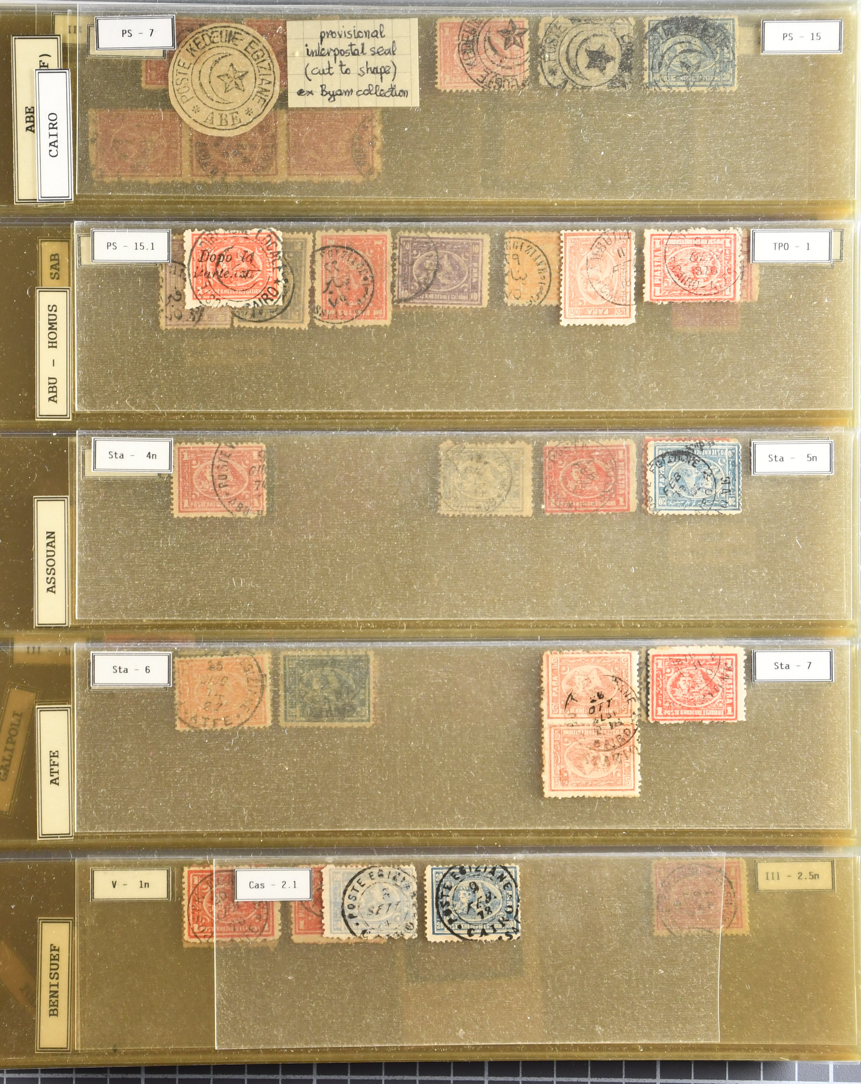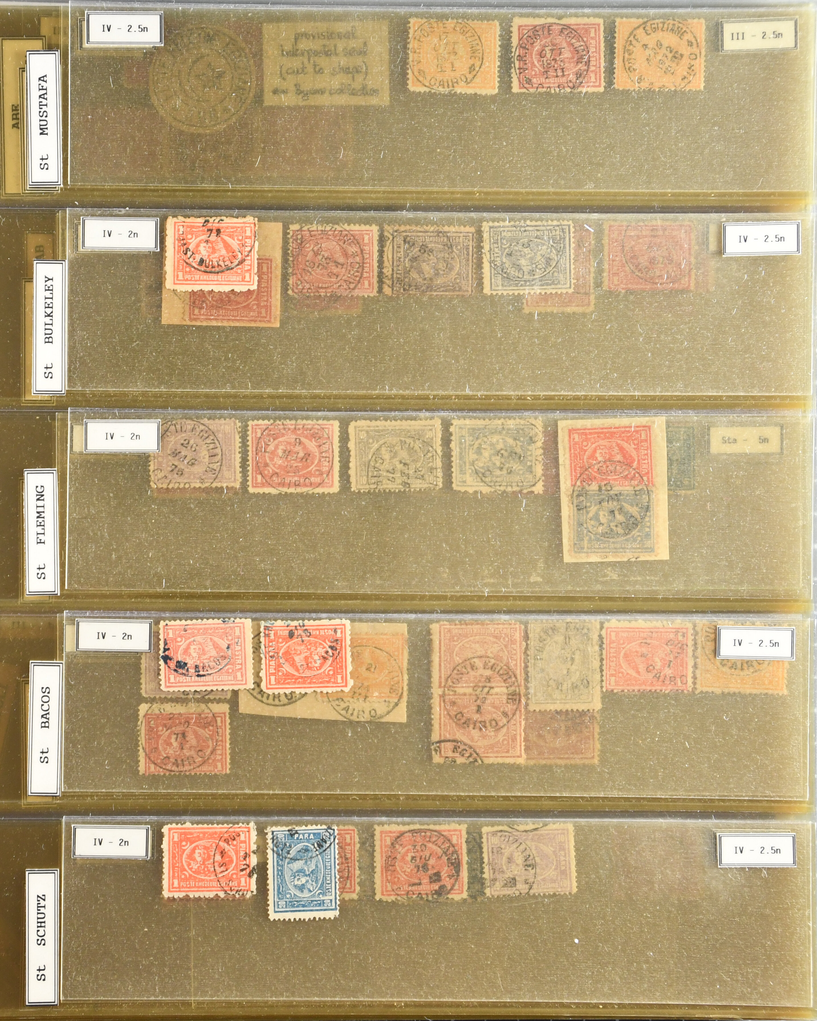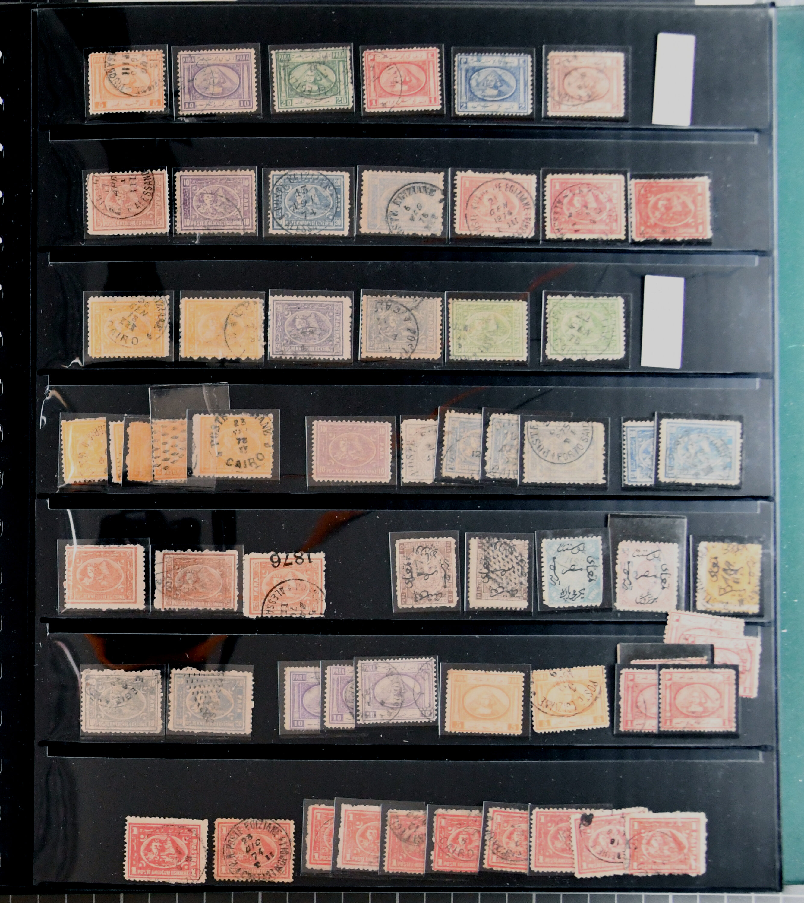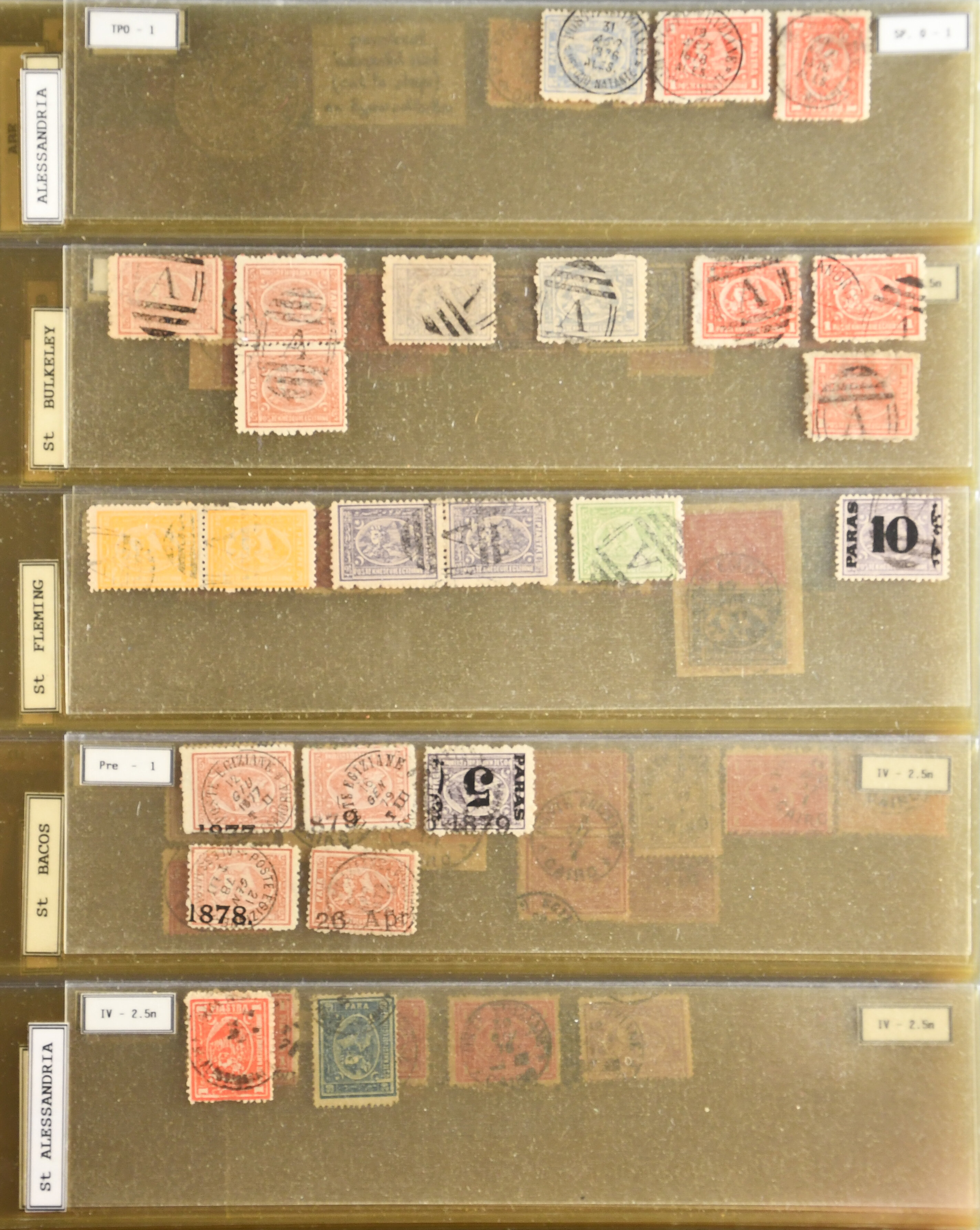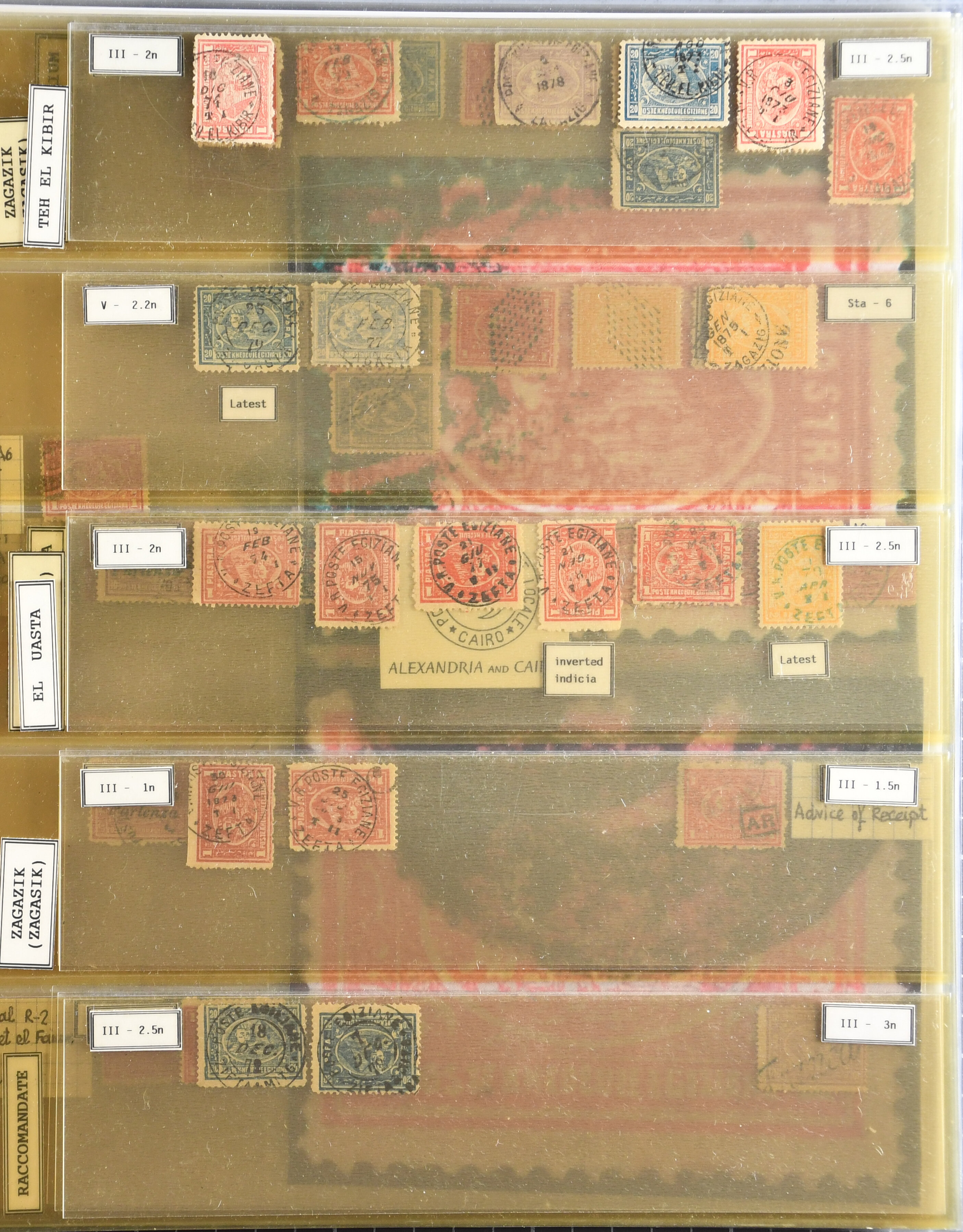 1100 image1867/75: Penasson & Bulâq, the extraordinary cancellation study on the issues with all values represented, from Alexandria incl. 1874 5 pa. tête-bêche pairs (3), 1 pi. red in blocks of four; rare Mailboat "ALES / UFIZIO NATANTE" cds's on 20 pa. and 1 pi. (2); rare "ST. BULKELEY", ST. BACOS and ST. SCHUTZ mostly on 1 pi., Cairo with "Ambulante / Cairo - Ales" cds's on 5 pa. and 1 pi., "Cairo / Stazione" on 5 pa. brown tête-bêche pair; rare ABE star and crescent (3), range of cancels from ABU HOMUS, ASSOUAN incl. a cover, ATFE, BENHA, BENI SUEF, rare BILBES usage, BIRKET EL SAB, rare BULAH DACRUR (2), DAMANHOUR, DAMIATA, DESUK, fine arabic dated ESNA range, FESCNE, rare GAALIUB on 1 pi., GHERGA, rare GHISA on 5 pa. tête-bêche block of four, HELOUAN, ISMAILIA, KAFR DAUAR, KAFR ZAYAT, KENA incl. a cover, LUXOR arabic dated range, MAGAGA, MAHALLET ROH, MANFALOUT, MANSURA, MELLAUI, MEDINET EL FAIUM, MEHALLA, MINET EL GAMH, MINIE on 10 pa.grey block of four, MINUF, PORT SAID, RAMSES, RODA, ROSETTA, SAMANUD, SCIBIN EL ANATEUR, SCIBIN EL KOM, SOHAG arabic dated range, SIUT incl. a cover, SUEZ, TEH EL BAROUD, TANTA, rare TOOH with four examples, TEH EL KIBIR, ZAGASIK, ZEFTA; and Station postmnarks, rettas, registration cancels etc., used abroad with 1 pi. used in BARBAR, KARTUM usages, 1 pi. block of four used in KASSALA, fine groups from GEDDA (incl. rare 1867 5 pi. usage) and MASSAWA, SUAKIM in black and in blue, BAIROUT with superb 1872 5 pa. and others, superb CAVALLA (3, one with Hass cert.), large range of CONSTANTINOPLE, GALLIPOLI incl. magnificent strike on 1872 1 pi., LATAKIA on 1867 1 pi. (cert. Hass), 2 pi. yellow used in TRIPOLI, superb group (10) from METELINO incl. 1867 1 pi. used with "Medilli" seal in black; 20 pa. grey-blue in a strip of three, rare RODI cds's (4), SCIO incl. a cover used with 1875/75 20 pa. and 1 pi., DARDANELLI, SMIRNE incl. a cover used with 1875/75 20 pa. and 1 pi., VOLO with 1867 1 pi. red with central datestamp etc. A delightful study (438 items and 17 covers). (Image 1) (Image 2) (Image 3) (Image 4) (Image 5) (Image 6) (Image 7) (Image 8) (Image 9) (Image 10) (Image 11) (Image 12) (Image 13) (Image 14) (Image 15) (Image 16) (Image 17) (Image 18) (Image 19) (Image 20) (Image 21) (Image 22) (Image 23) (Image 24) (Image 25) (Image 26) (Image 27) (Image 28) (Image 29) (Image 30) (Image 31) (Image 32) (Image 33) (Image 34) (Image 35) (Image 36) (Image 37) (Image 38) (Image 39) (Image 40) (Image 41) (Image 42) (Image 43) (Image 44) (Image 45) (Image 46) (Image 47) (Image 48) (Image 49) (Image 50)