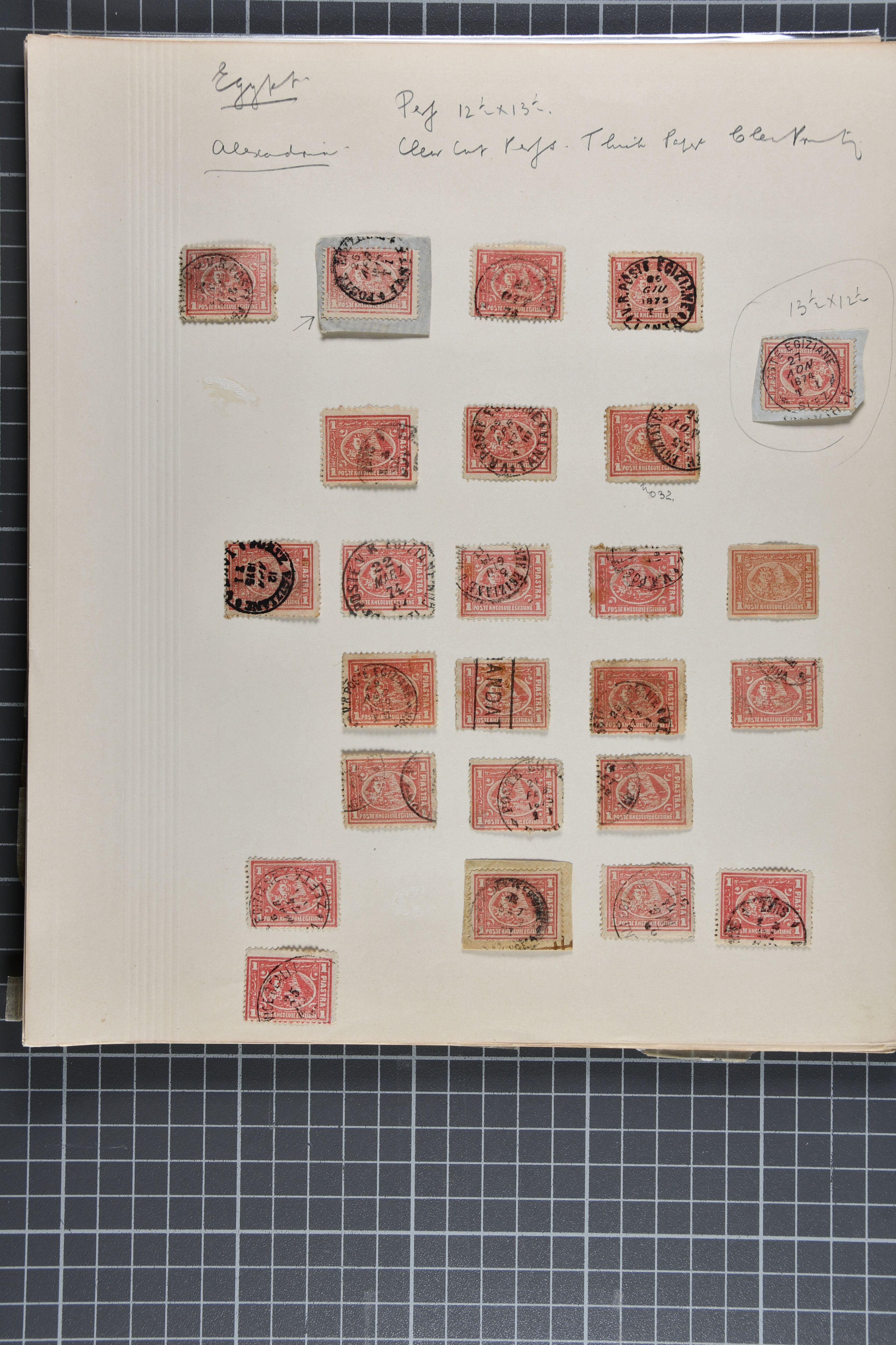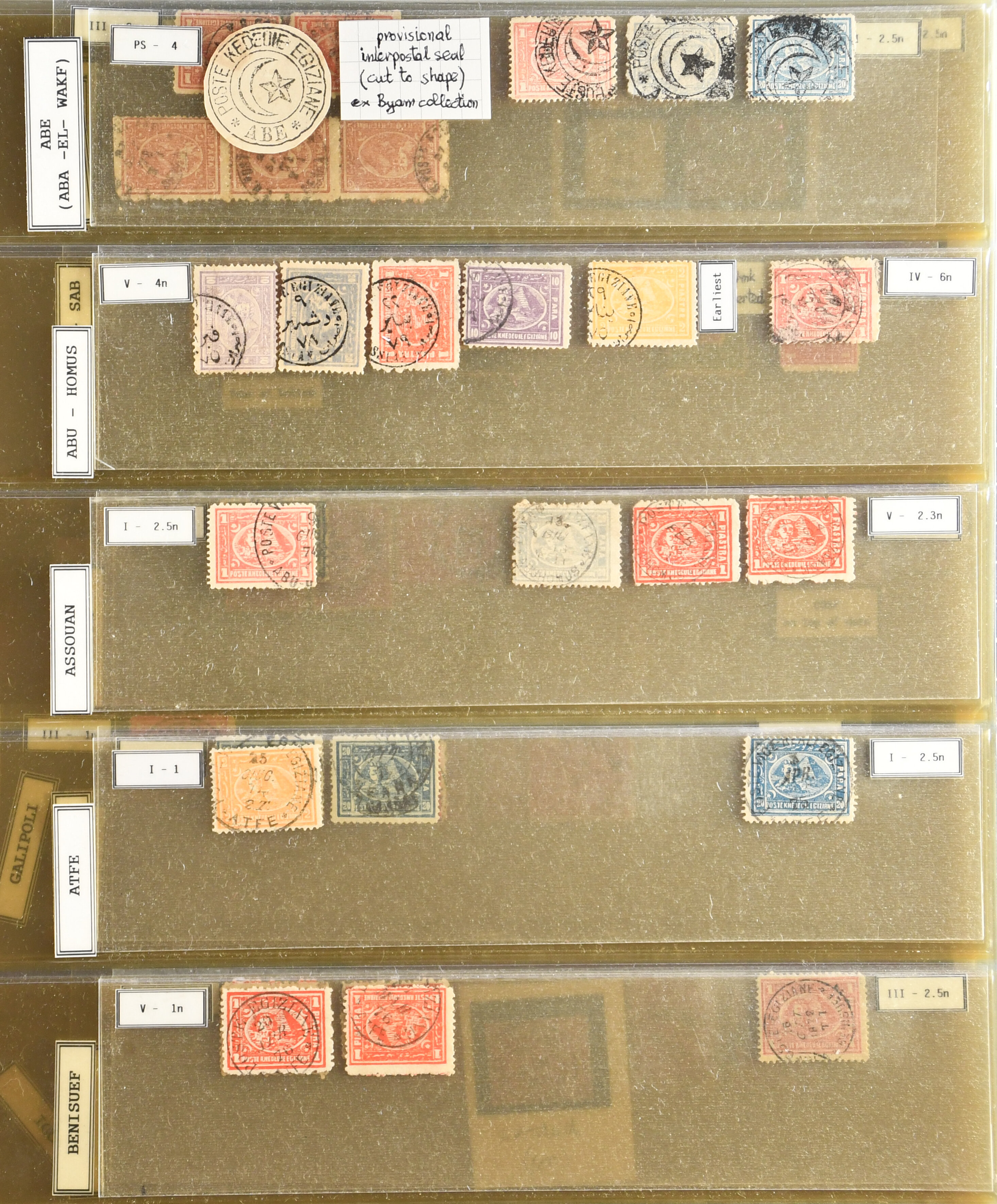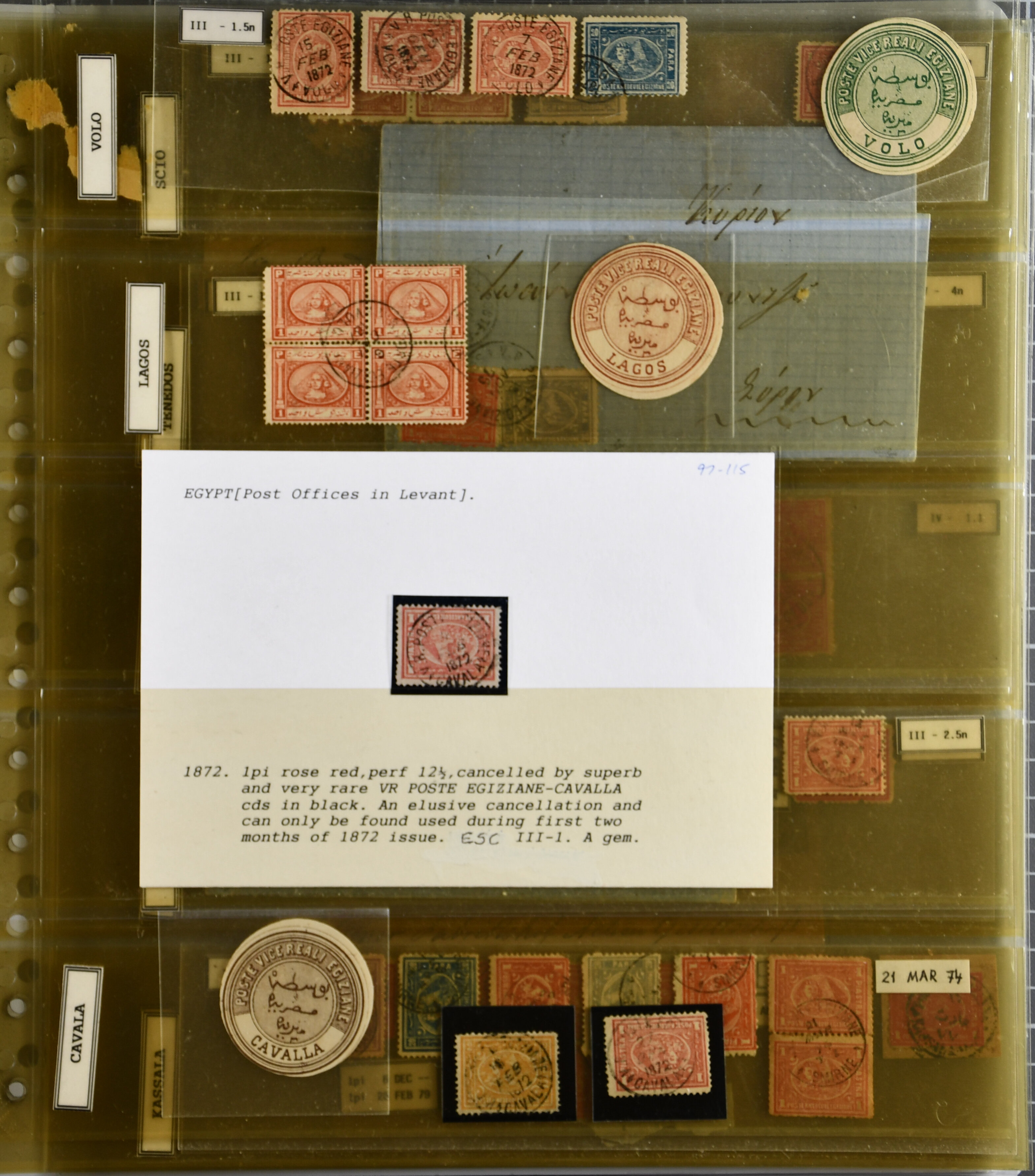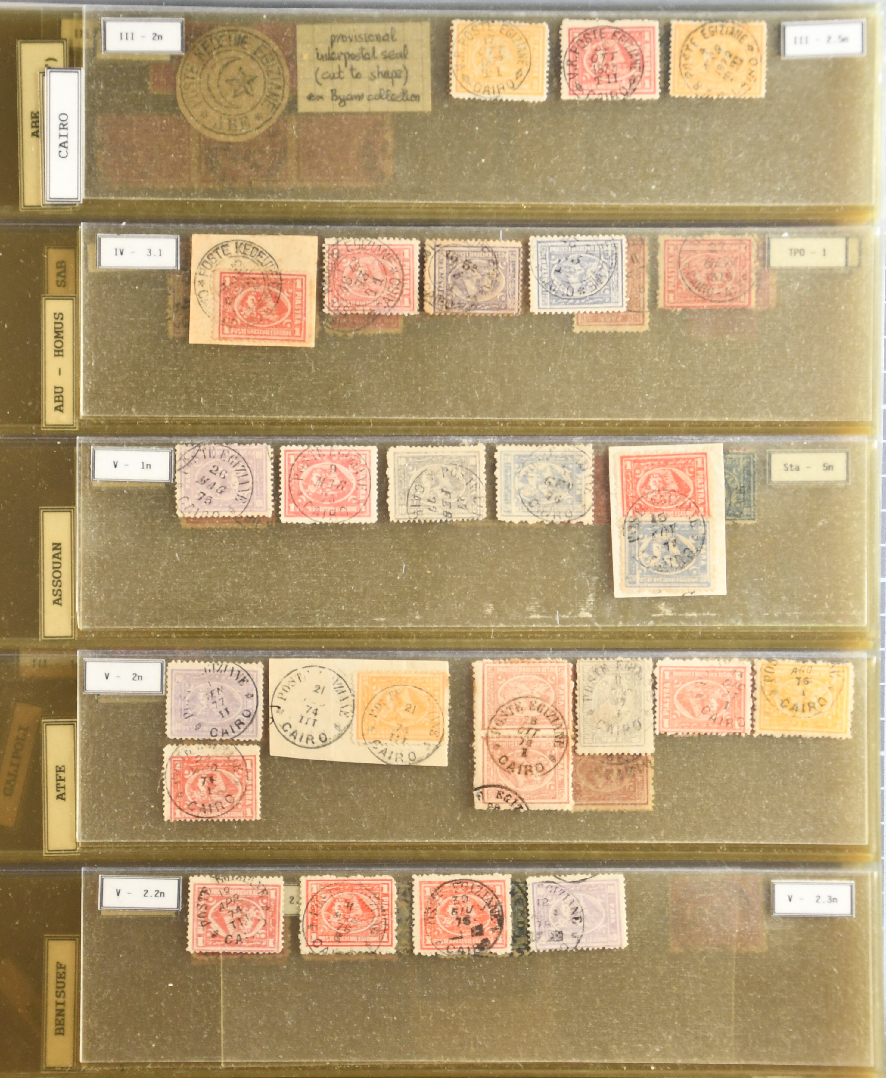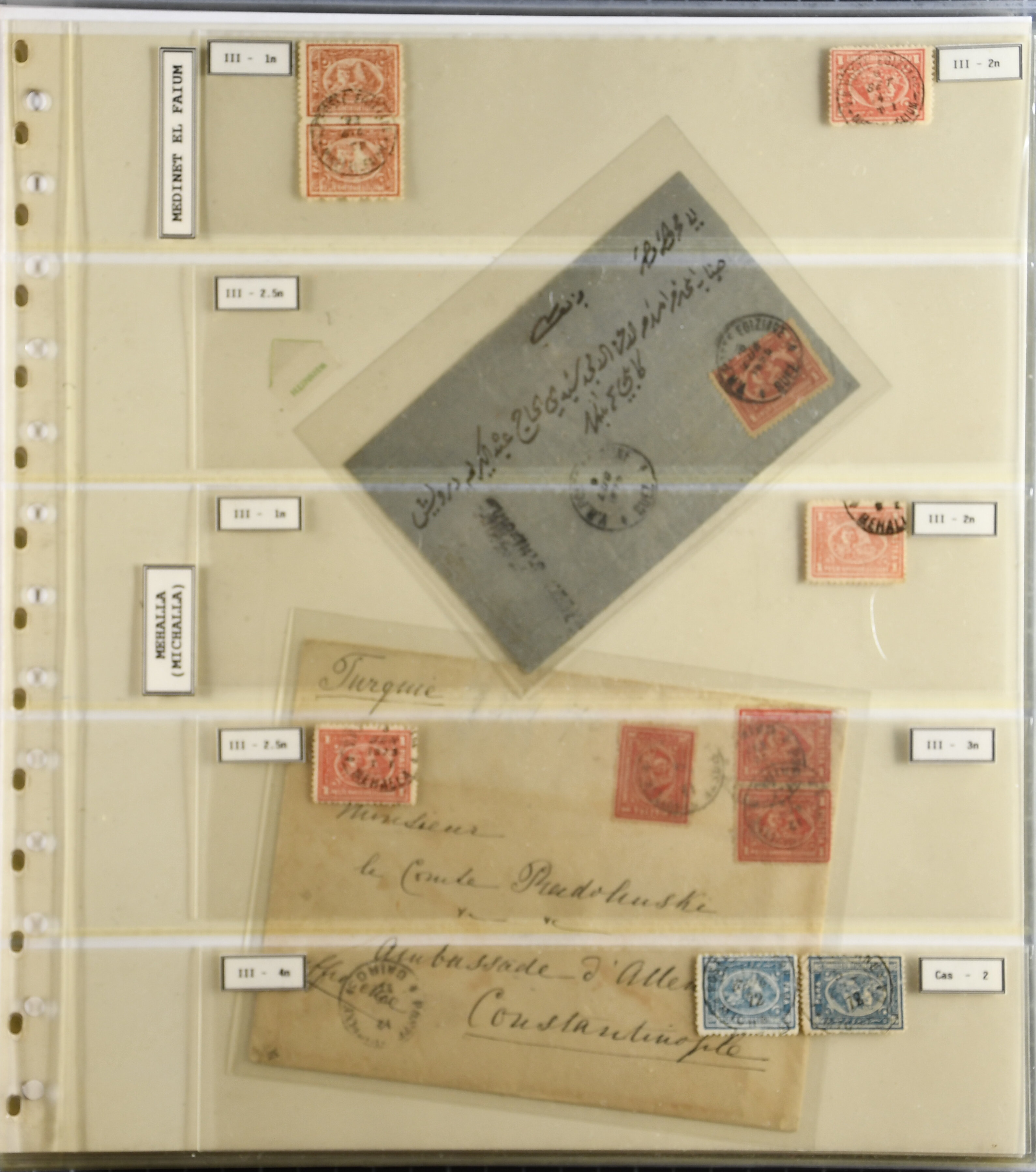 1100 image1867/75: Penasson & Bulâq, the extraordinary cancellation study on the issues with all values represented, from Alexandria incl. 1874 5 pa. tête-bêche pairs (3), 1 pi. red in blocks of four; rare Mailboat "ALES / UFIZIO NATANTE" cds's on 20 pa. and 1 pi. (2); rare "ST. BULKELEY", ST. BACOS and ST. SCHUTZ mostly on 1 pi., Cairo with "Ambulante / Cairo - Ales" cds's on 5 pa. and 1 pi., "Cairo / Stazione" on 5 pa. brown tête-bêche pair; rare ABE star and crescent (3), range of cancels from ABU HOMUS, ASSOUAN incl. a cover, ATFE, BENHA, BENI SUEF, rare BILBES usage, BIRKET EL SAB, rare BULAH DACRUR (2), DAMANHOUR, DAMIATA, DESUK, fine arabic dated ESNA range, FESCNE, rare GAALIUB on 1 pi., GHERGA, rare GHISA on 5 pa. tête-bêche block of four, HELOUAN, ISMAILIA, KAFR DAUAR, KAFR ZAYAT, KENA incl. a cover, LUXOR arabic dated range, MAGAGA, MAHALLET ROH, MANFALOUT, MANSURA, MELLAUI, MEDINET EL FAIUM, MEHALLA, MINET EL GAMH, MINIE on 10 pa.grey block of four, MINUF, PORT SAID, RAMSES, RODA, ROSETTA, SAMANUD, SCIBIN EL ANATEUR, SCIBIN EL KOM, SOHAG arabic dated range, SIUT incl. a cover, SUEZ, TEH EL BAROUD, TANTA, rare TOOH with four examples, TEH EL KIBIR, ZAGASIK, ZEFTA; and Station postmnarks, rettas, registration cancels etc., used abroad with 1 pi. used in BARBAR, KARTUM usages, 1 pi. block of four used in KASSALA, fine groups from GEDDA (incl. rare 1867 5 pi. usage) and MASSAWA, SUAKIM in black and in blue, BAIROUT with superb 1872 5 pa. and others, superb CAVALLA (3, one with Hass cert.), large range of CONSTANTINOPLE, GALLIPOLI incl. magnificent strike on 1872 1 pi., LATAKIA on 1867 1 pi. (cert. Hass), 2 pi. yellow used in TRIPOLI, superb group (10) from METELINO incl. 1867 1 pi. used with "Medilli" seal in black; 20 pa. grey-blue in a strip of three, rare RODI cds's (4), SCIO incl. a cover used with 1875/75 20 pa. and 1 pi., DARDANELLI, SMIRNE incl. a cover used with 1875/75 20 pa. and 1 pi., VOLO with 1867 1 pi. red with central datestamp etc. A delightful study (438 items and 17 covers). (Image 1) (Image 2) (Image 3) (Image 4) (Image 5) (Image 6) (Image 7) (Image 8) (Image 9) (Image 10) (Image 11) (Image 12) (Image 13) (Image 14) (Image 15) (Image 16) (Image 17) (Image 18) (Image 19) (Image 20) (Image 21) (Image 22) (Image 23) (Image 24) (Image 25) (Image 26) (Image 27) (Image 28) (Image 29) (Image 30) (Image 31) (Image 32) (Image 33) (Image 34) (Image 35) (Image 36) (Image 37) (Image 38) (Image 39) (Image 40) (Image 41) (Image 42) (Image 43) (Image 44) (Image 45) (Image 46) (Image 47) (Image 48) (Image 49) (Image 50)