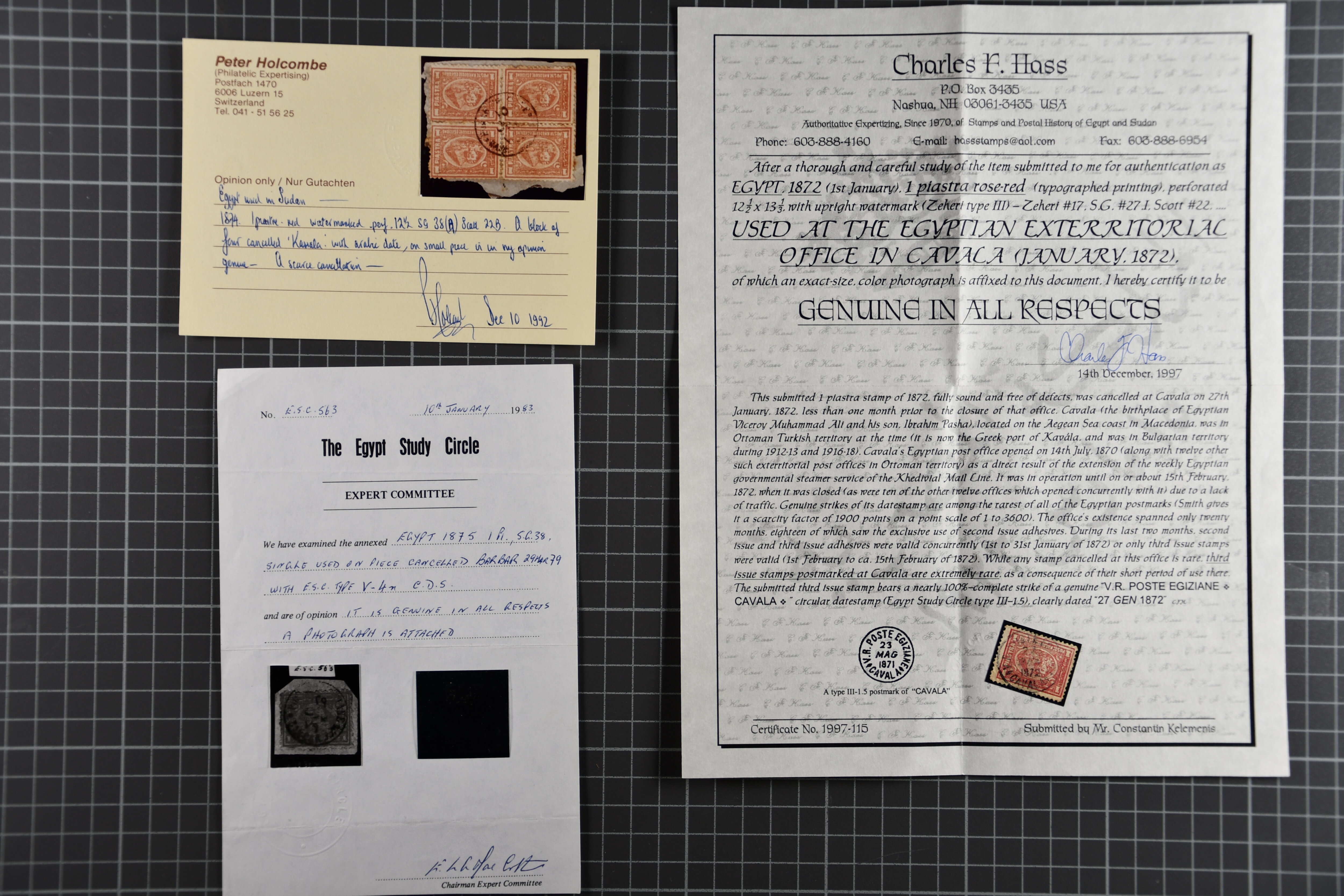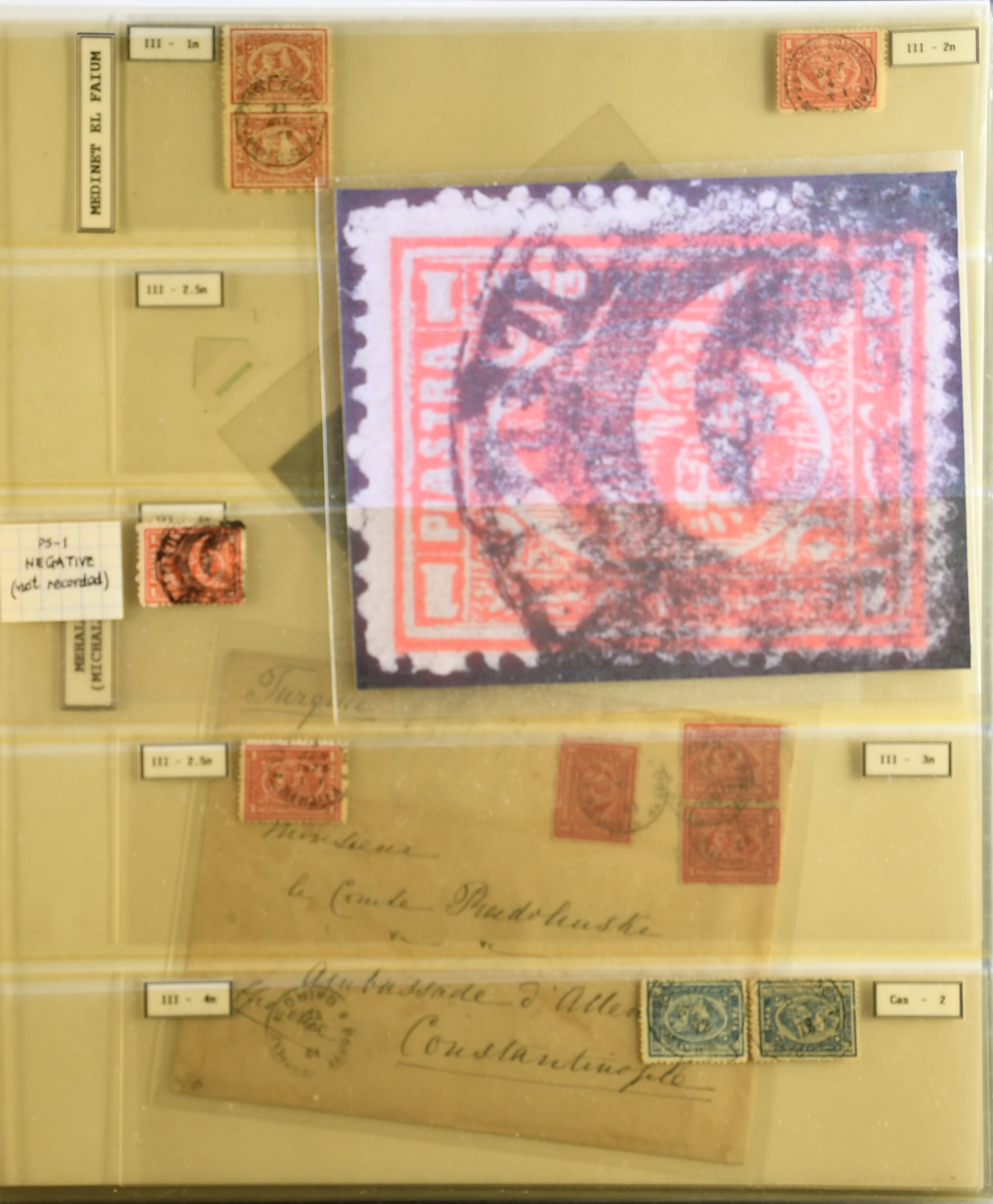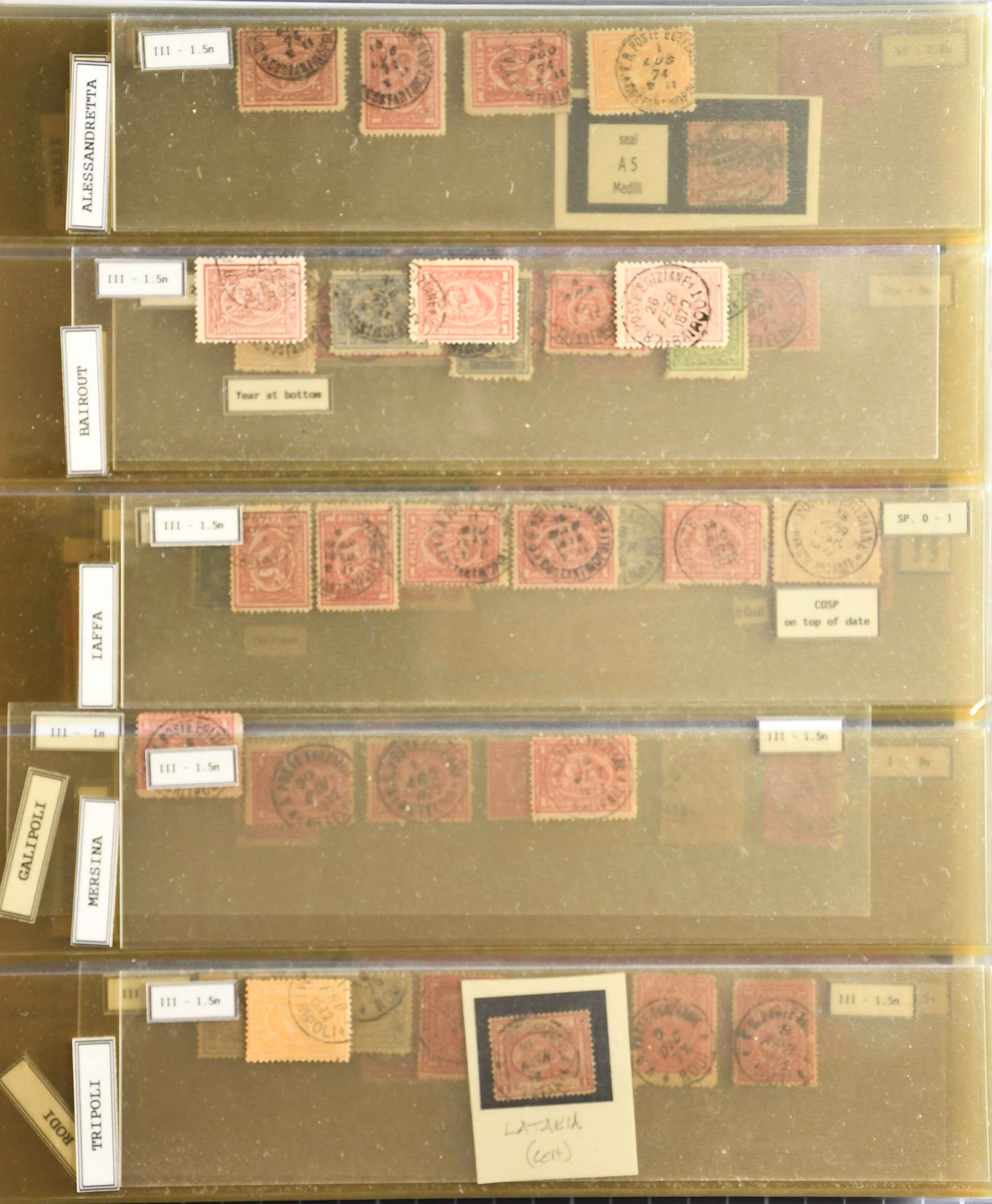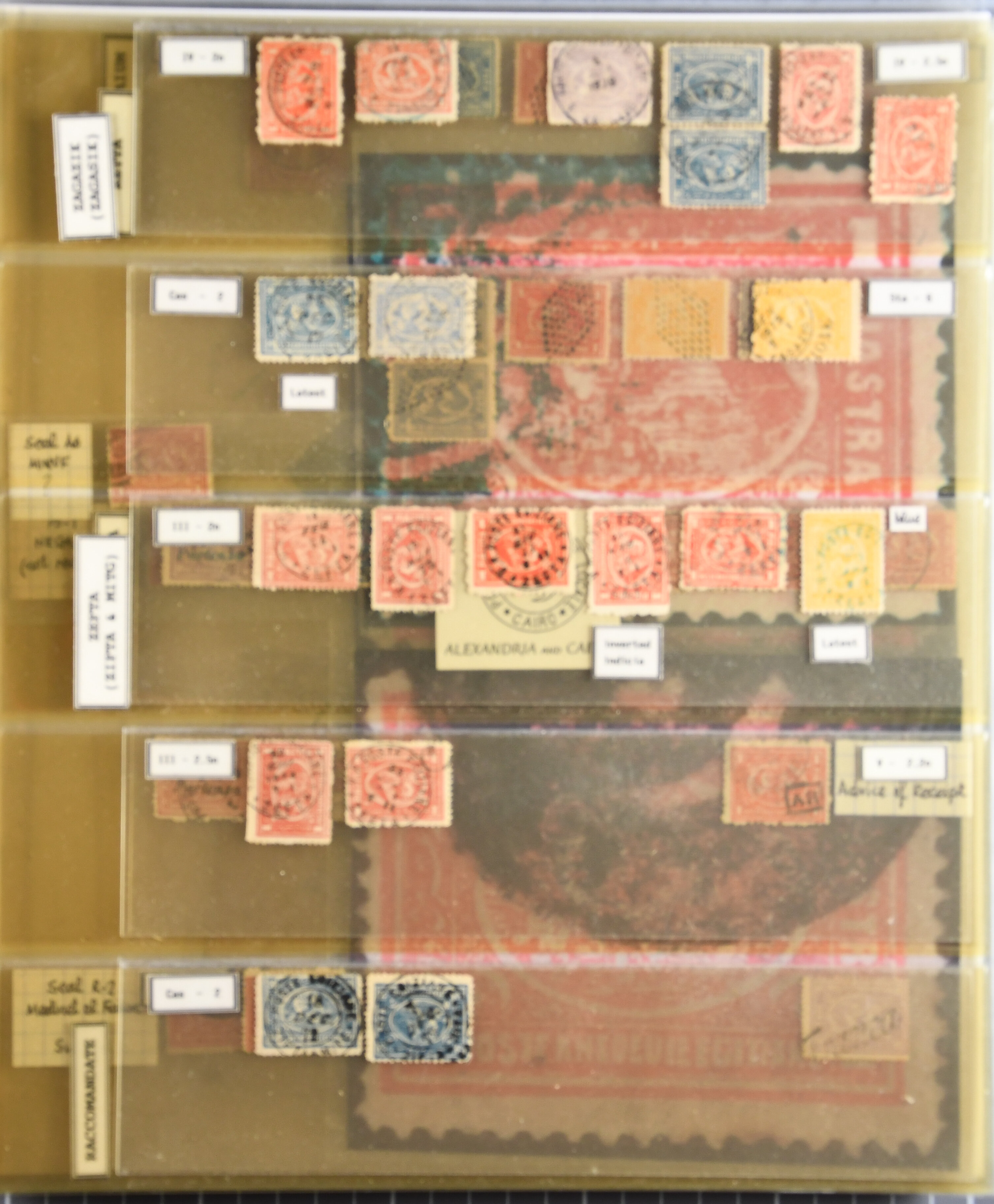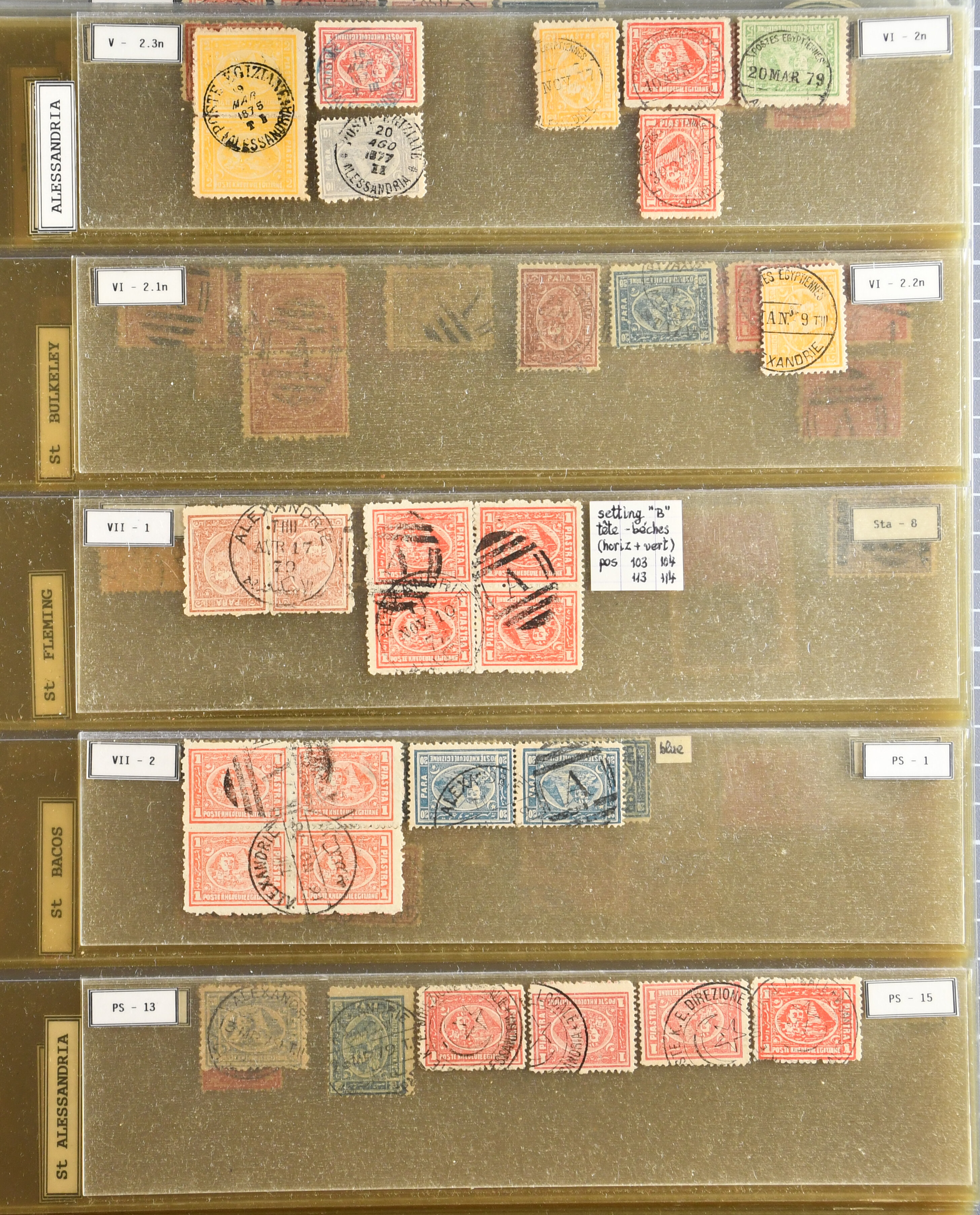 1100 image1867/75: Penasson & Bulâq, the extraordinary cancellation study on the issues with all values represented, from Alexandria incl. 1874 5 pa. tête-bêche pairs (3), 1 pi. red in blocks of four; rare Mailboat "ALES / UFIZIO NATANTE" cds's on 20 pa. and 1 pi. (2); rare "ST. BULKELEY", ST. BACOS and ST. SCHUTZ mostly on 1 pi., Cairo with "Ambulante / Cairo - Ales" cds's on 5 pa. and 1 pi., "Cairo / Stazione" on 5 pa. brown tête-bêche pair; rare ABE star and crescent (3), range of cancels from ABU HOMUS, ASSOUAN incl. a cover, ATFE, BENHA, BENI SUEF, rare BILBES usage, BIRKET EL SAB, rare BULAH DACRUR (2), DAMANHOUR, DAMIATA, DESUK, fine arabic dated ESNA range, FESCNE, rare GAALIUB on 1 pi., GHERGA, rare GHISA on 5 pa. tête-bêche block of four, HELOUAN, ISMAILIA, KAFR DAUAR, KAFR ZAYAT, KENA incl. a cover, LUXOR arabic dated range, MAGAGA, MAHALLET ROH, MANFALOUT, MANSURA, MELLAUI, MEDINET EL FAIUM, MEHALLA, MINET EL GAMH, MINIE on 10 pa.grey block of four, MINUF, PORT SAID, RAMSES, RODA, ROSETTA, SAMANUD, SCIBIN EL ANATEUR, SCIBIN EL KOM, SOHAG arabic dated range, SIUT incl. a cover, SUEZ, TEH EL BAROUD, TANTA, rare TOOH with four examples, TEH EL KIBIR, ZAGASIK, ZEFTA; and Station postmnarks, rettas, registration cancels etc., used abroad with 1 pi. used in BARBAR, KARTUM usages, 1 pi. block of four used in KASSALA, fine groups from GEDDA (incl. rare 1867 5 pi. usage) and MASSAWA, SUAKIM in black and in blue, BAIROUT with superb 1872 5 pa. and others, superb CAVALLA (3, one with Hass cert.), large range of CONSTANTINOPLE, GALLIPOLI incl. magnificent strike on 1872 1 pi., LATAKIA on 1867 1 pi. (cert. Hass), 2 pi. yellow used in TRIPOLI, superb group (10) from METELINO incl. 1867 1 pi. used with "Medilli" seal in black; 20 pa. grey-blue in a strip of three, rare RODI cds's (4), SCIO incl. a cover used with 1875/75 20 pa. and 1 pi., DARDANELLI, SMIRNE incl. a cover used with 1875/75 20 pa. and 1 pi., VOLO with 1867 1 pi. red with central datestamp etc. A delightful study (438 items and 17 covers). (Image 1) (Image 2) (Image 3) (Image 4) (Image 5) (Image 6) (Image 7) (Image 8) (Image 9) (Image 10) (Image 11) (Image 12) (Image 13) (Image 14) (Image 15) (Image 16) (Image 17) (Image 18) (Image 19) (Image 20) (Image 21) (Image 22) (Image 23) (Image 24) (Image 25) (Image 26) (Image 27) (Image 28) (Image 29) (Image 30) (Image 31) (Image 32) (Image 33) (Image 34) (Image 35) (Image 36) (Image 37) (Image 38) (Image 39) (Image 40) (Image 41) (Image 42) (Image 43) (Image 44) (Image 45) (Image 46) (Image 47) (Image 48) (Image 49) (Image 50)