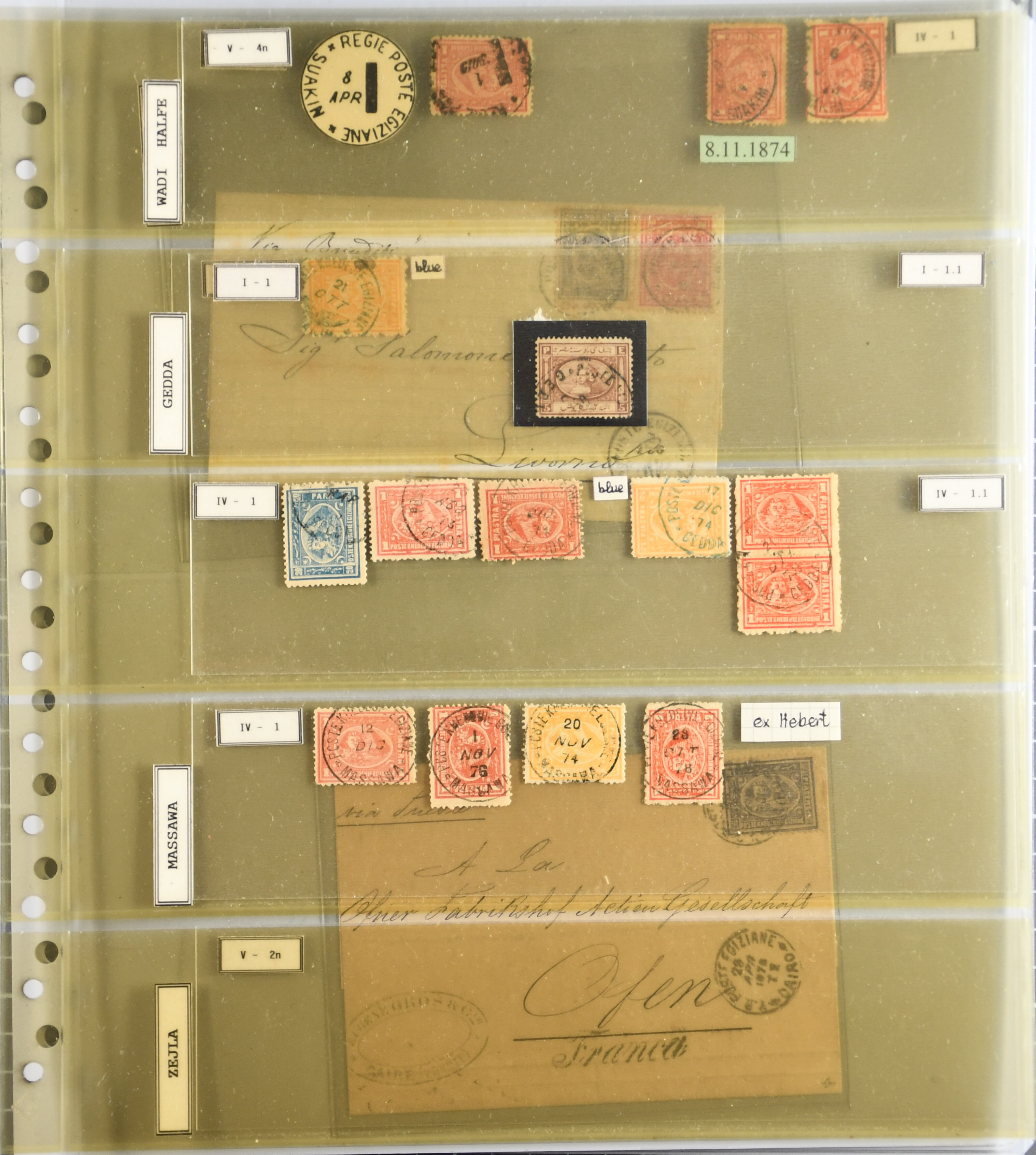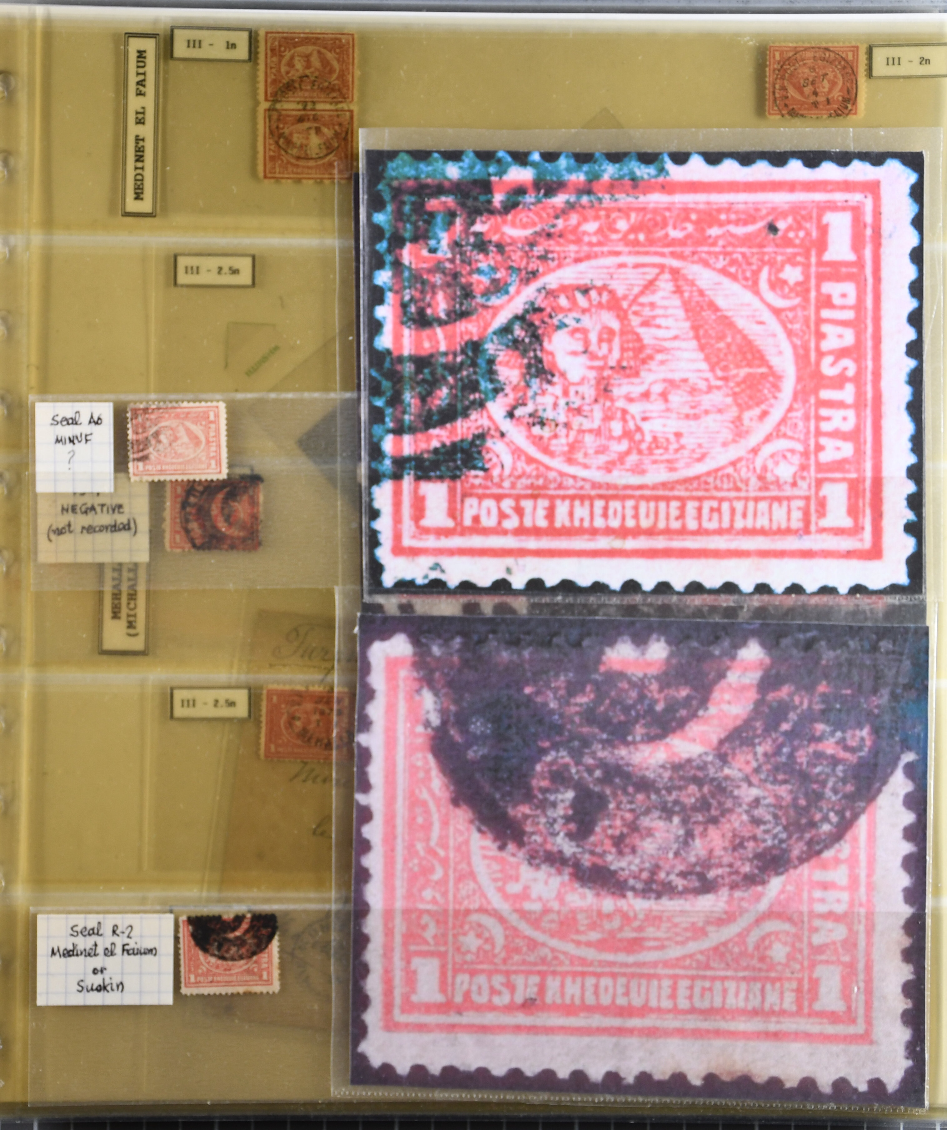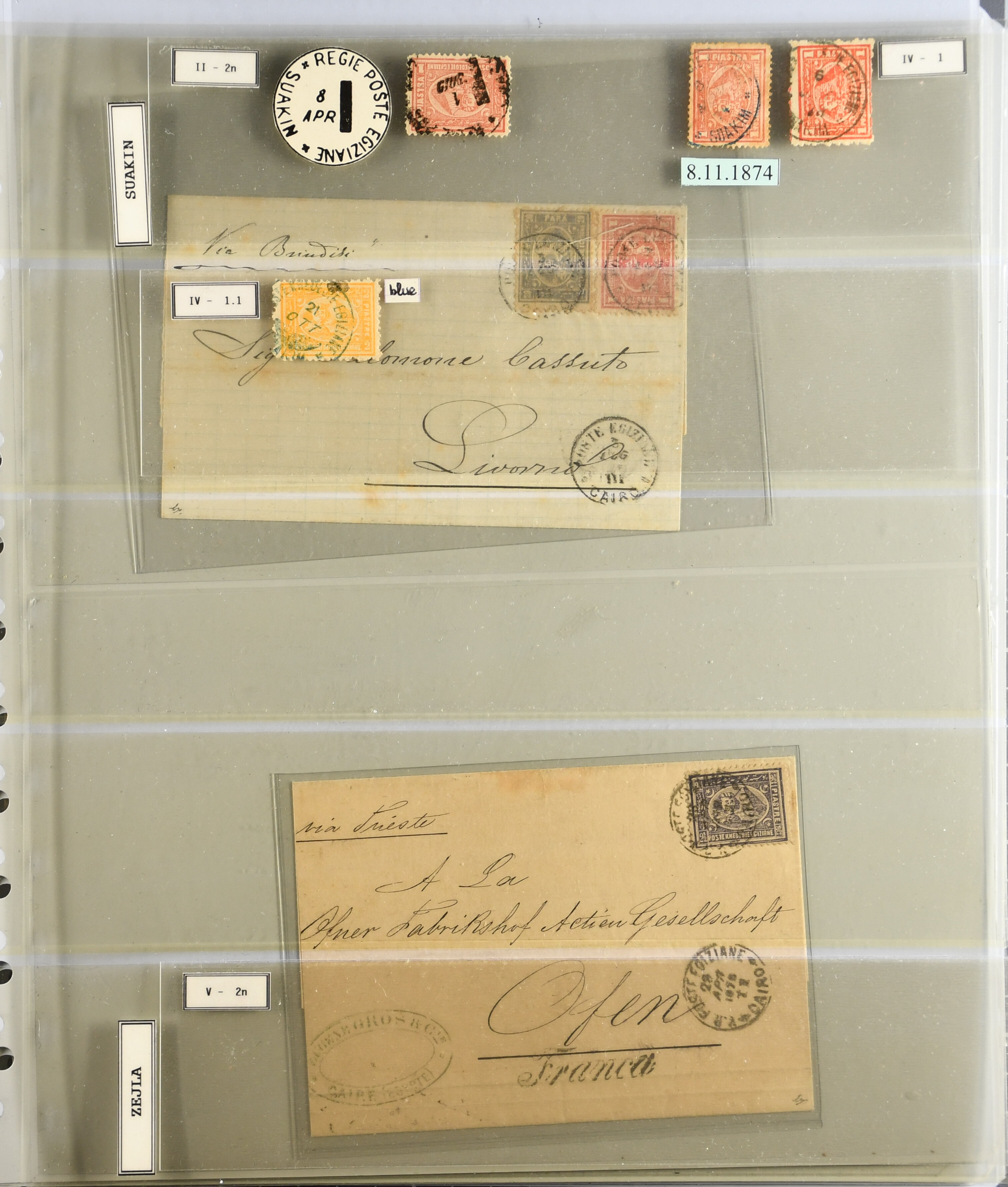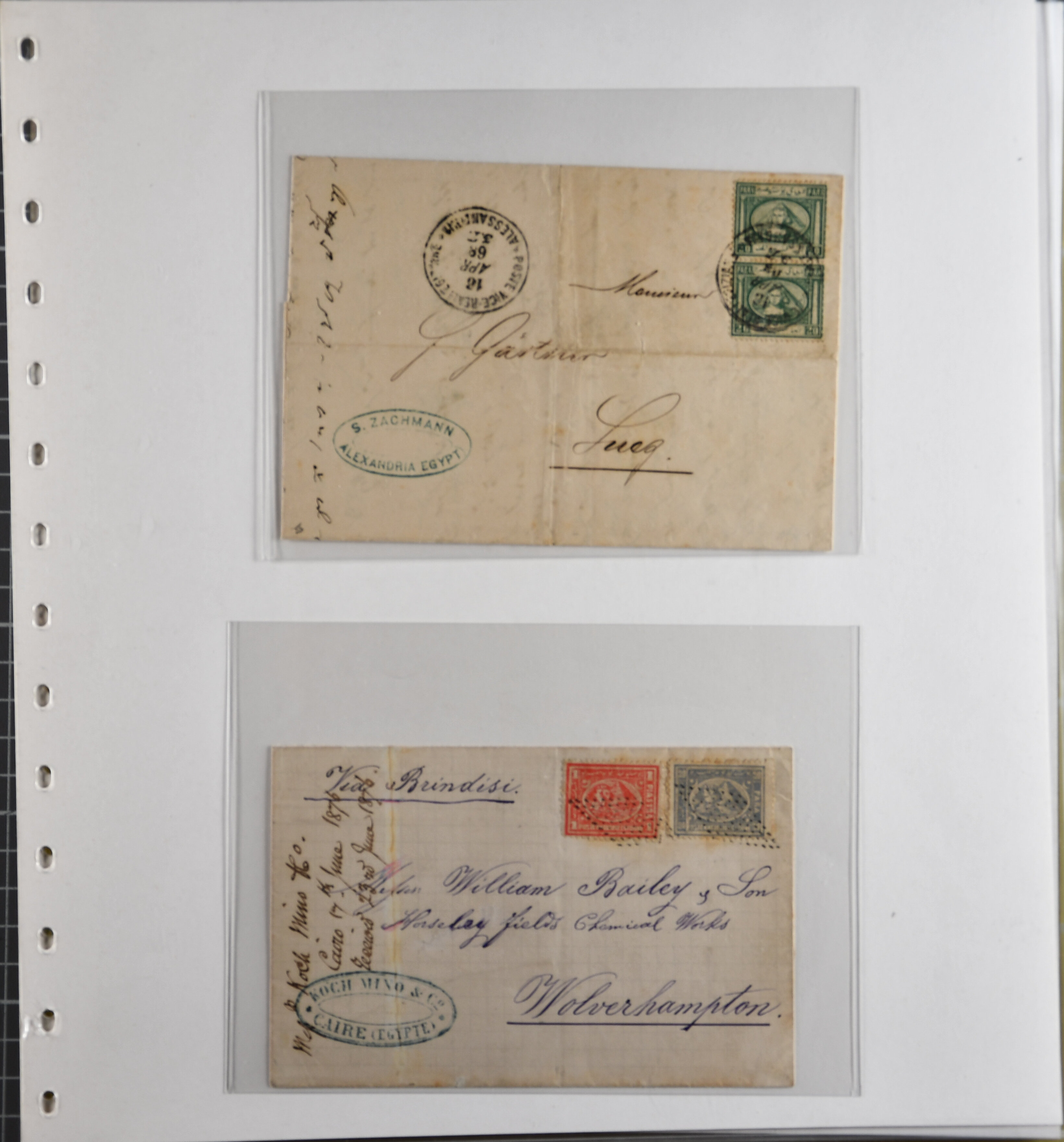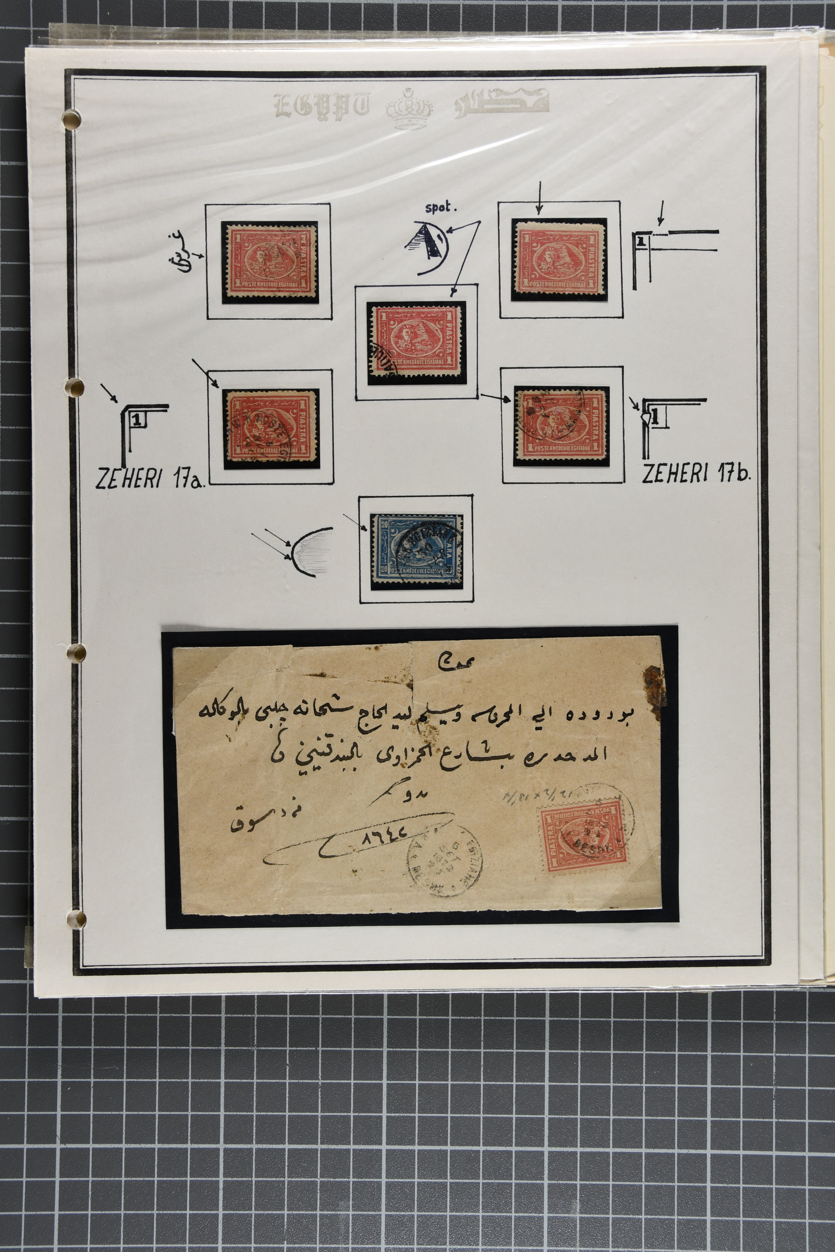 1100 image1867/75: Penasson & Bulâq, the extraordinary cancellation study on the issues with all values represented, from Alexandria incl. 1874 5 pa. tête-bêche pairs (3), 1 pi. red in blocks of four; rare Mailboat "ALES / UFIZIO NATANTE" cds's on 20 pa. and 1 pi. (2); rare "ST. BULKELEY", ST. BACOS and ST. SCHUTZ mostly on 1 pi., Cairo with "Ambulante / Cairo - Ales" cds's on 5 pa. and 1 pi., "Cairo / Stazione" on 5 pa. brown tête-bêche pair; rare ABE star and crescent (3), range of cancels from ABU HOMUS, ASSOUAN incl. a cover, ATFE, BENHA, BENI SUEF, rare BILBES usage, BIRKET EL SAB, rare BULAH DACRUR (2), DAMANHOUR, DAMIATA, DESUK, fine arabic dated ESNA range, FESCNE, rare GAALIUB on 1 pi., GHERGA, rare GHISA on 5 pa. tête-bêche block of four, HELOUAN, ISMAILIA, KAFR DAUAR, KAFR ZAYAT, KENA incl. a cover, LUXOR arabic dated range, MAGAGA, MAHALLET ROH, MANFALOUT, MANSURA, MELLAUI, MEDINET EL FAIUM, MEHALLA, MINET EL GAMH, MINIE on 10 pa.grey block of four, MINUF, PORT SAID, RAMSES, RODA, ROSETTA, SAMANUD, SCIBIN EL ANATEUR, SCIBIN EL KOM, SOHAG arabic dated range, SIUT incl. a cover, SUEZ, TEH EL BAROUD, TANTA, rare TOOH with four examples, TEH EL KIBIR, ZAGASIK, ZEFTA; and Station postmnarks, rettas, registration cancels etc., used abroad with 1 pi. used in BARBAR, KARTUM usages, 1 pi. block of four used in KASSALA, fine groups from GEDDA (incl. rare 1867 5 pi. usage) and MASSAWA, SUAKIM in black and in blue, BAIROUT with superb 1872 5 pa. and others, superb CAVALLA (3, one with Hass cert.), large range of CONSTANTINOPLE, GALLIPOLI incl. magnificent strike on 1872 1 pi., LATAKIA on 1867 1 pi. (cert. Hass), 2 pi. yellow used in TRIPOLI, superb group (10) from METELINO incl. 1867 1 pi. used with "Medilli" seal in black; 20 pa. grey-blue in a strip of three, rare RODI cds's (4), SCIO incl. a cover used with 1875/75 20 pa. and 1 pi., DARDANELLI, SMIRNE incl. a cover used with 1875/75 20 pa. and 1 pi., VOLO with 1867 1 pi. red with central datestamp etc. A delightful study (438 items and 17 covers). (Image 1) (Image 2) (Image 3) (Image 4) (Image 5) (Image 6) (Image 7) (Image 8) (Image 9) (Image 10) (Image 11) (Image 12) (Image 13) (Image 14) (Image 15) (Image 16) (Image 17) (Image 18) (Image 19) (Image 20) (Image 21) (Image 22) (Image 23) (Image 24) (Image 25) (Image 26) (Image 27) (Image 28) (Image 29) (Image 30) (Image 31) (Image 32) (Image 33) (Image 34) (Image 35) (Image 36) (Image 37) (Image 38) (Image 39) (Image 40) (Image 41) (Image 42) (Image 43) (Image 44) (Image 45) (Image 46) (Image 47) (Image 48) (Image 49) (Image 50)