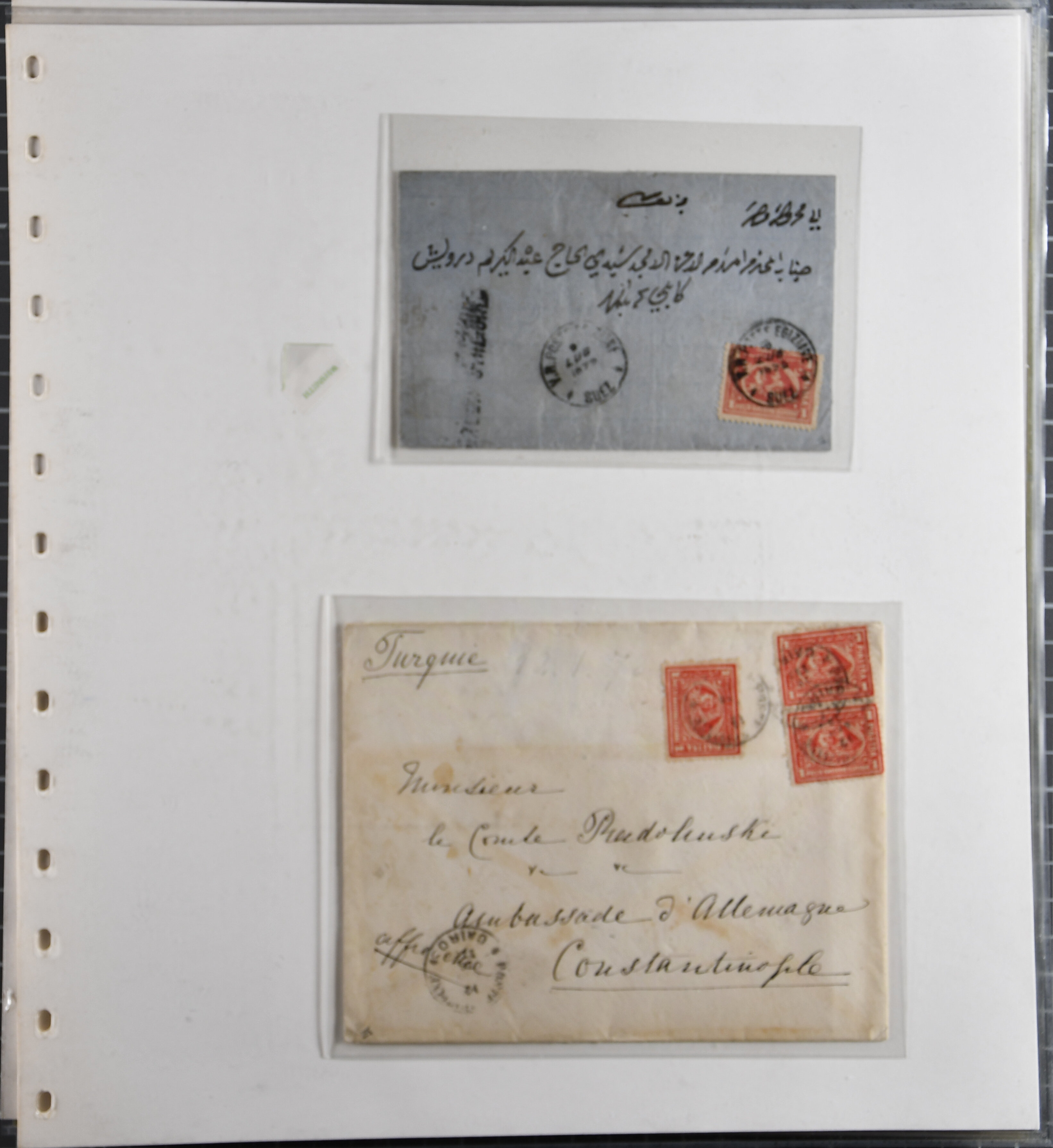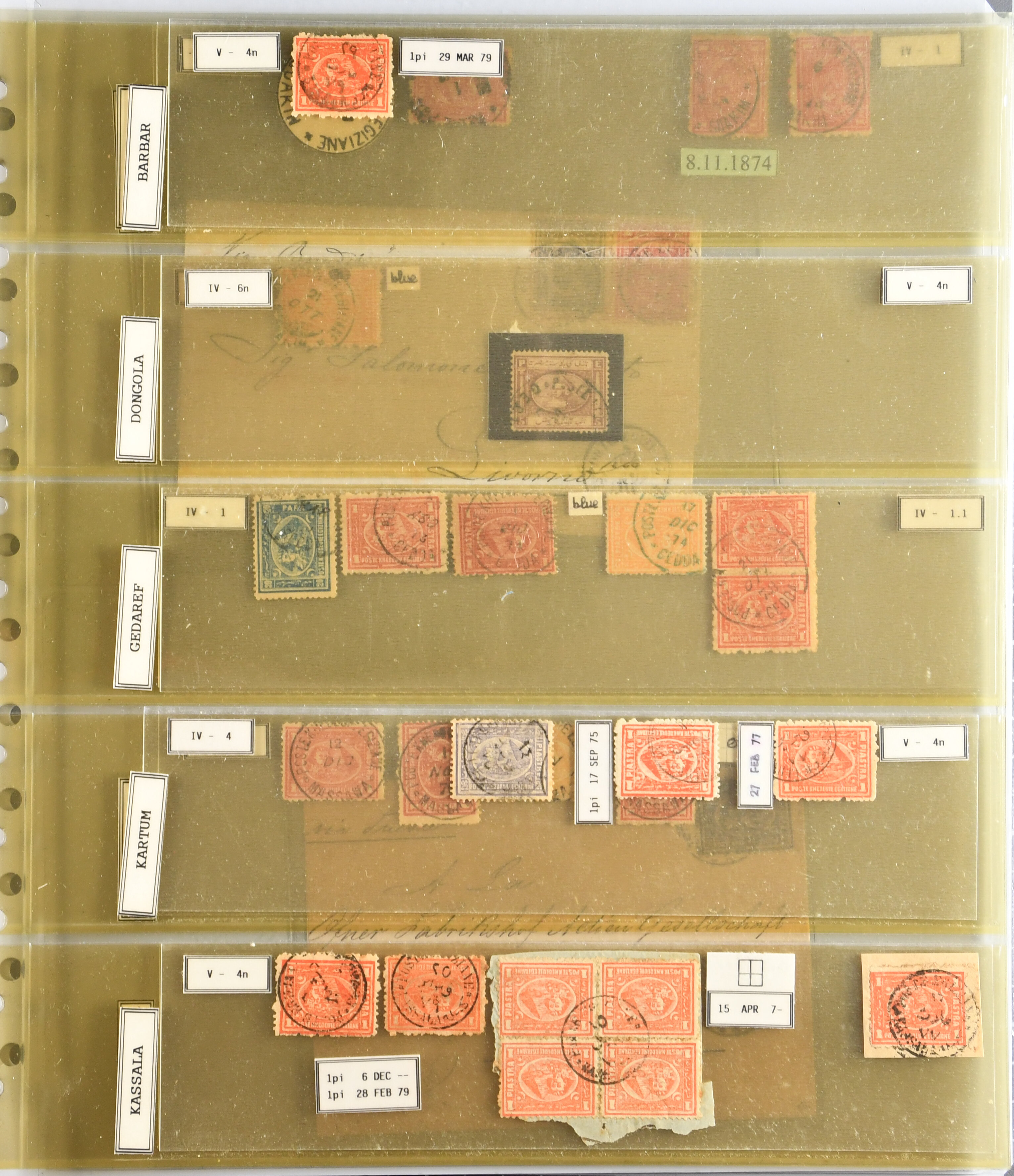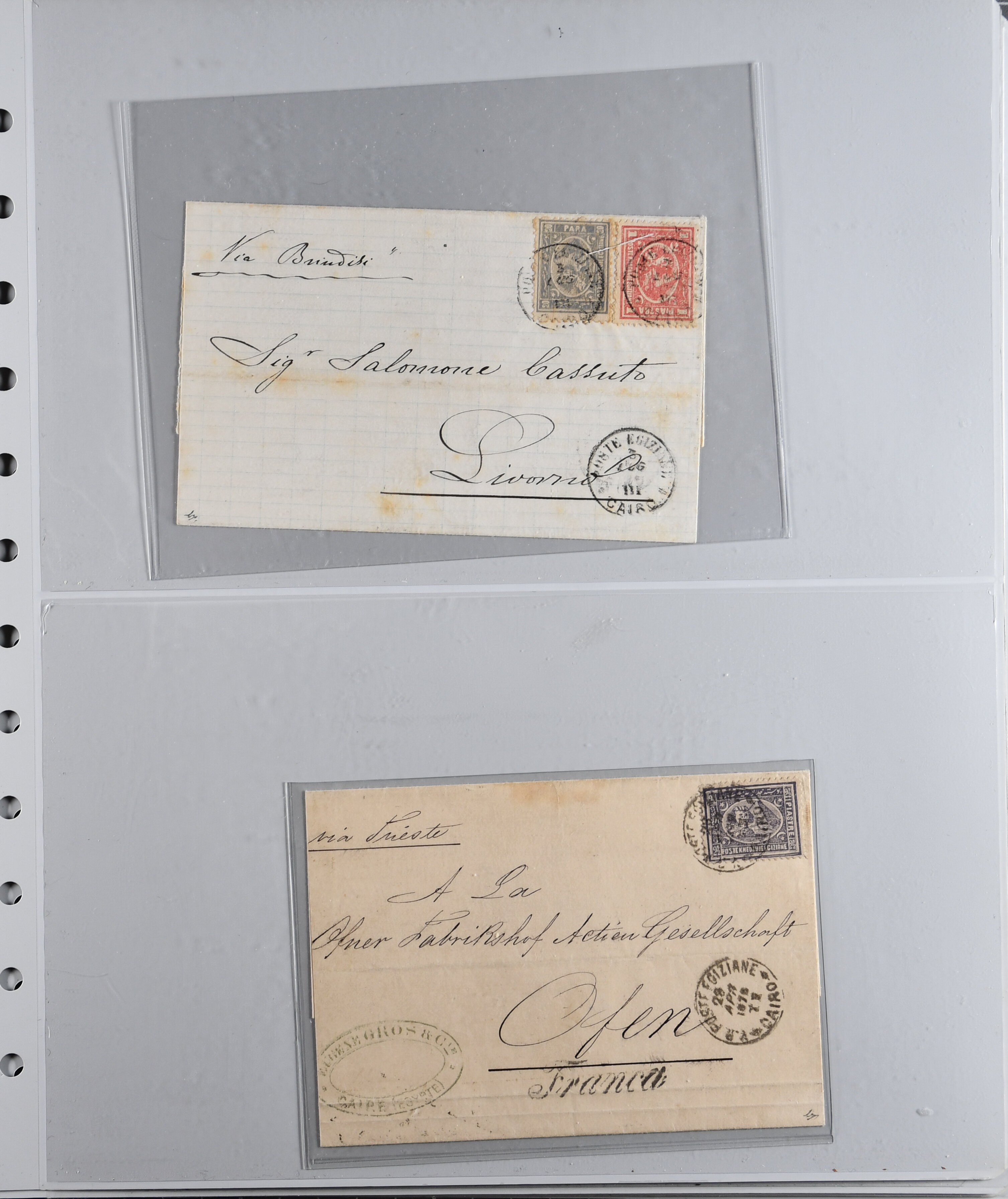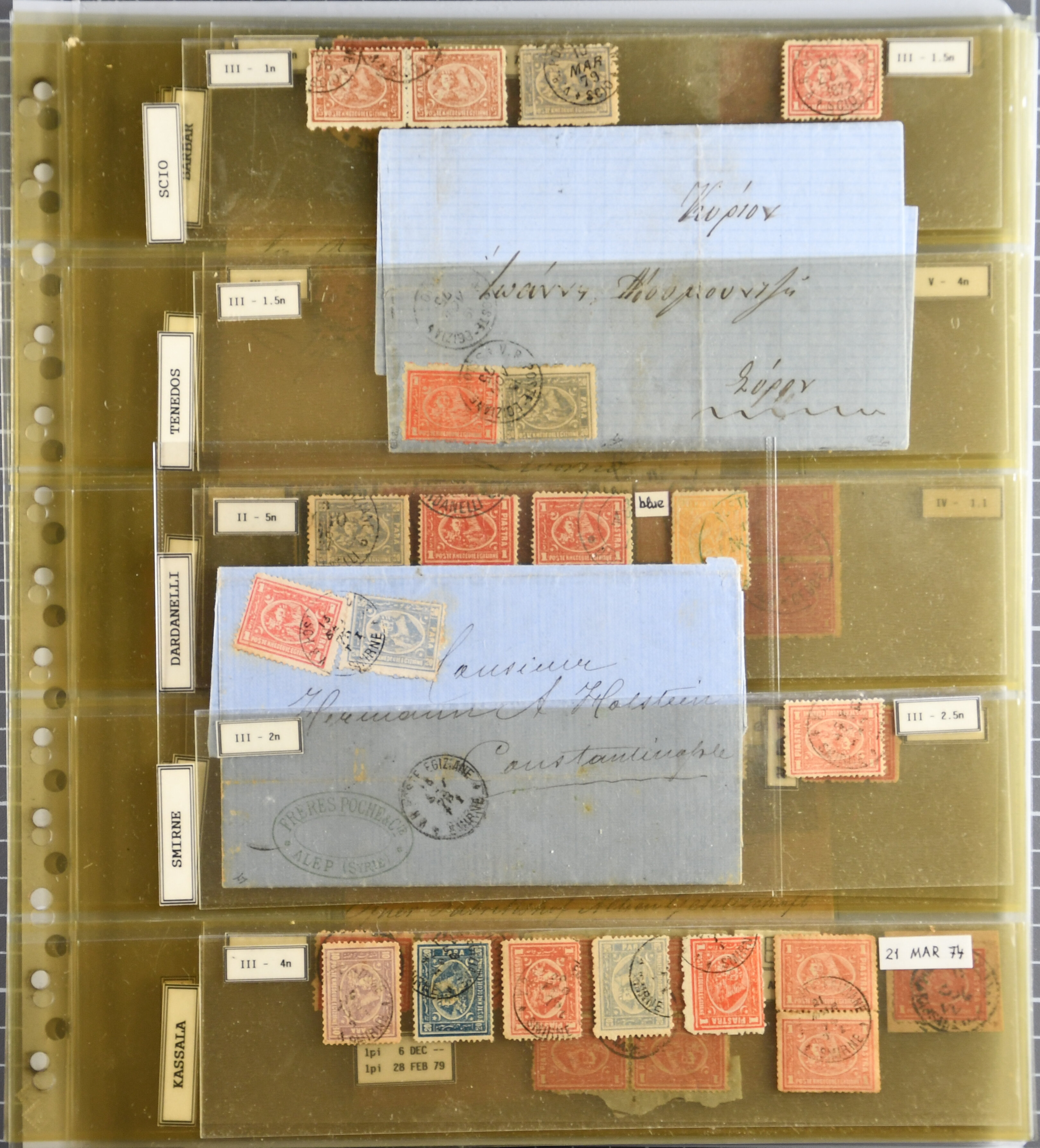 1100 image1867/75: Penasson & Bulâq, the extraordinary cancellation study on the issues with all values represented, from Alexandria incl. 1874 5 pa. tête-bêche pairs (3), 1 pi. red in blocks of four; rare Mailboat "ALES / UFIZIO NATANTE" cds's on 20 pa. and 1 pi. (2); rare "ST. BULKELEY", ST. BACOS and ST. SCHUTZ mostly on 1 pi., Cairo with "Ambulante / Cairo - Ales" cds's on 5 pa. and 1 pi., "Cairo / Stazione" on 5 pa. brown tête-bêche pair; rare ABE star and crescent (3), range of cancels from ABU HOMUS, ASSOUAN incl. a cover, ATFE, BENHA, BENI SUEF, rare BILBES usage, BIRKET EL SAB, rare BULAH DACRUR (2), DAMANHOUR, DAMIATA, DESUK, fine arabic dated ESNA range, FESCNE, rare GAALIUB on 1 pi., GHERGA, rare GHISA on 5 pa. tête-bêche block of four, HELOUAN, ISMAILIA, KAFR DAUAR, KAFR ZAYAT, KENA incl. a cover, LUXOR arabic dated range, MAGAGA, MAHALLET ROH, MANFALOUT, MANSURA, MELLAUI, MEDINET EL FAIUM, MEHALLA, MINET EL GAMH, MINIE on 10 pa.grey block of four, MINUF, PORT SAID, RAMSES, RODA, ROSETTA, SAMANUD, SCIBIN EL ANATEUR, SCIBIN EL KOM, SOHAG arabic dated range, SIUT incl. a cover, SUEZ, TEH EL BAROUD, TANTA, rare TOOH with four examples, TEH EL KIBIR, ZAGASIK, ZEFTA; and Station postmnarks, rettas, registration cancels etc., used abroad with 1 pi. used in BARBAR, KARTUM usages, 1 pi. block of four used in KASSALA, fine groups from GEDDA (incl. rare 1867 5 pi. usage) and MASSAWA, SUAKIM in black and in blue, BAIROUT with superb 1872 5 pa. and others, superb CAVALLA (3, one with Hass cert.), large range of CONSTANTINOPLE, GALLIPOLI incl. magnificent strike on 1872 1 pi., LATAKIA on 1867 1 pi. (cert. Hass), 2 pi. yellow used in TRIPOLI, superb group (10) from METELINO incl. 1867 1 pi. used with "Medilli" seal in black; 20 pa. grey-blue in a strip of three, rare RODI cds's (4), SCIO incl. a cover used with 1875/75 20 pa. and 1 pi., DARDANELLI, SMIRNE incl. a cover used with 1875/75 20 pa. and 1 pi., VOLO with 1867 1 pi. red with central datestamp etc. A delightful study (438 items and 17 covers). (Image 1) (Image 2) (Image 3) (Image 4) (Image 5) (Image 6) (Image 7) (Image 8) (Image 9) (Image 10) (Image 11) (Image 12) (Image 13) (Image 14) (Image 15) (Image 16) (Image 17) (Image 18) (Image 19) (Image 20) (Image 21) (Image 22) (Image 23) (Image 24) (Image 25) (Image 26) (Image 27) (Image 28) (Image 29) (Image 30) (Image 31) (Image 32) (Image 33) (Image 34) (Image 35) (Image 36) (Image 37) (Image 38) (Image 39) (Image 40) (Image 41) (Image 42) (Image 43) (Image 44) (Image 45) (Image 46) (Image 47) (Image 48) (Image 49) (Image 50)