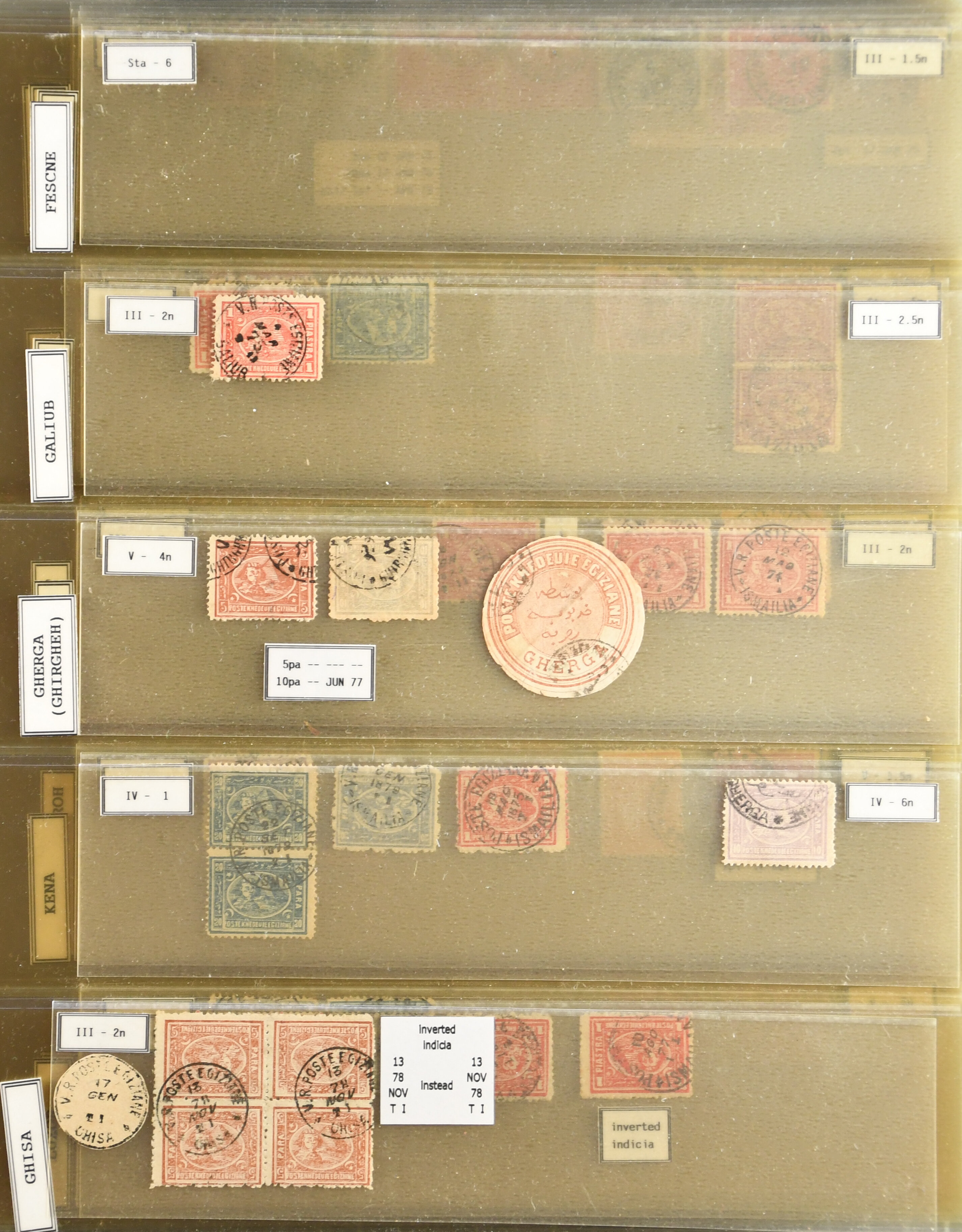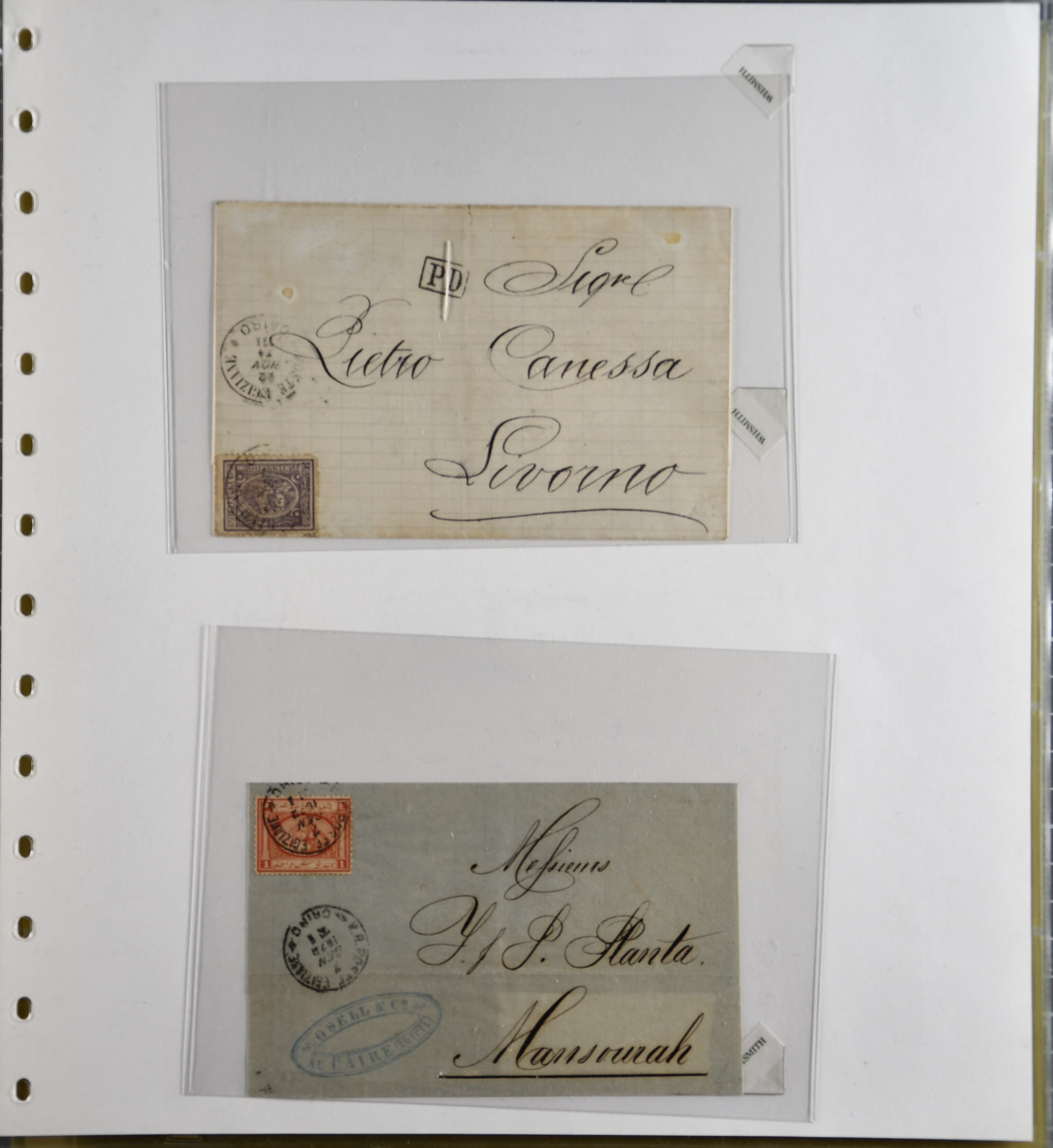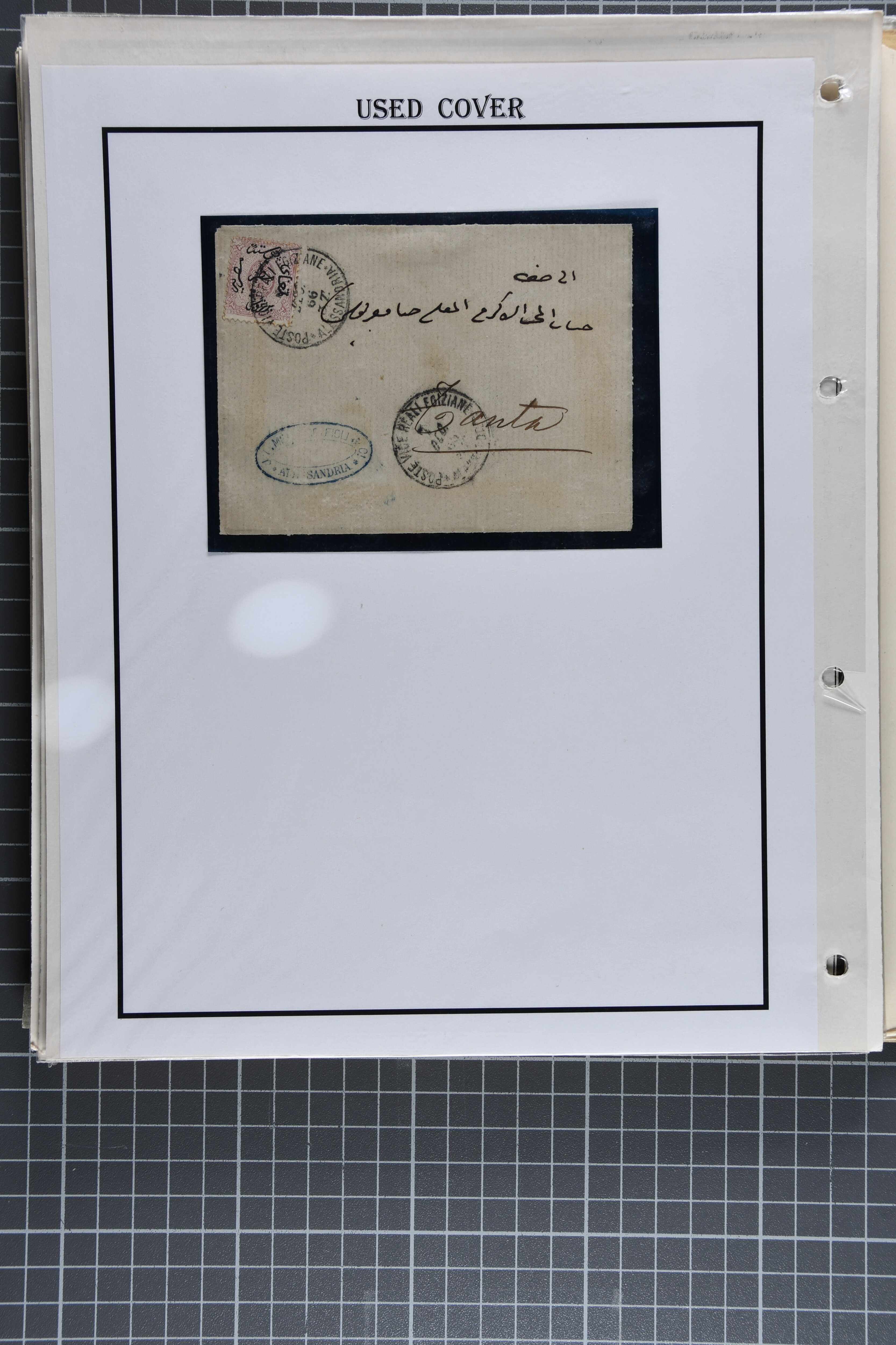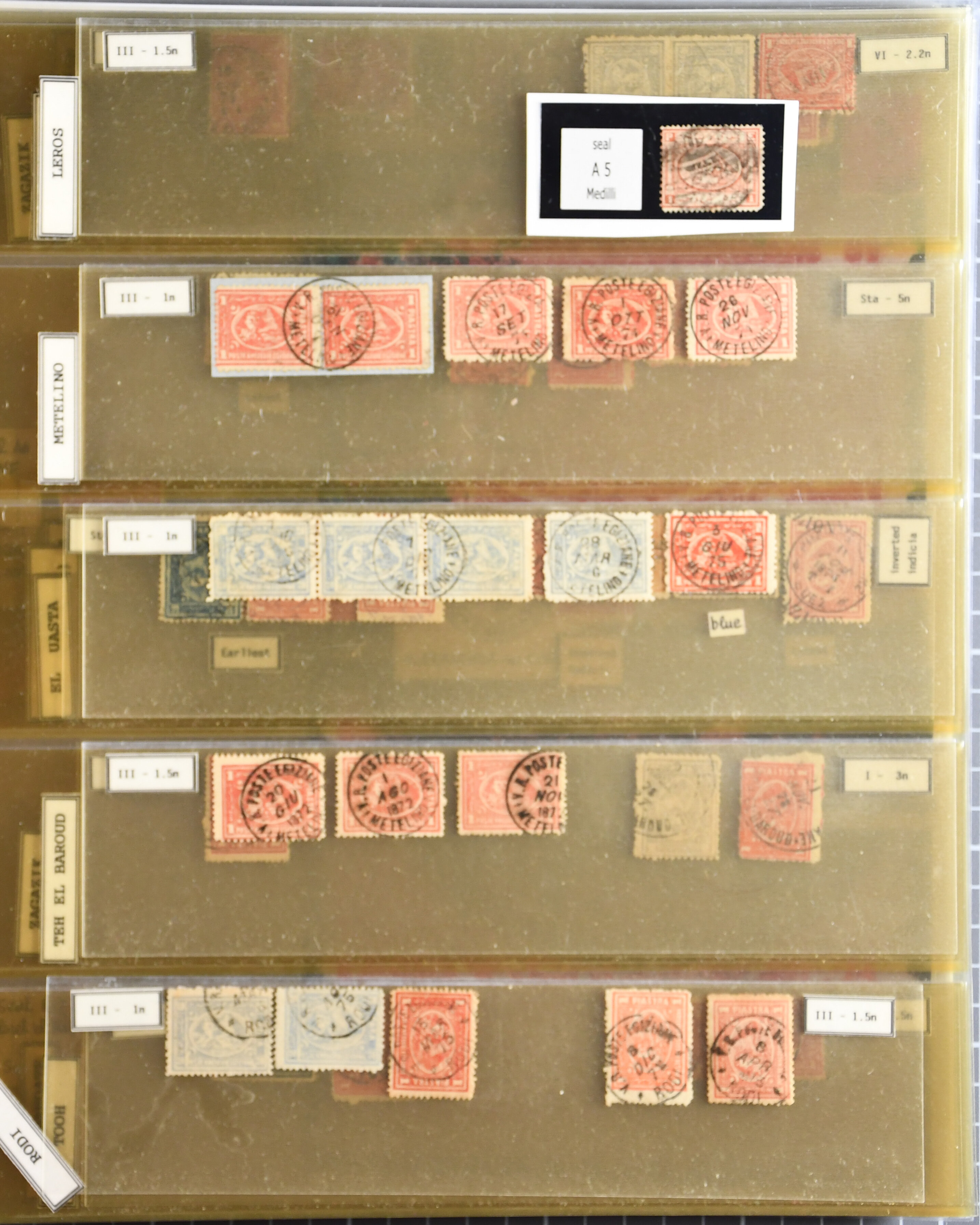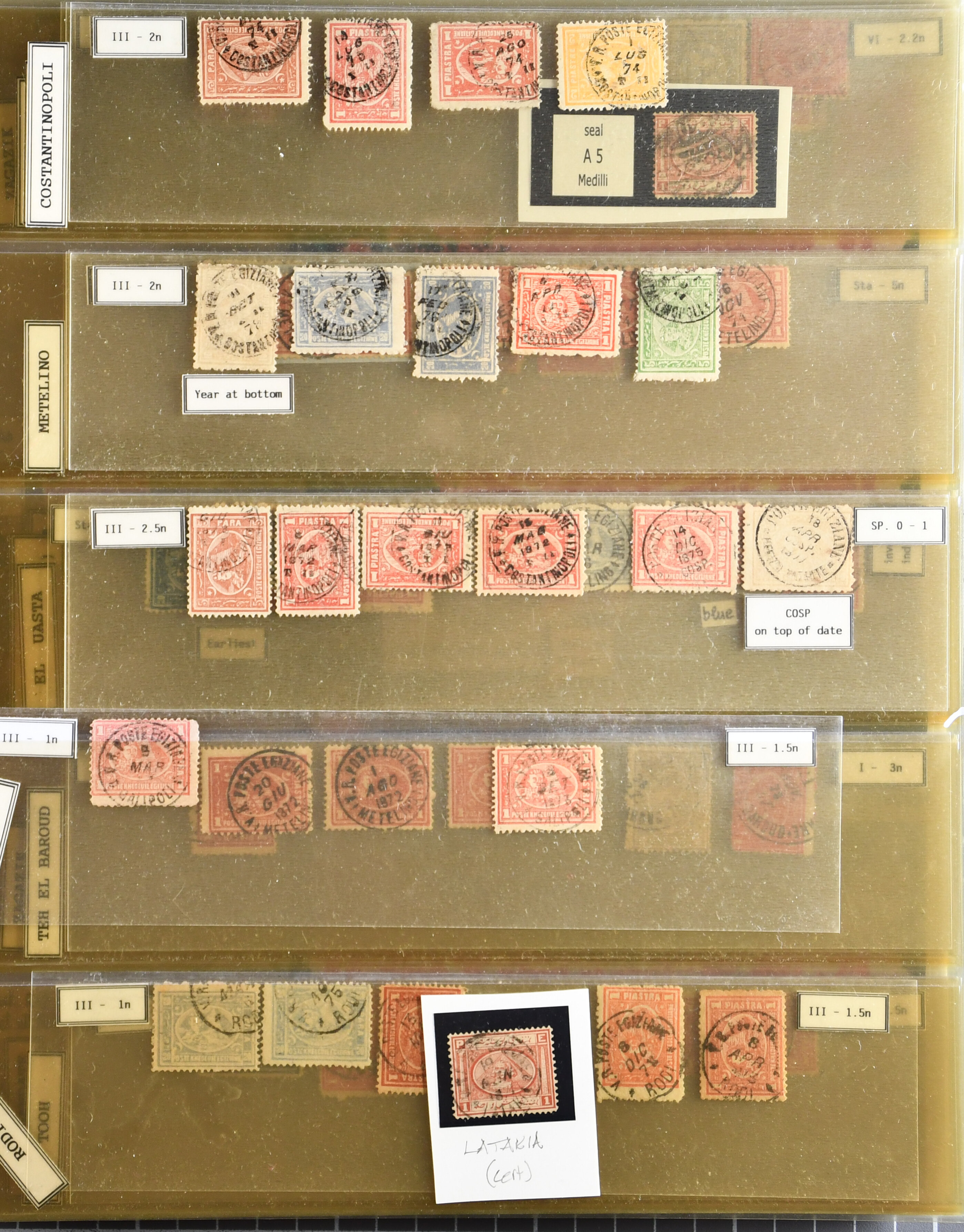 1100 image1867/75: Penasson & Bulâq, the extraordinary cancellation study on the issues with all values represented, from Alexandria incl. 1874 5 pa. tête-bêche pairs (3), 1 pi. red in blocks of four; rare Mailboat "ALES / UFIZIO NATANTE" cds's on 20 pa. and 1 pi. (2); rare "ST. BULKELEY", ST. BACOS and ST. SCHUTZ mostly on 1 pi., Cairo with "Ambulante / Cairo - Ales" cds's on 5 pa. and 1 pi., "Cairo / Stazione" on 5 pa. brown tête-bêche pair; rare ABE star and crescent (3), range of cancels from ABU HOMUS, ASSOUAN incl. a cover, ATFE, BENHA, BENI SUEF, rare BILBES usage, BIRKET EL SAB, rare BULAH DACRUR (2), DAMANHOUR, DAMIATA, DESUK, fine arabic dated ESNA range, FESCNE, rare GAALIUB on 1 pi., GHERGA, rare GHISA on 5 pa. tête-bêche block of four, HELOUAN, ISMAILIA, KAFR DAUAR, KAFR ZAYAT, KENA incl. a cover, LUXOR arabic dated range, MAGAGA, MAHALLET ROH, MANFALOUT, MANSURA, MELLAUI, MEDINET EL FAIUM, MEHALLA, MINET EL GAMH, MINIE on 10 pa.grey block of four, MINUF, PORT SAID, RAMSES, RODA, ROSETTA, SAMANUD, SCIBIN EL ANATEUR, SCIBIN EL KOM, SOHAG arabic dated range, SIUT incl. a cover, SUEZ, TEH EL BAROUD, TANTA, rare TOOH with four examples, TEH EL KIBIR, ZAGASIK, ZEFTA; and Station postmnarks, rettas, registration cancels etc., used abroad with 1 pi. used in BARBAR, KARTUM usages, 1 pi. block of four used in KASSALA, fine groups from GEDDA (incl. rare 1867 5 pi. usage) and MASSAWA, SUAKIM in black and in blue, BAIROUT with superb 1872 5 pa. and others, superb CAVALLA (3, one with Hass cert.), large range of CONSTANTINOPLE, GALLIPOLI incl. magnificent strike on 1872 1 pi., LATAKIA on 1867 1 pi. (cert. Hass), 2 pi. yellow used in TRIPOLI, superb group (10) from METELINO incl. 1867 1 pi. used with "Medilli" seal in black; 20 pa. grey-blue in a strip of three, rare RODI cds's (4), SCIO incl. a cover used with 1875/75 20 pa. and 1 pi., DARDANELLI, SMIRNE incl. a cover used with 1875/75 20 pa. and 1 pi., VOLO with 1867 1 pi. red with central datestamp etc. A delightful study (438 items and 17 covers). (Image 1) (Image 2) (Image 3) (Image 4) (Image 5) (Image 6) (Image 7) (Image 8) (Image 9) (Image 10) (Image 11) (Image 12) (Image 13) (Image 14) (Image 15) (Image 16) (Image 17) (Image 18) (Image 19) (Image 20) (Image 21) (Image 22) (Image 23) (Image 24) (Image 25) (Image 26) (Image 27) (Image 28) (Image 29) (Image 30) (Image 31) (Image 32) (Image 33) (Image 34) (Image 35) (Image 36) (Image 37) (Image 38) (Image 39) (Image 40) (Image 41) (Image 42) (Image 43) (Image 44) (Image 45) (Image 46) (Image 47) (Image 48) (Image 49) (Image 50)