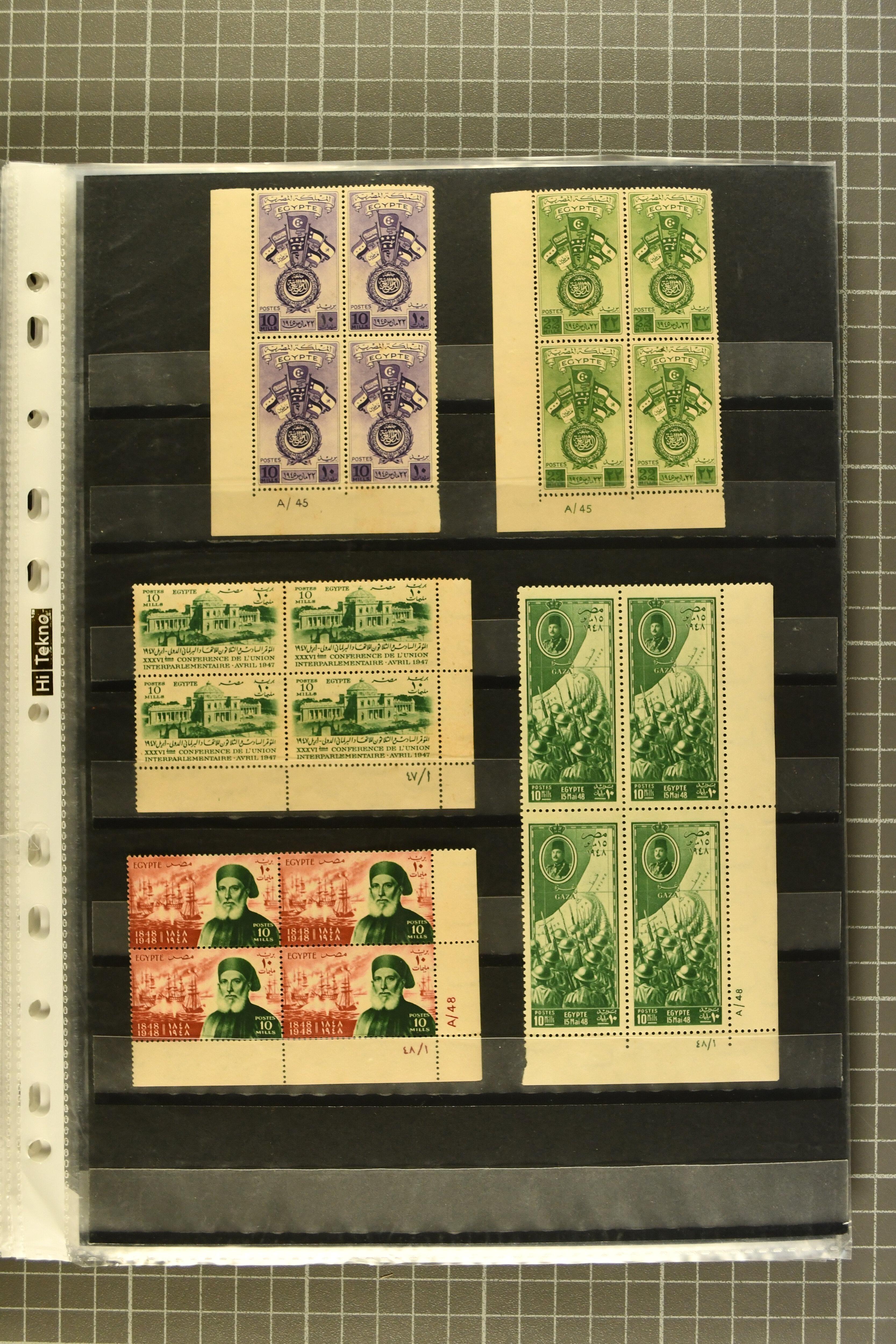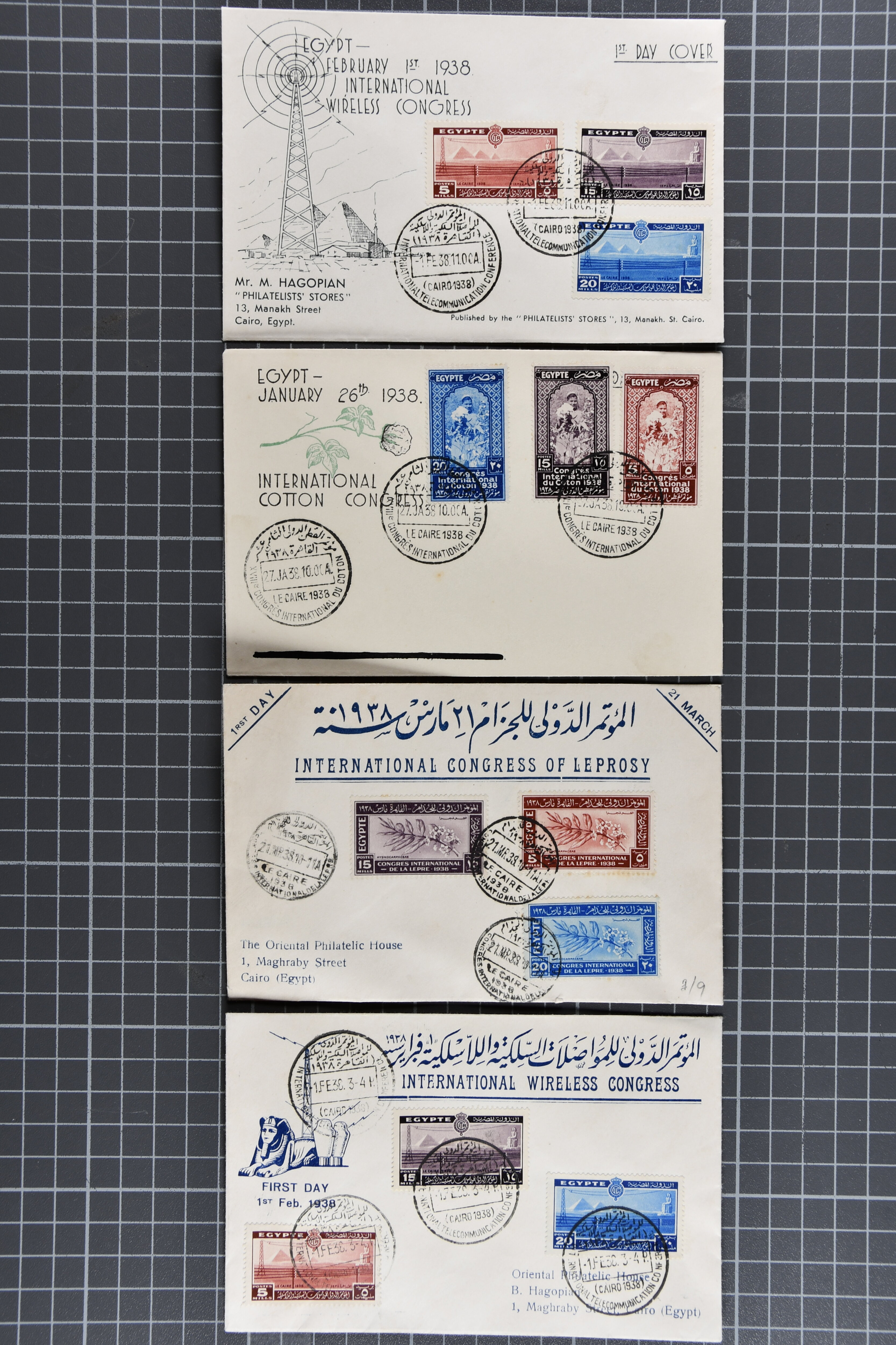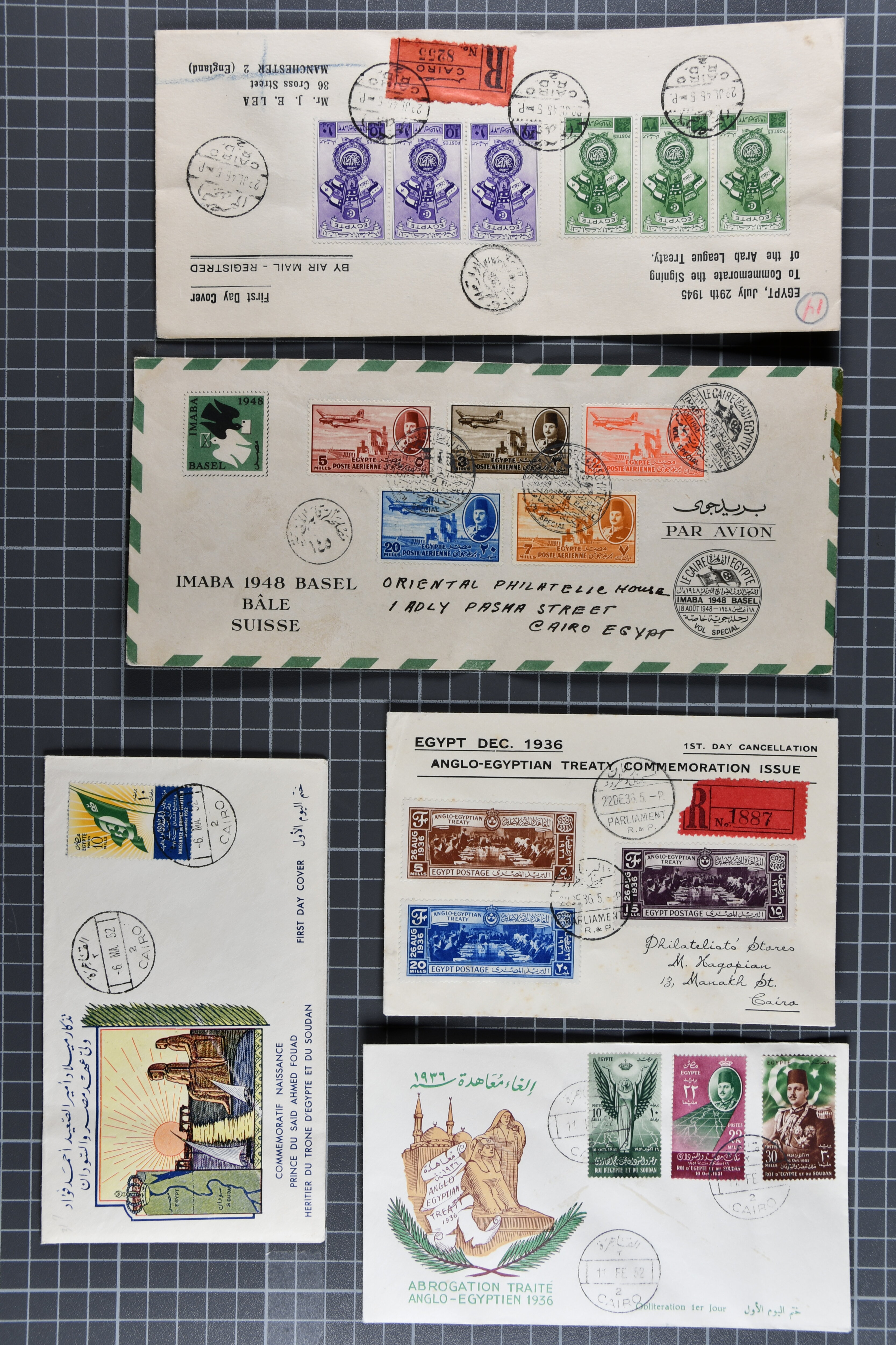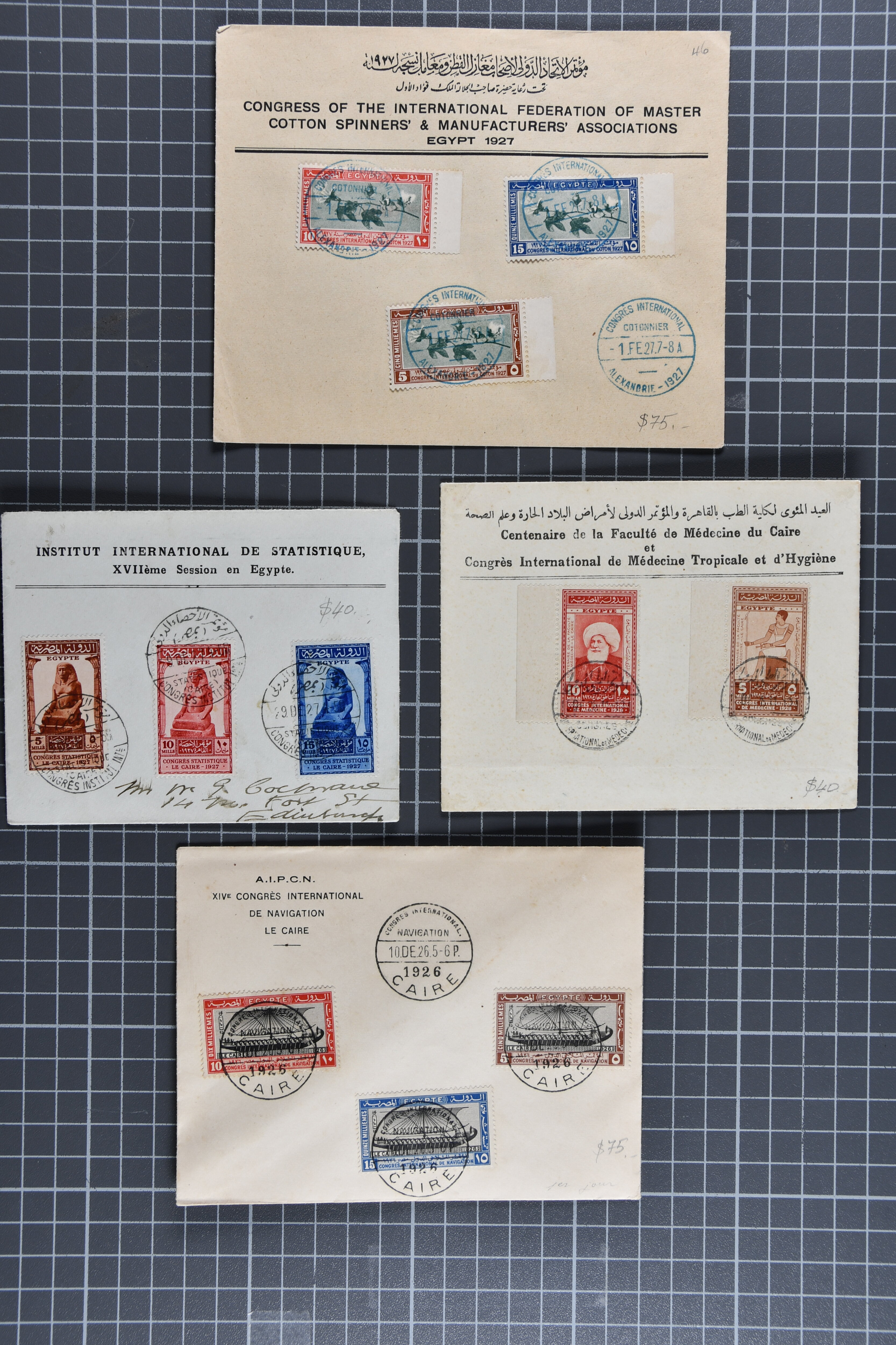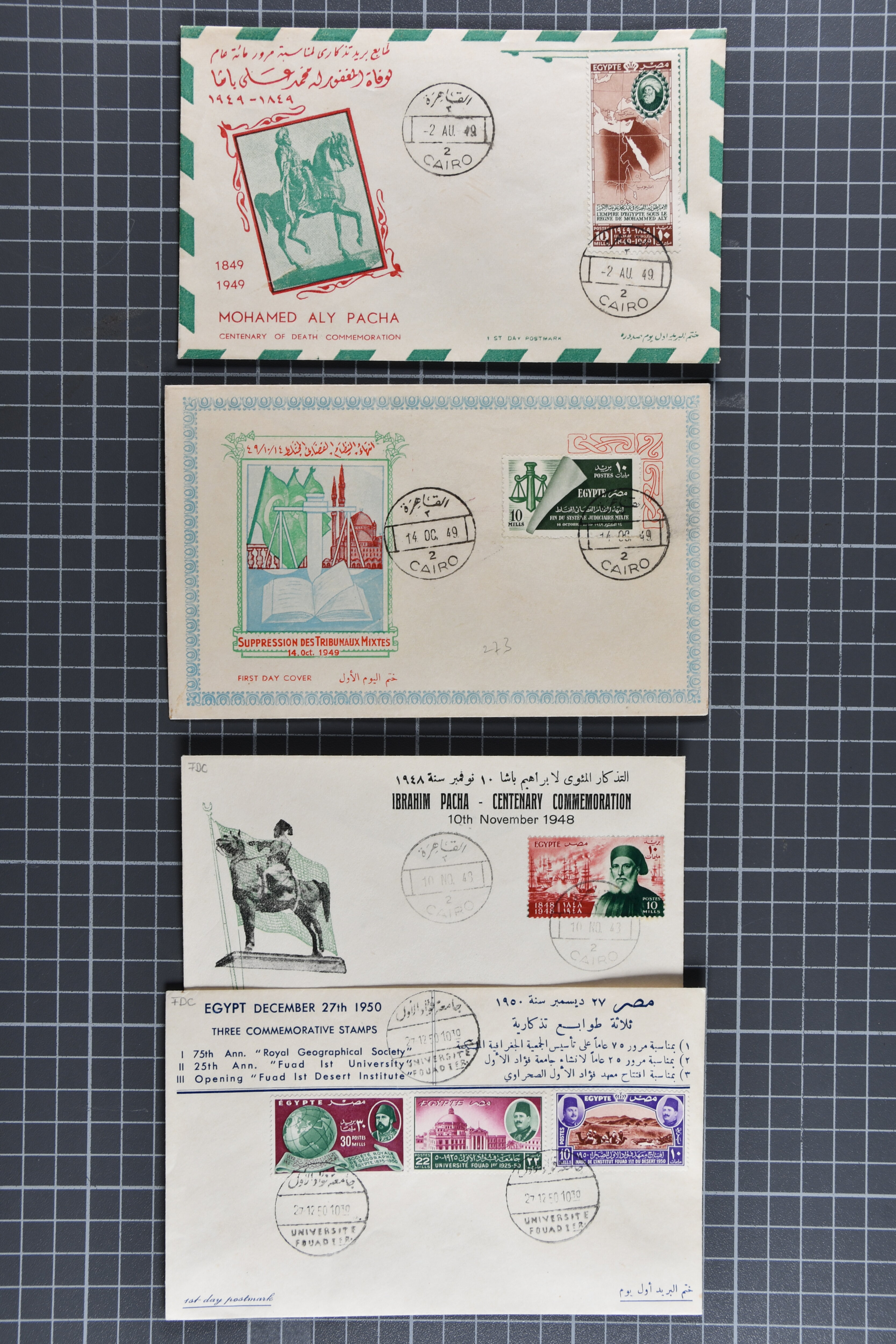 1099 image1866/1950: Fine collection beginning with the first issue, featuring a good range of stamps, often duplicated, both unused and used. Many 20th century sets are included in both unused and used condition and also frequently duplicated, with the used stamps often bearing special event cancellations. The 1929 9th Birthday of Prince Farouk set, with the vignette in grey, is present in unused blocks of four (signed). The 1934 UPU set is included in used condition. The collection also contains covers and a fair quantity of sets on FDCs. (Image 1) (Image 2) (Image 3) (Image 4) (Image 5) (Image 6) (Image 7) (Image 8) (Image 9) (Image 10) (Image 11) (Image 12) (Image 13) (Image 14) (Image 15) (Image 16) (Image 17) (Image 18) (Image 19) (Image 20) (Image 21) (Image 22) (Image 23) (Image 24) (Image 25) (Image 26) (Image 27) (Image 28)