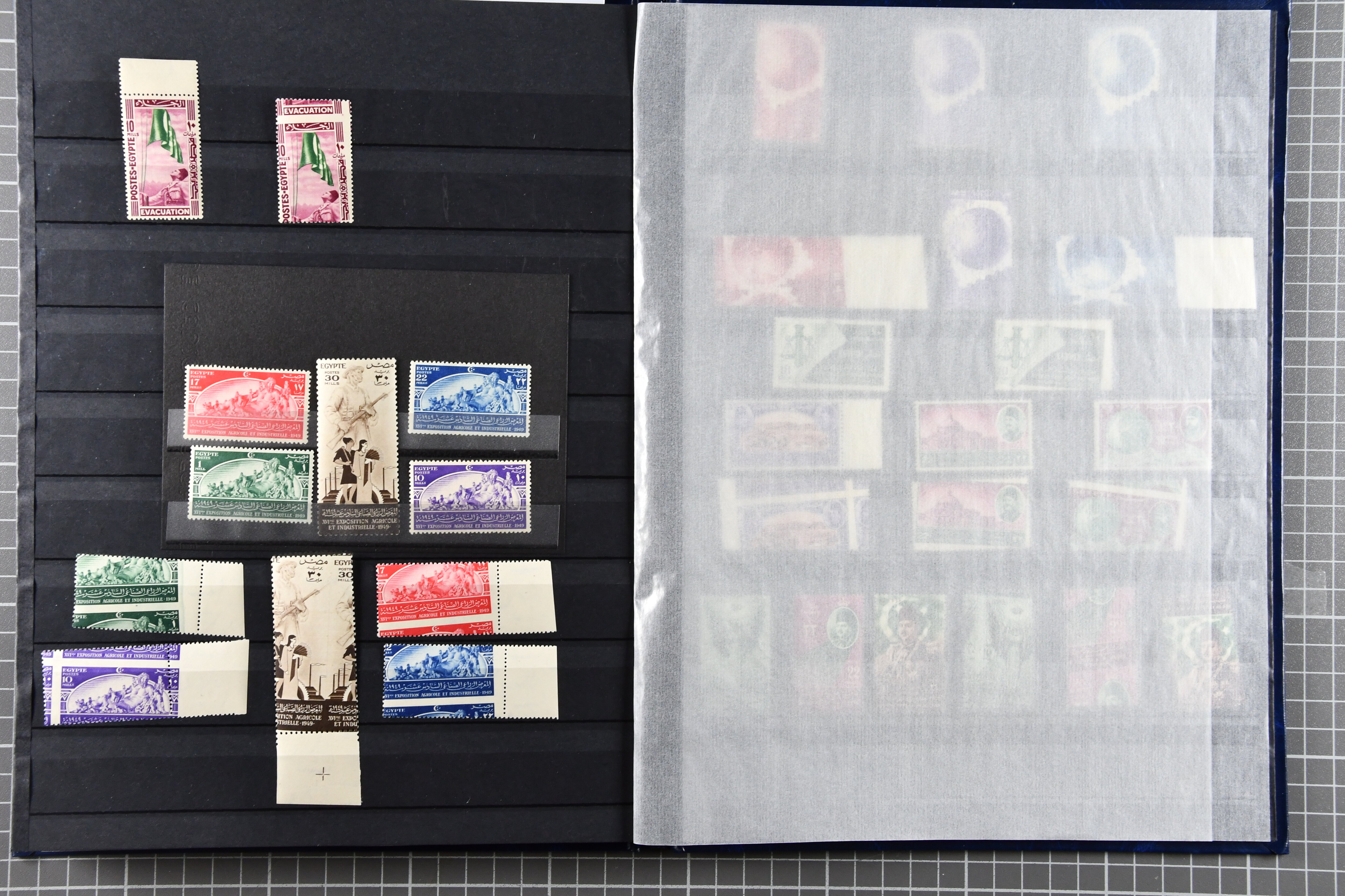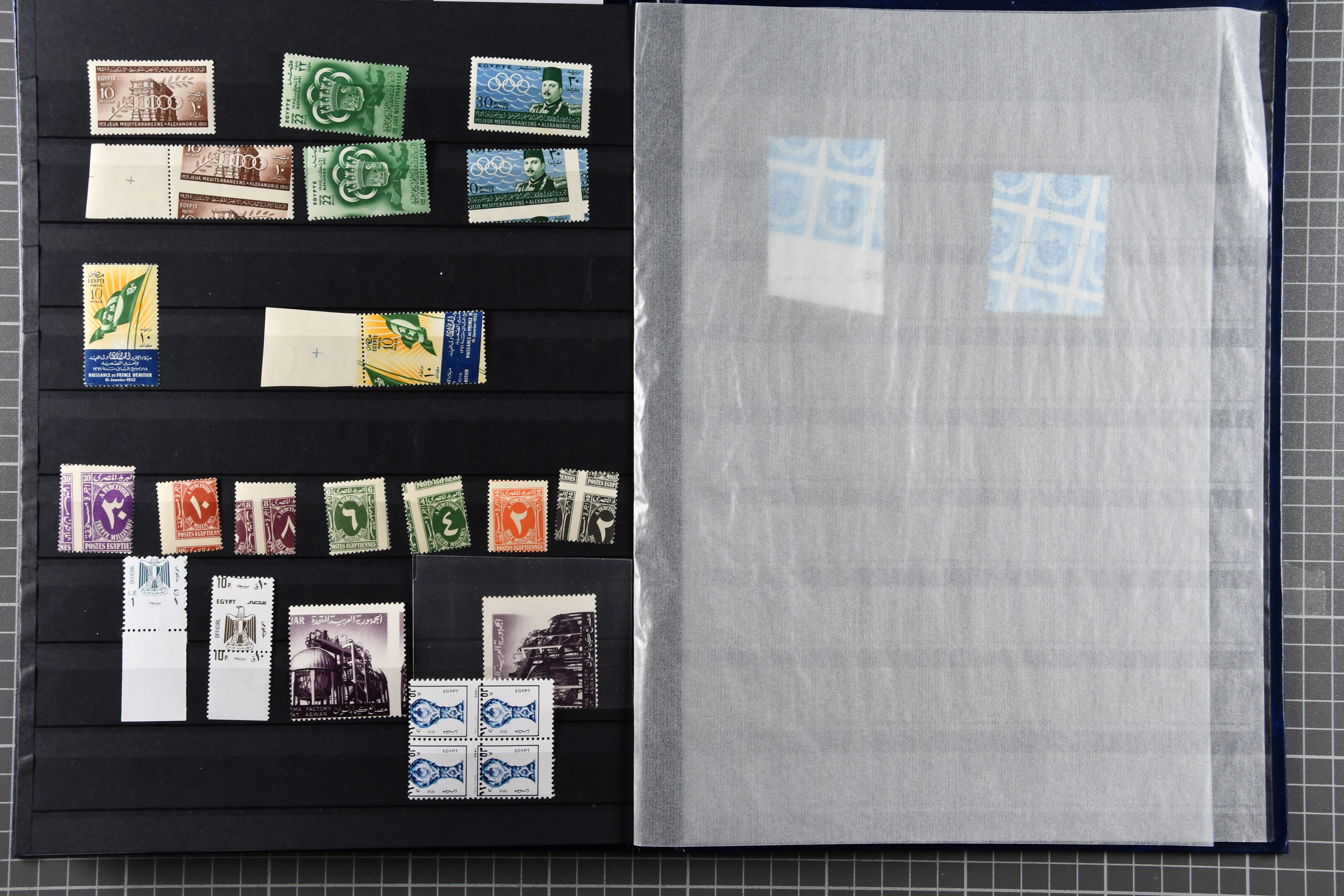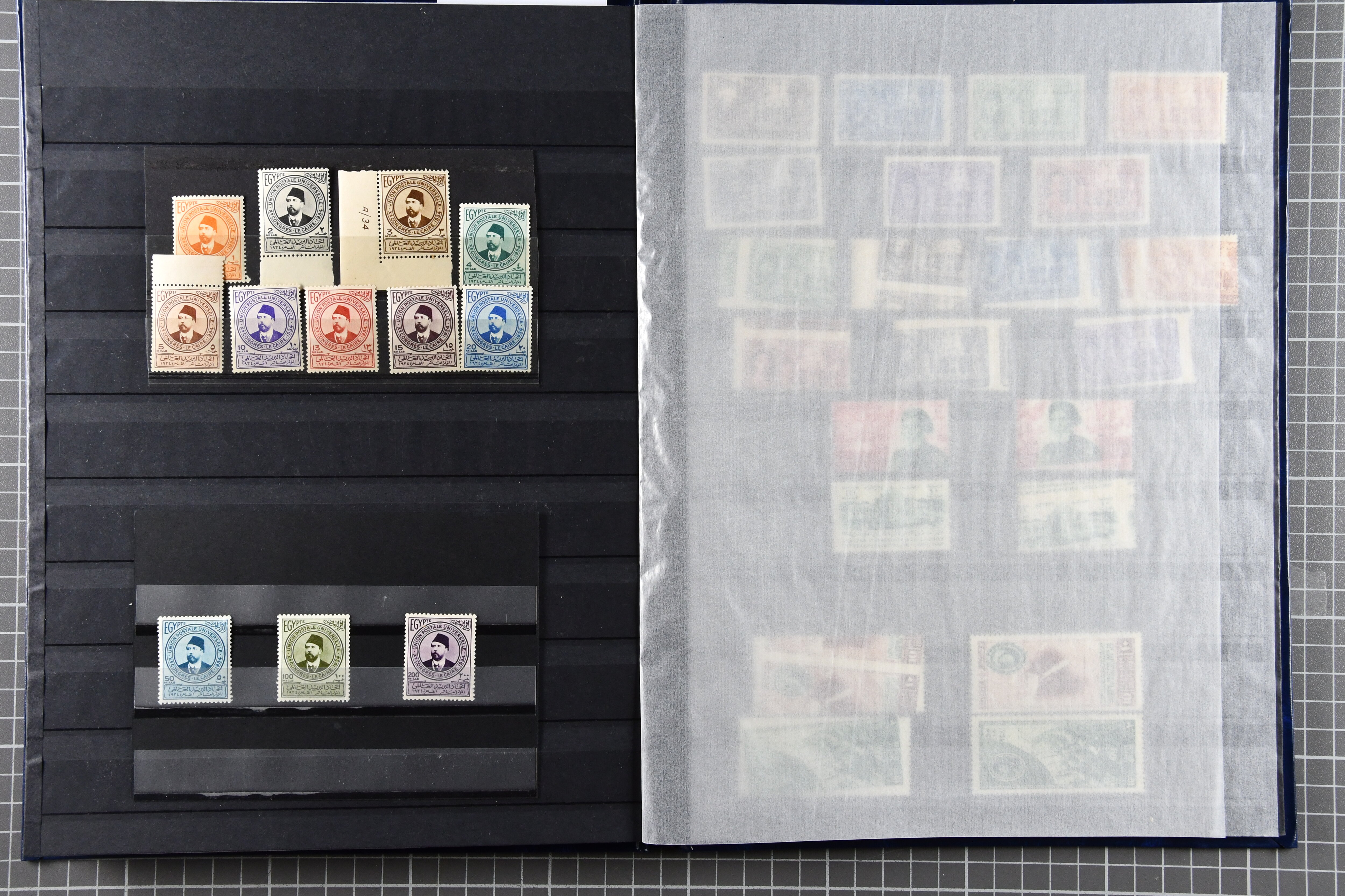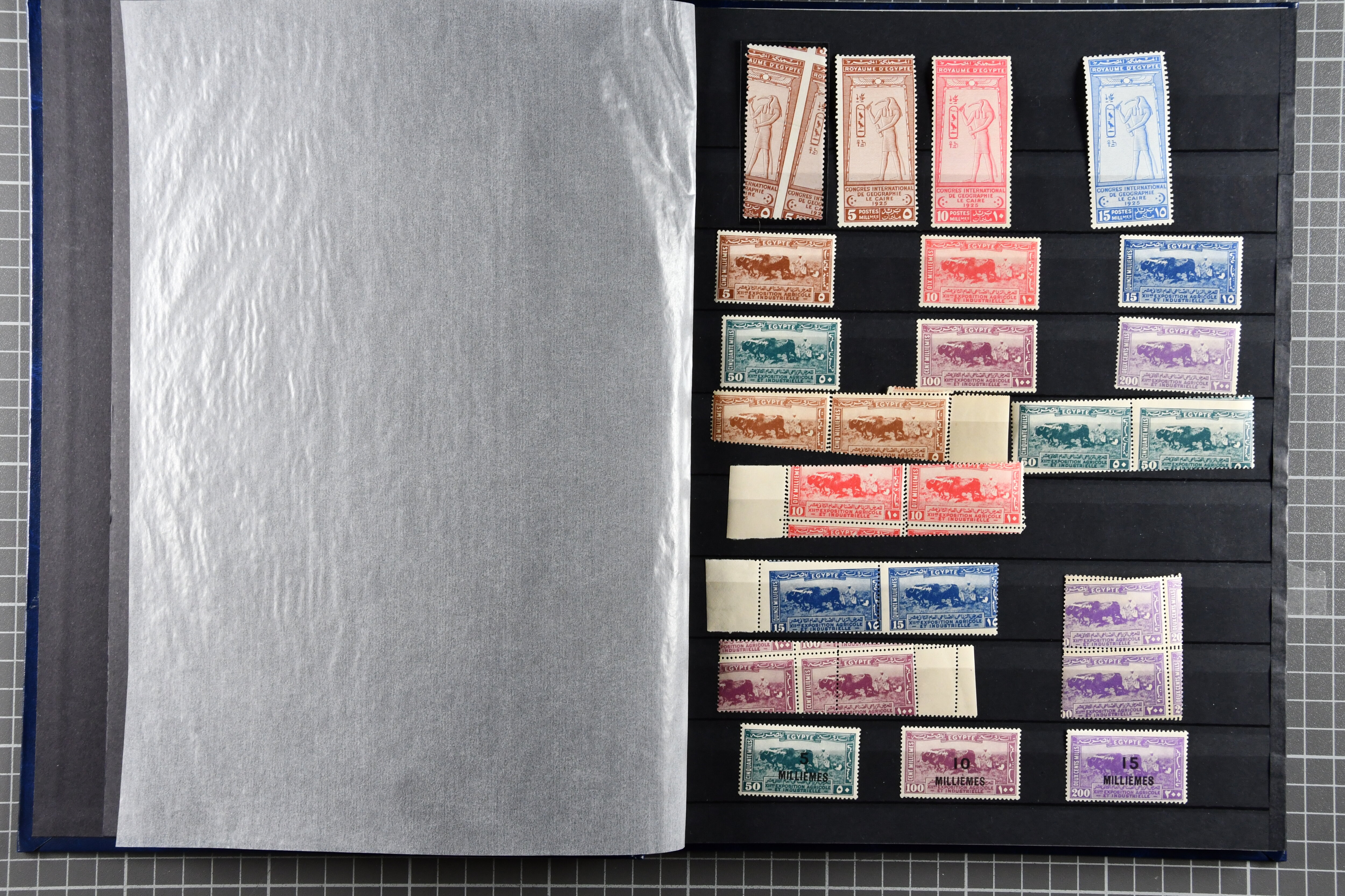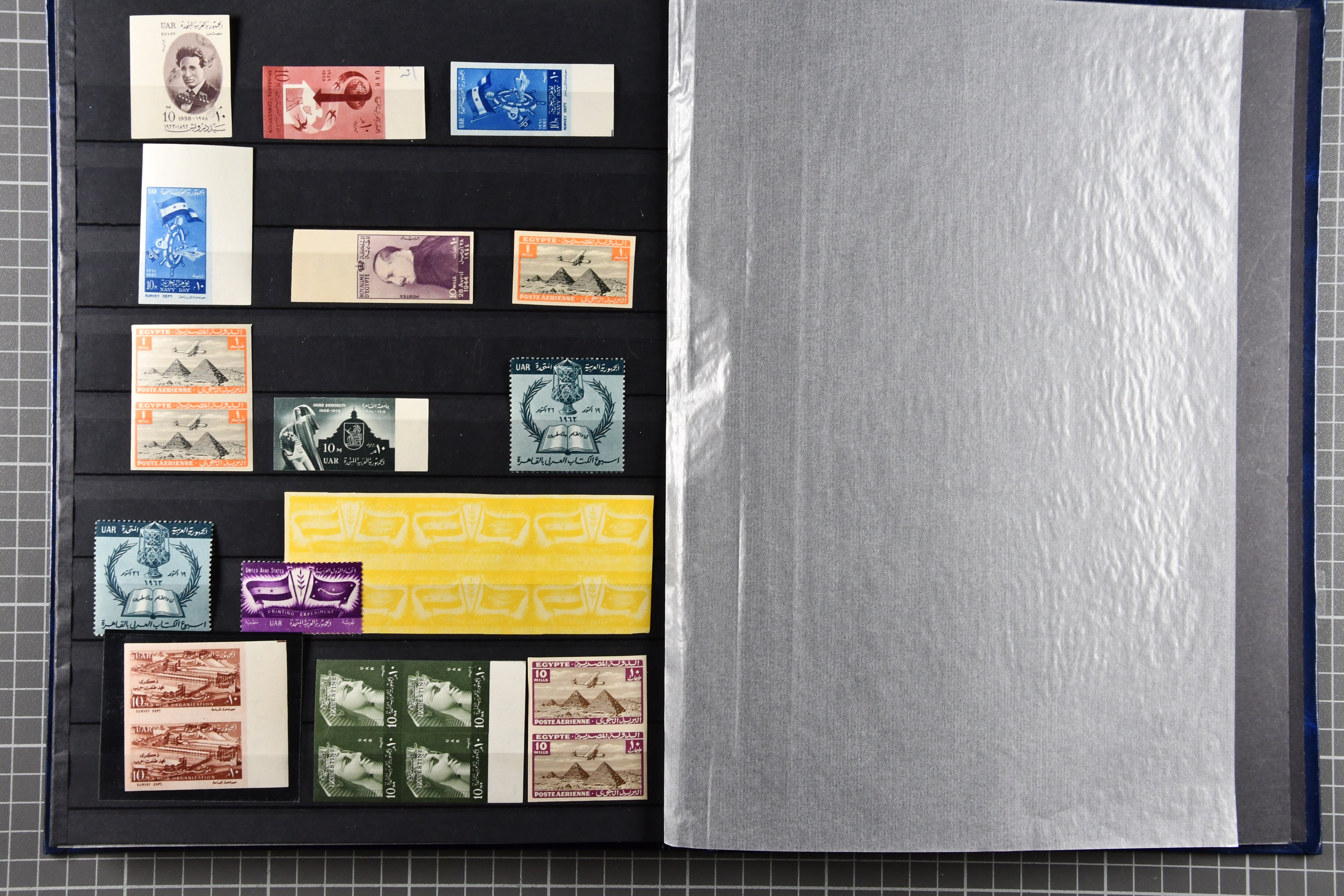 1097 imageEgypt Lots & Collections 1866/1957: Nice group beginning with SG 1 unused; SG 6 unused; two colour trials from 1922 (SG 98 and 104); a 200m Fuad imperforate block of four; SG 12a; a Fuad 5m tête-bêche and a gutter pair (gutter pair totaling four stamps stamps); a block of four of the 1957 Evacuation of Port Said overprint; and a cover from the Egyptian post in the Levant, sent from Constantinople to Smyrna. (Image 1) (Image 2) (Image 3) (Image 4) (Image 5)