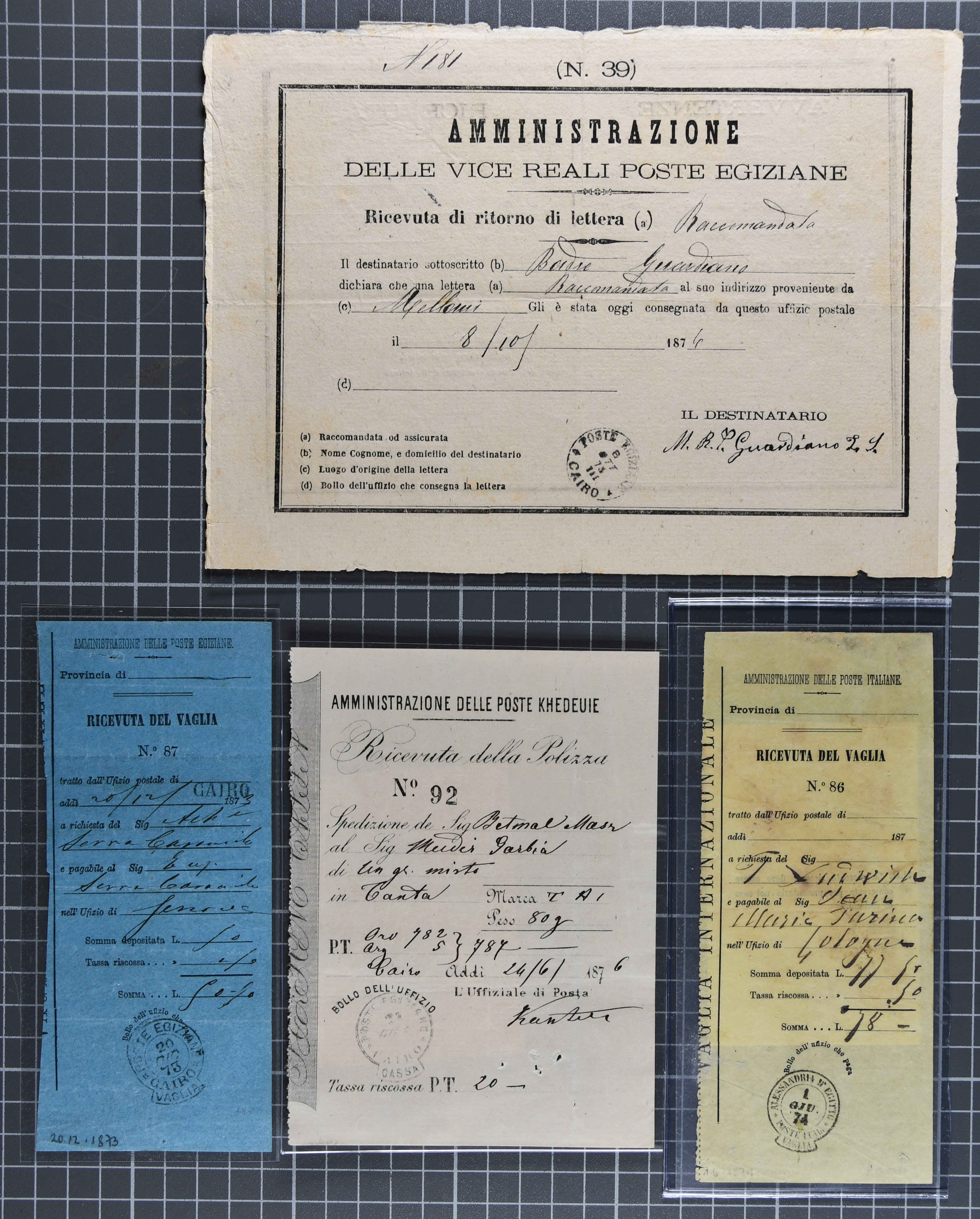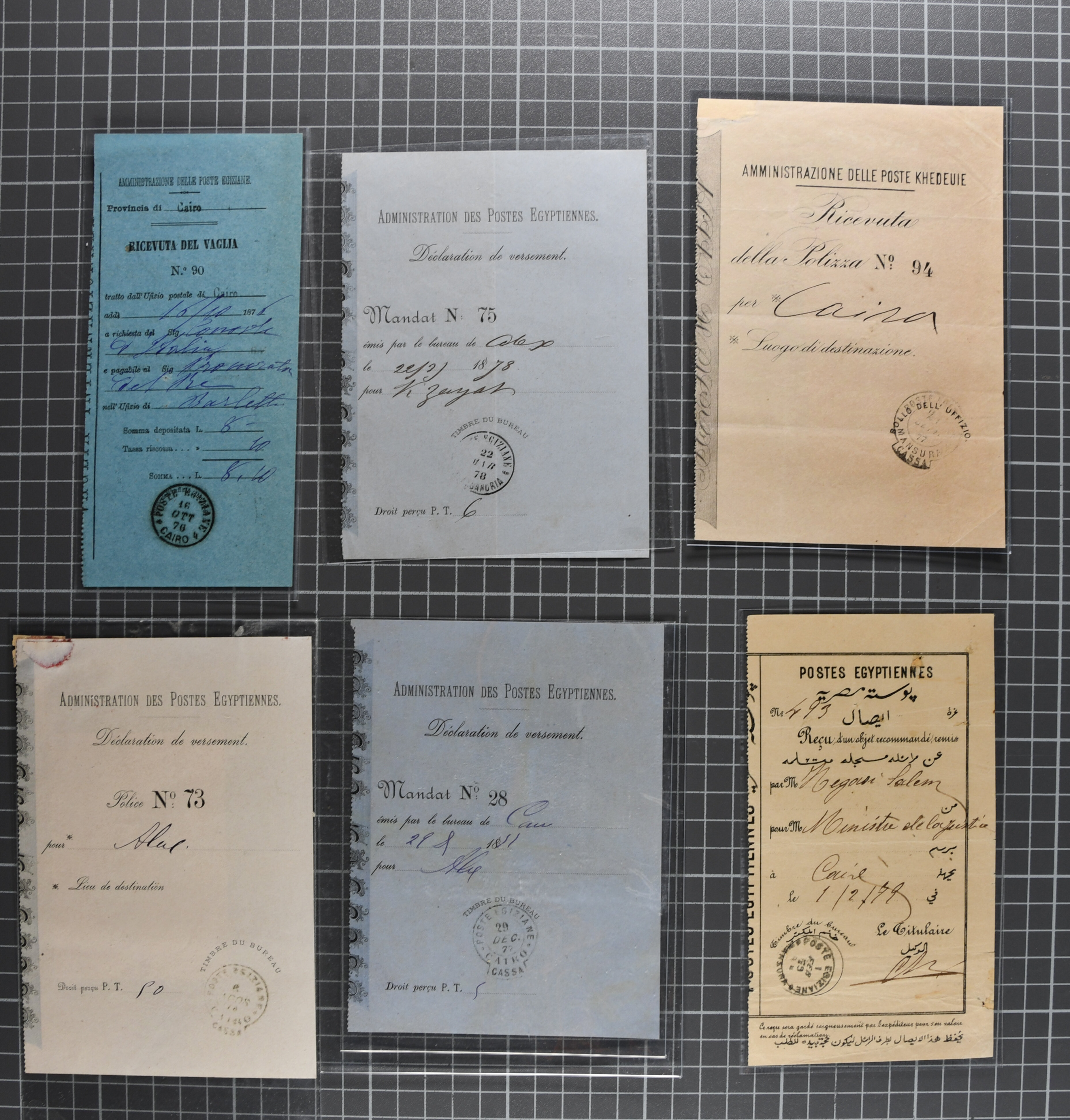 1105 imagePost Office Forms 1873: Ten items: Receipt for return of registered letter (form No. 39) to Mellaui with part Interpostal seal on reverse where the form was originally sealed; 1873 "Ricevuta Del Vaglia" Italian language Money Order receipt forms (2) with straight line "Cairo" handstamp in black at top, struck at base with fine "POSTE EGIZIANE / CAIRO / VAGLIA" datestamps in black; 1874 yellow "Ricevuta Del Vaglia" form with Alessandria Vaglia "Keyhole" datestamp at base; Administration des Postes Egyptiennes "Declaration de versement" forms (2) in blue issued for receipt of payment, one struck with fine "POSTE EGIZIANE / CAIRO / CASSA" datestamp (Dec 29, 1877) in black used to Alexandria, the other with "Poste Egiziane / Alessandria" cds (March 22, 1878) in black used to Kafr Zayat; and 1879 registration receipt in Italian for a letter to cairo with "POSTE EGIZIANE / MANSURA " cds (Feb 1) at base. A rare group. (Image 1) (Image 2)